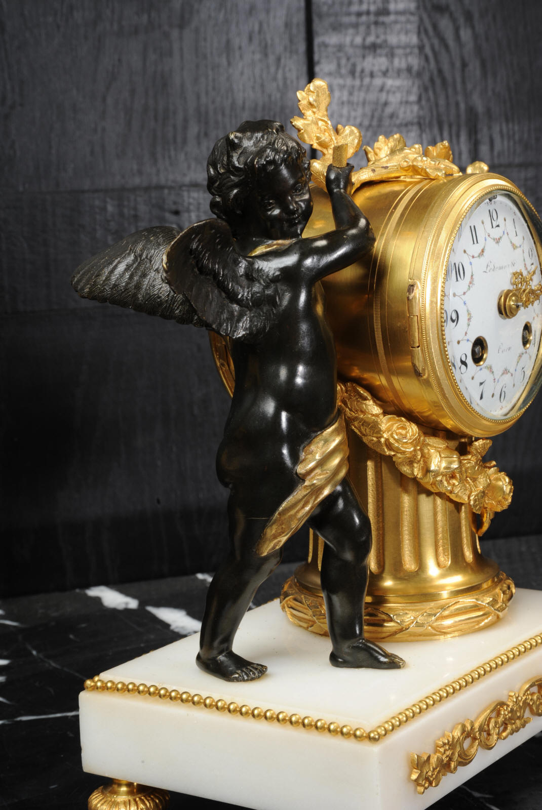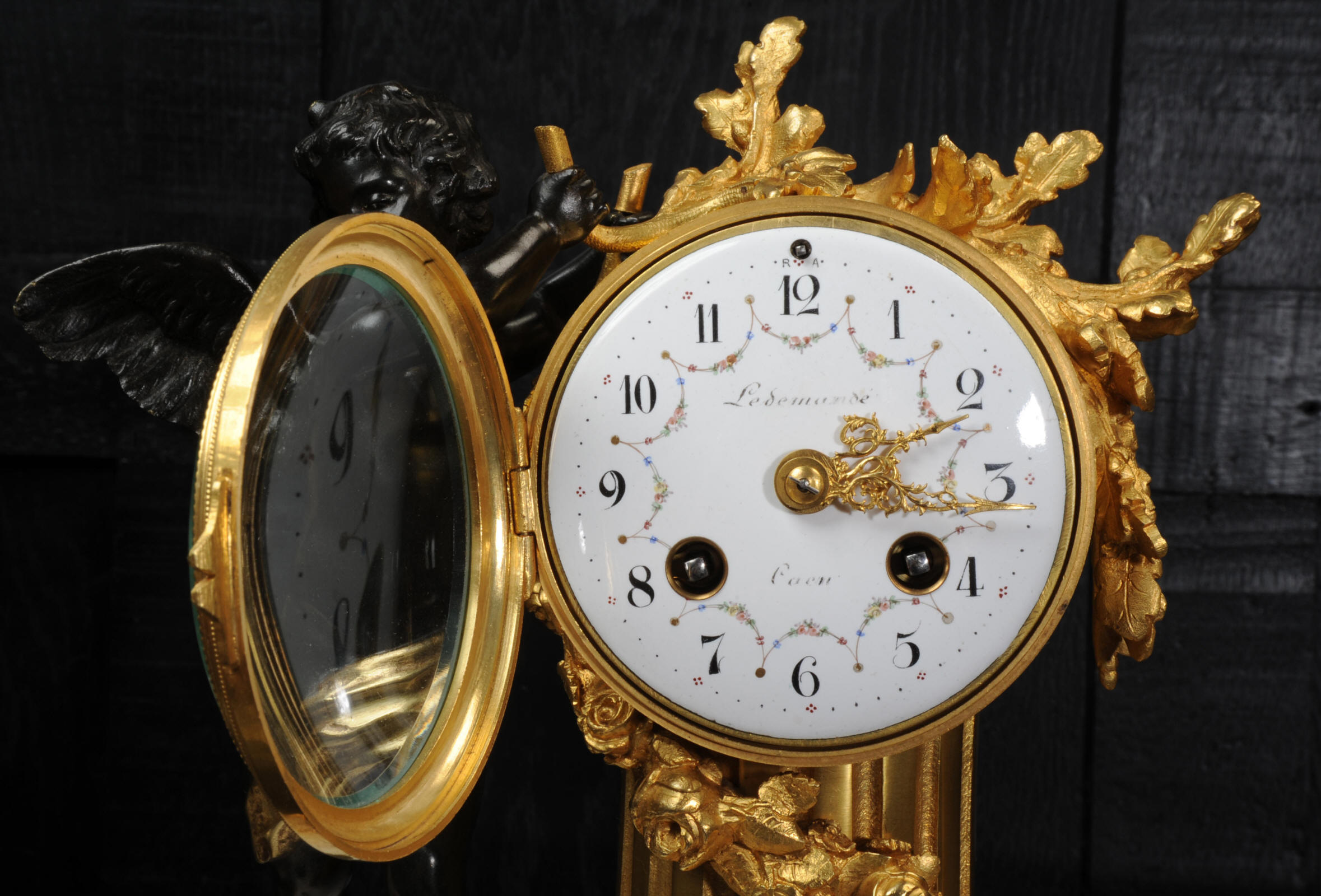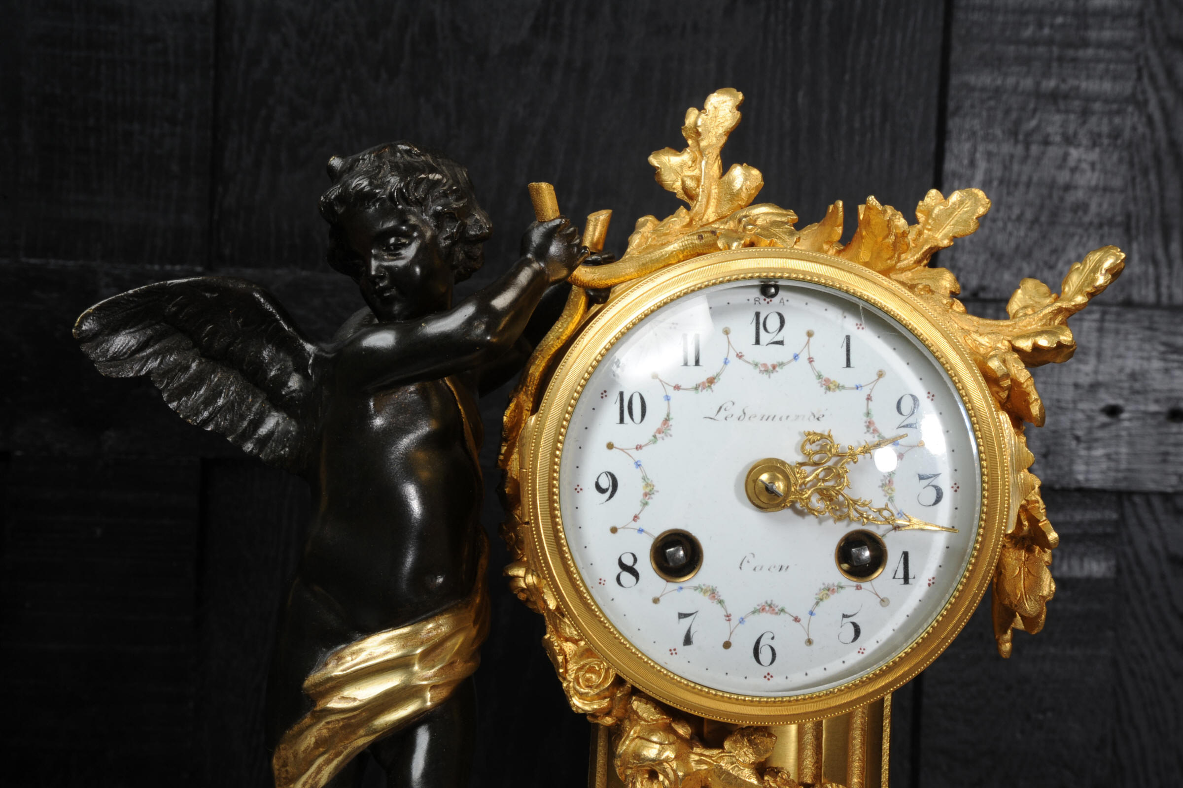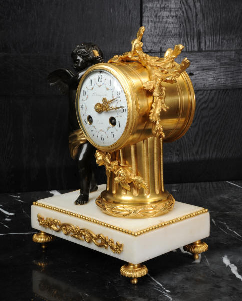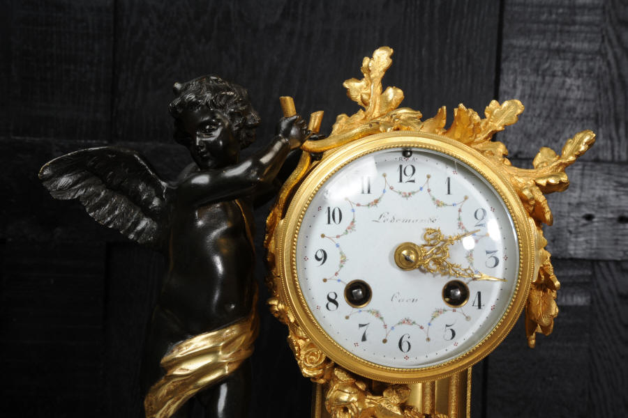 The pretty dial is porcelain enamel on copper, decorated with pretty floral swags and finely fretted gilt hands. The French movement is of high quality and is in excellent clean and running condition having been fully overhauled by our clockmaker. Pendulum is a replacement. It runs for 8 days and strikes the hours and halves on a bell.