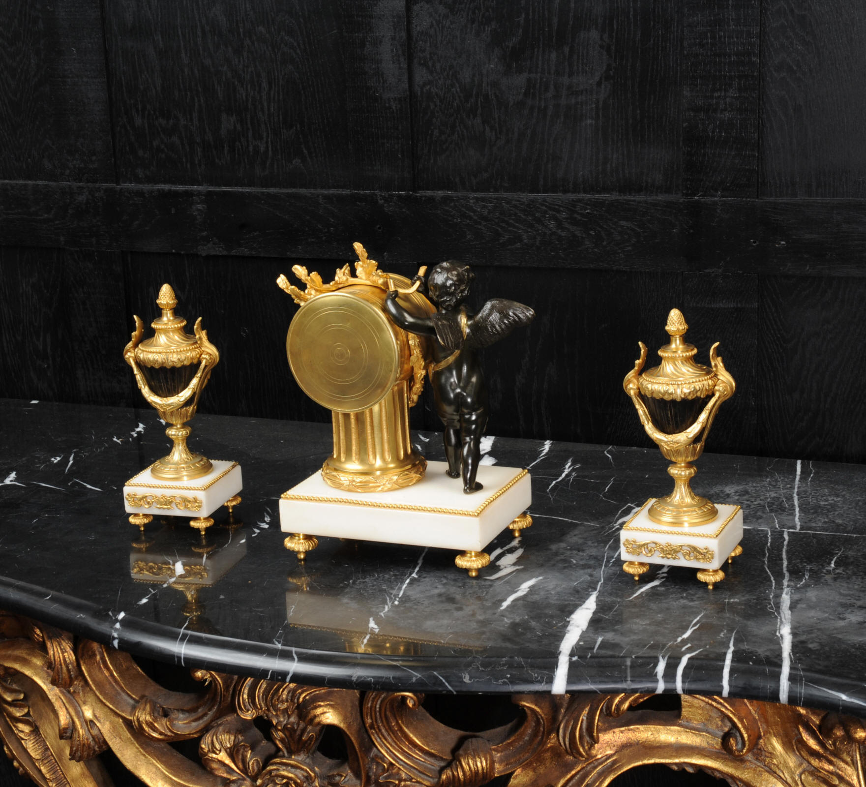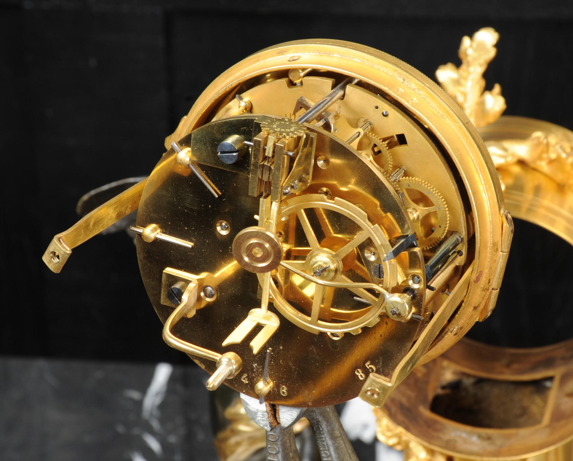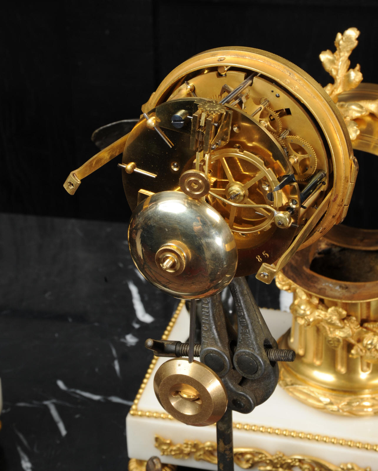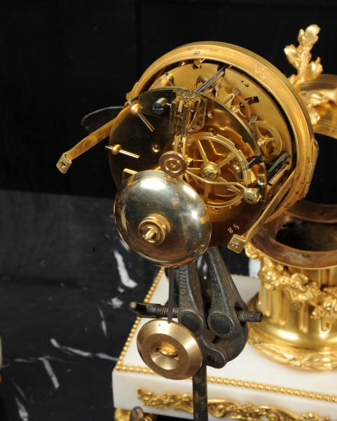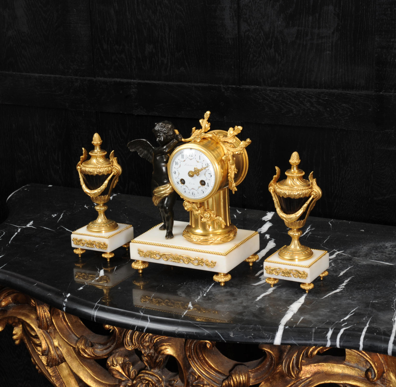 The pretty dial is porcelain enamel on copper, decorated with pretty floral swags and finely fretted gilt hands. The French movement is of high quality and is in excellent clean and running condition having been fully overhauled by our clockmaker. Pendulum is a replacement. It runs for 8 days and strikes the hours and halves on a bell.