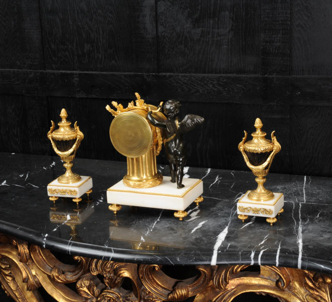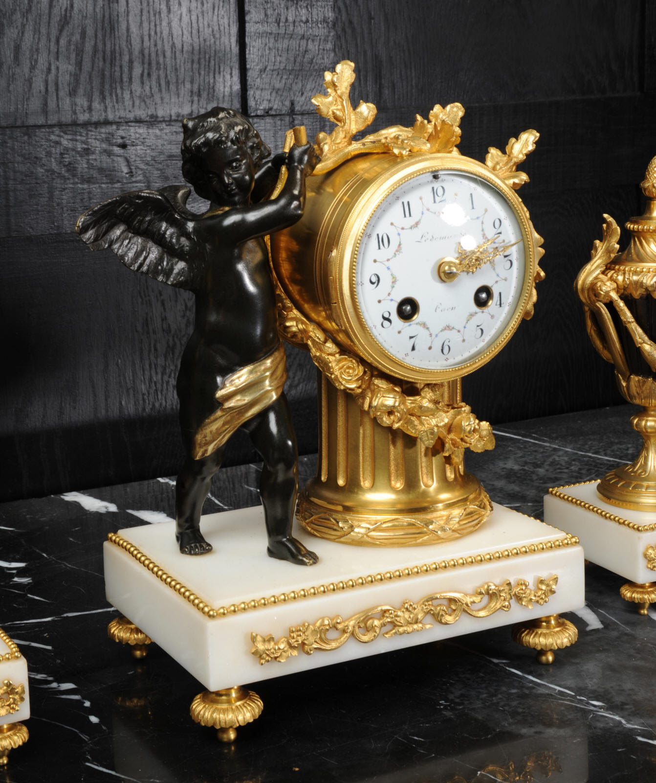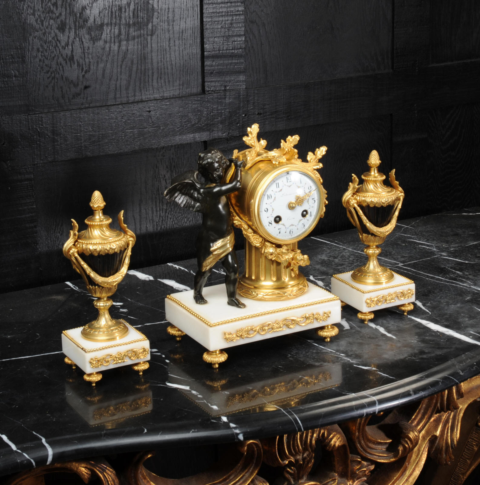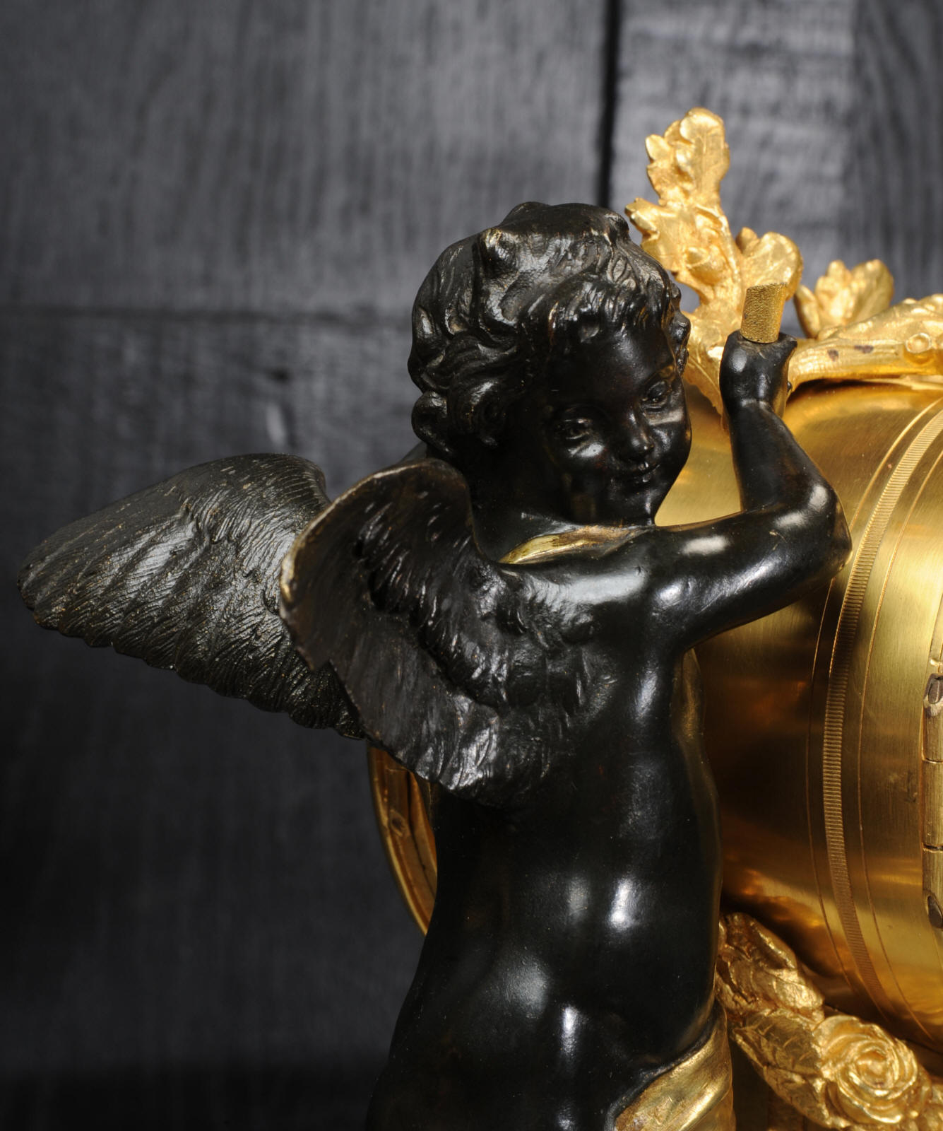 The pretty dial is porcelain enamel on copper, decorated with pretty floral swags and finely fretted gilt hands. The French movement is of high quality and is in excellent clean and running condition having been fully overhauled by our clockmaker. Pendulum is a replacement. It runs for 8 days and strikes the hours and halves on a bell.