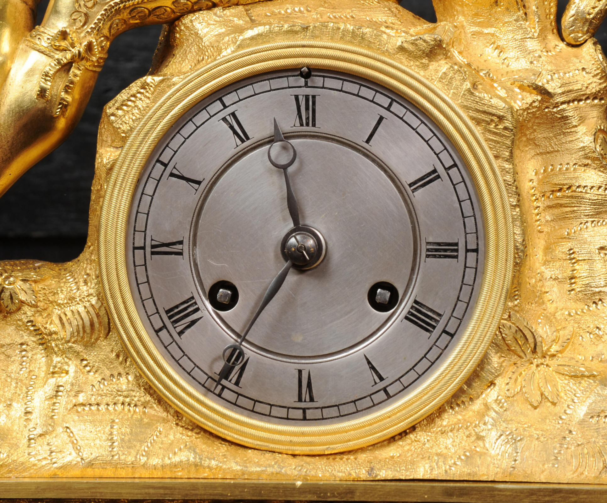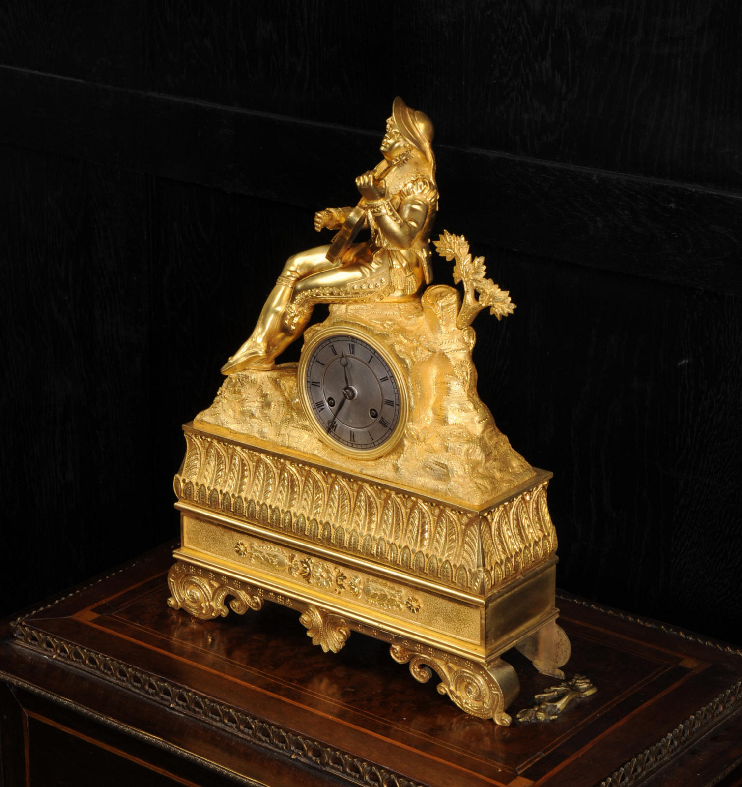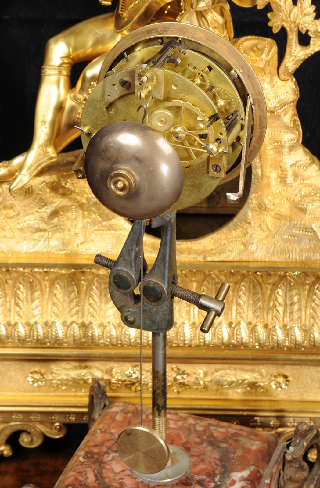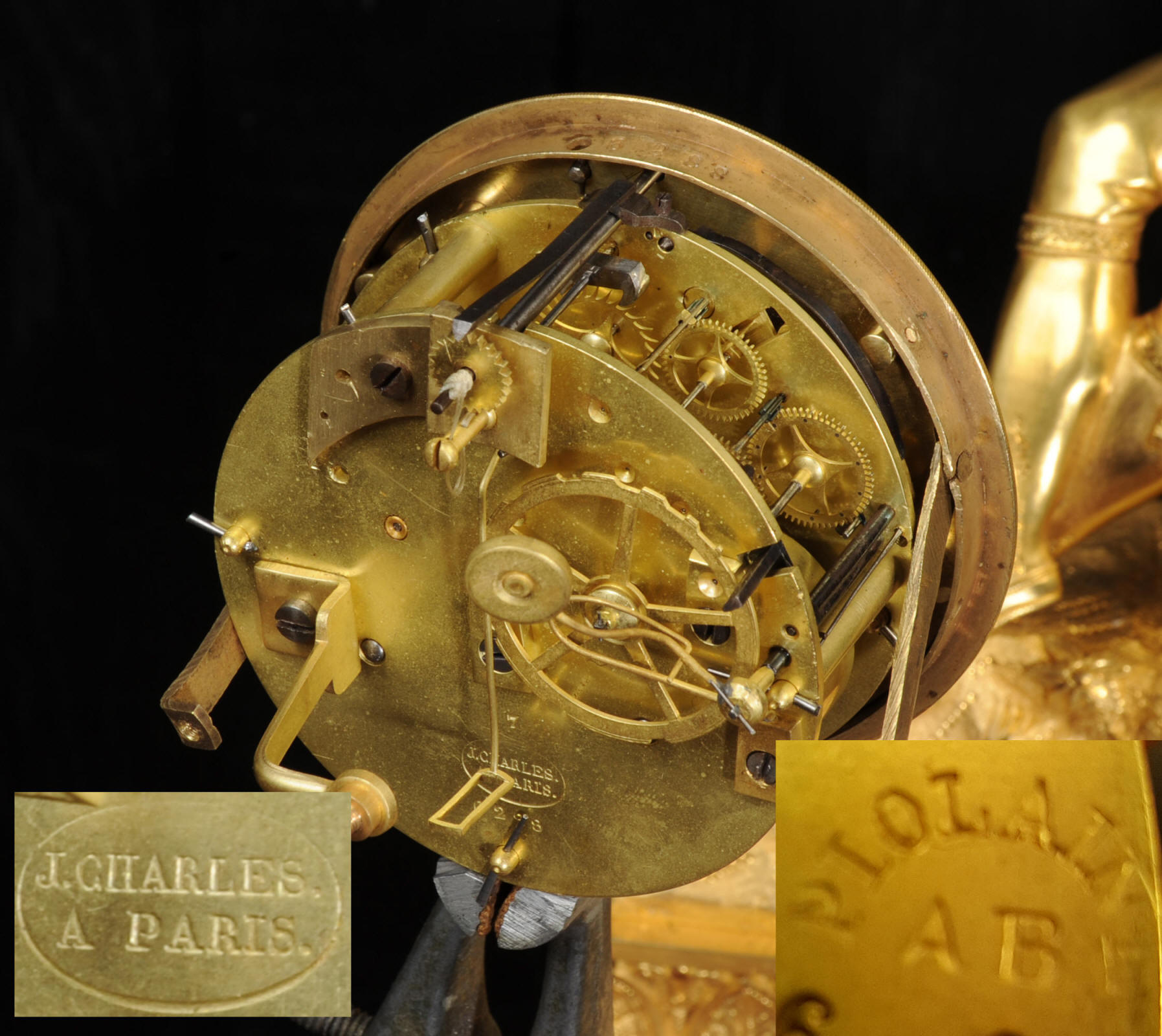 The dial is silvered bronze, lettered in black with original Breguet hands. The dial, bezel, rear bezel and the case are marked with matching serial numbers. Please note this style of clock does not have a glass bezel or rear door. The early French movement is of high quality and is by Charles of Paris and is in excellent clean and running condition having been fully overhauled by our clockmaker. On the rear plate is the mark of the retailer Piolaine of Paris. Both clockmaker and retailer are listed in Tardy, Dictionnaire Des Horlogers. It an early French movement with silk suspension and small plates. It has the more unusual through dial rate adjustment. Pendulum is a replacement. It runs for 8 days and strikes the hours and halves on a bell. Click the video clip below to hear the bell and watch the clock running. Condition of the case is excellent, the original gilding is beautifully clean and bright with some wear, mostly to the sides and rear of the case as these areas were not as heavily gilded as the front originally. There is an old repair to the right hand bracket foot. The dial is in very good condition with just some slight marks to the recent silvering. This is a stunning clock, almost 200 years old, in fine condition.