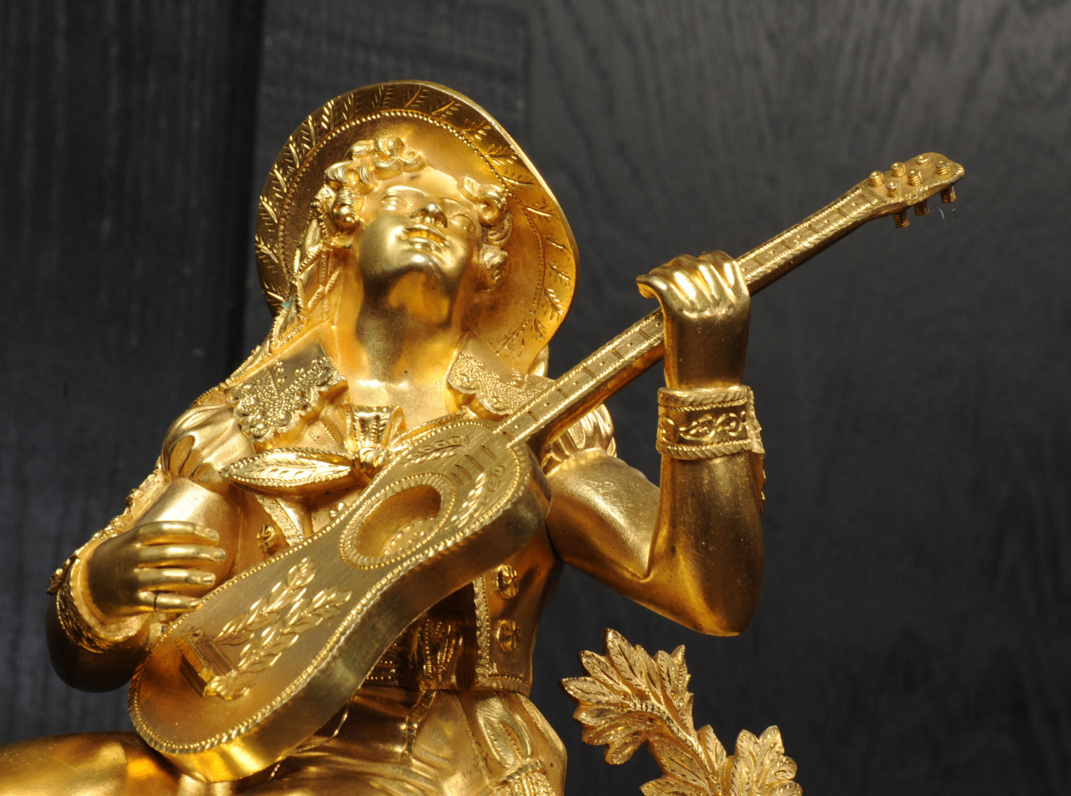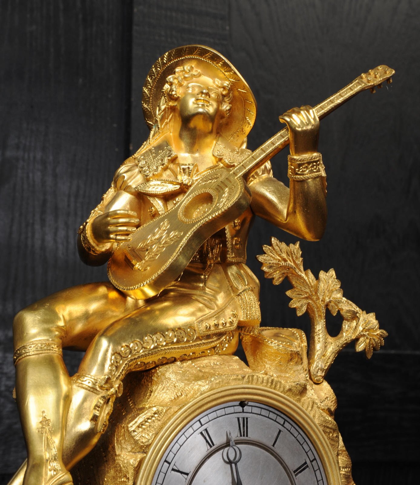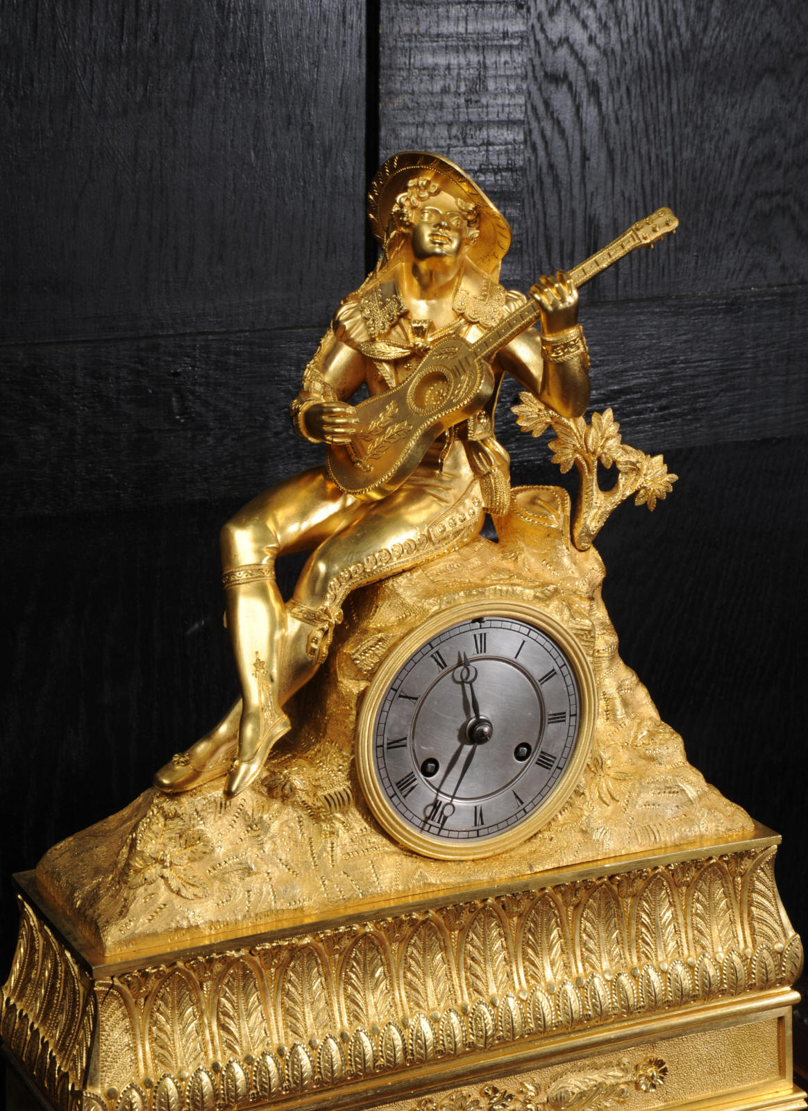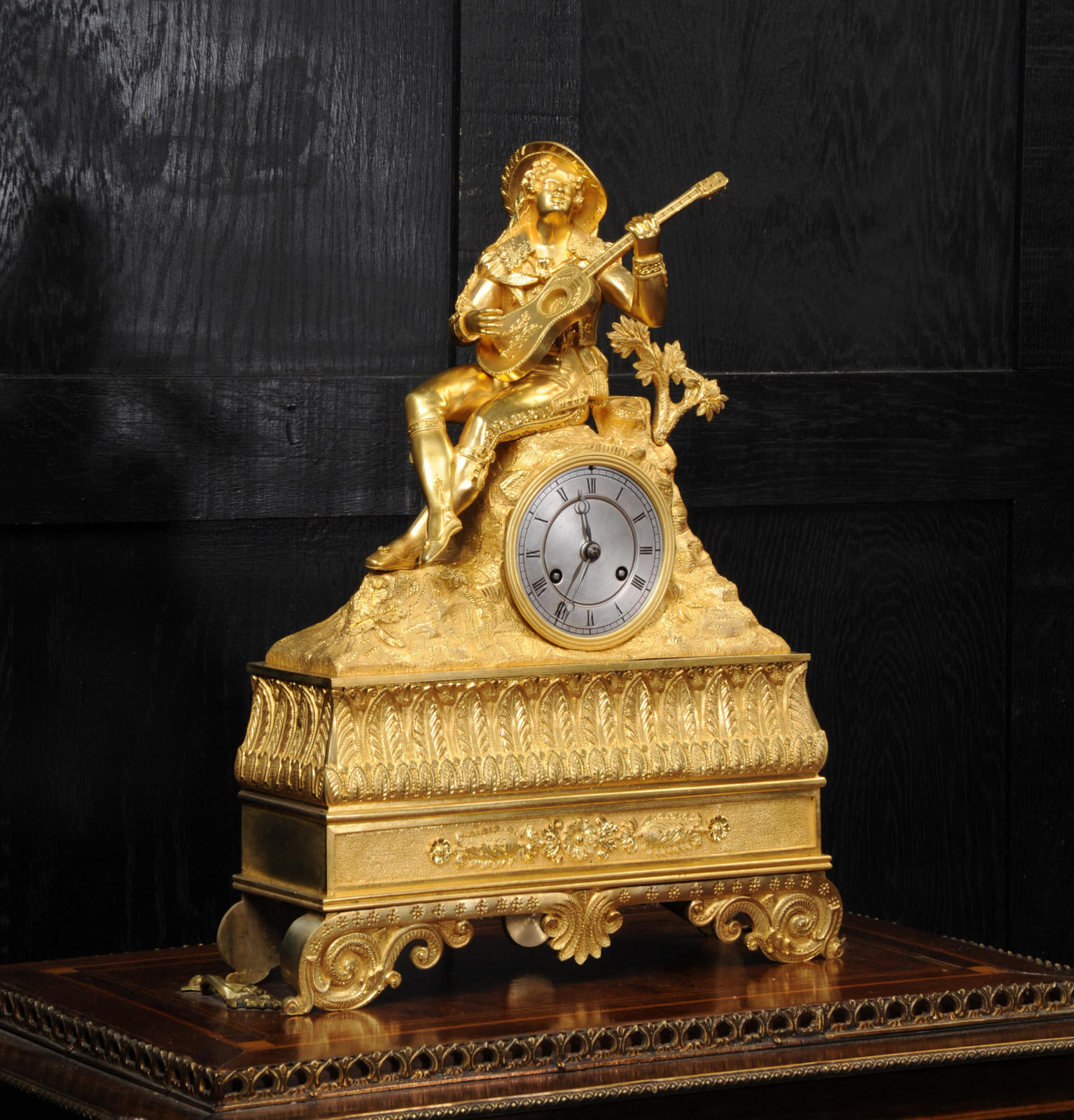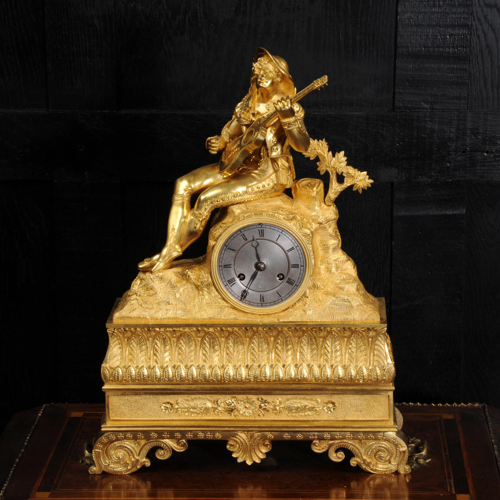 The dial is silvered bronze, lettered in black with original Breguet hands. The dial, bezel, rear bezel and the case are marked with matching serial numbers. Please note this style of clock does not have a glass bezel or rear door. The early French movement is of high quality and is by Charles of Paris and is in excellent clean and running condition having been fully overhauled by our clockmaker. On the rear plate is the mark of the retailer Piolaine of Paris. Both clockmaker and retailer are listed in Tardy, Dictionnaire Des Horlogers. It an early French movement with silk suspension and small plates. It has the more unusual through dial rate adjustment. Pendulum is a replacement. It runs for 8 days and strikes the hours and halves on a bell. Click the video clip below to hear the bell and watch the clock running. Condition of the case is excellent, the original gilding is beautifully clean and bright with some wear, mostly to the sides and rear of the case as these areas were not as heavily gilded as the front originally. There is an old repair to the right hand bracket foot. The dial is in very good condition with just some slight marks to the recent silvering. This is a stunning clock, almost 200 years old, in fine condition.