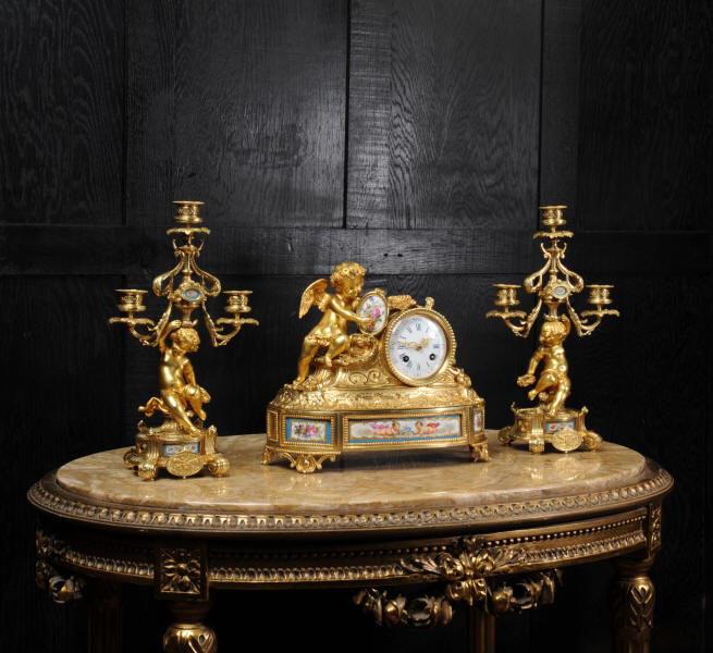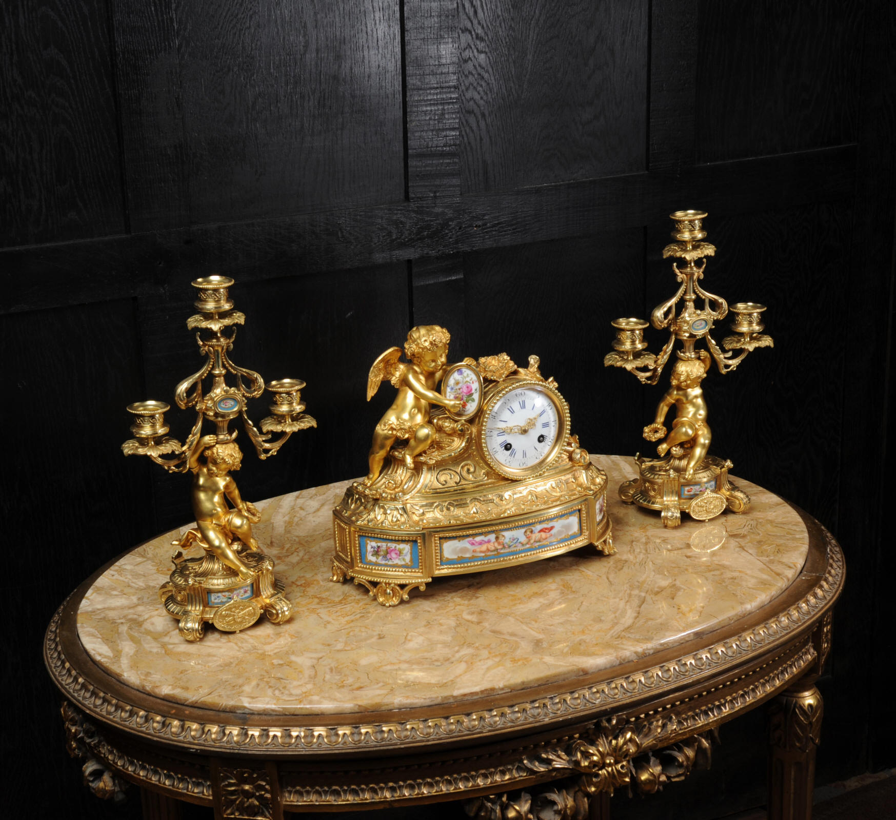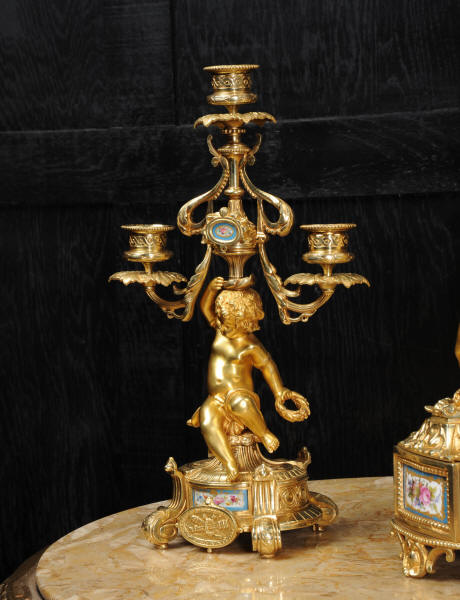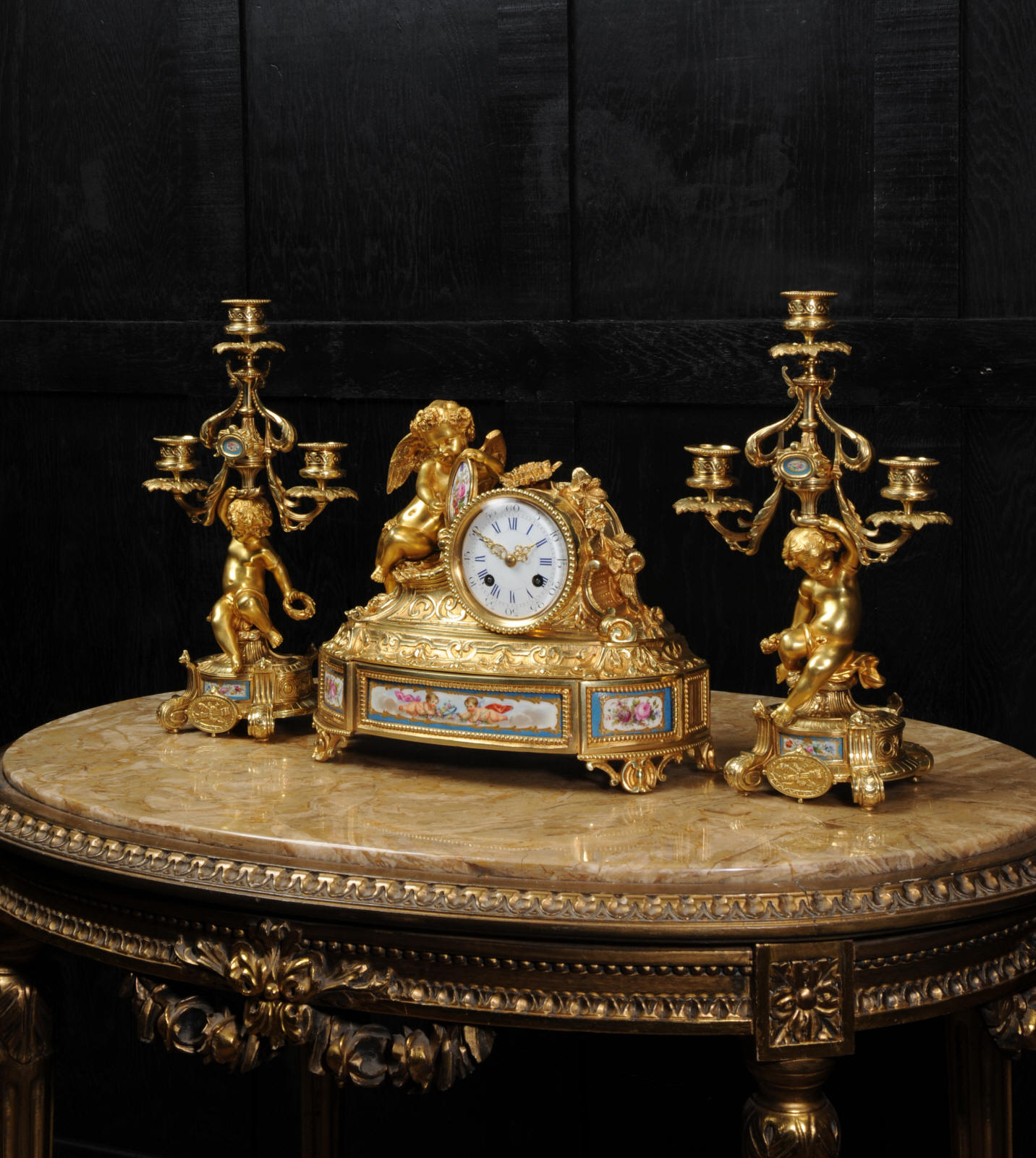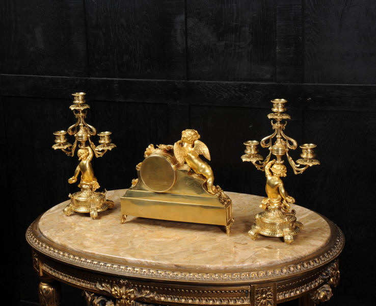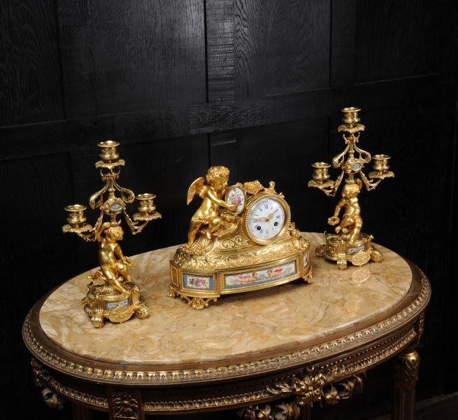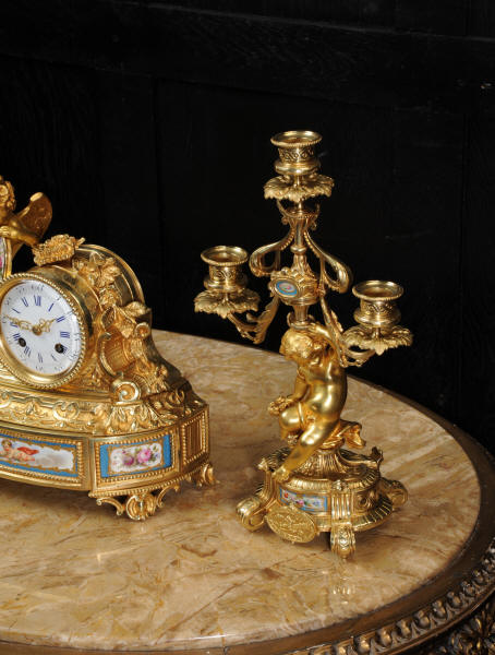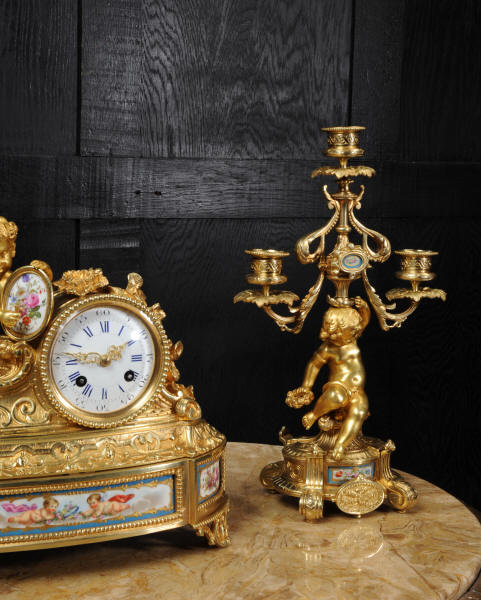 The dial is porcelain enamel on copper with blued lettered hours and original finely fretted gilt brass hands. The hobnail bezel is fitted with convex glass. The French movement is by Japy Freres and is of high quality and is in excellent clean and running condition having been fully overhauled by our clockmaker. It is an early version of the Pendule de Paris movement with spring hammer stop and has been converted from silk suspension to spring at some time. Pendulum is a replacement. It runs for 8 days and strikes the hours and halves on a bell. Click the video clip to hear the bell and watch the clock running! Condition of the case is excellent, the original gilding is beautifully clean and bright with hardly any wear or discolouration and there are no losses. Porcelain is also in excellent condition with no damage. The dial is also in excellent condition just a small nibble next to the right hand winding hole. The set makes a stunning display as you can see below.