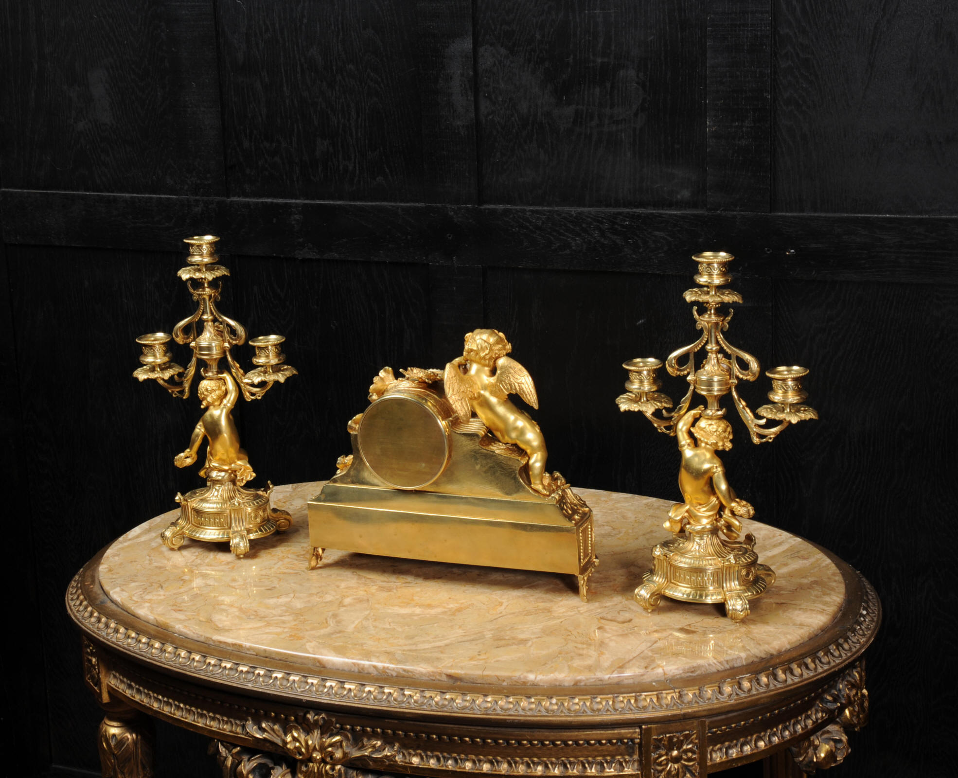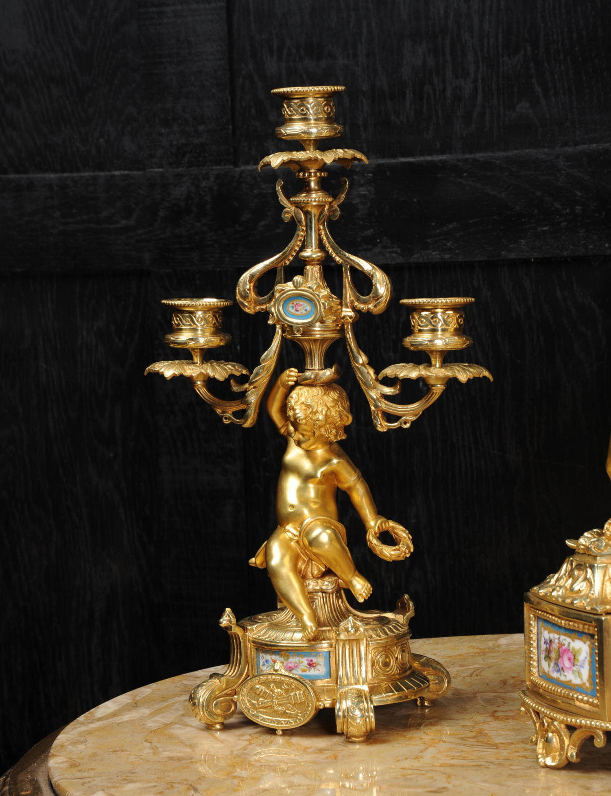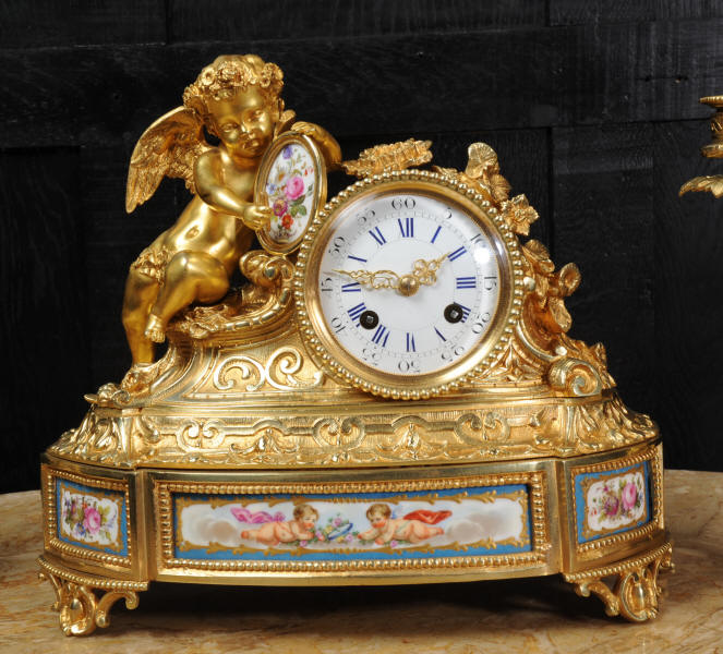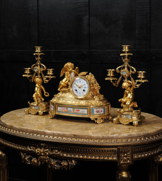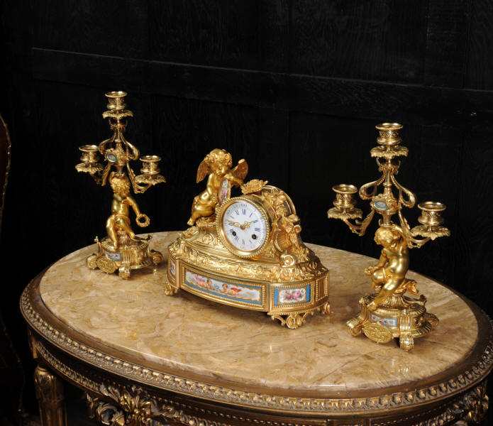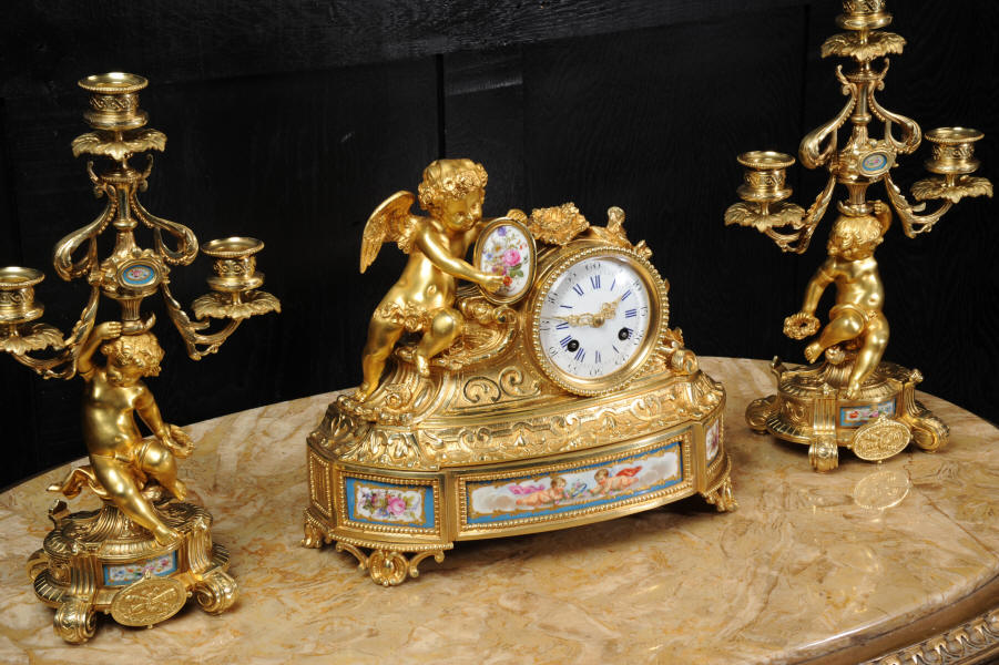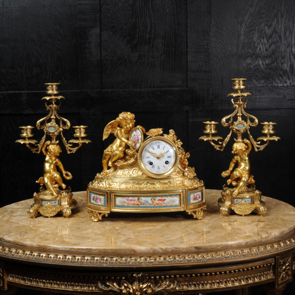 The dial is porcelain enamel on copper with blued lettered hours and original finely fretted gilt brass hands. The hobnail bezel is fitted with convex glass. The French movement is by Japy Freres and is of high quality and is in excellent clean and running condition having been fully overhauled by our clockmaker. It is an early version of the Pendule de Paris movement with spring hammer stop and has been converted from silk suspension to spring at some time. Pendulum is a replacement. It runs for 8 days and strikes the hours and halves on a bell. Click the video clip to hear the bell and watch the clock running! Condition of the case is excellent, the original gilding is beautifully clean and bright with hardly any wear or discolouration and there are no losses. Porcelain is also in excellent condition with no damage. The dial is also in excellent condition just a small nibble next to the right hand winding hole. The set makes a stunning display as you can see below.