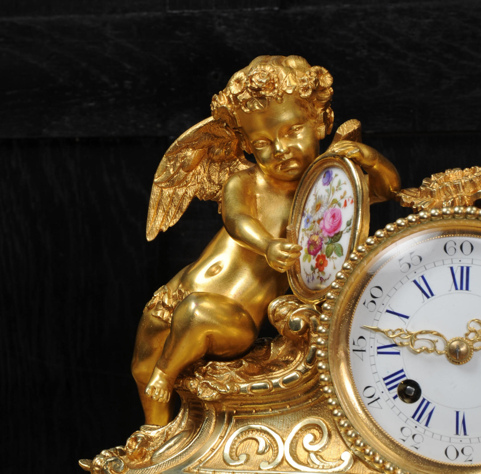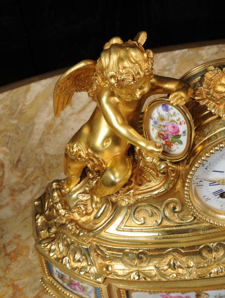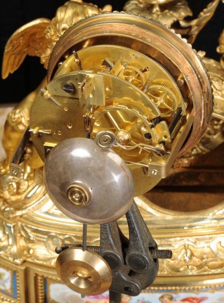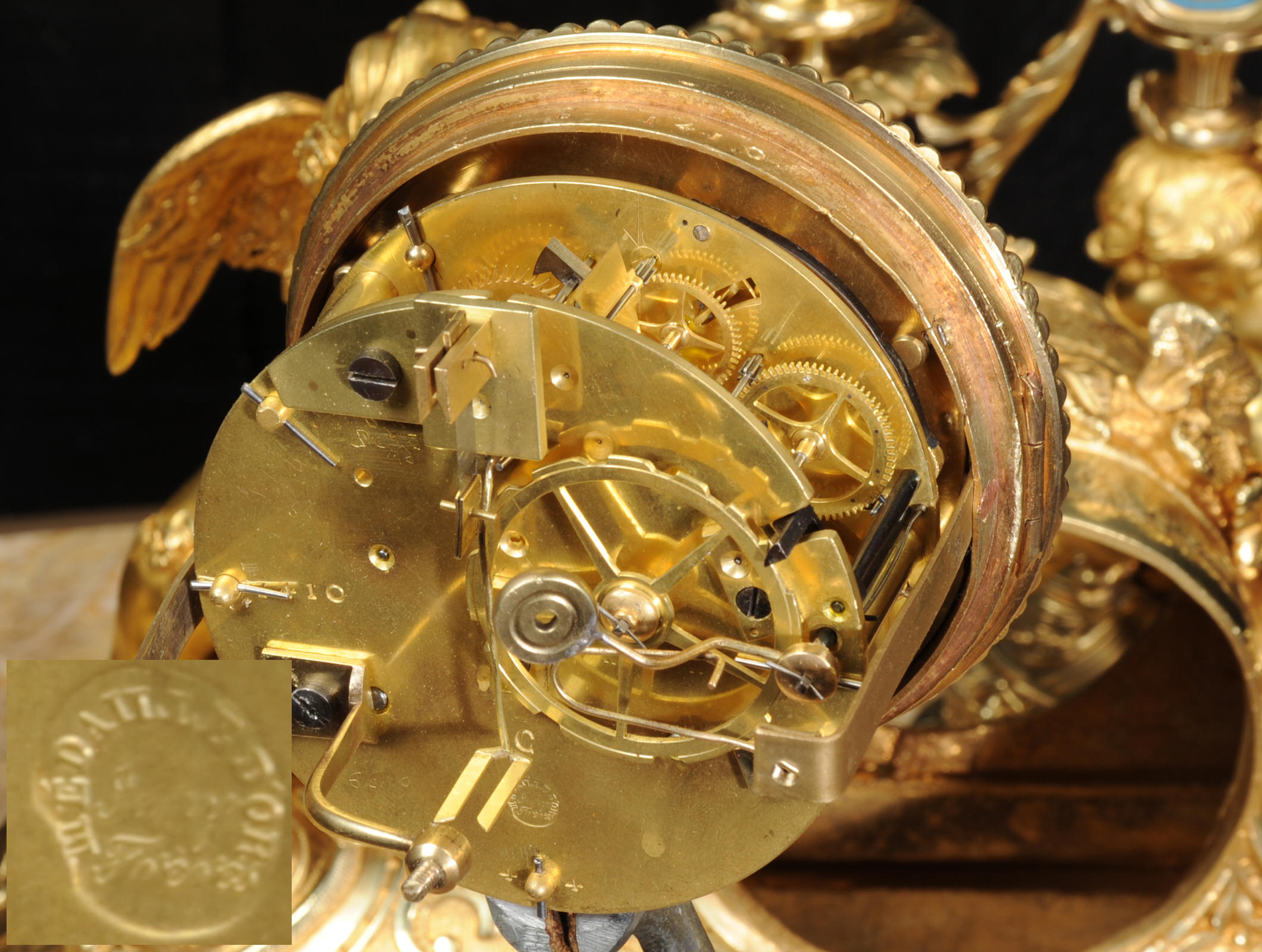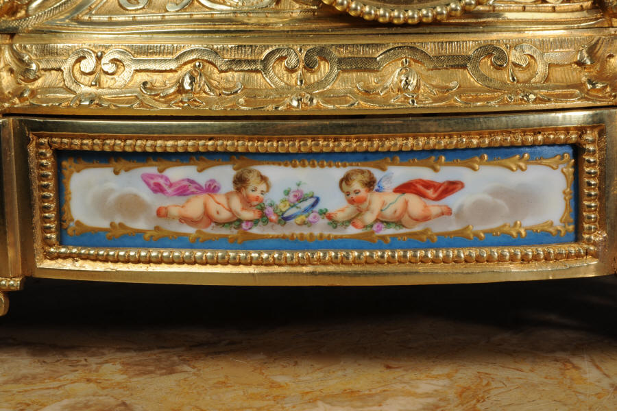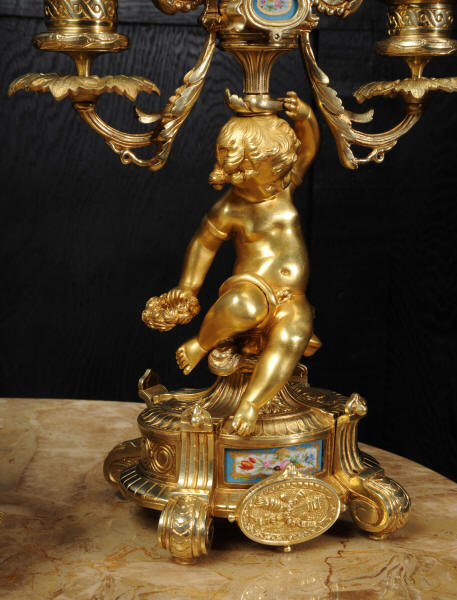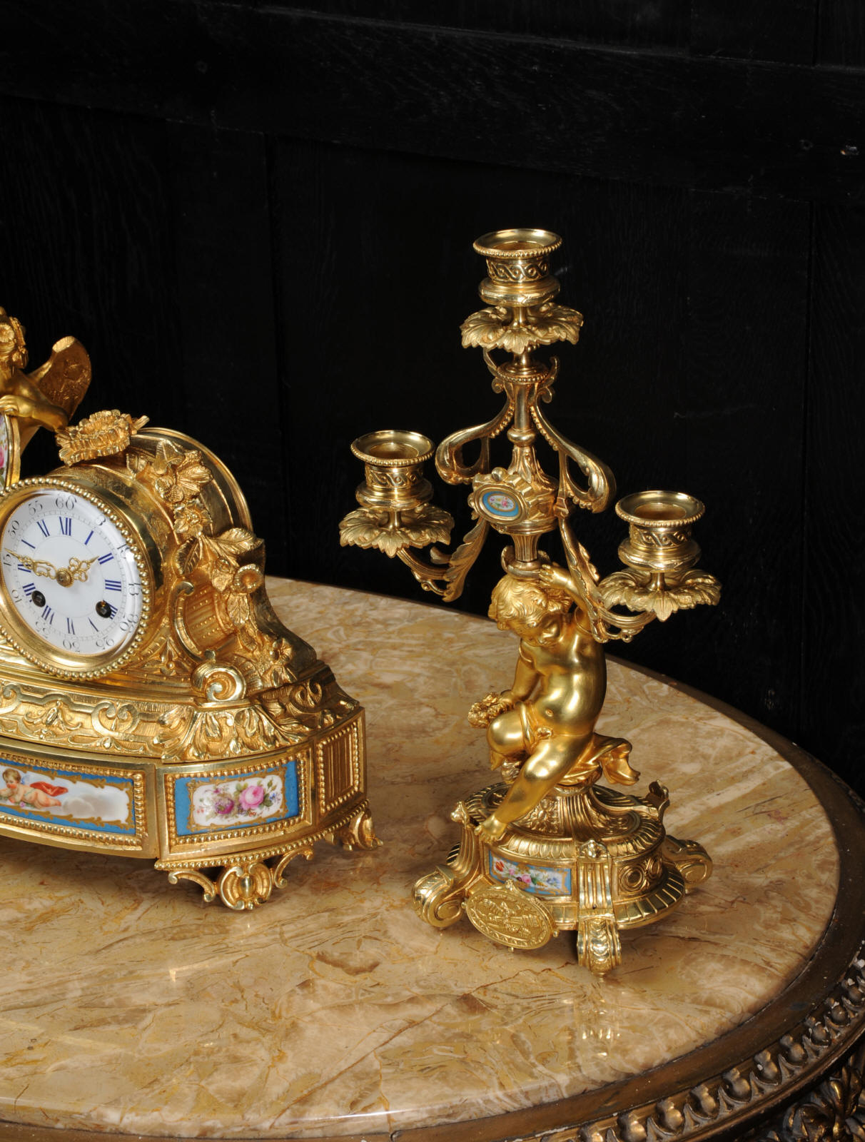 The dial is porcelain enamel on copper with blued lettered hours and original finely fretted gilt brass hands. The hobnail bezel is fitted with convex glass. The French movement is by Japy Freres and is of high quality and is in excellent clean and running condition having been fully overhauled by our clockmaker. It is an early version of the Pendule de Paris movement with spring hammer stop and has been converted from silk suspension to spring at some time. Pendulum is a replacement. It runs for 8 days and strikes the hours and halves on a bell. Click the video clip to hear the bell and watch the clock running! Condition of the case is excellent, the original gilding is beautifully clean and bright with hardly any wear or discolouration and there are no losses. Porcelain is also in excellent condition with no damage. The dial is also in excellent condition just a small nibble next to the right hand winding hole. The set makes a stunning display as you can see below.