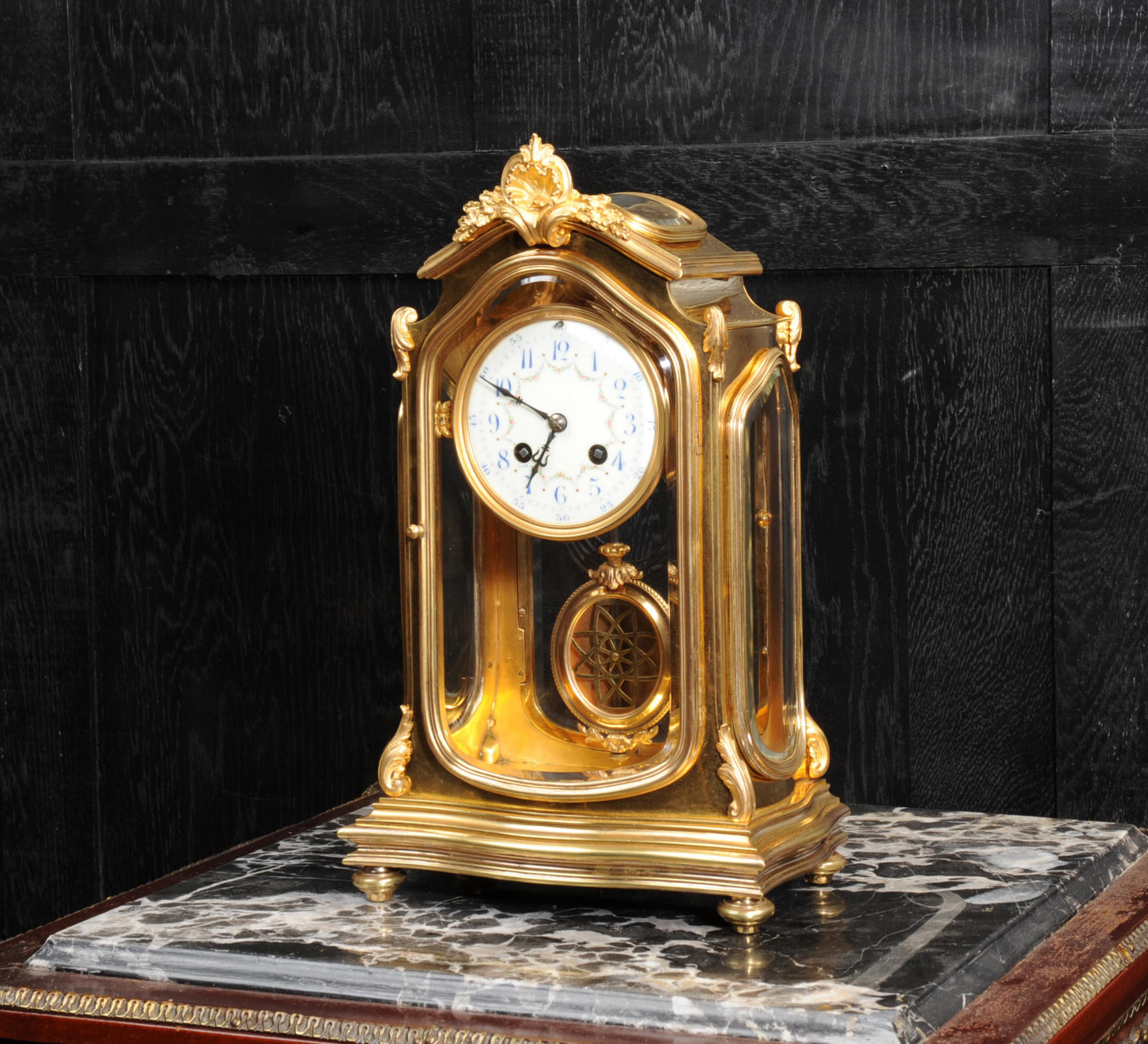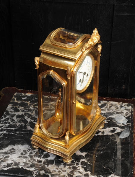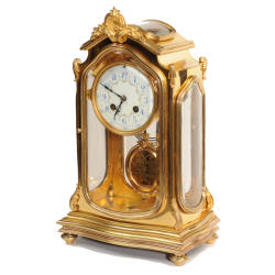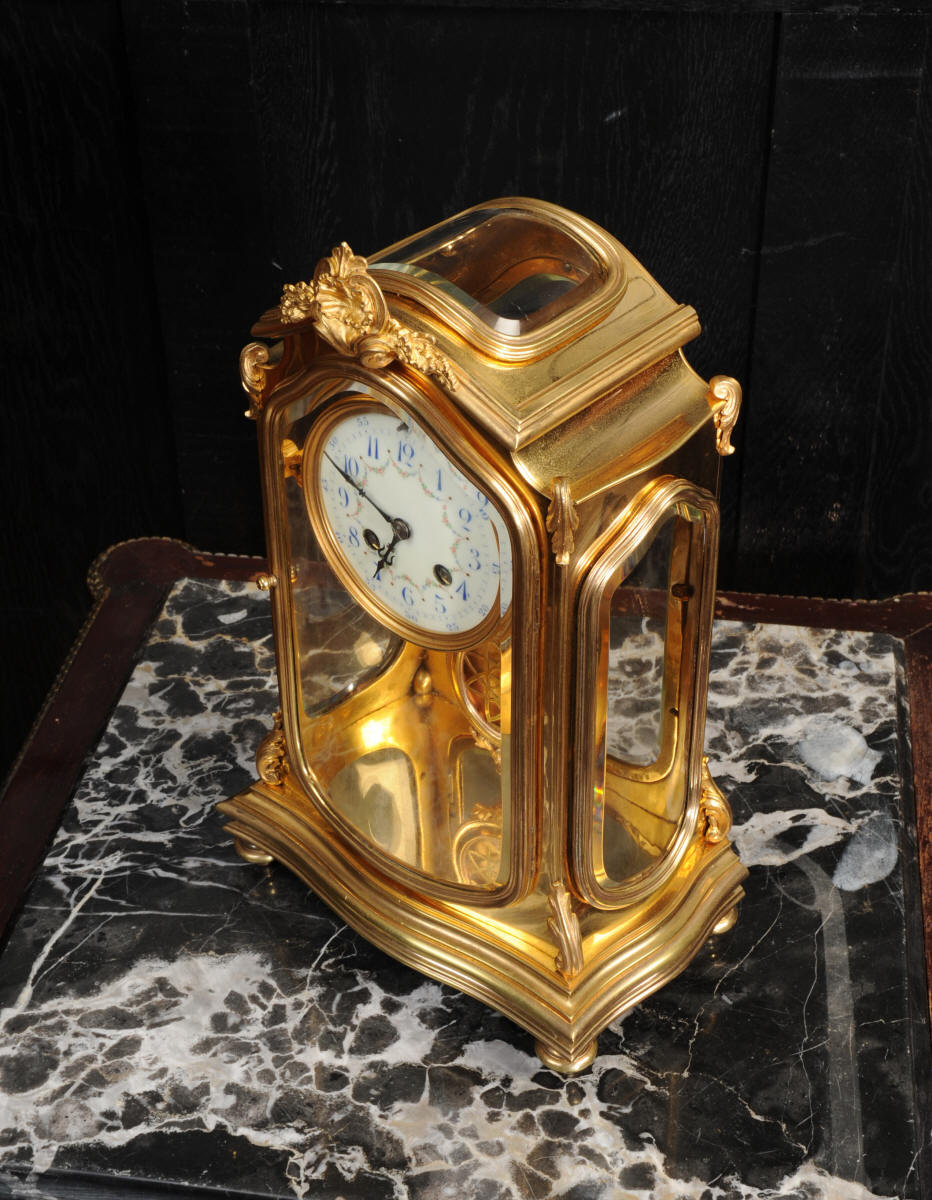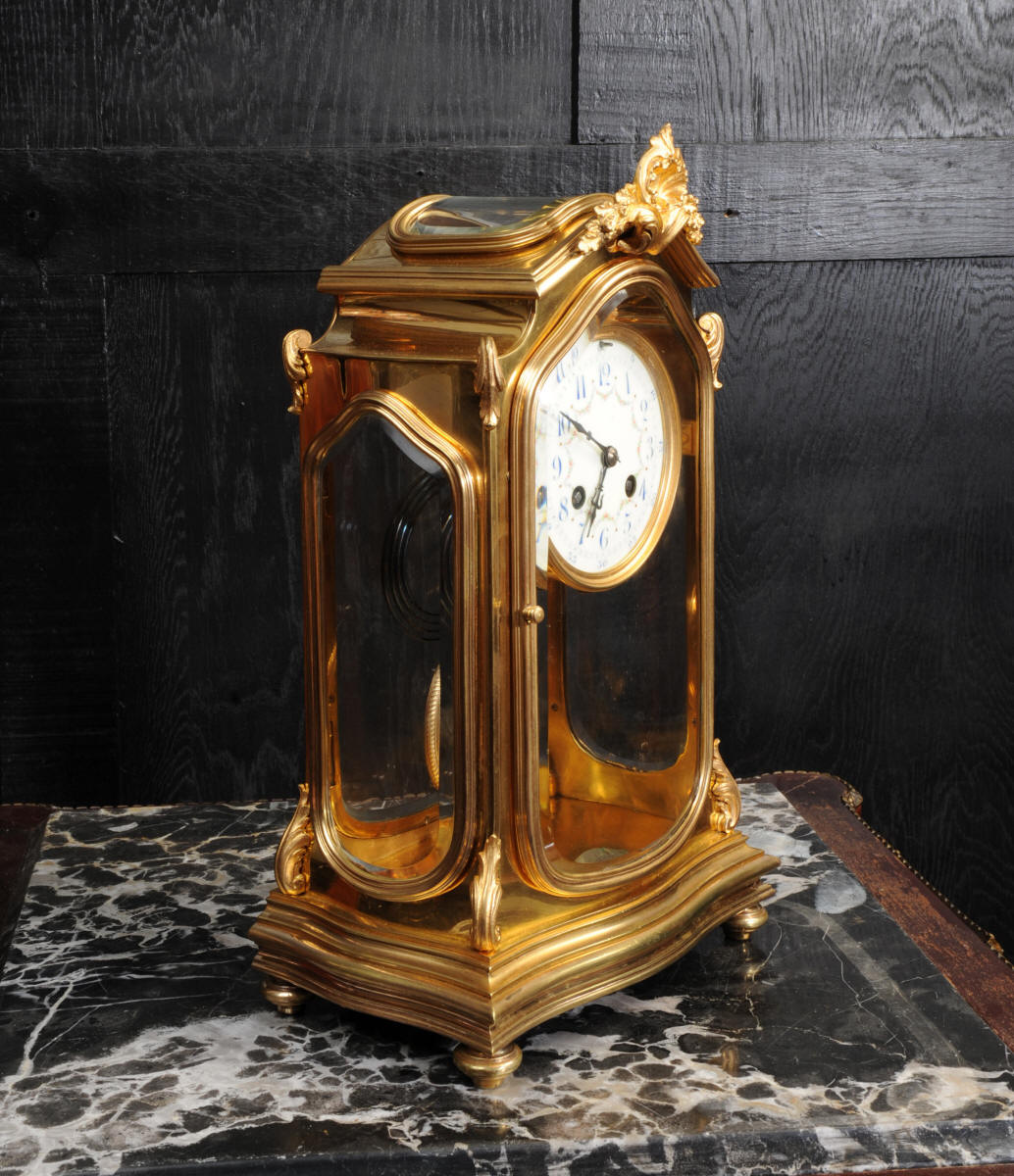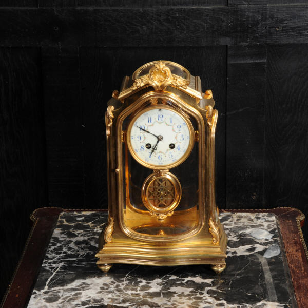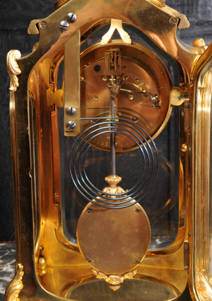 The pretty porcelain enamel dial is delicately painted with floral swags and is complete with original blued steel hands. The pendulum is also gilt bronze with silvered steel rod and decoratively fretted panel. The French movement is by Japy Freres and is of high quality. It is in excellent clean and running condition having been fully overhauled by our clockmaker. Pendulum is a original. It runs for 8 days and strikes the hours and halves on a gong. Click the video clip below to hear the gong and watch the clock running! Condition of the case is excellent, the original gilding is beautifully clean and bright with some wear and discolouration. The dial is also in excellent with no damage. The glass is also excellent with no major damage just an occasional light scratch.