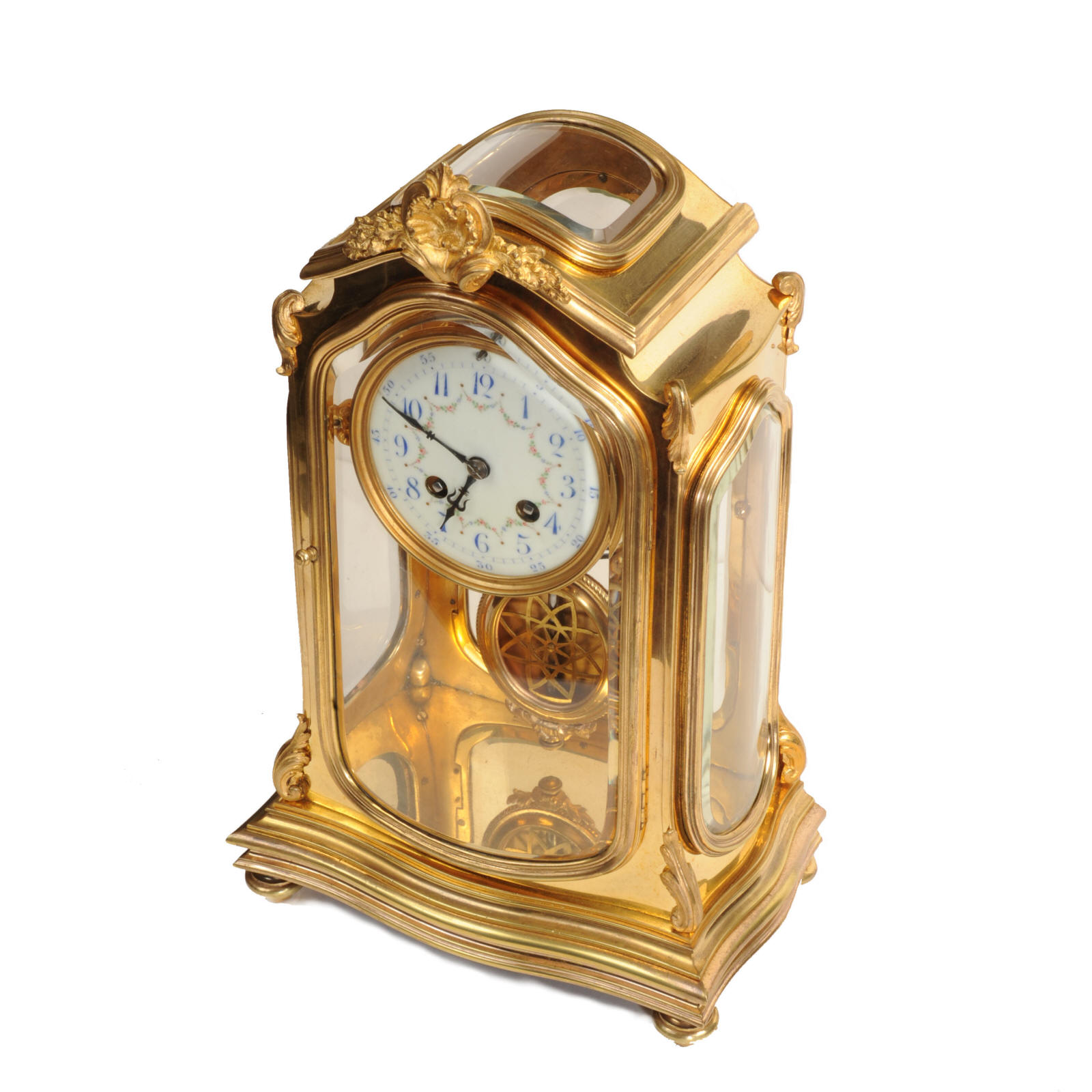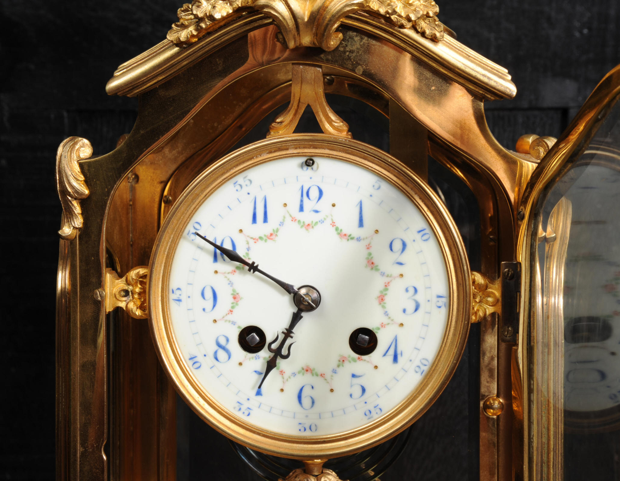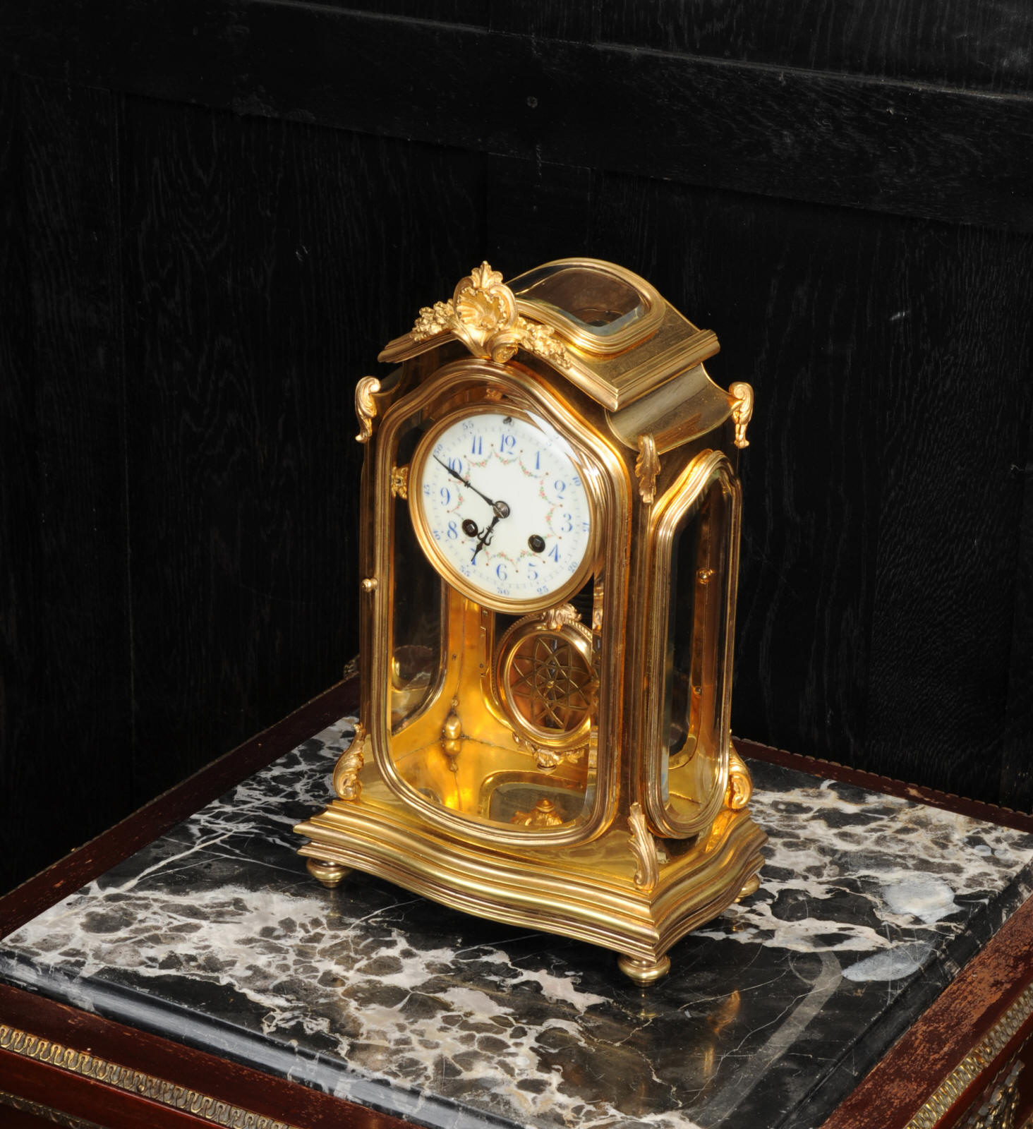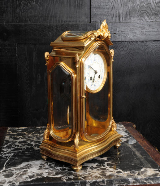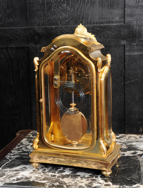 The pretty porcelain enamel dial is delicately painted with floral swags and is complete with original blued steel hands. The pendulum is also gilt bronze with silvered steel rod and decoratively fretted panel. The French movement is by Japy Freres and is of high quality. It is in excellent clean and running condition having been fully overhauled by our clockmaker. Pendulum is a original. It runs for 8 days and strikes the hours and halves on a gong. Click the video clip below to hear the gong and watch the clock running! Condition of the case is excellent, the original gilding is beautifully clean and bright with some wear and discolouration. The dial is also in excellent with no damage. The glass is also excellent with no major damage just an occasional light scratch.