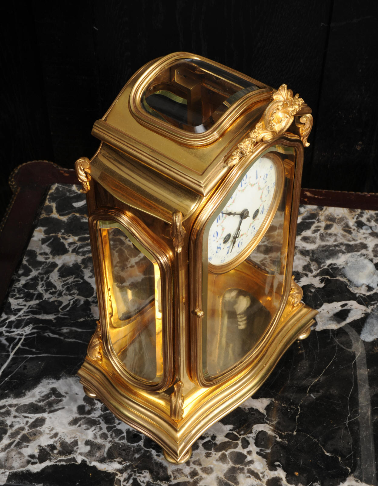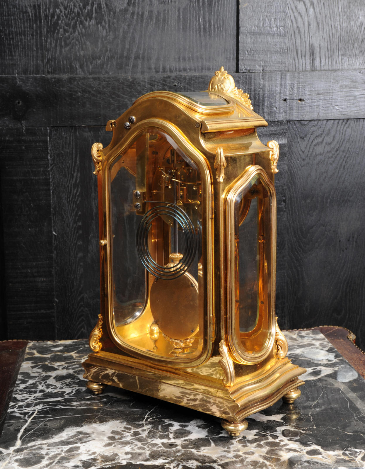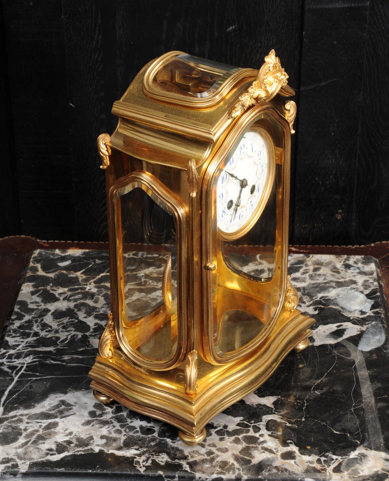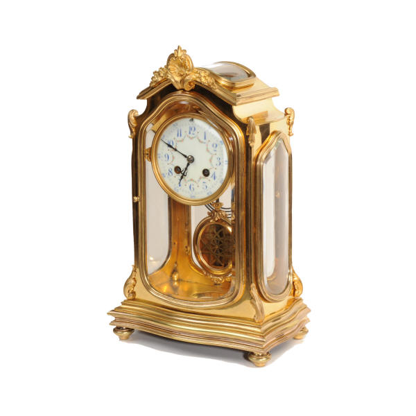 The pretty porcelain enamel dial is delicately painted with floral swags and is complete with original blued steel hands. The pendulum is also gilt bronze with silvered steel rod and decoratively fretted panel. The French movement is by Japy Freres and is of high quality. It is in excellent clean and running condition having been fully overhauled by our clockmaker. Pendulum is a original. It runs for 8 days and strikes the hours and halves on a gong. Click the video clip below to hear the gong and watch the clock running! Condition of the case is excellent, the original gilding is beautifully clean and bright with some wear and discolouration. The dial is also in excellent with no damage. The glass is also excellent with no major damage just an occasional light scratch.