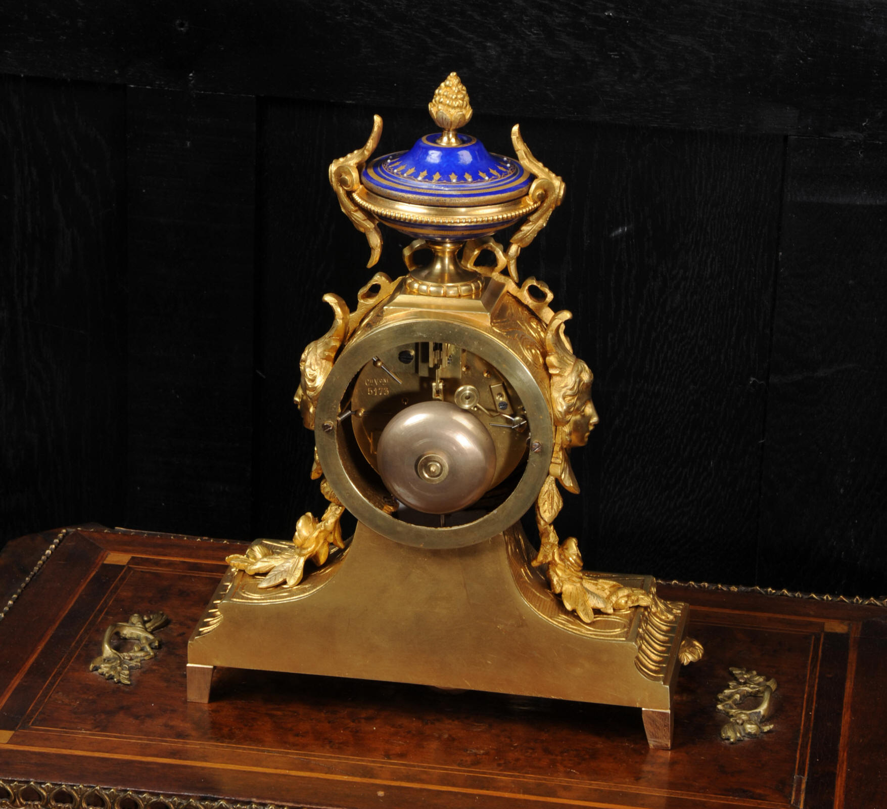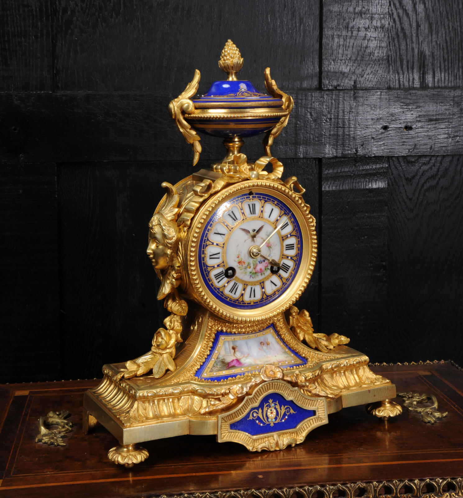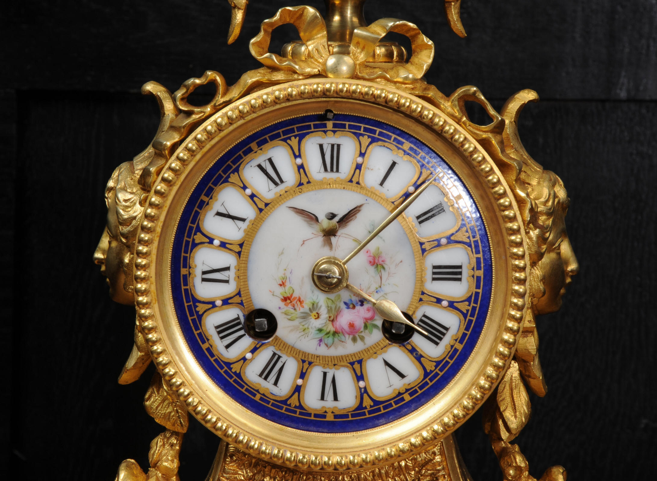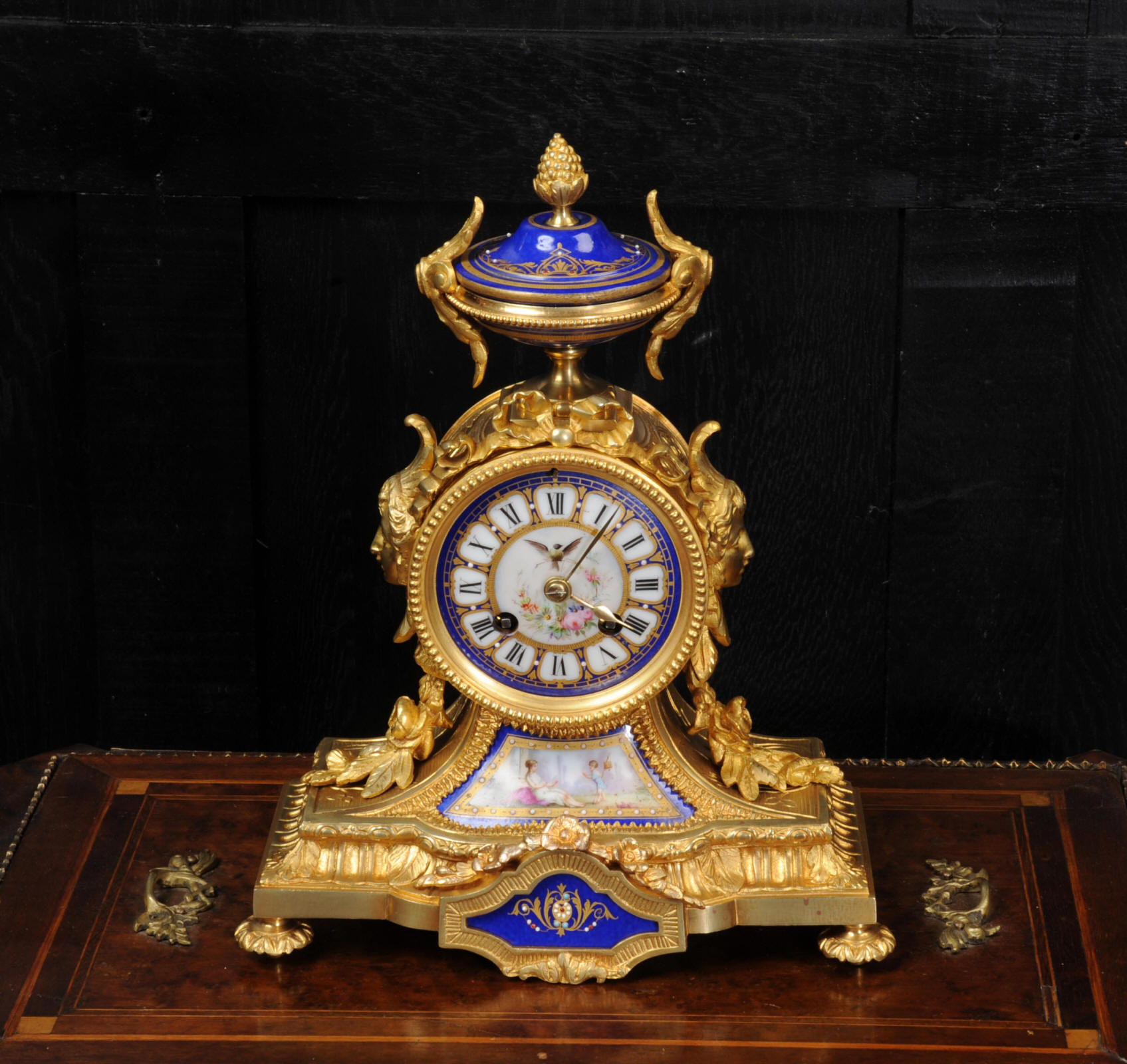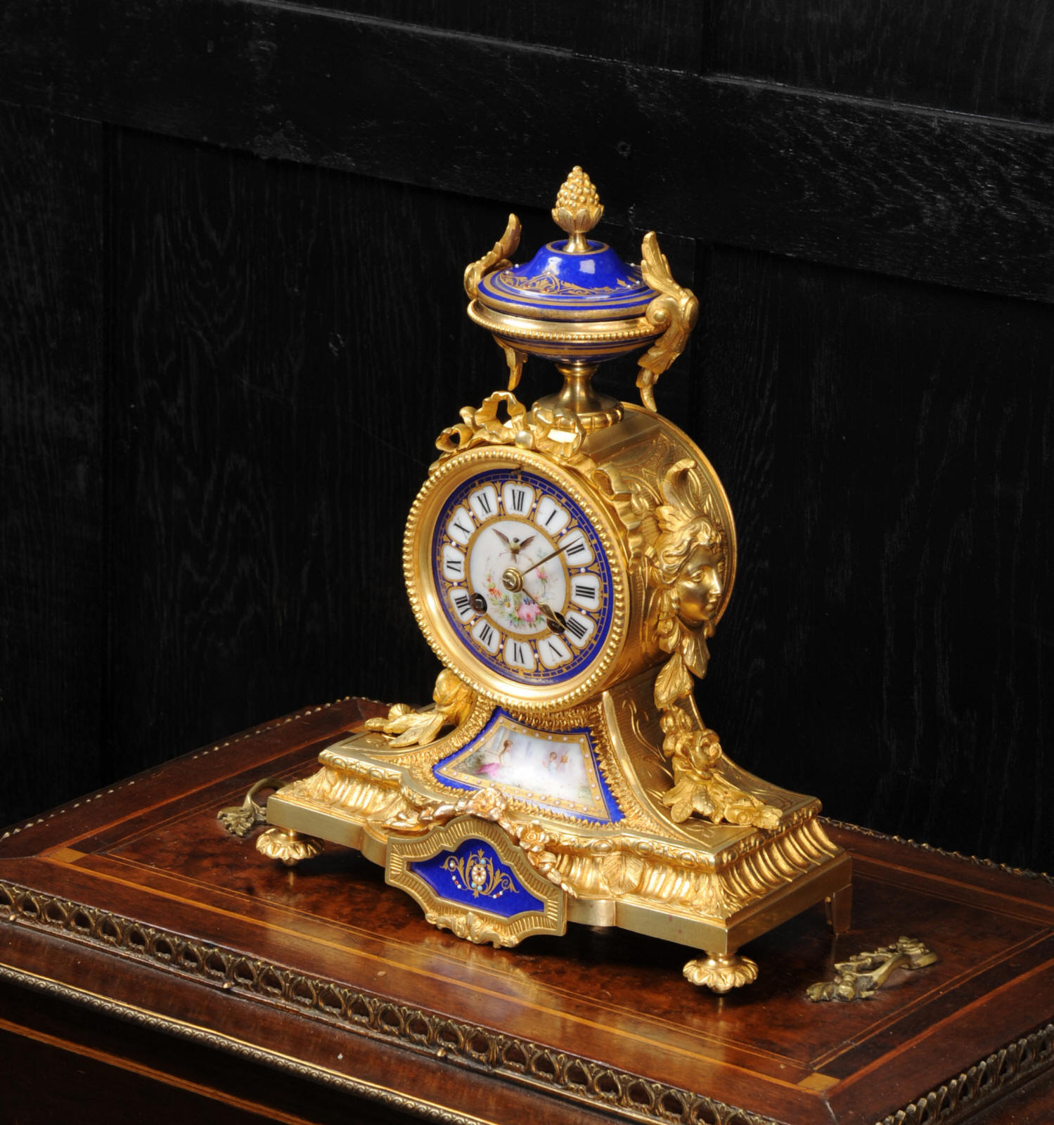 The dial itself is decorated with a bird and floral swags. It is lettered in white cartouches against the blue background enamel 'jewel' half-hour markers It is complete with original gilt brass hands. Above the dial is a porcelain urn with ormolu handles and a pineapple finial. To the sides are floral swags and goddess masks. Please note that this style of clock does not have a glazed bezel over the dial or a rear door. The French movement is by Japy Freres and has the makers mark on the backplate along with that of the retailer. It is of high quality and is in excellent clean and running condition having been fully overhauled by our clockmaker. Pendulum is an old replacement. The movement is fitted with the superior rack striking system. It runs for 8 days and strikes the hours and halves on a bell. Condition of the case is excellent, the original gilding is beautifully clean and bright with just some minor wear on the high spots and some slight disclouration. The dial is also in good condition, one 'jewel' is missing from near the 4 O'clock and some chipping around the winding holes. The over-glaze gilt decoration is very good. The porcelain is also very good, as with the dial most of the over-glaze gilt decoration is present and in good condition. This is a stunning clock in lovely original condition, ready to add to your collection.
