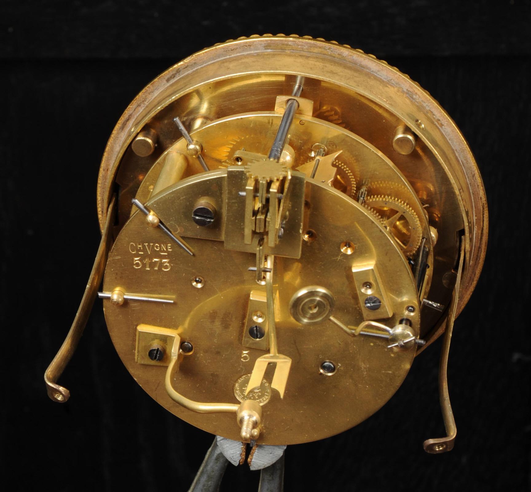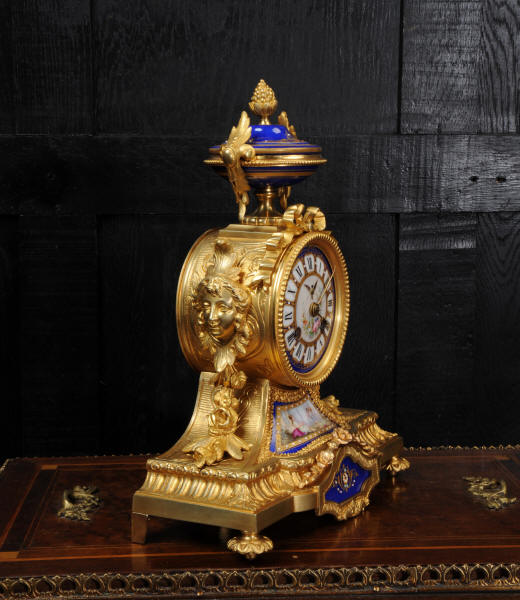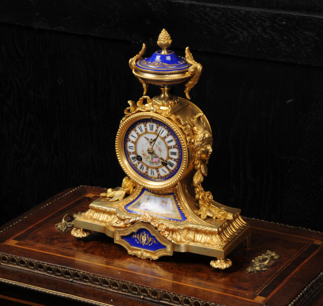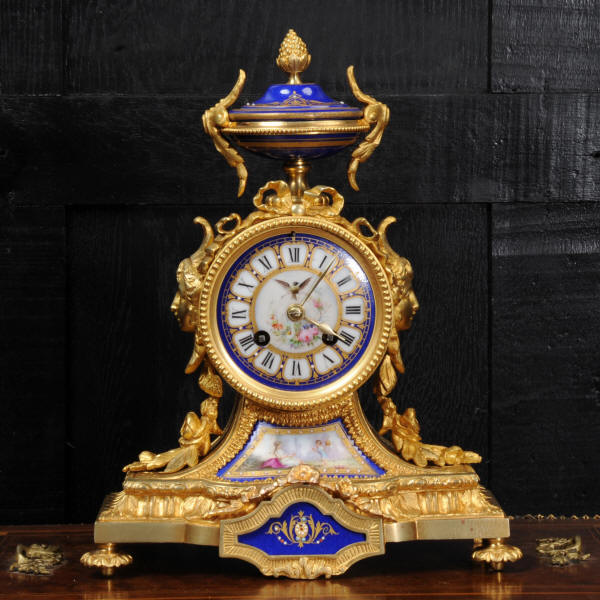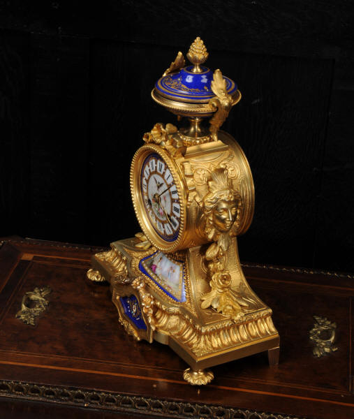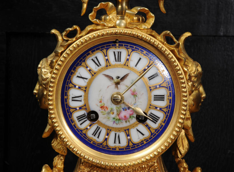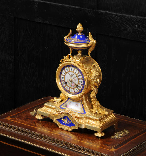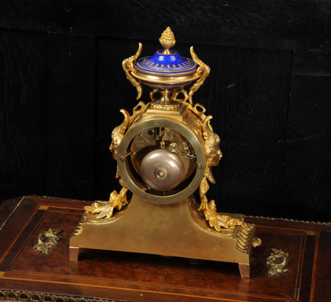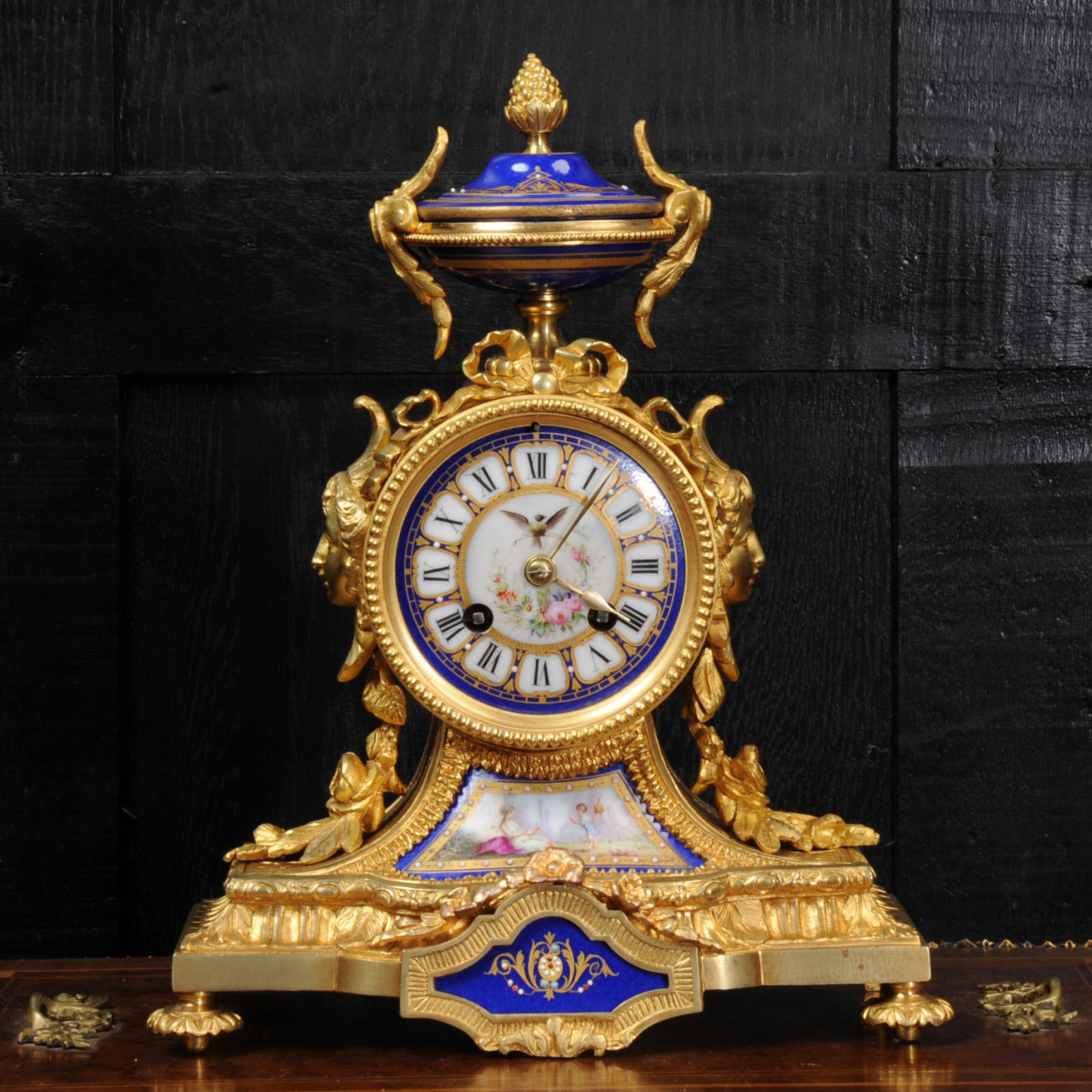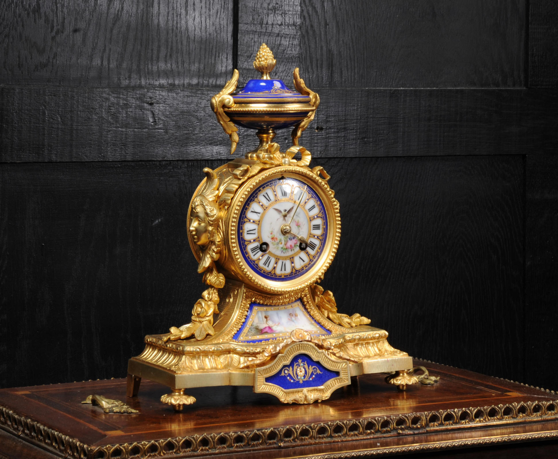 The dial itself is decorated with a bird and floral swags. It is lettered in white cartouches against the blue background enamel 'jewel' half-hour markers It is complete with original gilt brass hands. Above the dial is a porcelain urn with ormolu handles and a pineapple finial. To the sides are floral swags and goddess masks. Please note that this style of clock does not have a glazed bezel over the dial or a rear door. The French movement is by Japy Freres and has the makers mark on the backplate along with that of the retailer. It is of high quality and is in excellent clean and running condition having been fully overhauled by our clockmaker. Pendulum is an old replacement. The movement is fitted with the superior rack striking system. It runs for 8 days and strikes the hours and halves on a bell. Condition of the case is excellent, the original gilding is beautifully clean and bright with just some minor wear on the high spots and some slight disclouration. The dial is also in good condition, one 'jewel' is missing from near the 4 O'clock and some chipping around the winding holes. The over-glaze gilt decoration is very good. The porcelain is also very good, as with the dial most of the over-glaze gilt decoration is present and in good condition. This is a stunning clock in lovely original condition, ready to add to your collection.