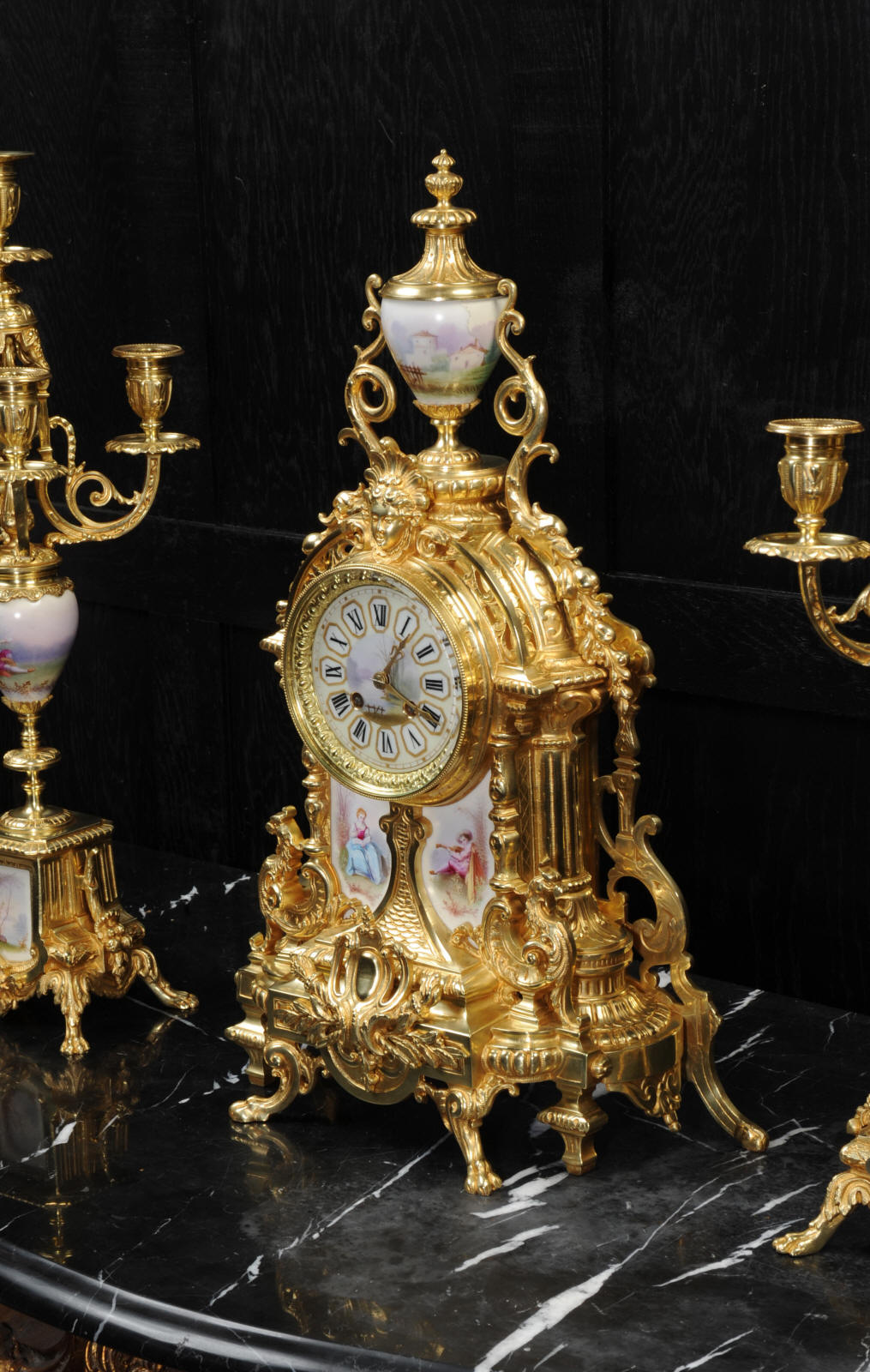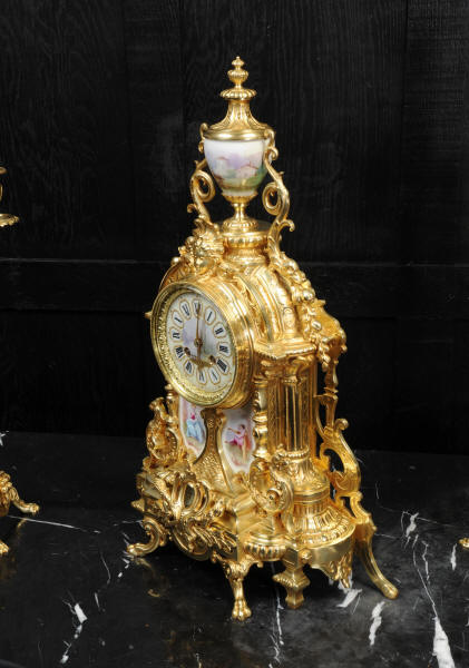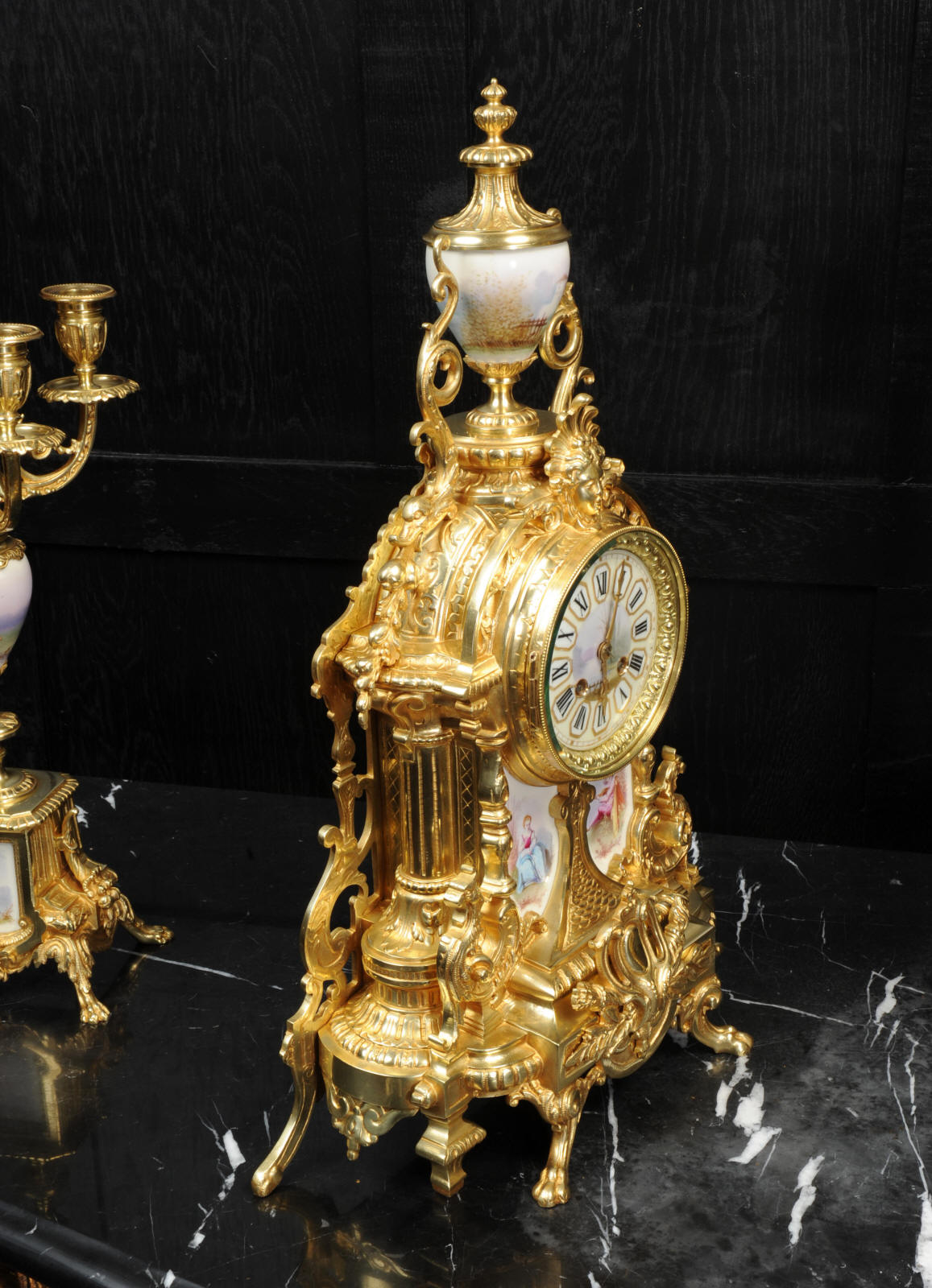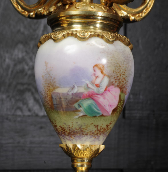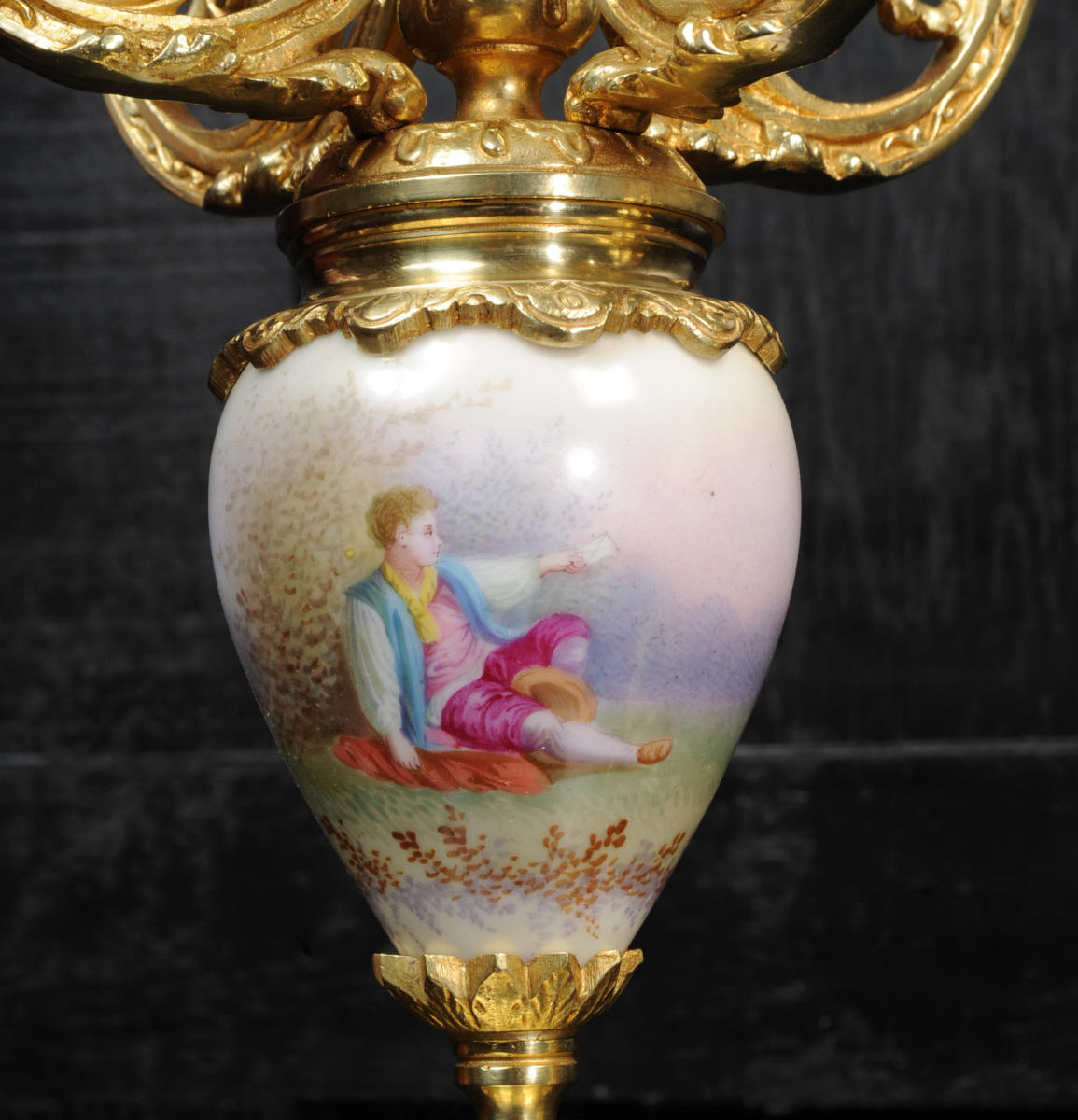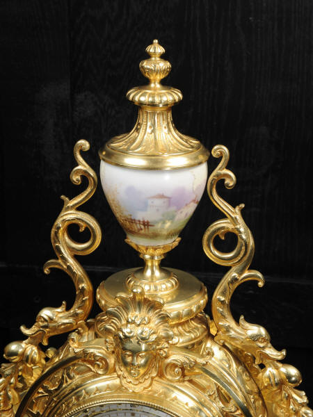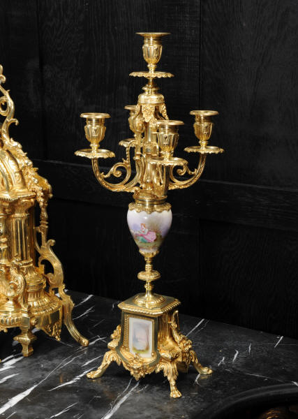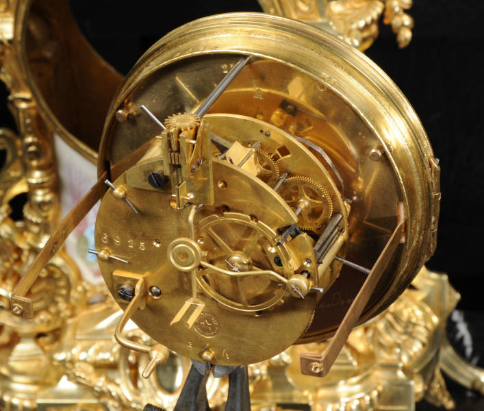 The French movement is by A. D. Mougin and is of high quality. It is in excellent clean and running condition having been fully overhauled by our clockmaker. Pendulum is a replacement. It runs for 8 days and strikes the hours and halves on a bell. Click the video clip below to hear the bell and watch the clock running! Condition of the case is excellent, the original gilding is beautifully clean and bright and in excellent condition. The porcelain is in excellent condition, there is an old area of restoration to the clock's urn but is otherwise in lovely condition. One sconce insert has a repair.