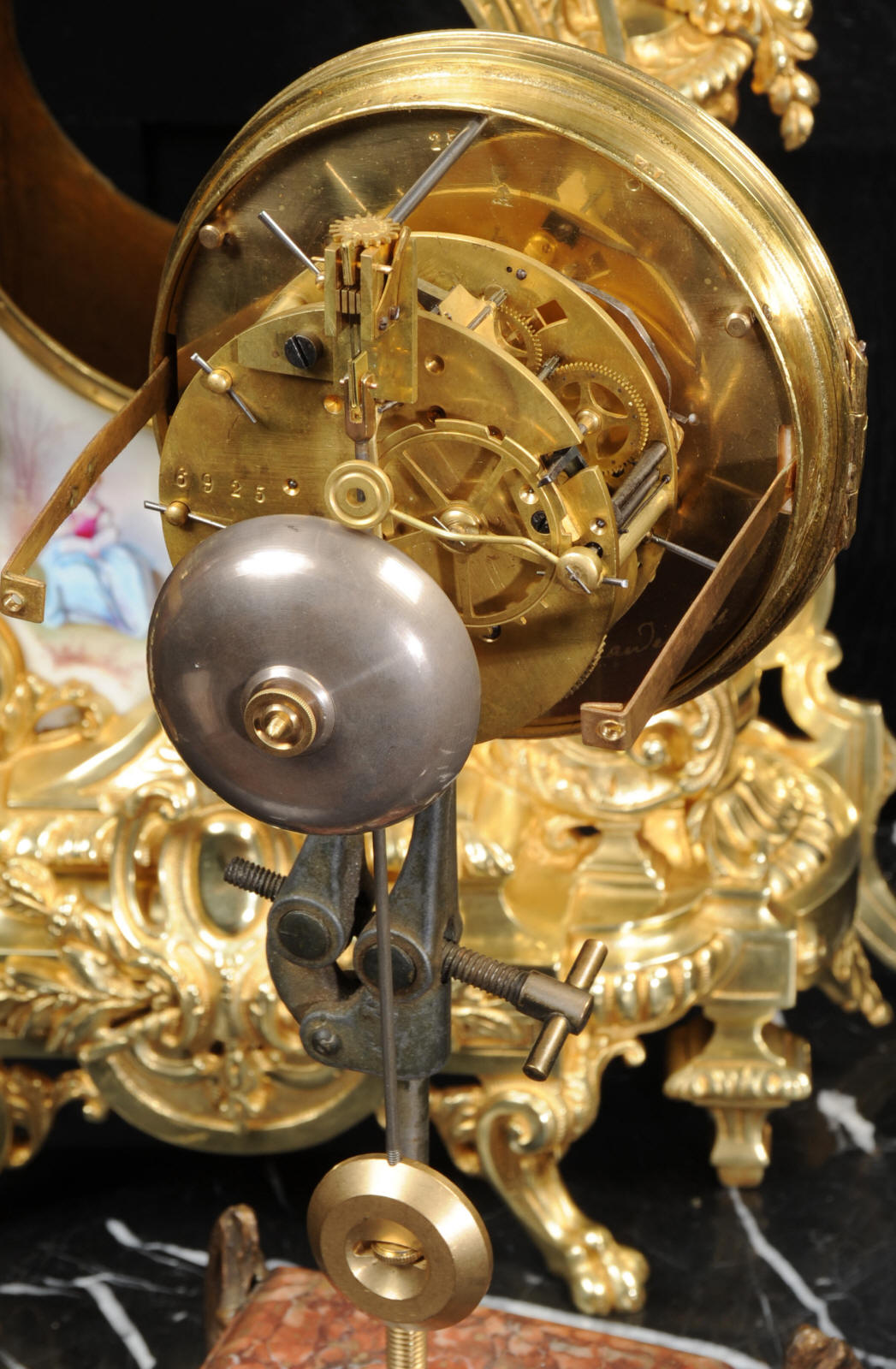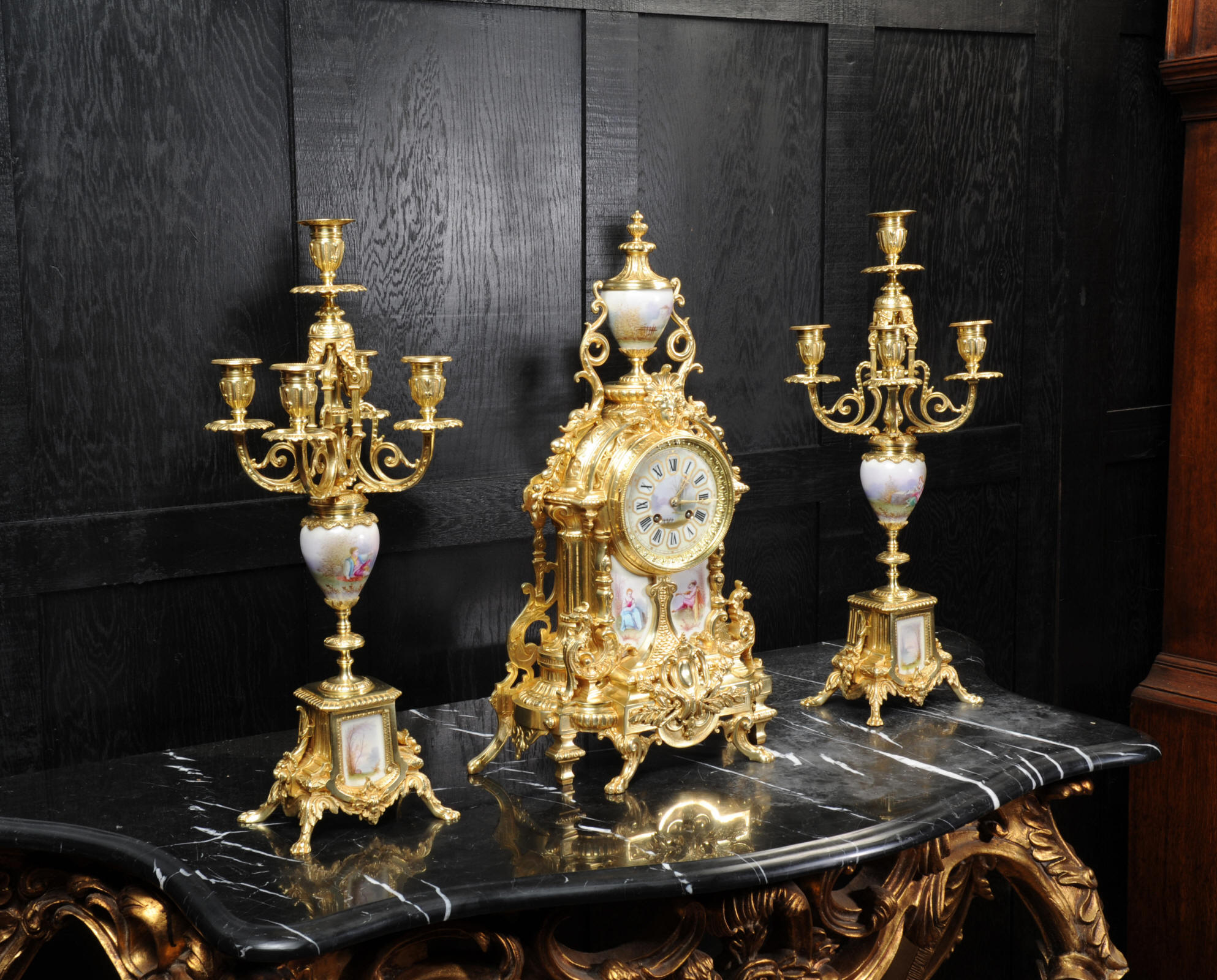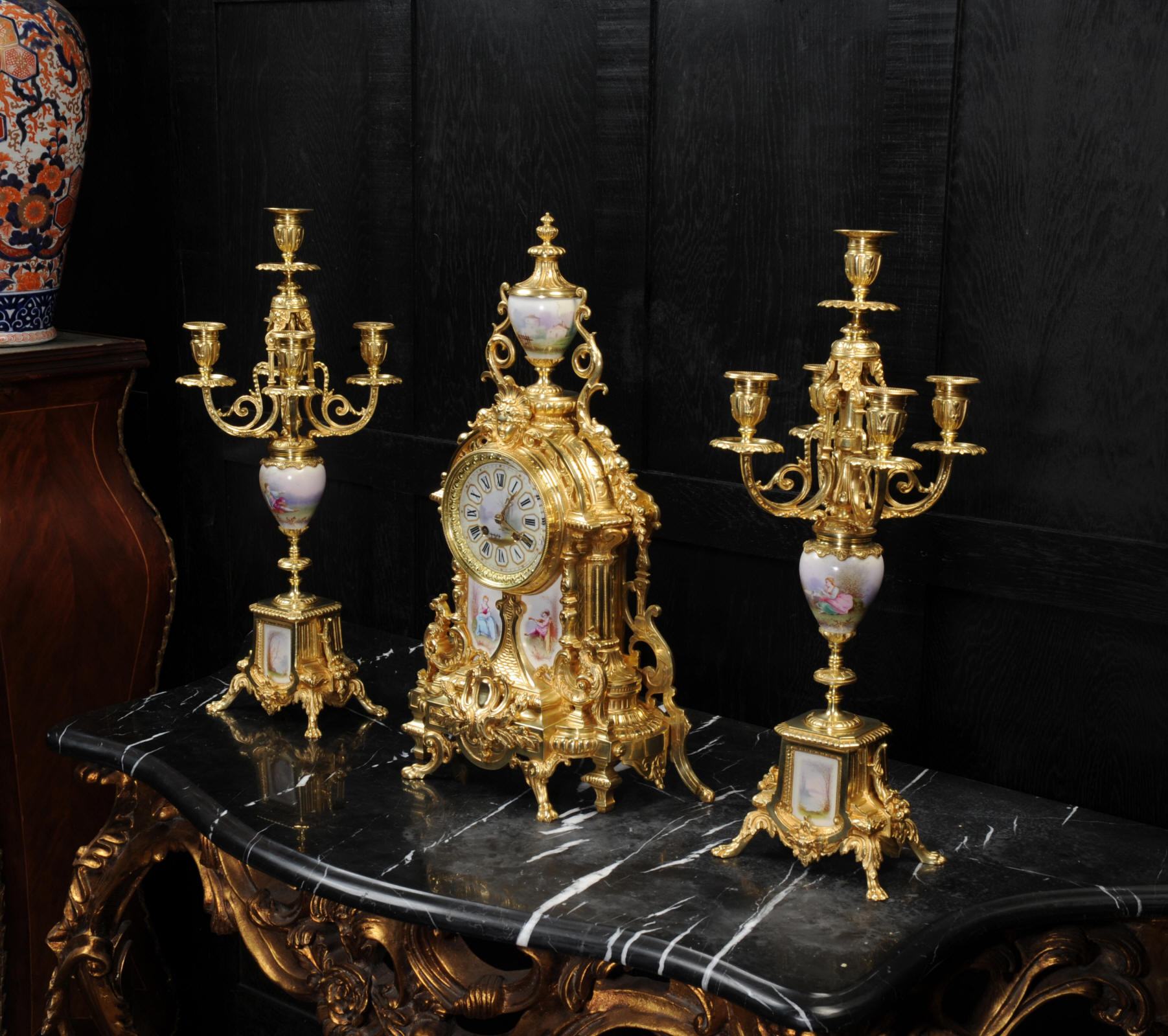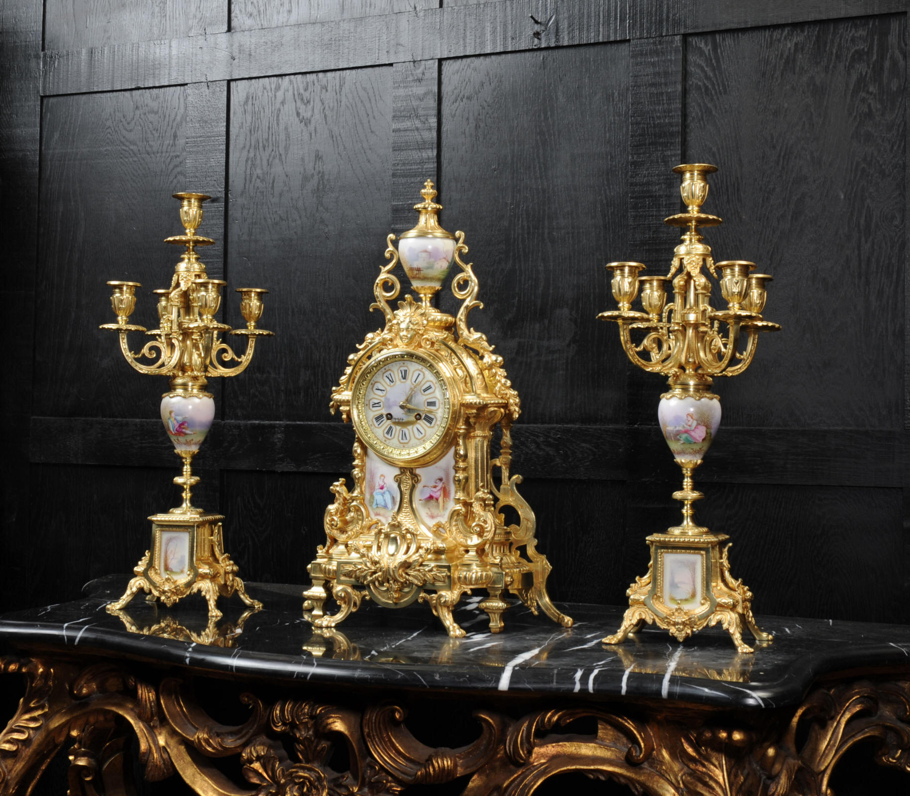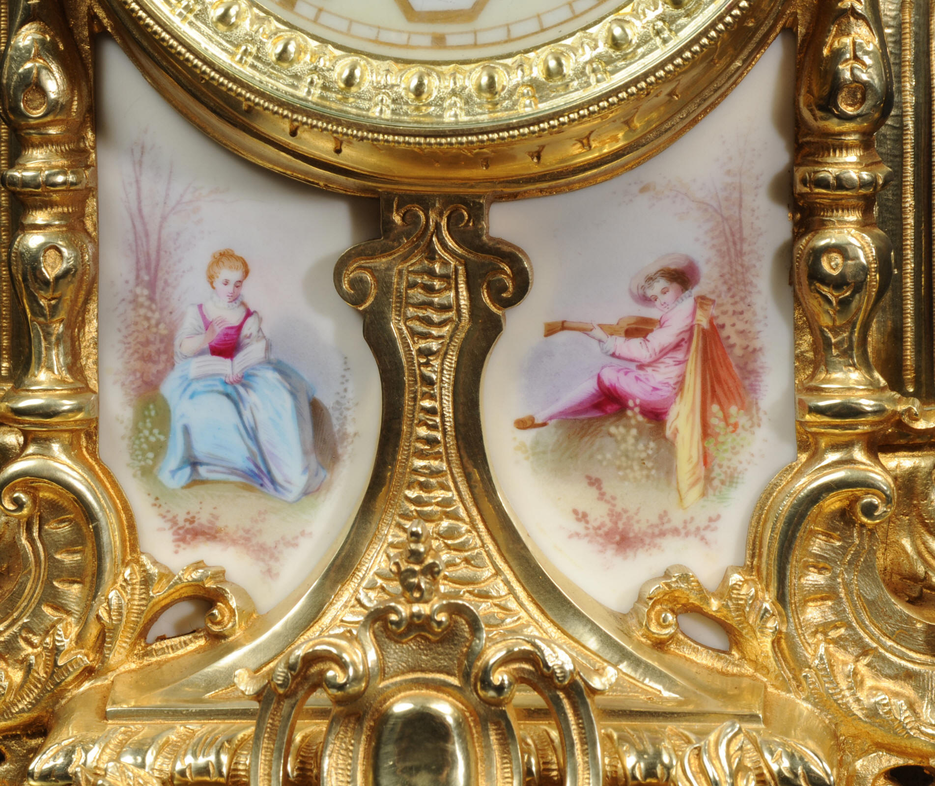 The French movement is by A. D. Mougin and is of high quality. It is in excellent clean and running condition having been fully overhauled by our clockmaker. Pendulum is a replacement. It runs for 8 days and strikes the hours and halves on a bell. Click the video clip below to hear the bell and watch the clock running! Condition of the case is excellent, the original gilding is beautifully clean and bright and in excellent condition. The porcelain is in excellent condition, there is an old area of restoration to the clock's urn but is otherwise in lovely condition. One sconce insert has a repair.
