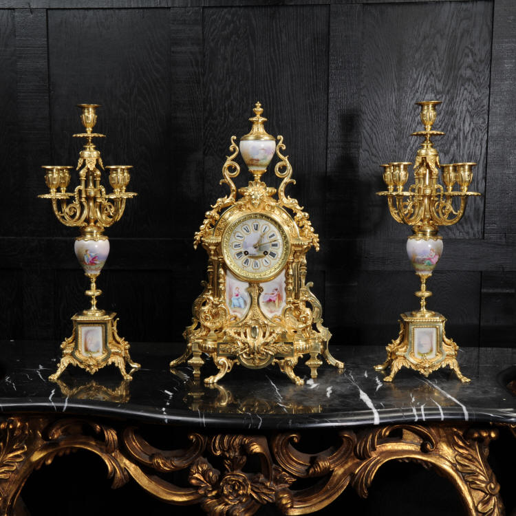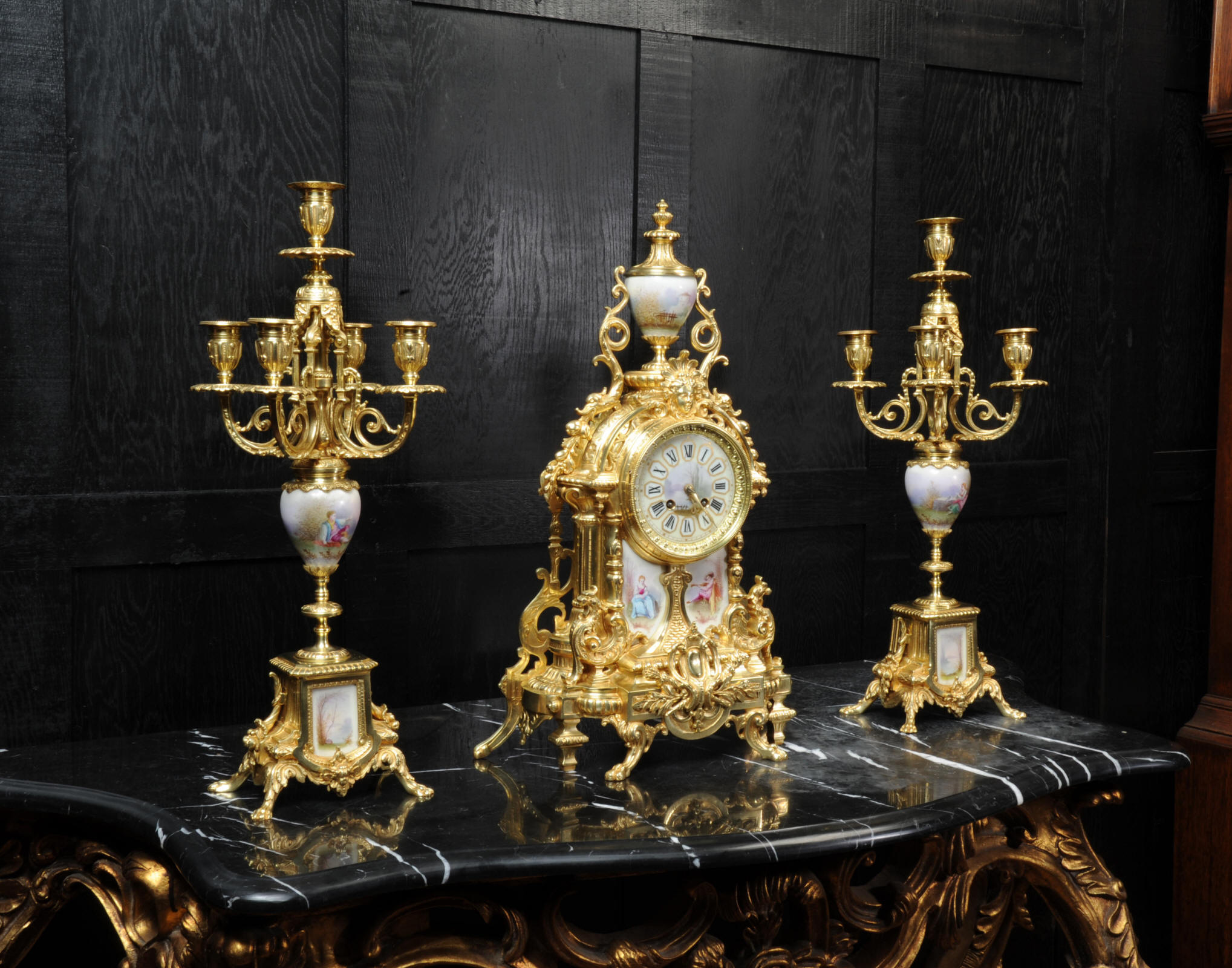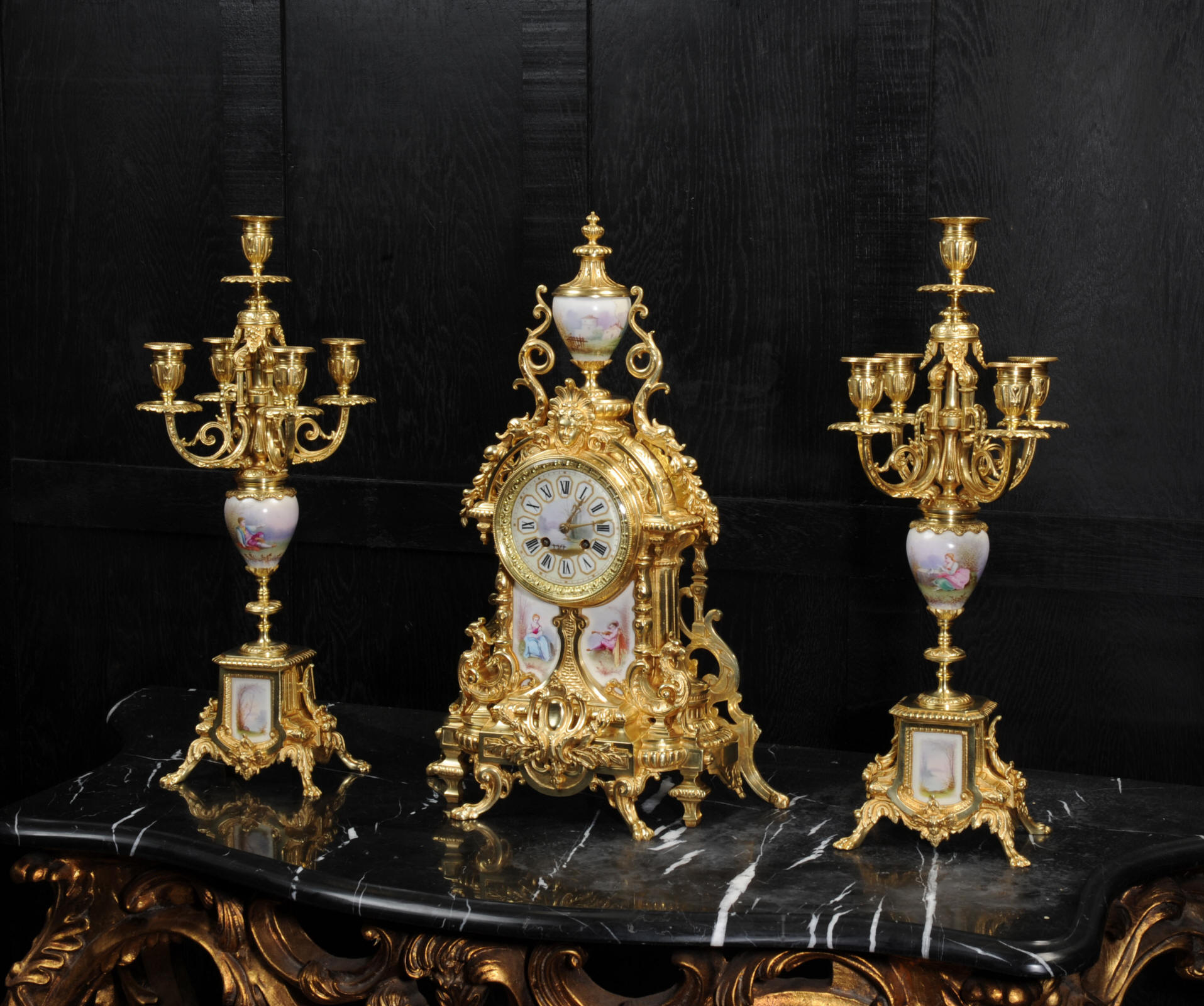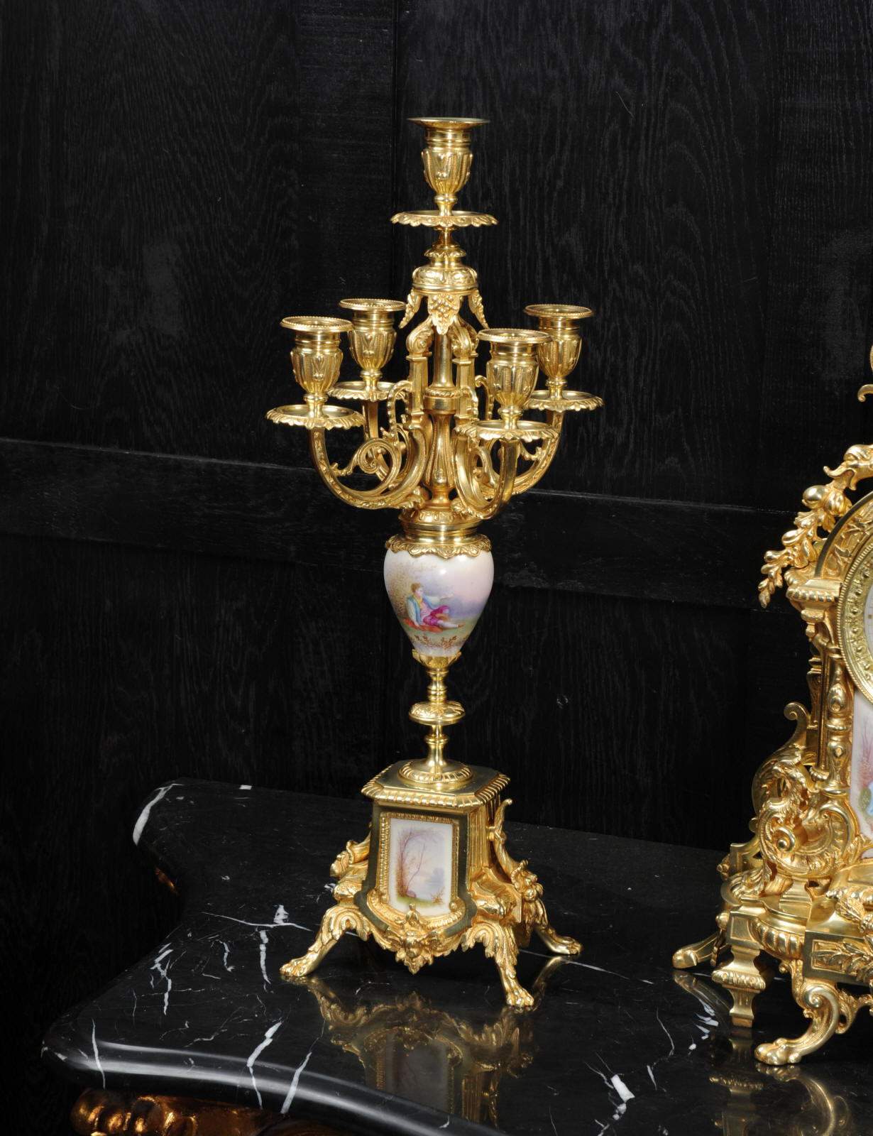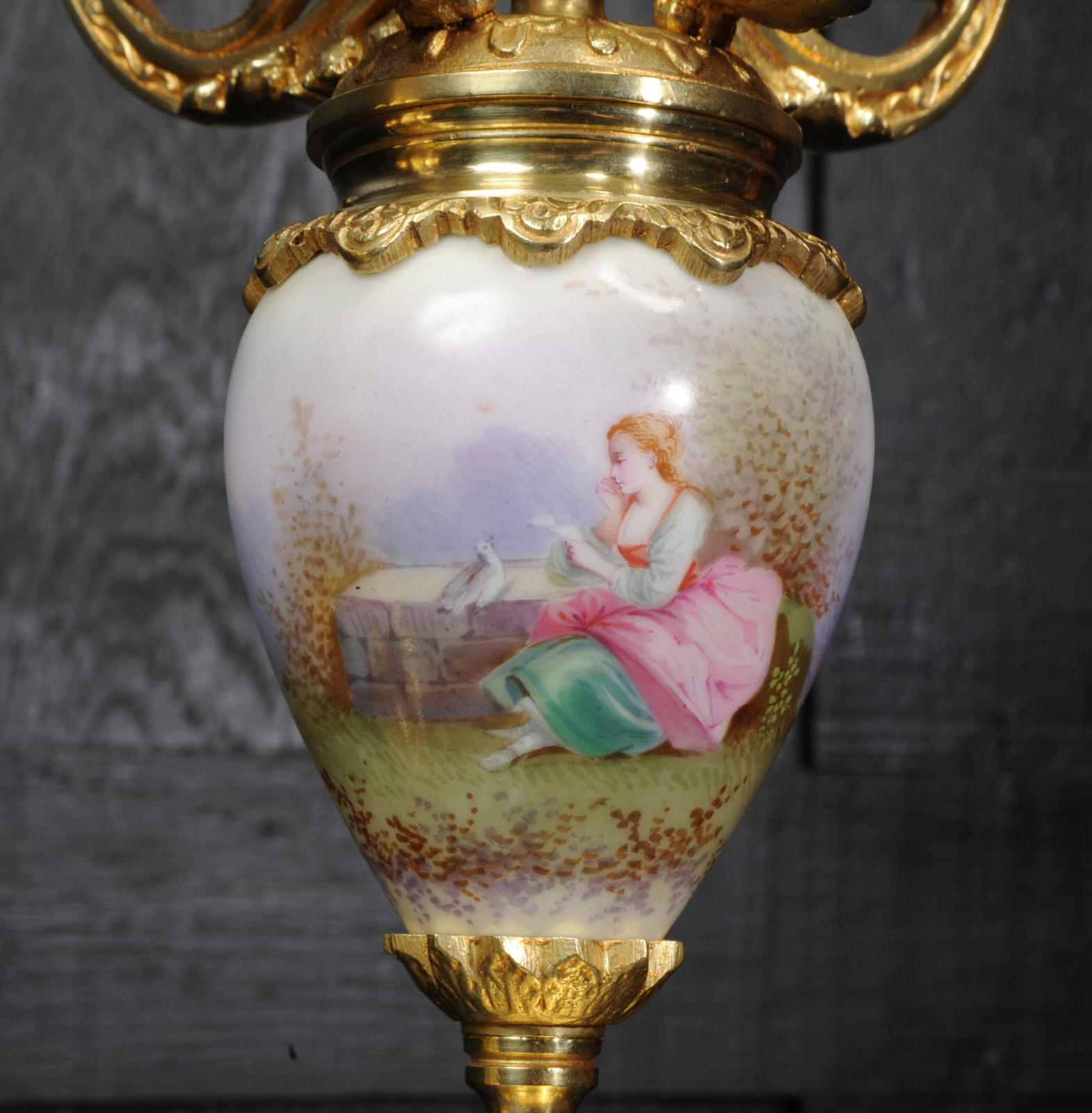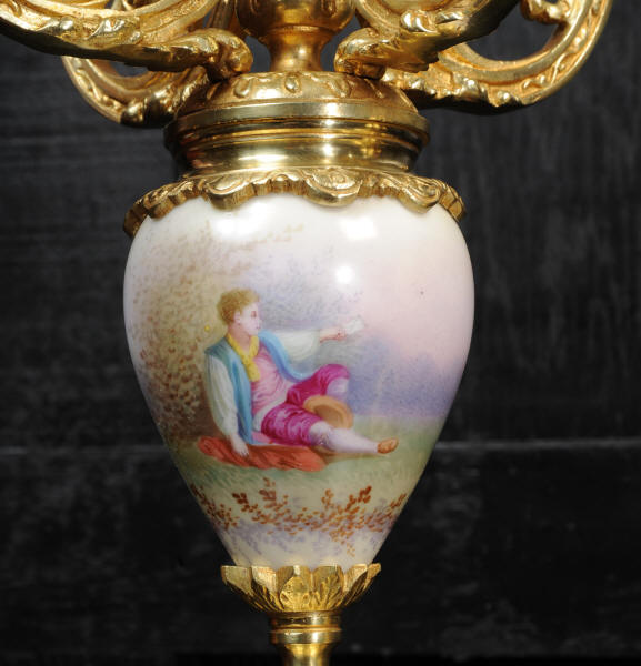 The French movement is by A. D. Mougin and is of high quality. It is in excellent clean and running condition having been fully overhauled by our clockmaker. Pendulum is a replacement. It runs for 8 days and strikes the hours and halves on a bell. Click the video clip below to hear the bell and watch the clock running! Condition of the case is excellent, the original gilding is beautifully clean and bright and in excellent condition. The porcelain is in excellent condition, there is an old area of restoration to the clock's urn but is otherwise in lovely condition. One sconce insert has a repair.