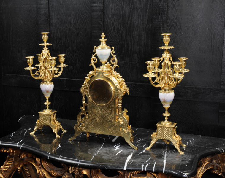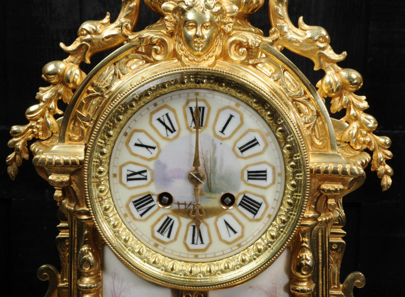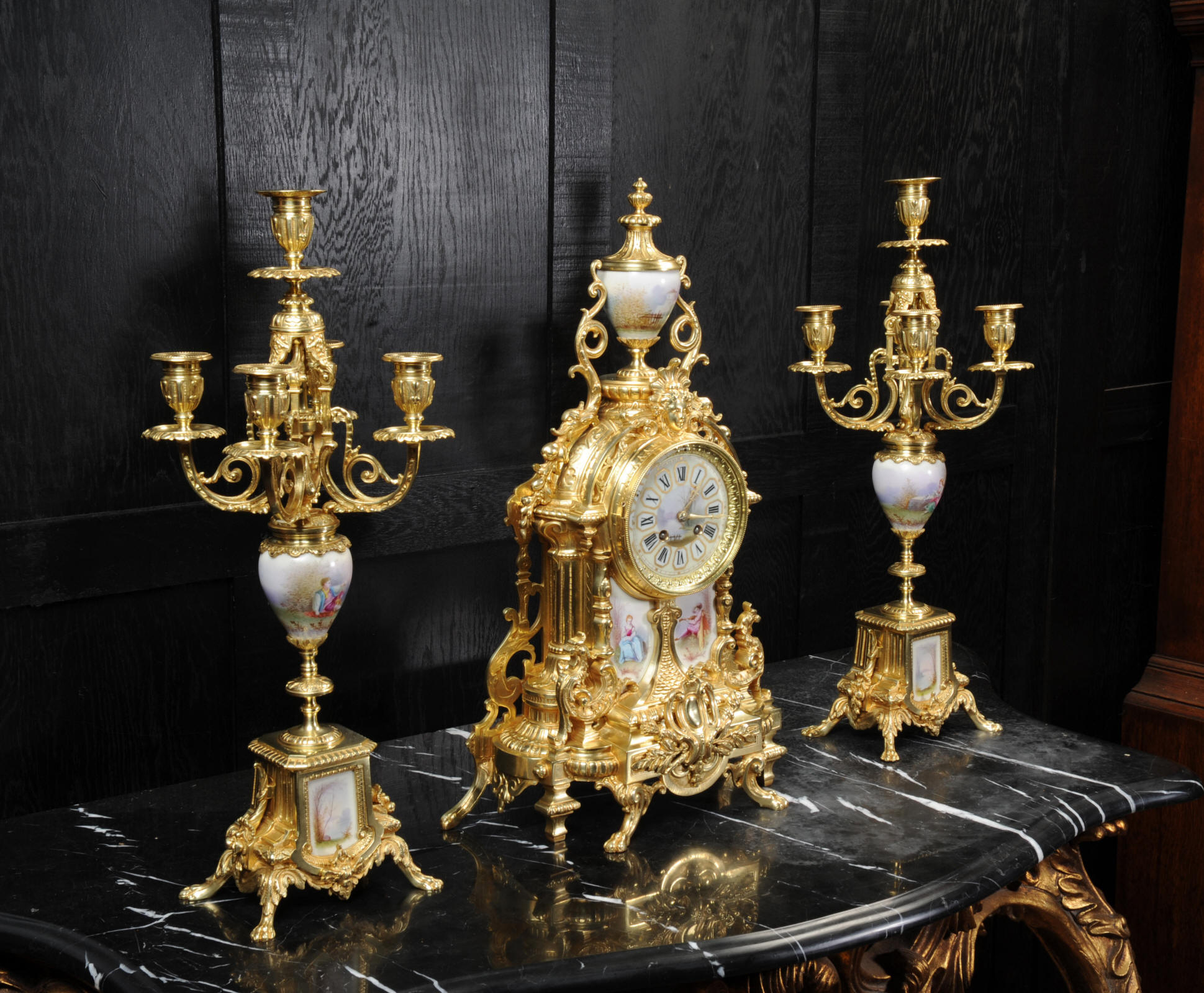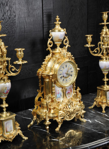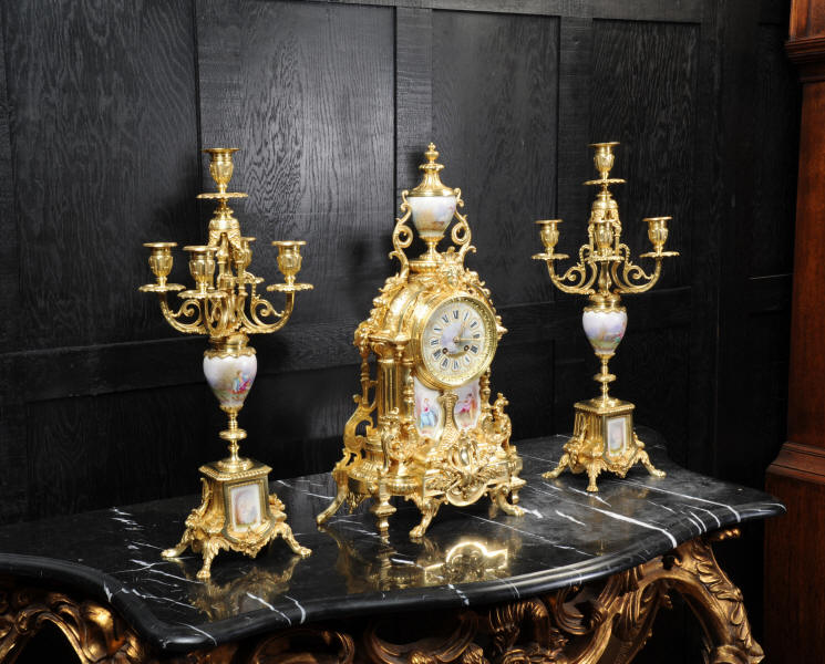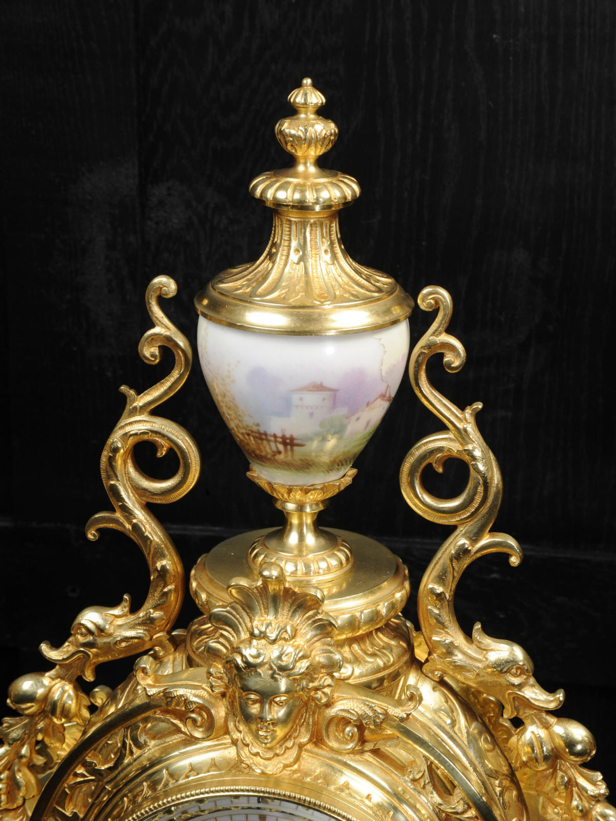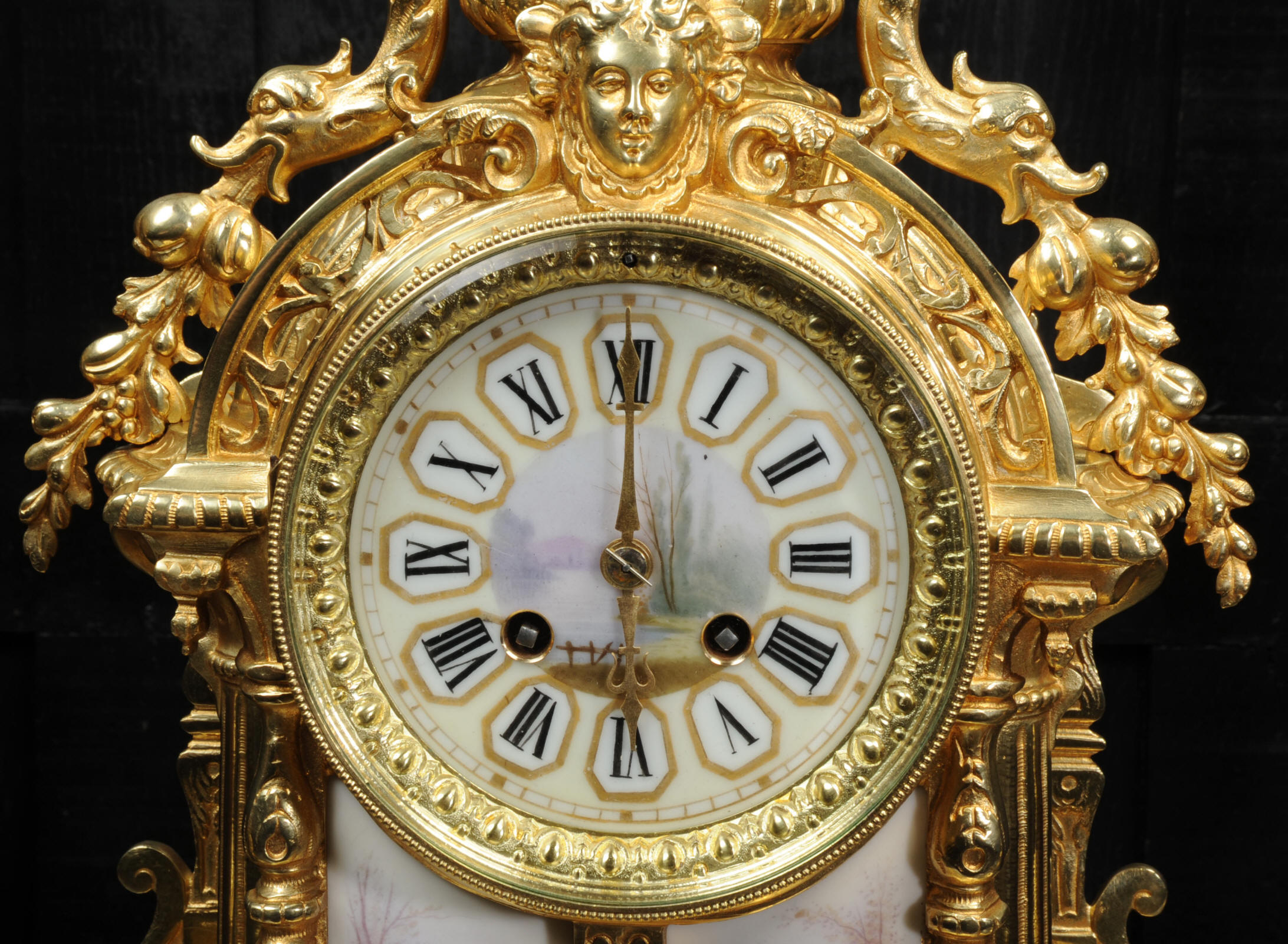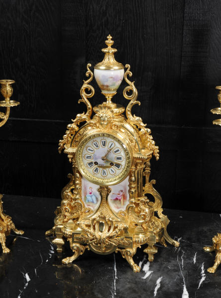 The French movement is by A. D. Mougin and is of high quality. It is in excellent clean and running condition having been fully overhauled by our clockmaker. Pendulum is a replacement. It runs for 8 days and strikes the hours and halves on a bell. Click the video clip below to hear the bell and watch the clock running! Condition of the case is excellent, the original gilding is beautifully clean and bright and in excellent condition. The porcelain is in excellent condition, there is an old area of restoration to the clock's urn but is otherwise in lovely condition. One sconce insert has a repair.