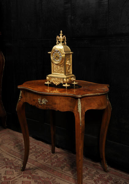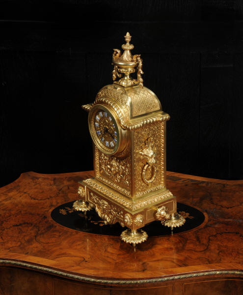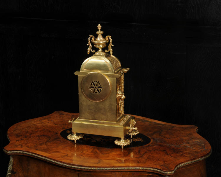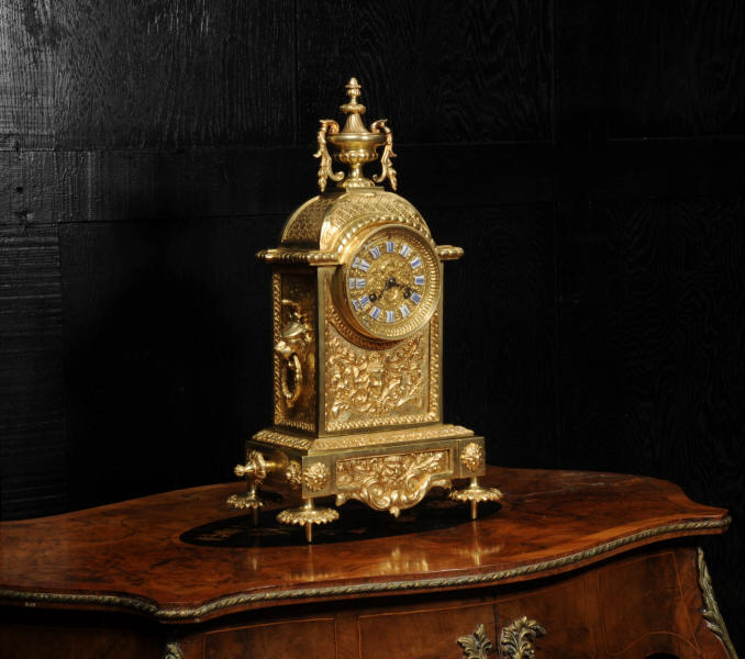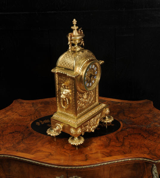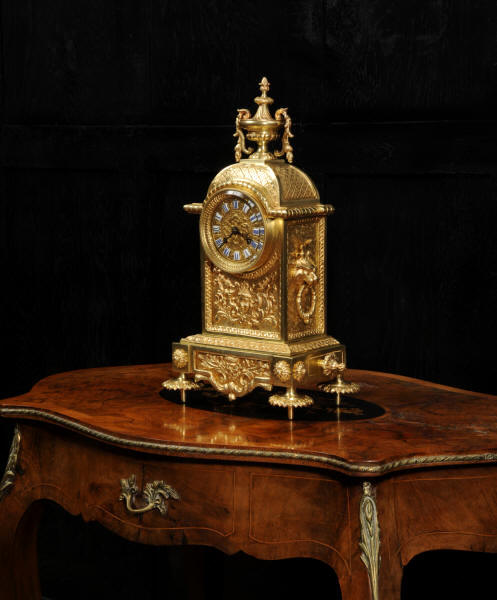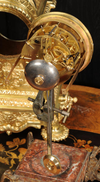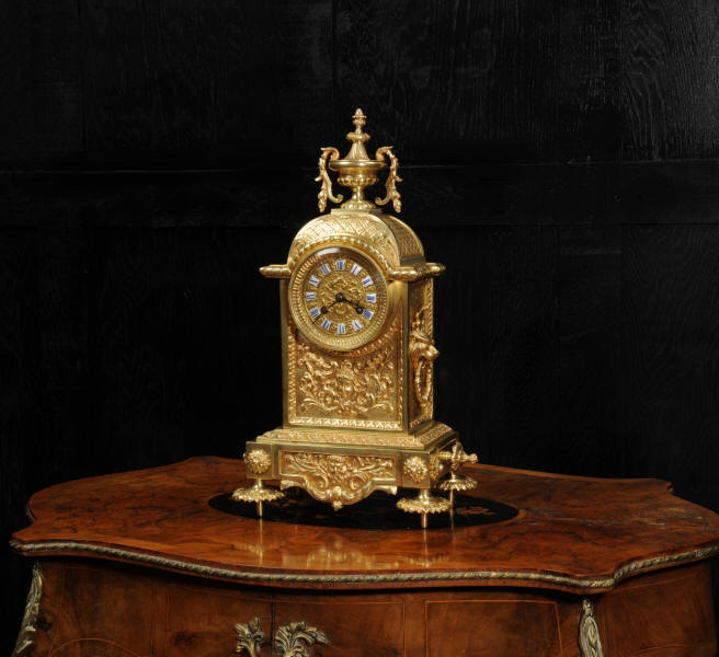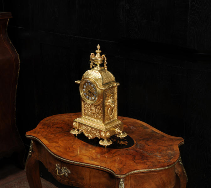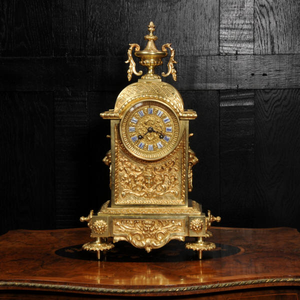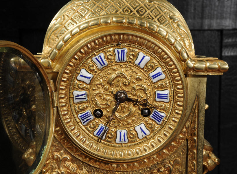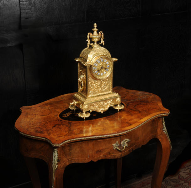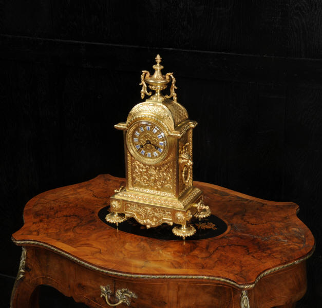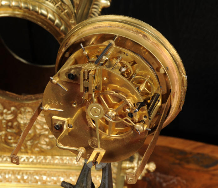 The dial is also gilt brass with 12 individual enamel cartouches and blued steel hands. The French movement is of high quality and is by Samuel Marti. It is in excellent clean and running condition having been fully overhauled by our clockmaker. Pendulum is a replacement. It runs for 8 days and strikes the hours and halves on a bell. Click the video below to hear the bell and watch the clock running. Condition of the case is excellent, the original gilding is beautifully clean and bright with hardly any wear or discolouration. The dial is also in excellent condition with no damage. The original glass has a couple of minor chips to the edge.