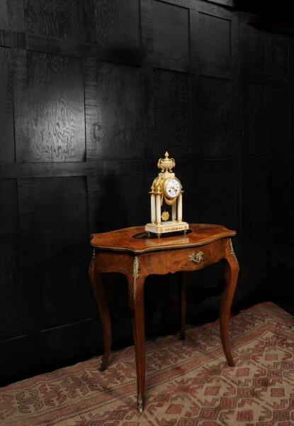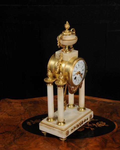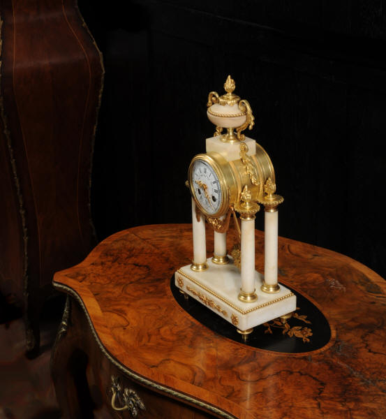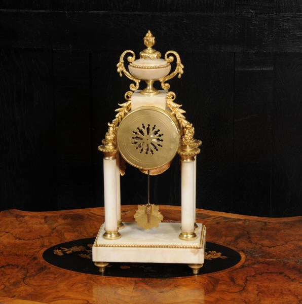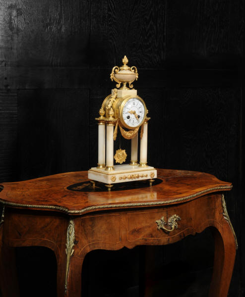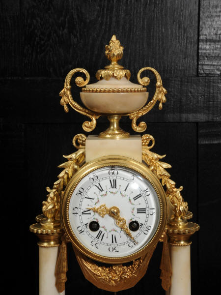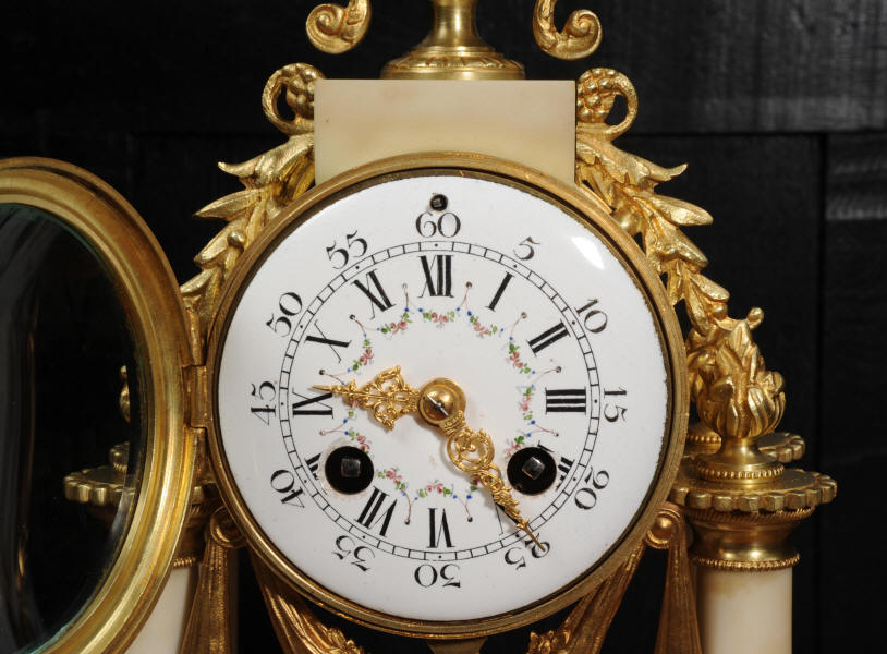 The dial is prettily painted with floral swags between the numbers on porcelain enamel. It is complete with it's original finely fretted gilt brass hands and convex glass. The French movement is by Japy Frères and is of high quality. It is in excellent clean and running condition having been fully overhauled by our clockmaker. Pendulum is original with ormolu sunburst. It runs for 8 days and strikes the hours and halves on a bell. Click the video below to hear the bell and watch the clock running!