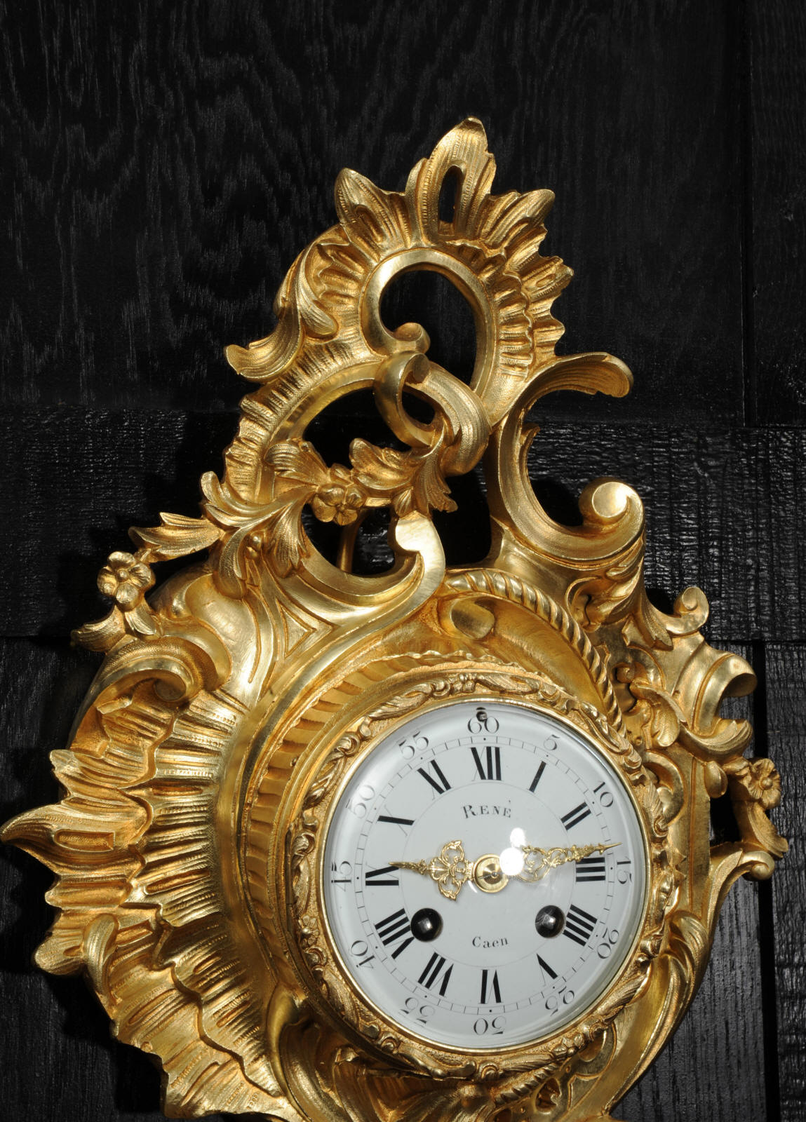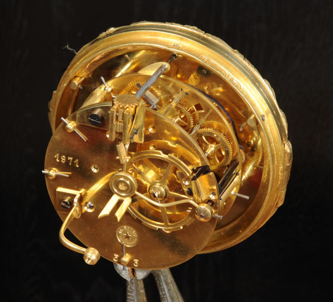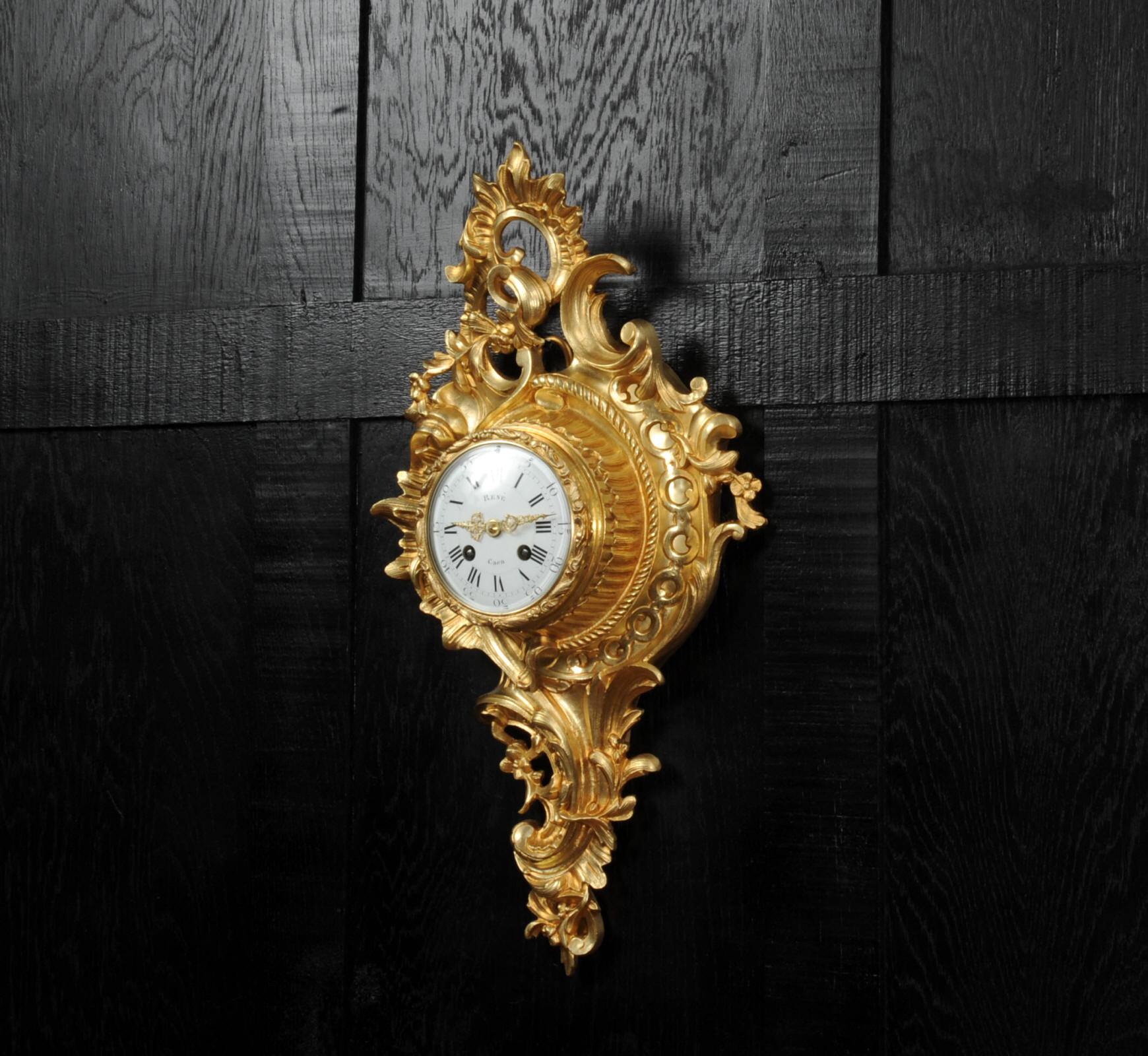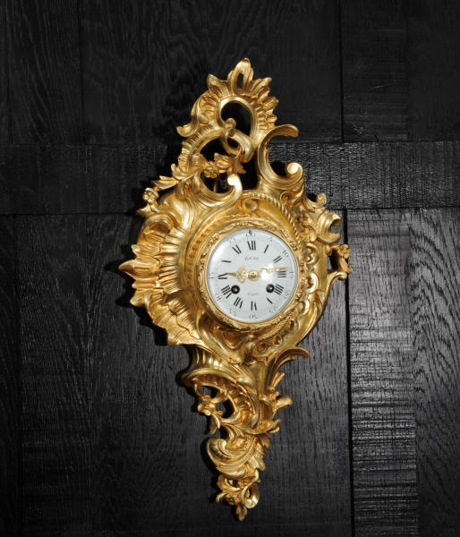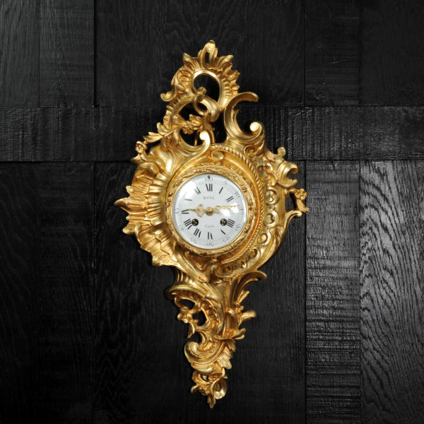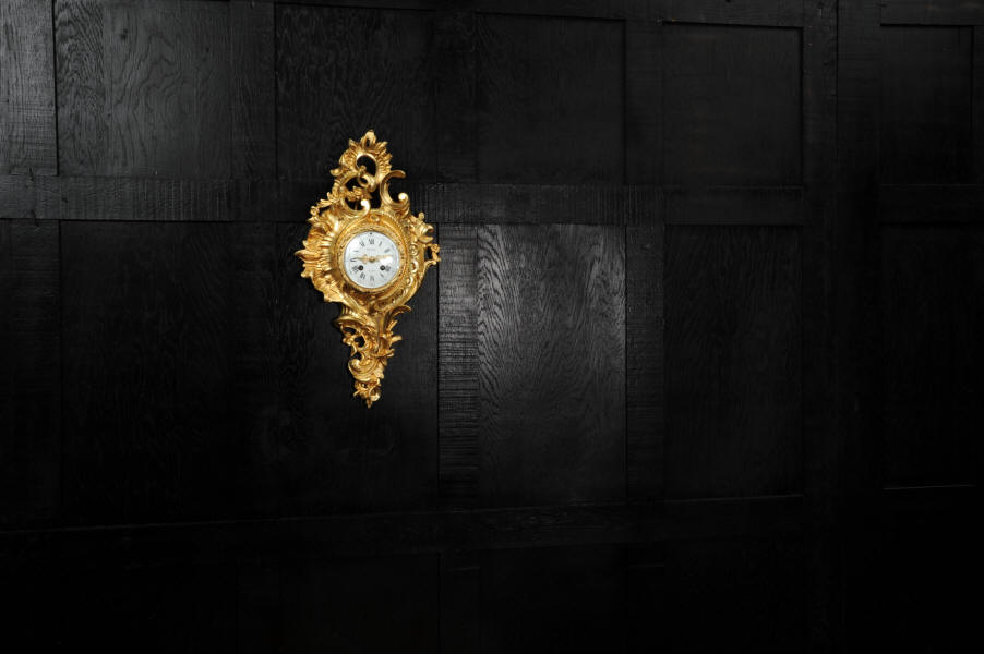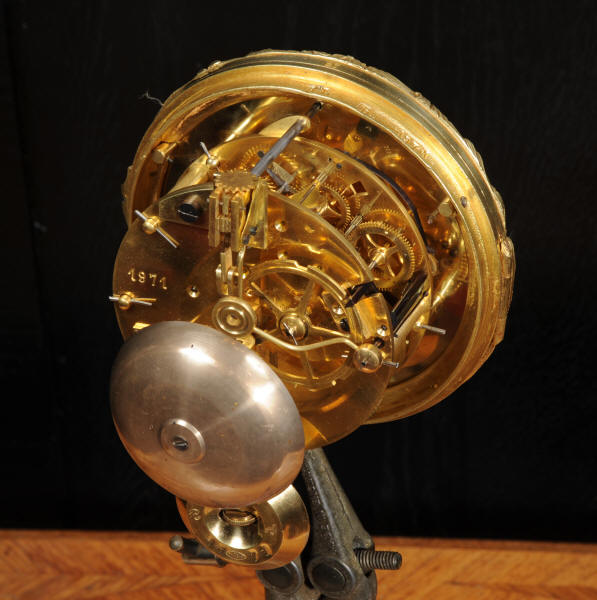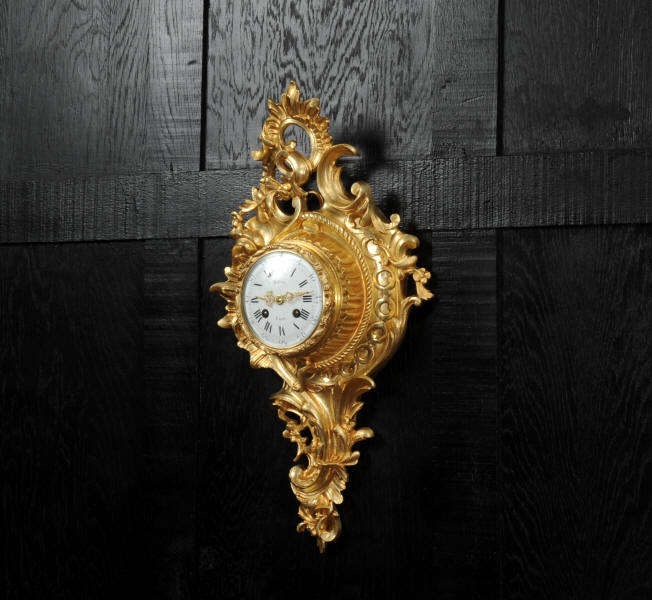 The dial porcelain enamel on copper with separate minute ring, original finely fretted gilt hands and convex glass. The French movement is of high quality and is by A. D. Mougin. It is in excellent clean and running condition having been fully overhauled by our clockmaker. Pendulum is original. It runs for 8 days and strikes the hours and halves on a bell. Click the video below to hear the bell and watch the clock running. Condition of the case is excellent, the original gilding is beautifully clean and bright with hardly any wear or discolouration. The dial is also excellent with just some tiny nibbles around the winding holes.