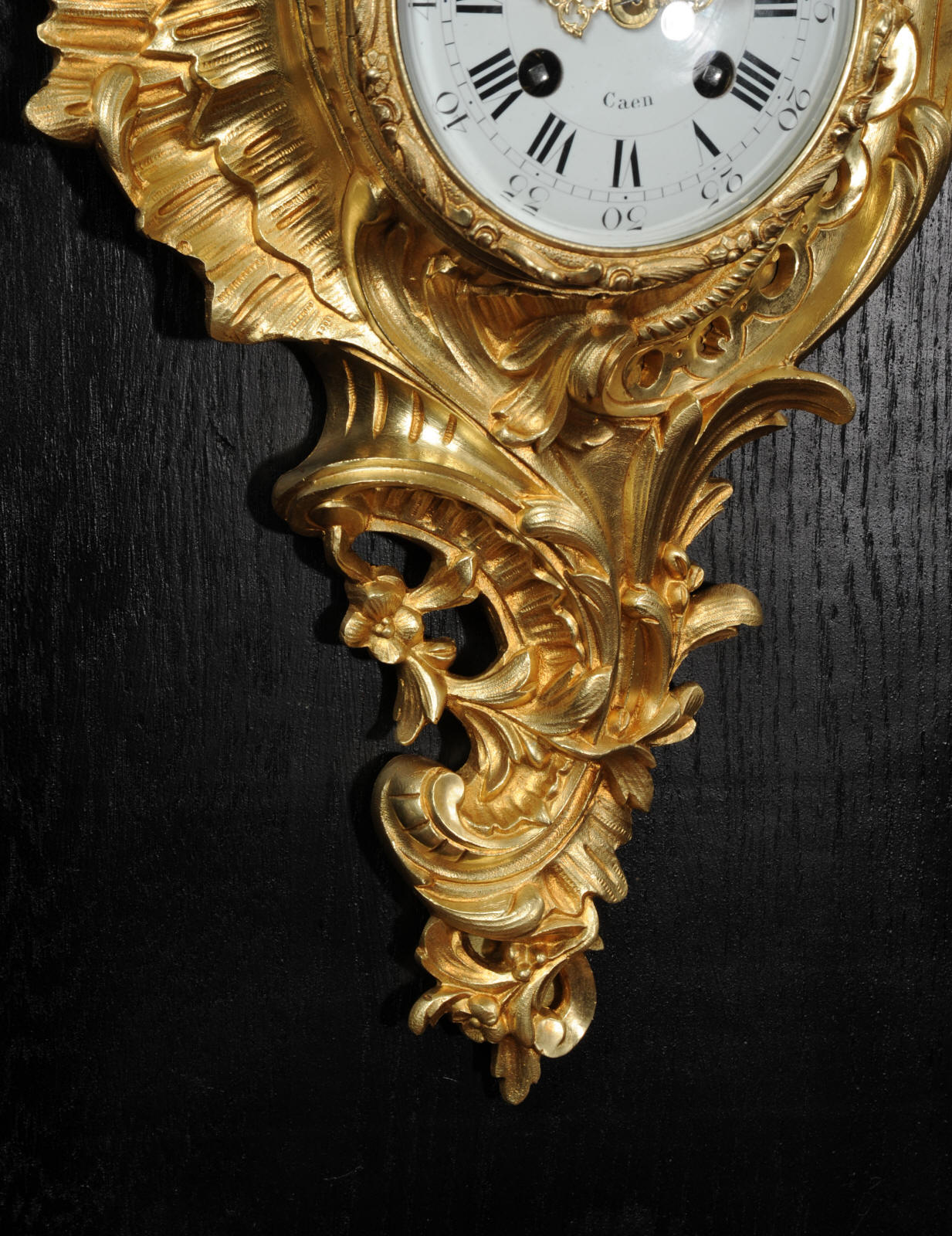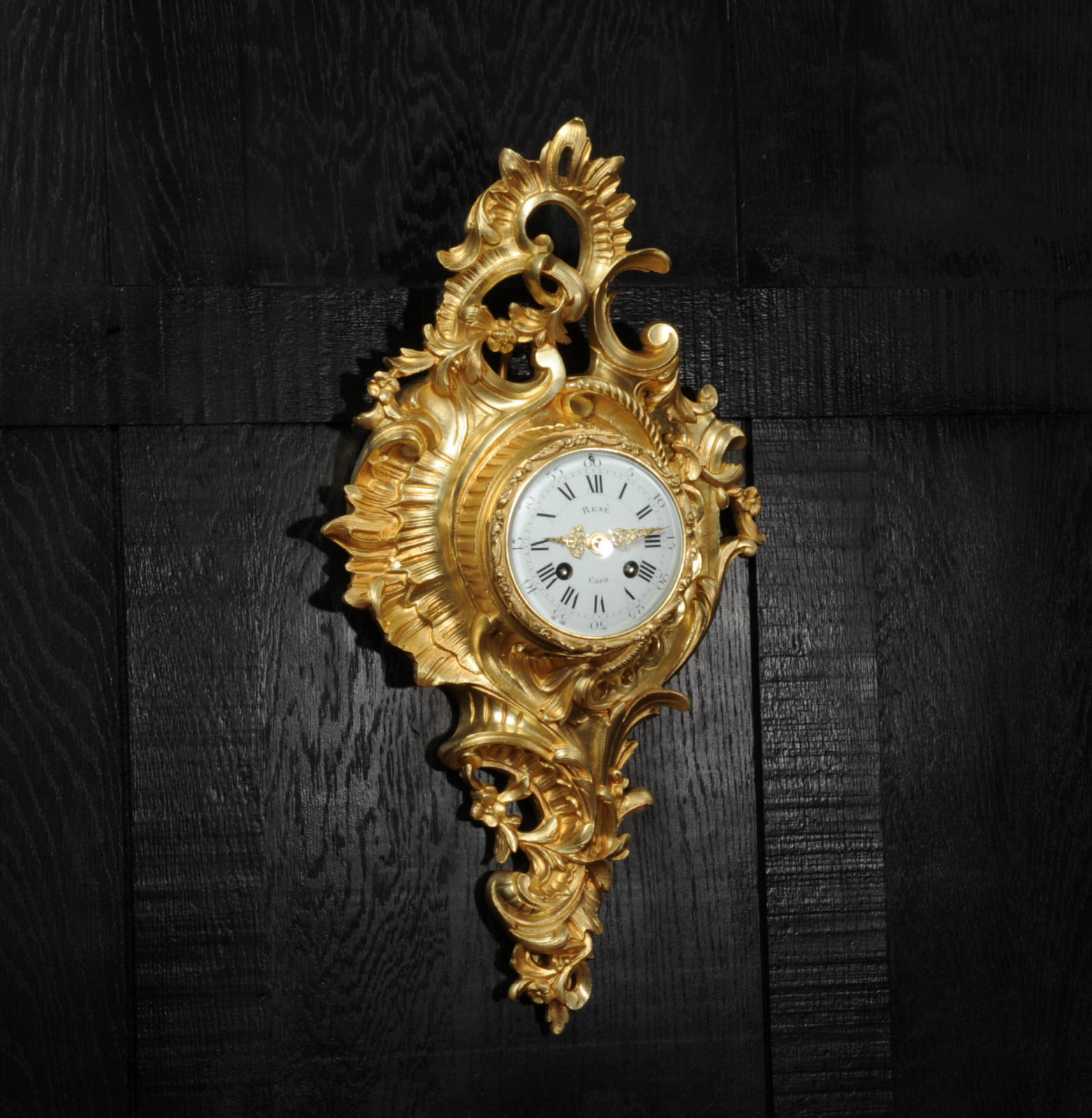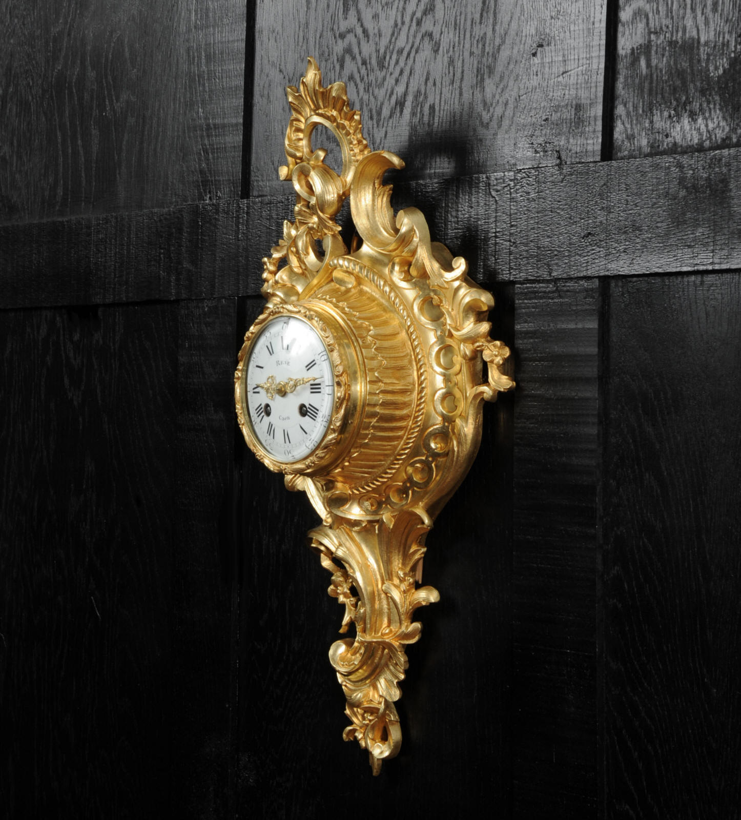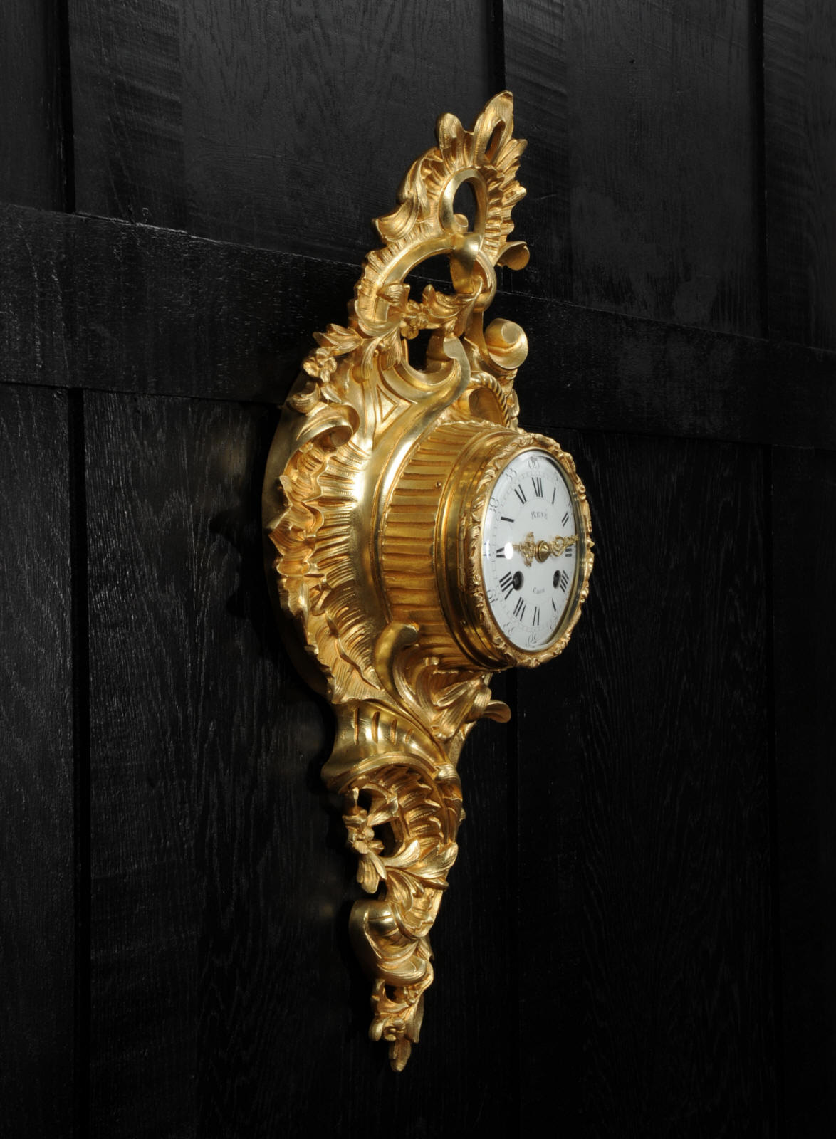 The dial porcelain enamel on copper with separate minute ring, original finely fretted gilt hands and convex glass. The French movement is of high quality and is by A. D. Mougin. It is in excellent clean and running condition having been fully overhauled by our clockmaker. Pendulum is original. It runs for 8 days and strikes the hours and halves on a bell. Click the video below to hear the bell and watch the clock running. Condition of the case is excellent, the original gilding is beautifully clean and bright with hardly any wear or discolouration. The dial is also excellent with just some tiny nibbles around the winding holes.