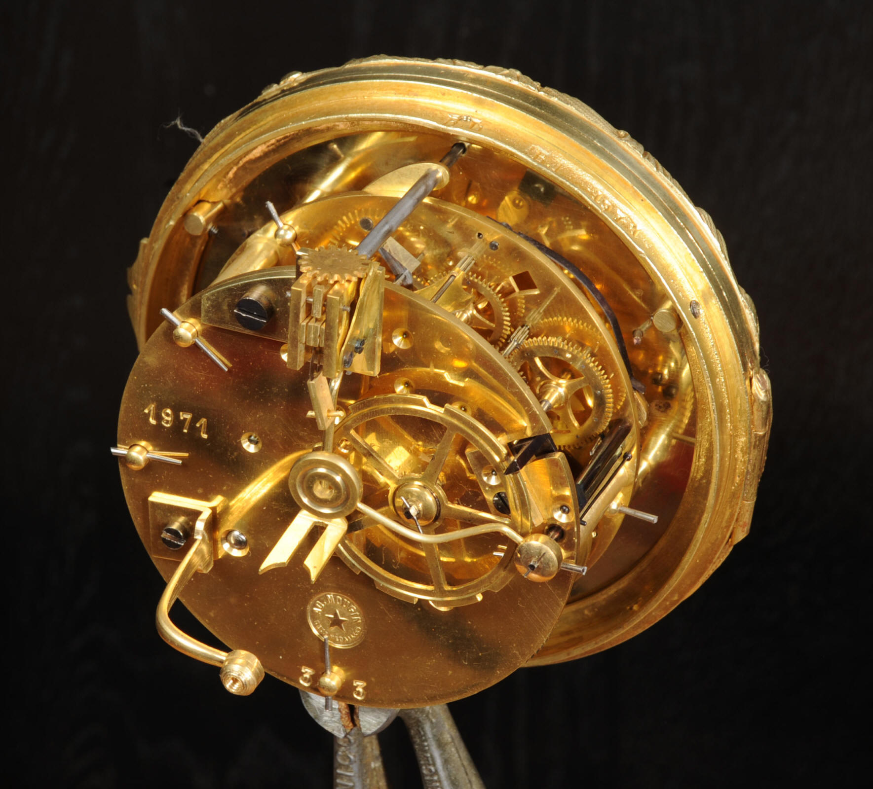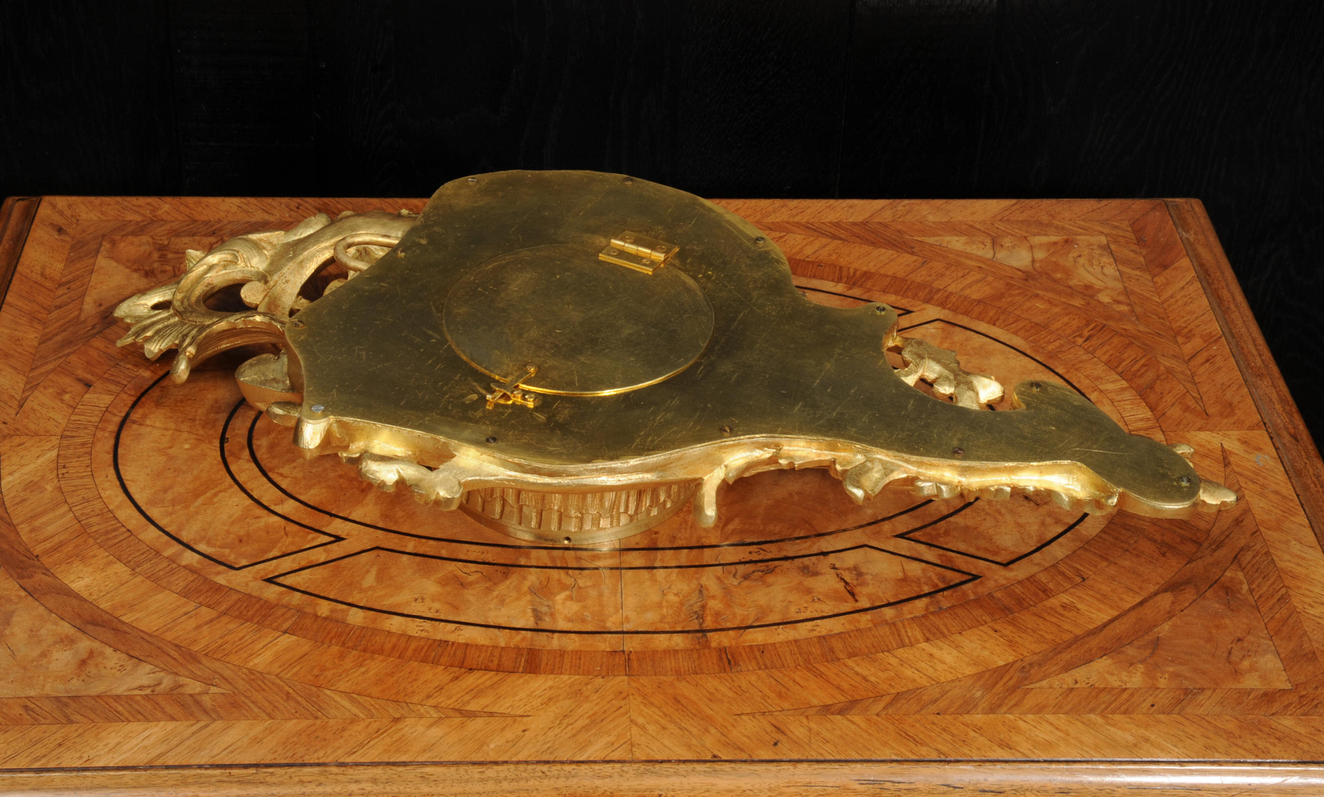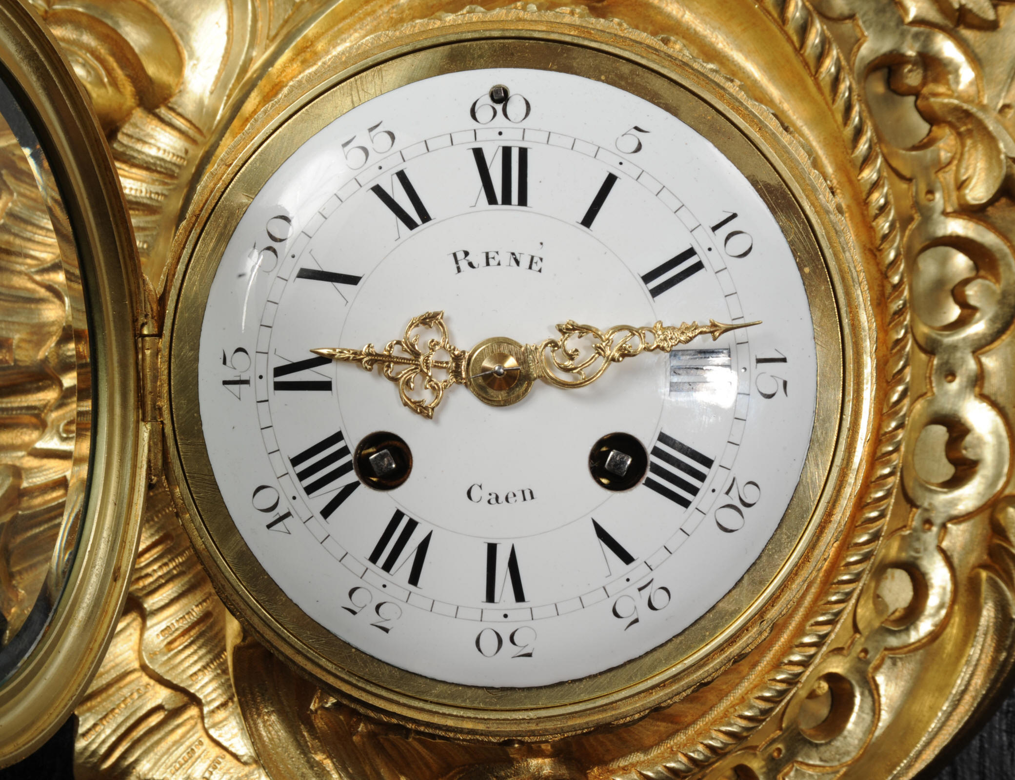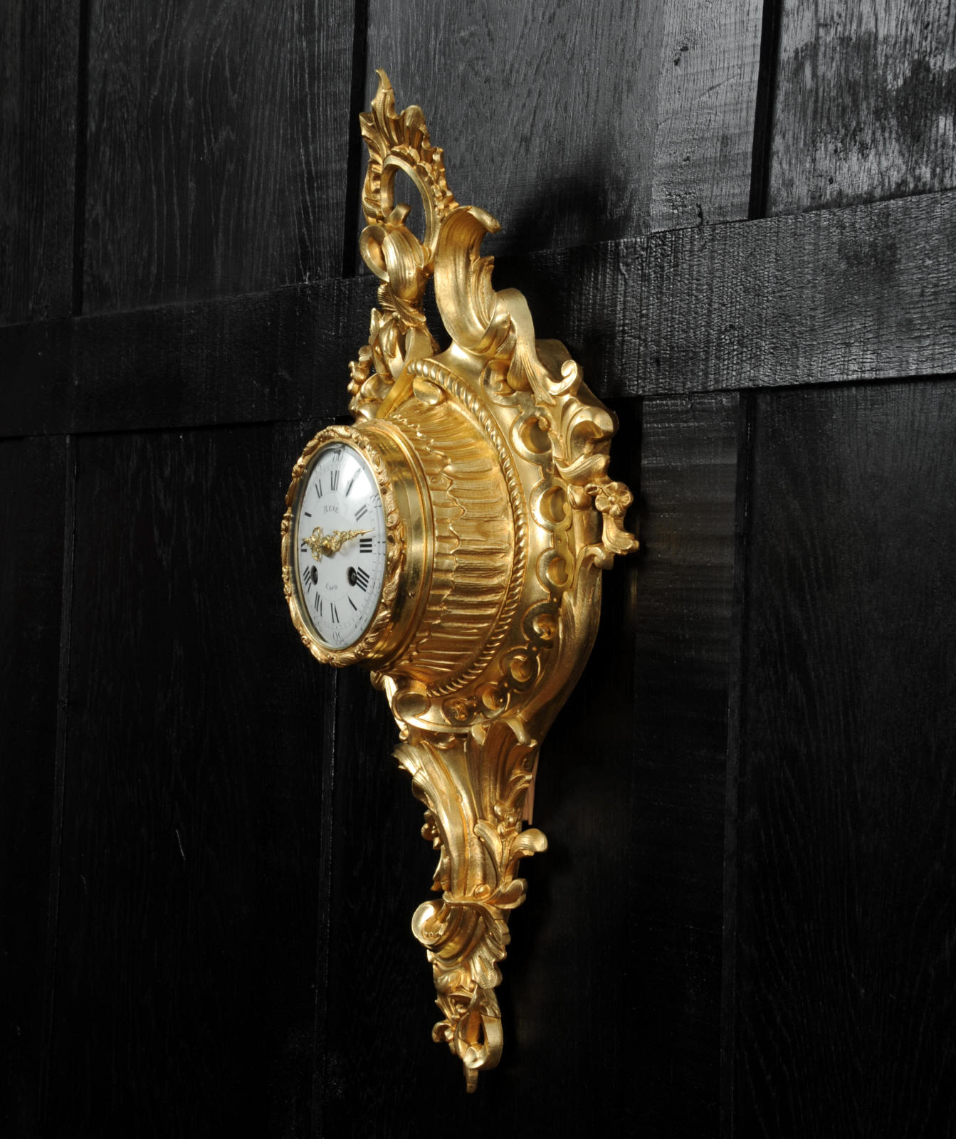 The dial porcelain enamel on copper with separate minute ring, original finely fretted gilt hands and convex glass. The French movement is of high quality and is by A. D. Mougin. It is in excellent clean and running condition having been fully overhauled by our clockmaker. Pendulum is original. It runs for 8 days and strikes the hours and halves on a bell. Click the video below to hear the bell and watch the clock running. Condition of the case is excellent, the original gilding is beautifully clean and bright with hardly any wear or discolouration. The dial is also excellent with just some tiny nibbles around the winding holes.