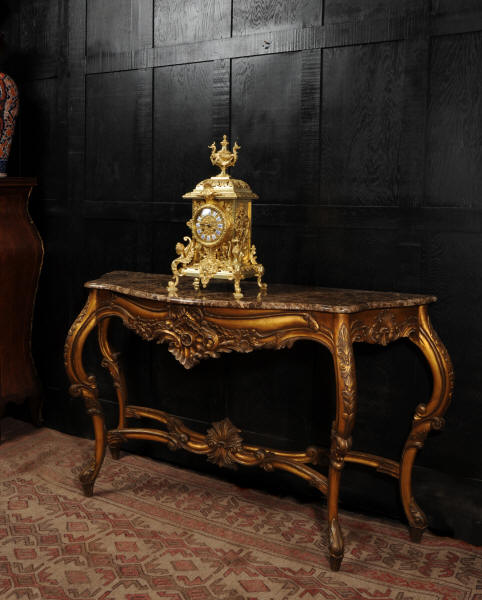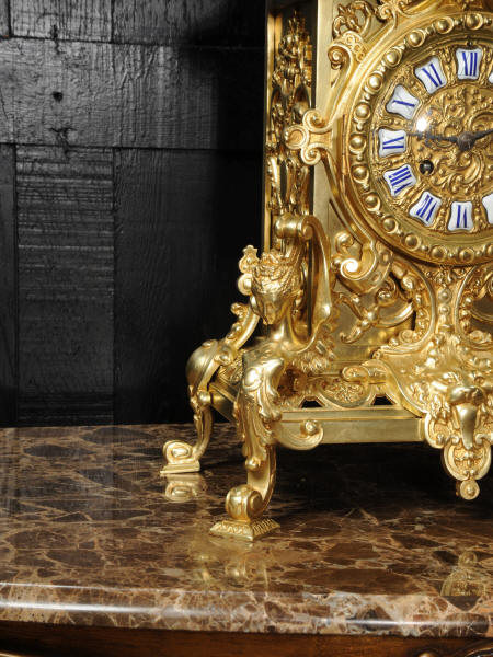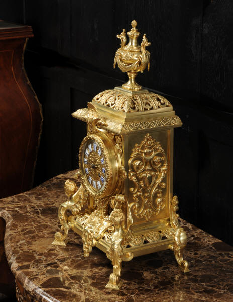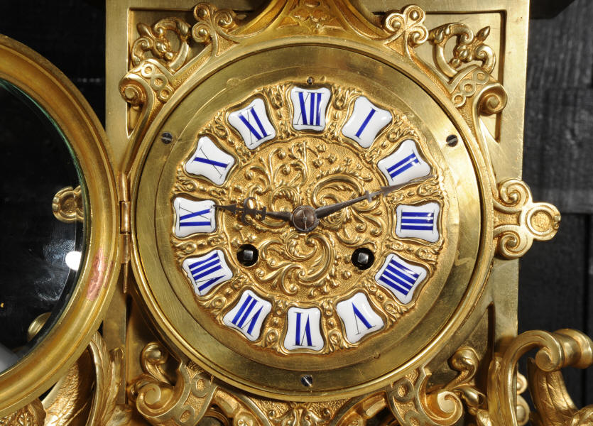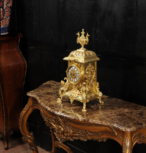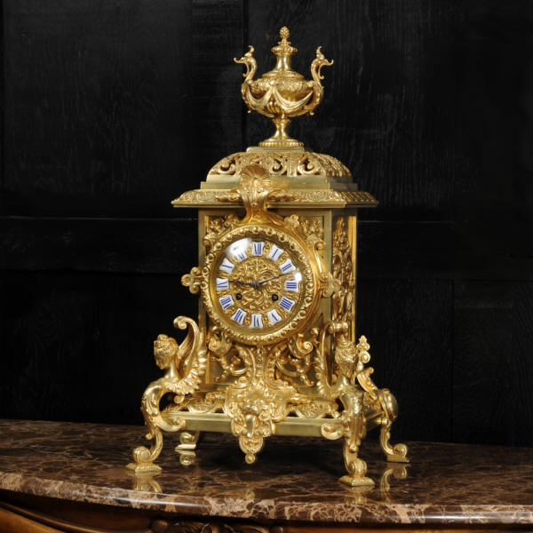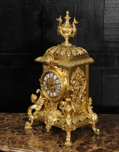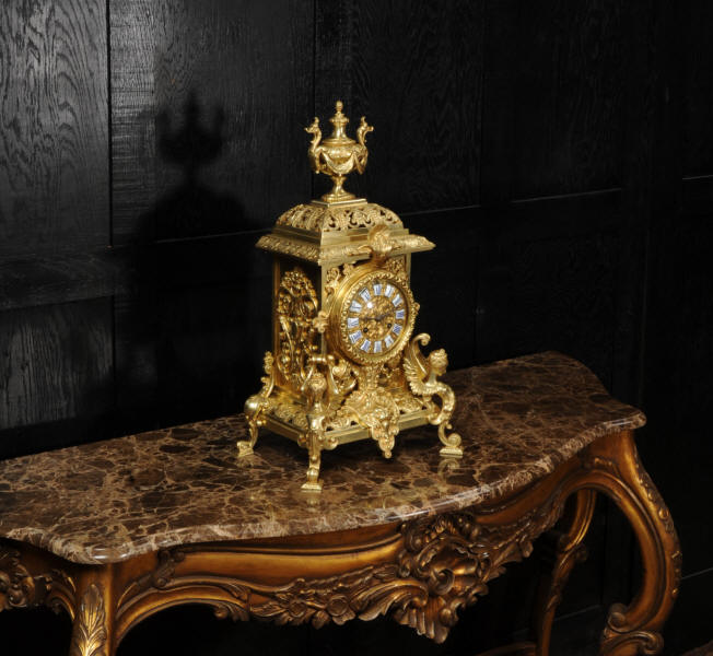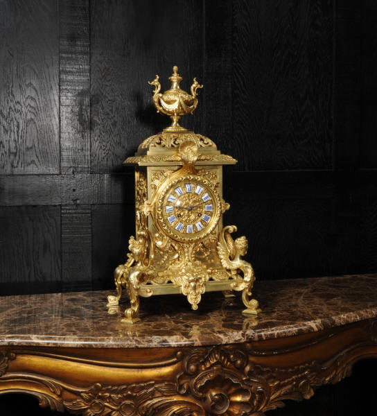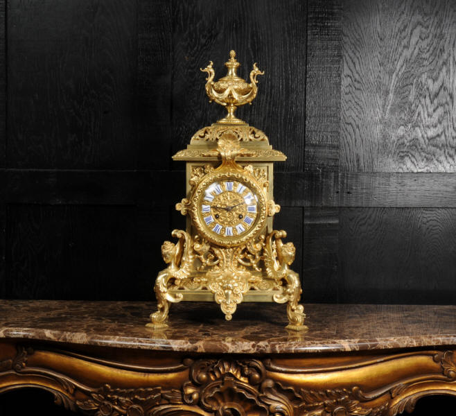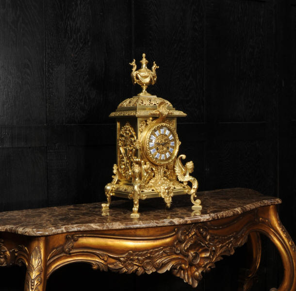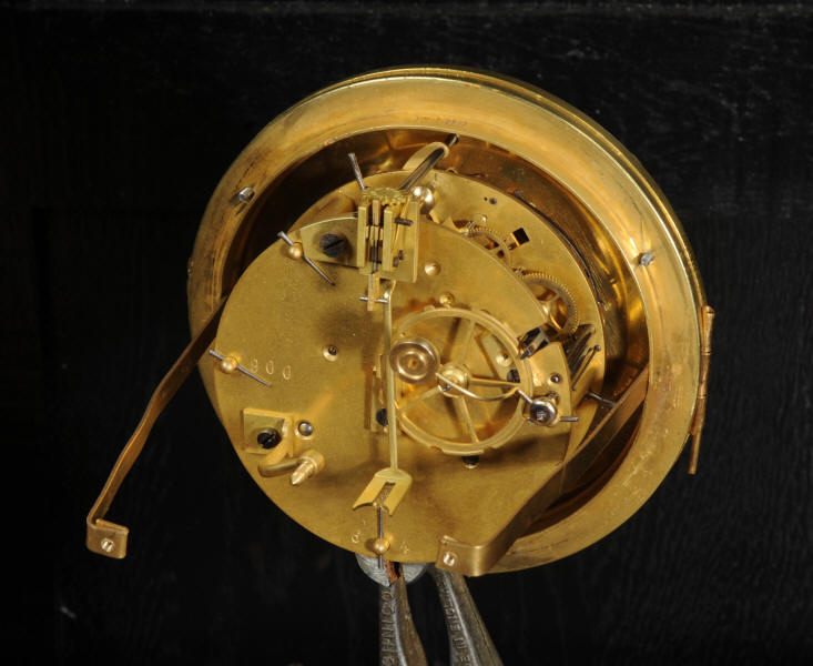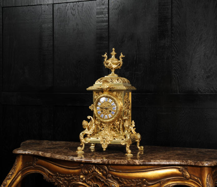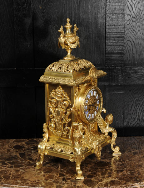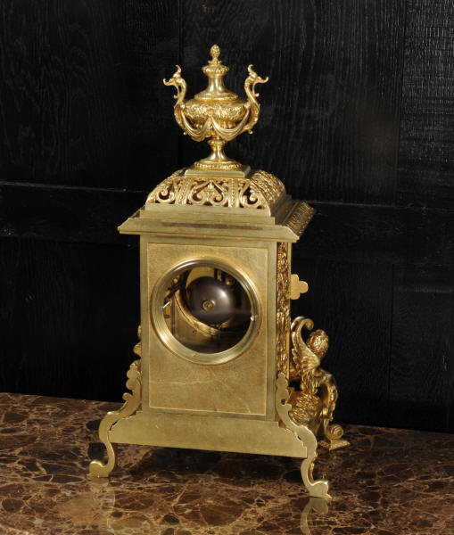 The dial is also gilt bronze, heavily formed with 12 individual enamel cartouches and blued steel hands. The heavy bronze bezel is fitted with convex glass. The rear door is also glazed to allow the movement to be seen. The French movement is of high quality and is by Vincenti. It is in excellent clean and running condition having been fully overhauled by our clockmaker. Pendulum is original. It runs for 8 days and strikes the hours and halves on a bell. Click the video below to hear the bell and watch the clock running. Condition of the case is excellent, the original gilding is beautifully clean and bright with hardly any wear or discolouration. The urn to the top is slightly distorted, may have been from new. The dial is also in excellent condition with no damage.