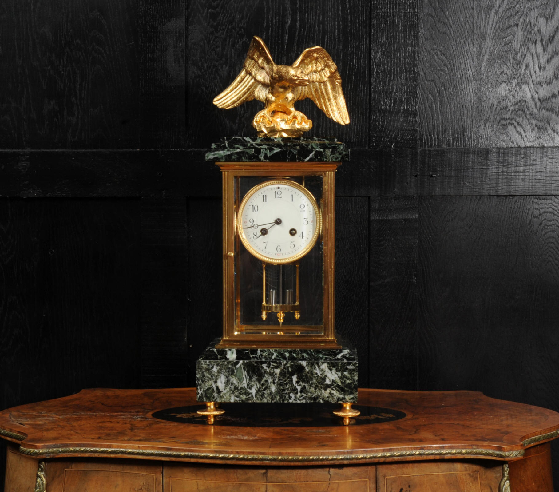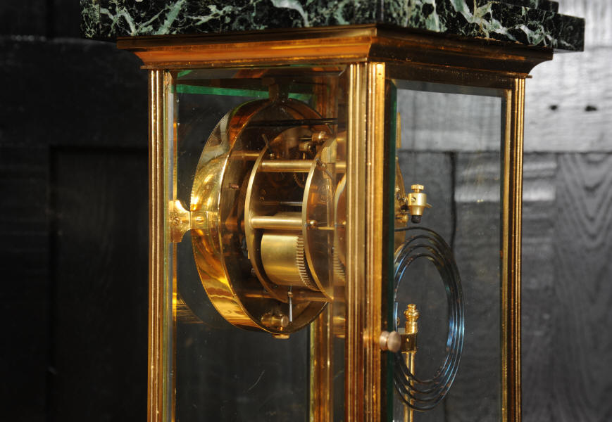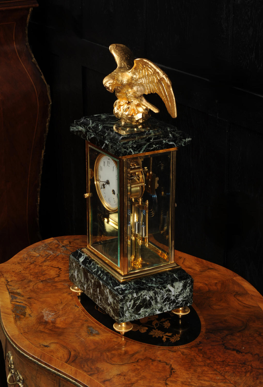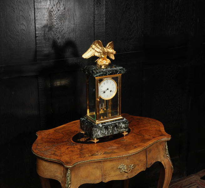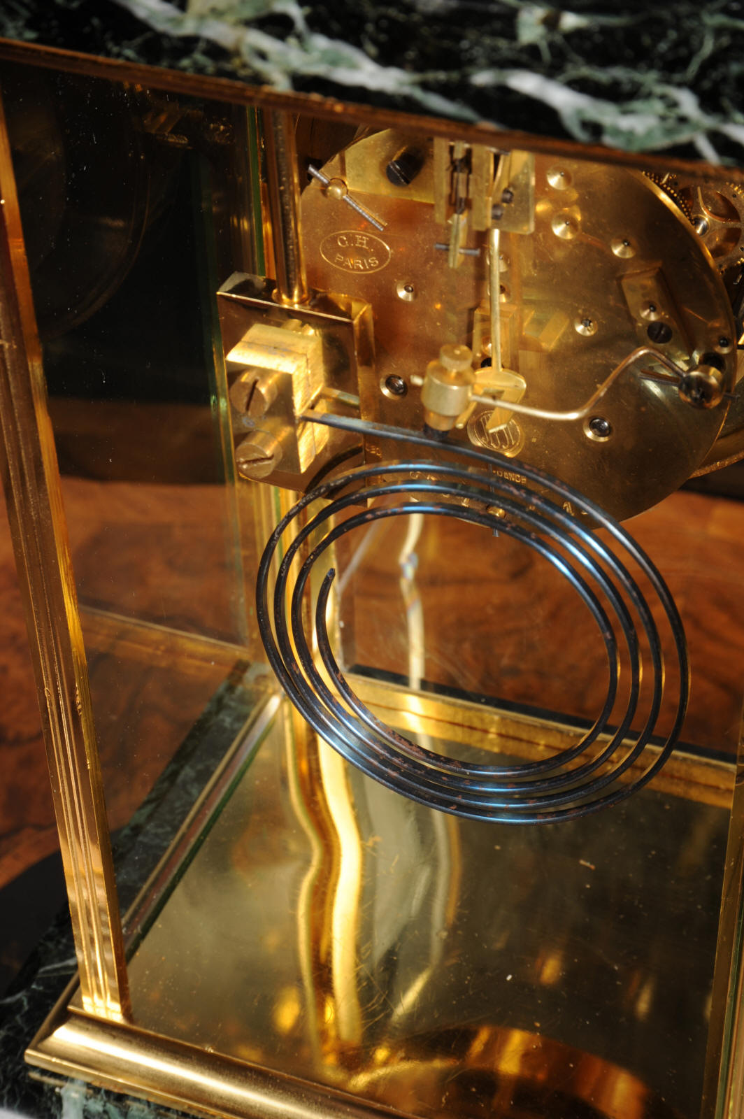The dial is porcelain enamel with it's original blued steel Breguet hands. The French movement is of high quality and is by Charles Hour. It is in excellent clean and running condition having been fully overhauled by our clockmaker. Pendulum is original, we have replaced the mercury with silver steel for safety. It runs for 8 days and strikes the hours and halves on a sonorous gong. Click the video clip below to hear the gong and watch the clock running!. Condition of the case is excellent, the original gilding is beautifully clean and bright with hardly any wear or discolouration. The dial is also in excellent condition with no damage. The marble is also excellent with just some slight nibbles to the edges. There are some small chips to the corners of the glass panels and a light scratch on the front door.