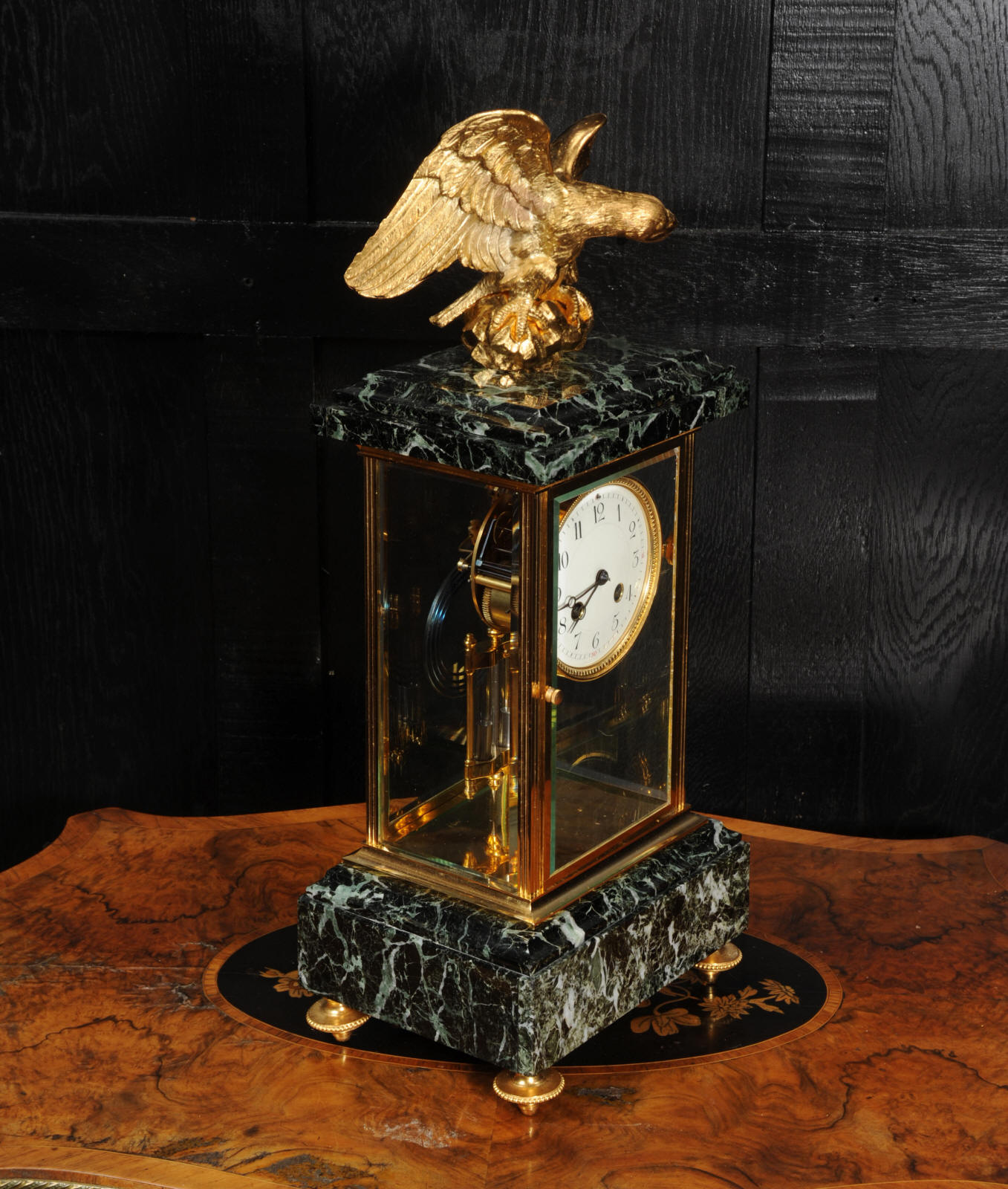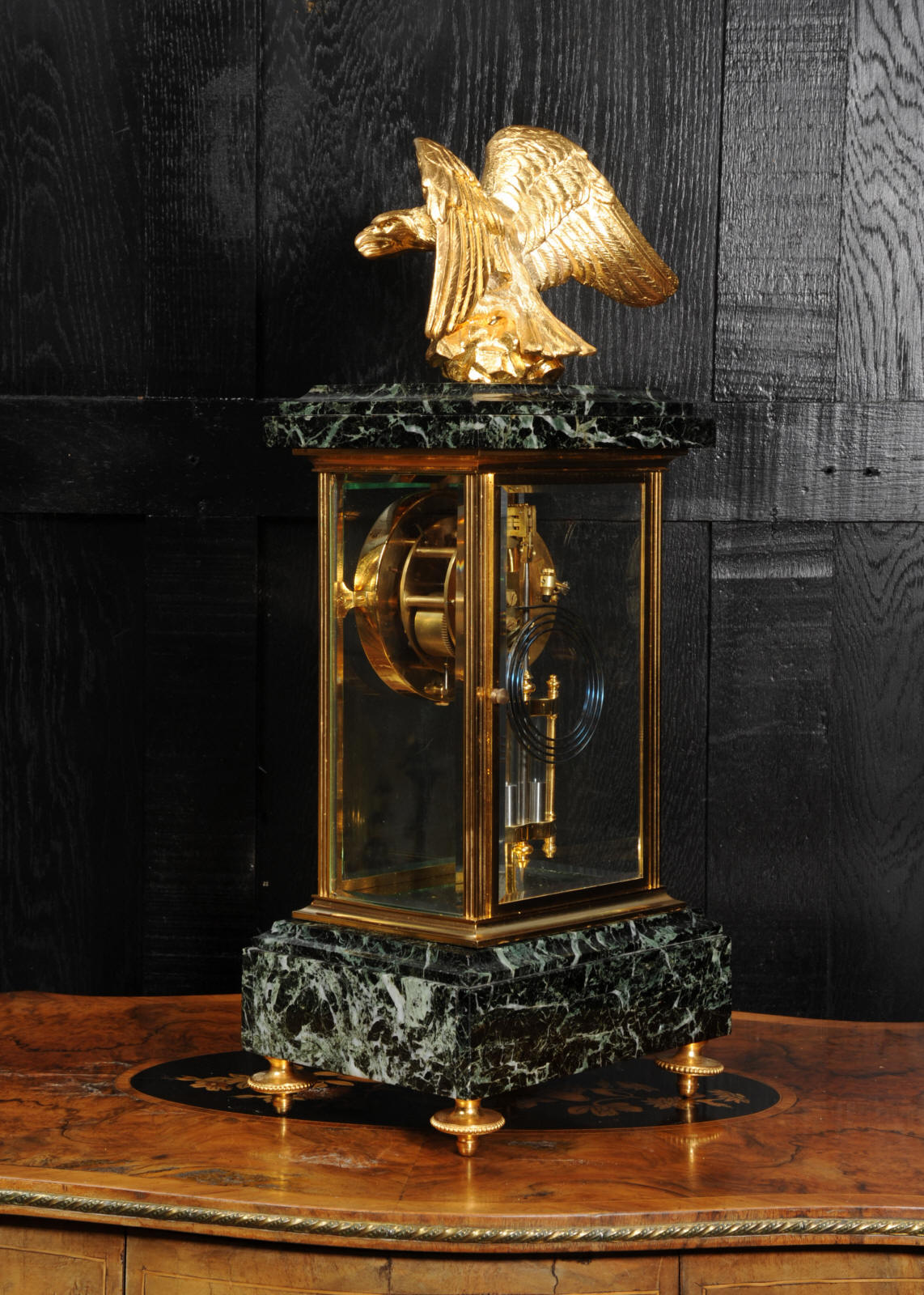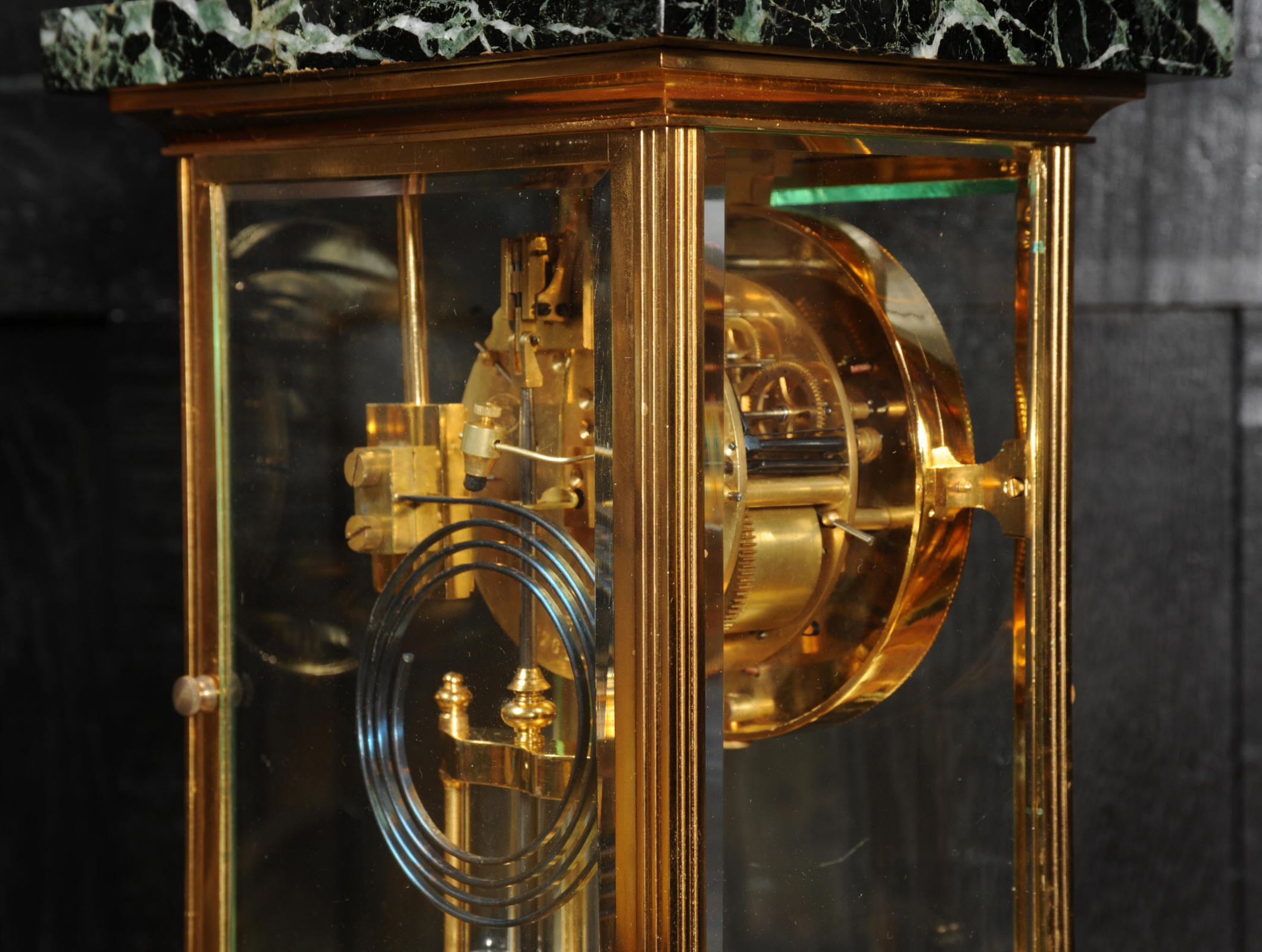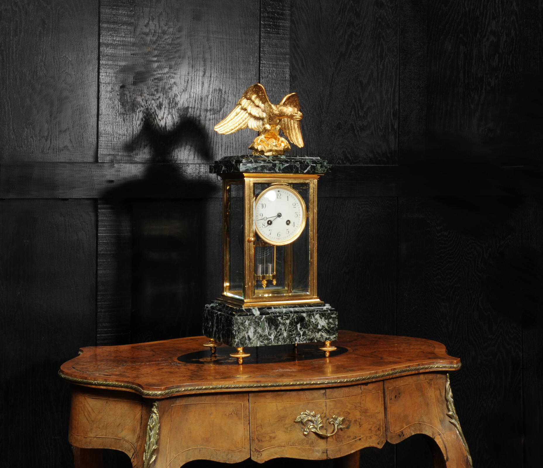The dial is porcelain enamel with it's original blued steel Breguet hands. The French movement is of high quality and is by Charles Hour. It is in excellent clean and running condition having been fully overhauled by our clockmaker. Pendulum is original, we have replaced the mercury with silver steel for safety. It runs for 8 days and strikes the hours and halves on a sonorous gong. Click the video clip below to hear the gong and watch the clock running!. Condition of the case is excellent, the original gilding is beautifully clean and bright with hardly any wear or discolouration. The dial is also in excellent condition with no damage. The marble is also excellent with just some slight nibbles to the edges. There are some small chips to the corners of the glass panels and a light scratch on the front door.