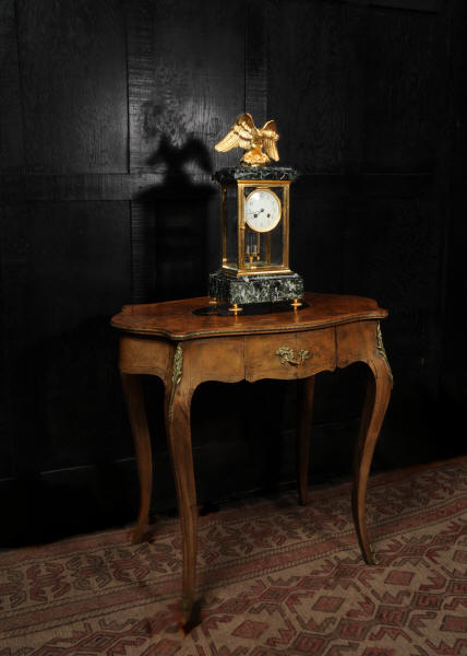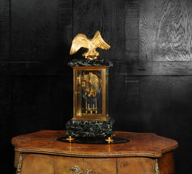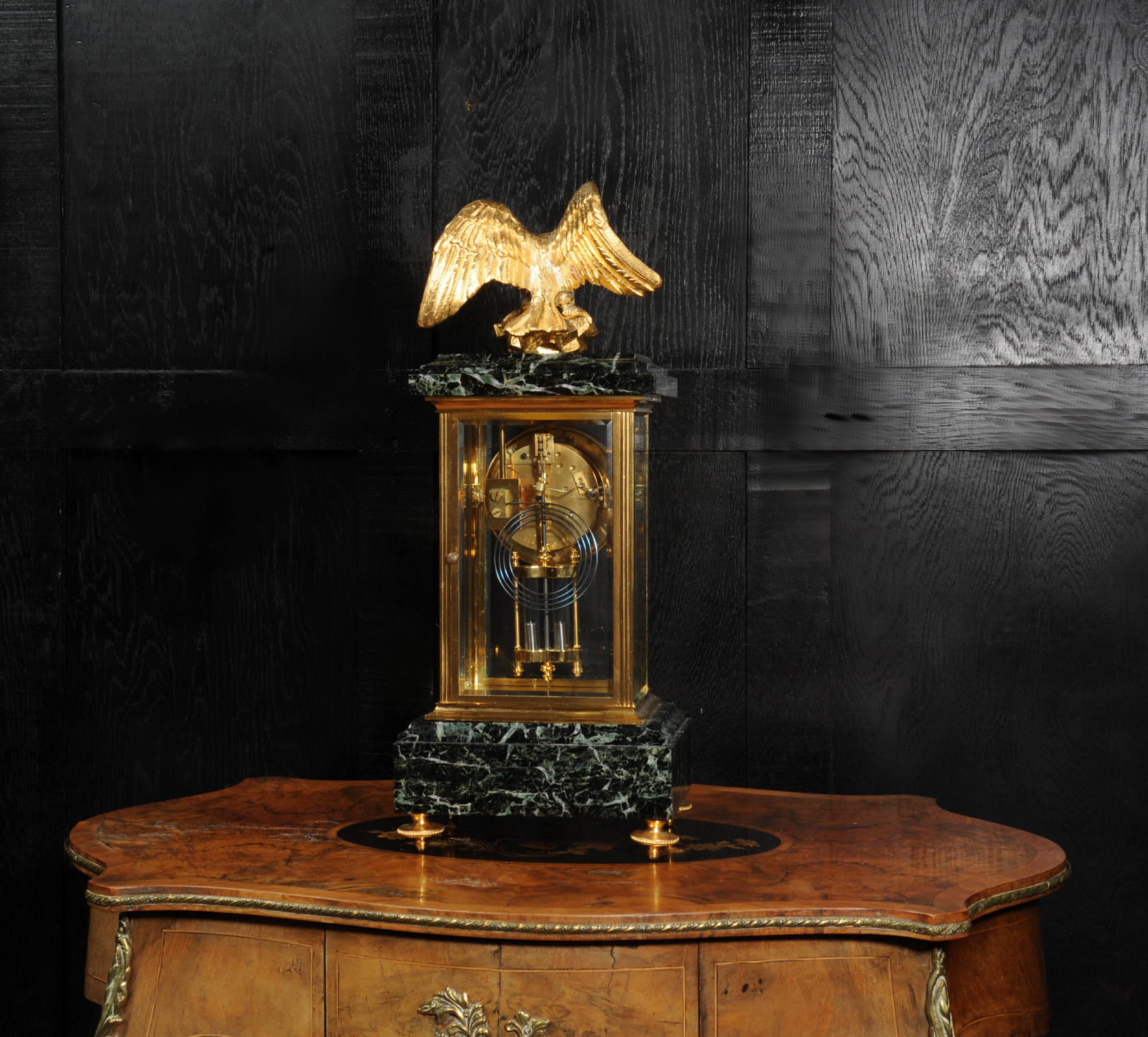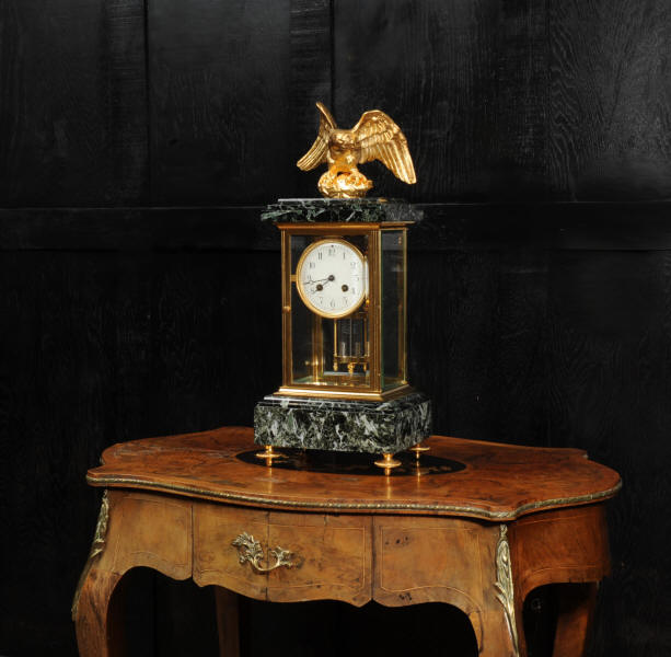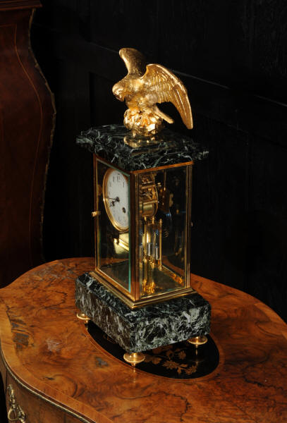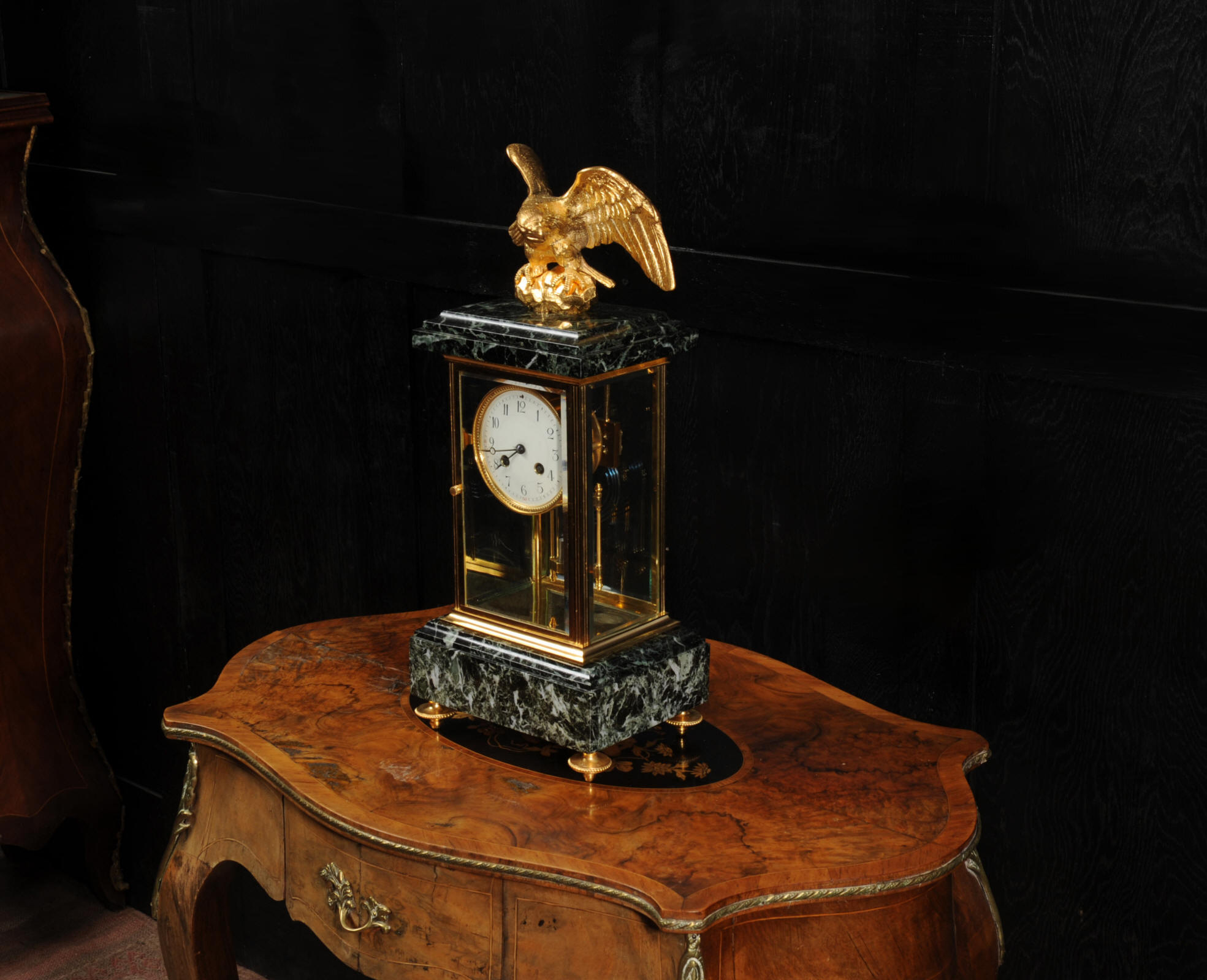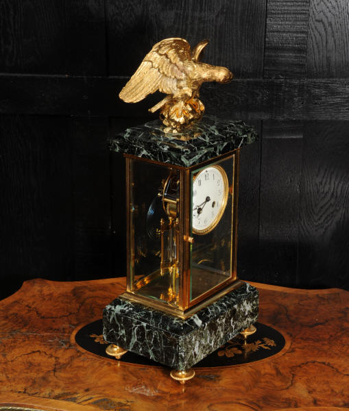 The dial is porcelain enamel with it's original blued steel Breguet hands. The French movement is of high quality and is by Charles Hour. It is in excellent clean and running condition having been fully overhauled by our clockmaker. Pendulum is original, we have replaced the mercury with silver steel for safety. It runs for 8 days and strikes the hours and halves on a sonorous gong. Click the video clip below to hear the gong and watch the clock running!. Condition of the case is excellent, the original gilding is beautifully clean and bright with hardly any wear or discolouration. The dial is also in excellent condition with no damage. The marble is also excellent with just some slight nibbles to the edges. There are some small chips to the corners of the glass panels and a light scratch on the front door.
