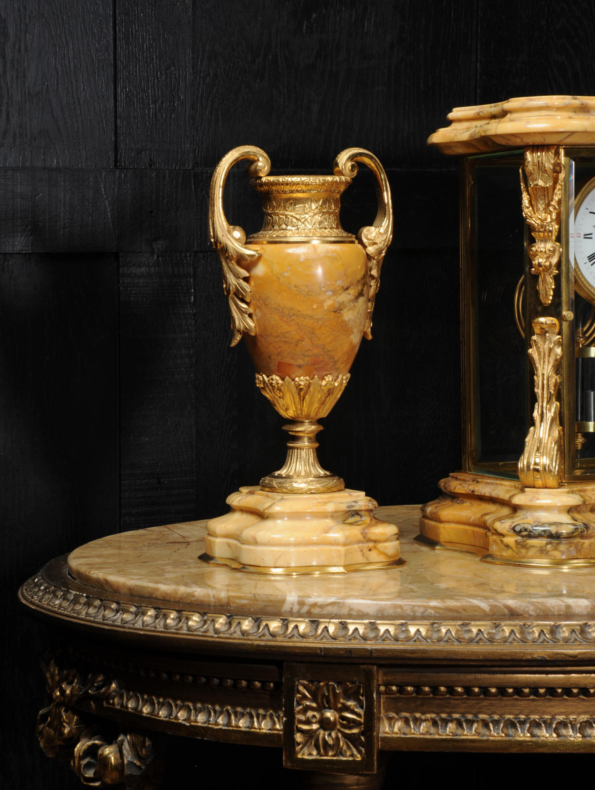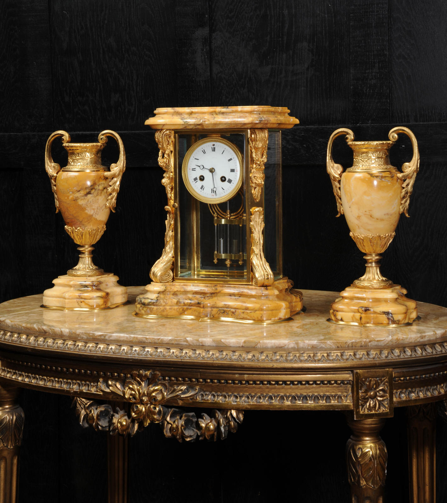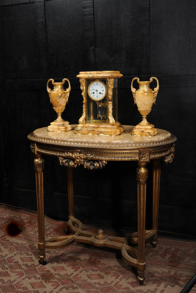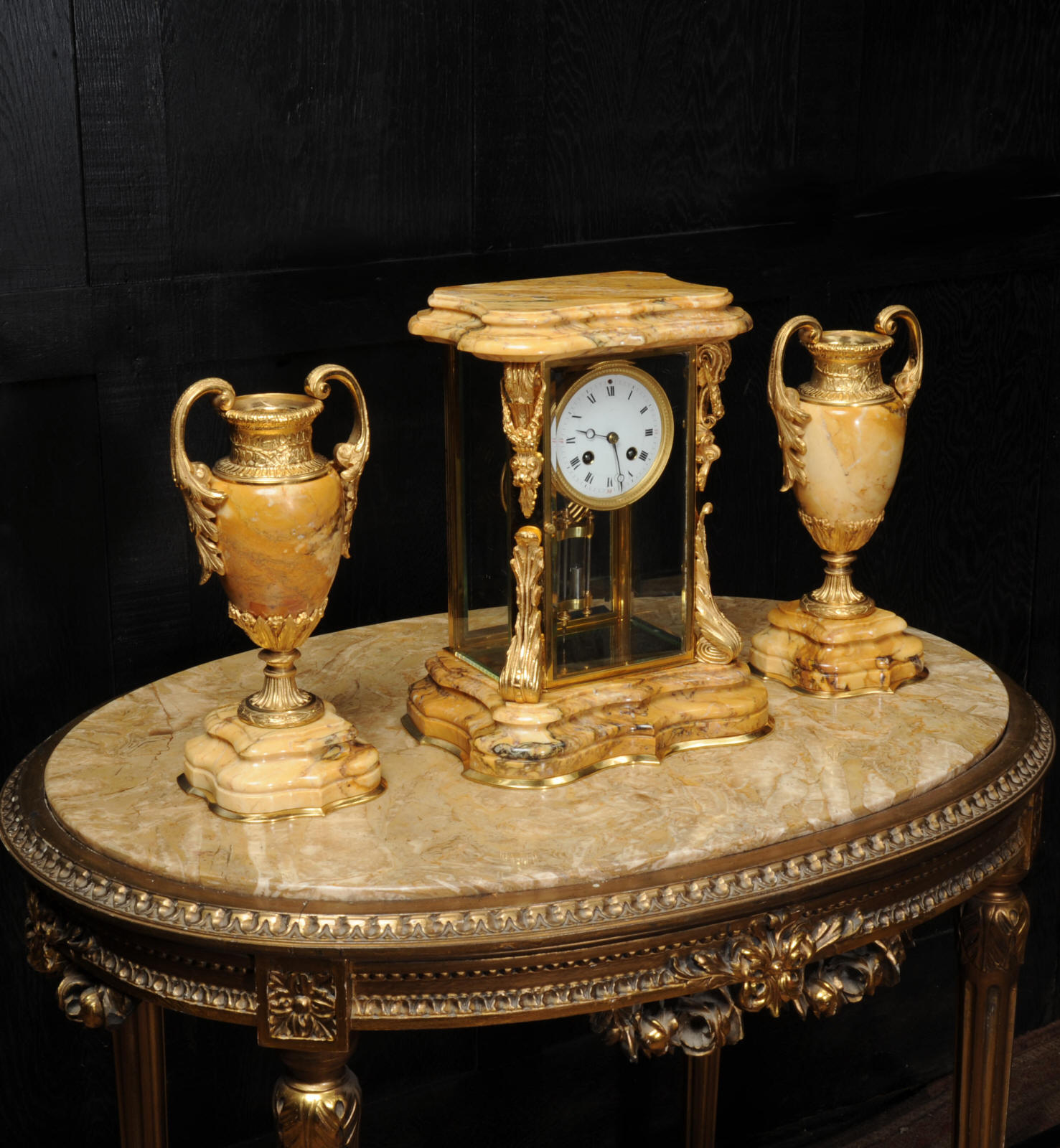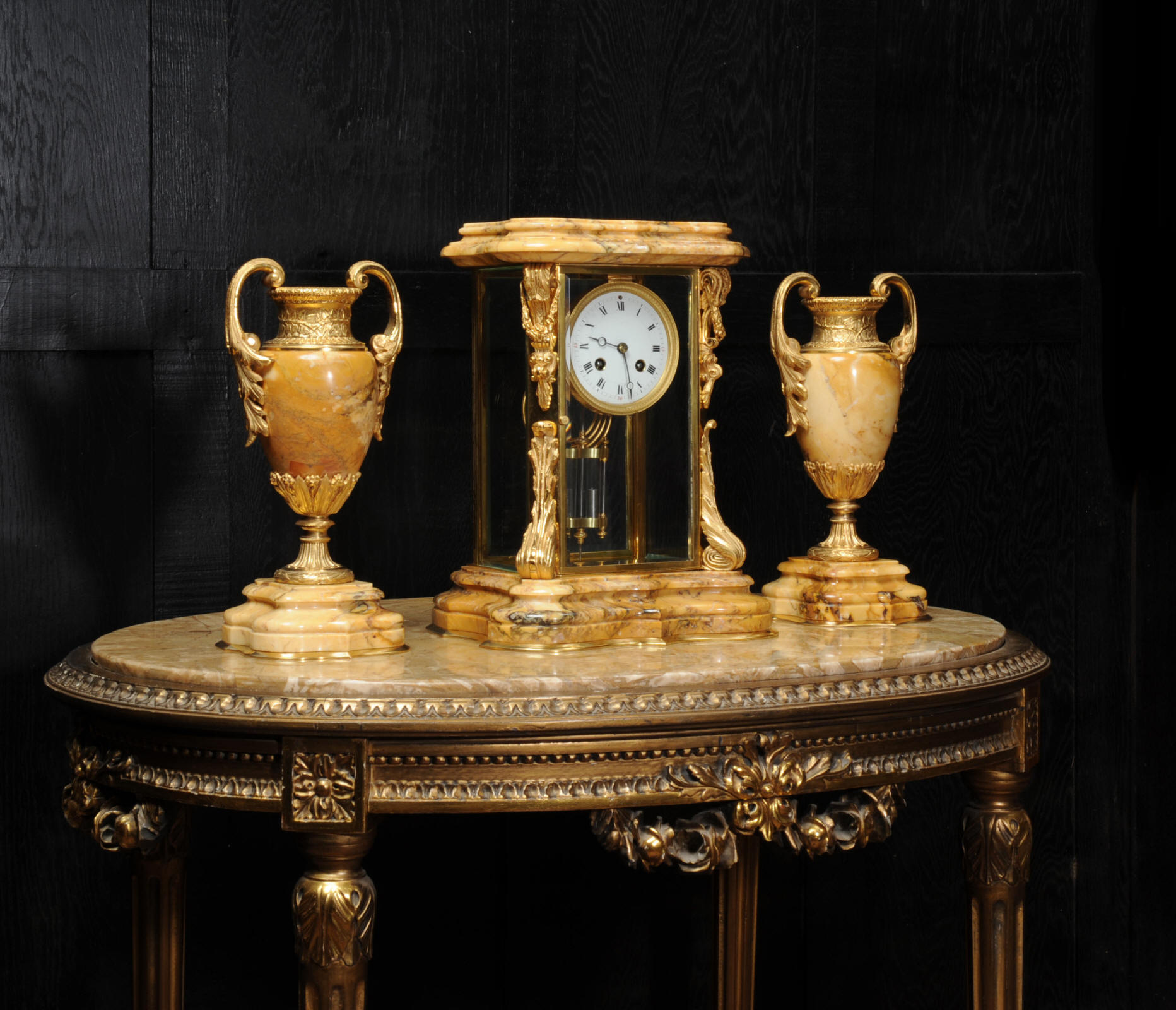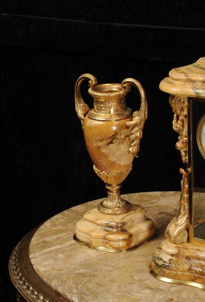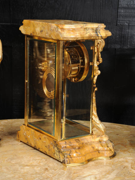 The dial is porcelain enamel on copper, finely lettered and with original finely cut and blued breguet hands. The French movement is by Japy Freres and is of the makers usual high quality. It is in excellent clean and running condition having been fully overhauled by our clockmaker. Pendulum is original, we have replaced the mercury with polished silver steel for safety. It runs for 8 days and strikes the hours and halves on a coiled gong. Click the video clip below to hear the gong and watch the clock running! Condition of the case is excellent, the original gilding is beautifully clean and bright with hardly any wear or discolouration. The marble is also excellent with no significant damage and a good polish. The dial is also in excellent condition just some small scratches. The urn inserts have some repair / cracking but do not detract.