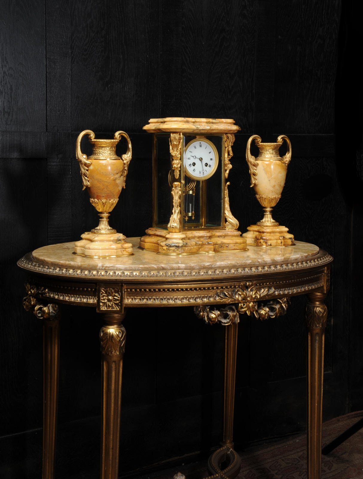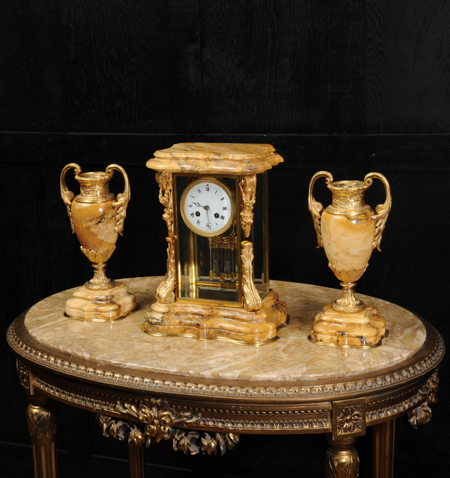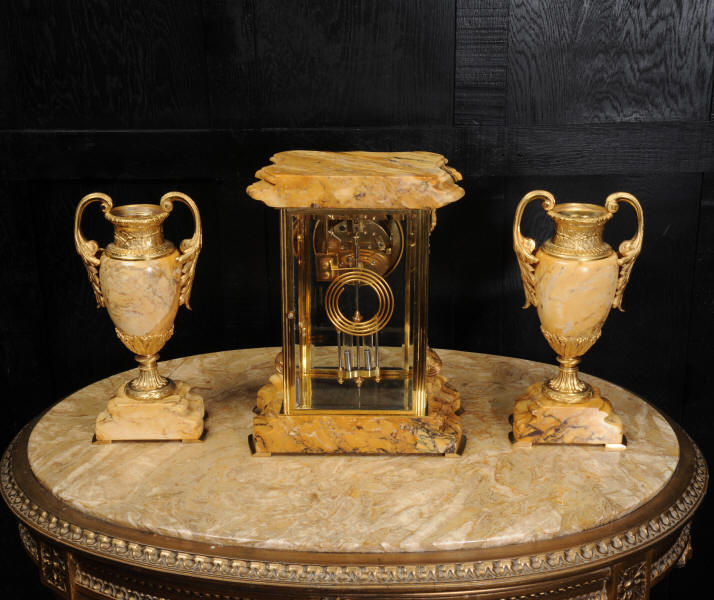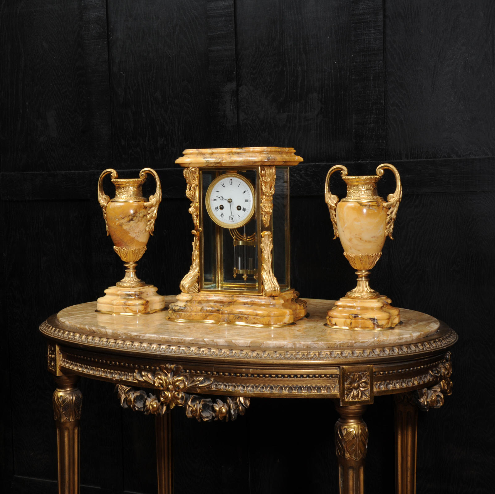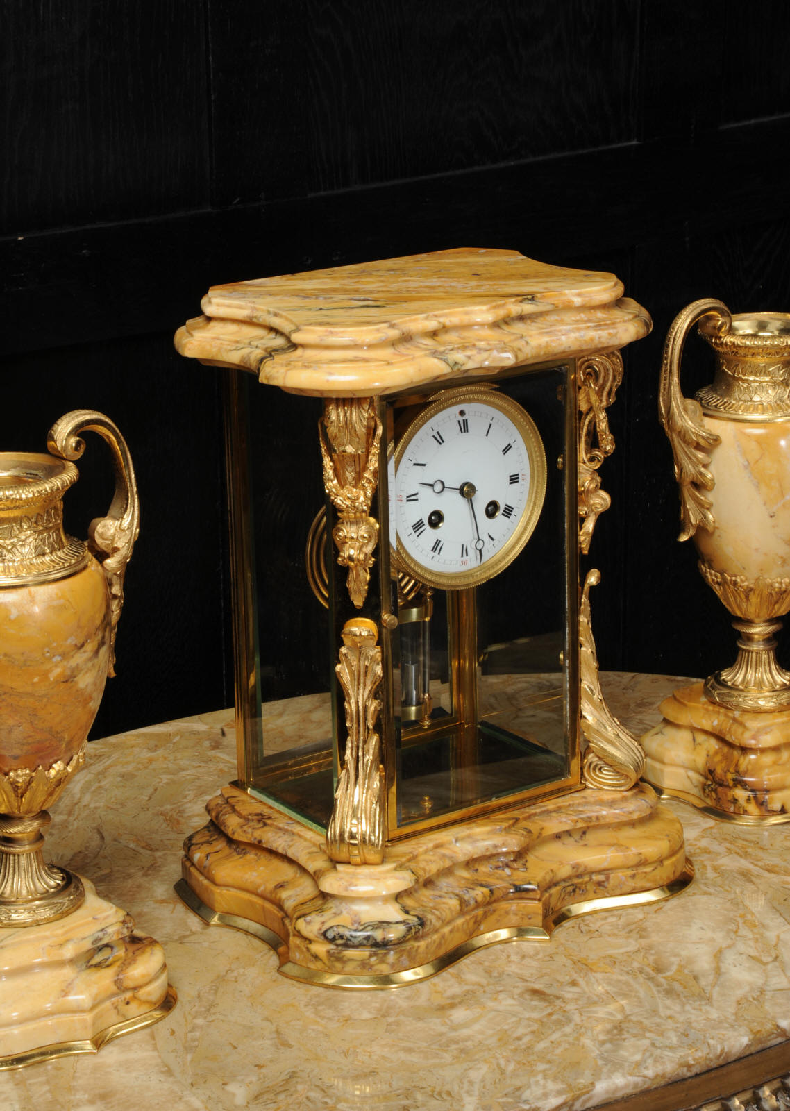 The dial is porcelain enamel on copper, finely lettered and with original finely cut and blued breguet hands. The French movement is by Japy Freres and is of the makers usual high quality. It is in excellent clean and running condition having been fully overhauled by our clockmaker. Pendulum is original, we have replaced the mercury with polished silver steel for safety. It runs for 8 days and strikes the hours and halves on a coiled gong. Click the video clip below to hear the gong and watch the clock running! Condition of the case is excellent, the original gilding is beautifully clean and bright with hardly any wear or discolouration. The marble is also excellent with no significant damage and a good polish. The dial is also in excellent condition just some small scratches. The urn inserts have some repair / cracking but do not detract.