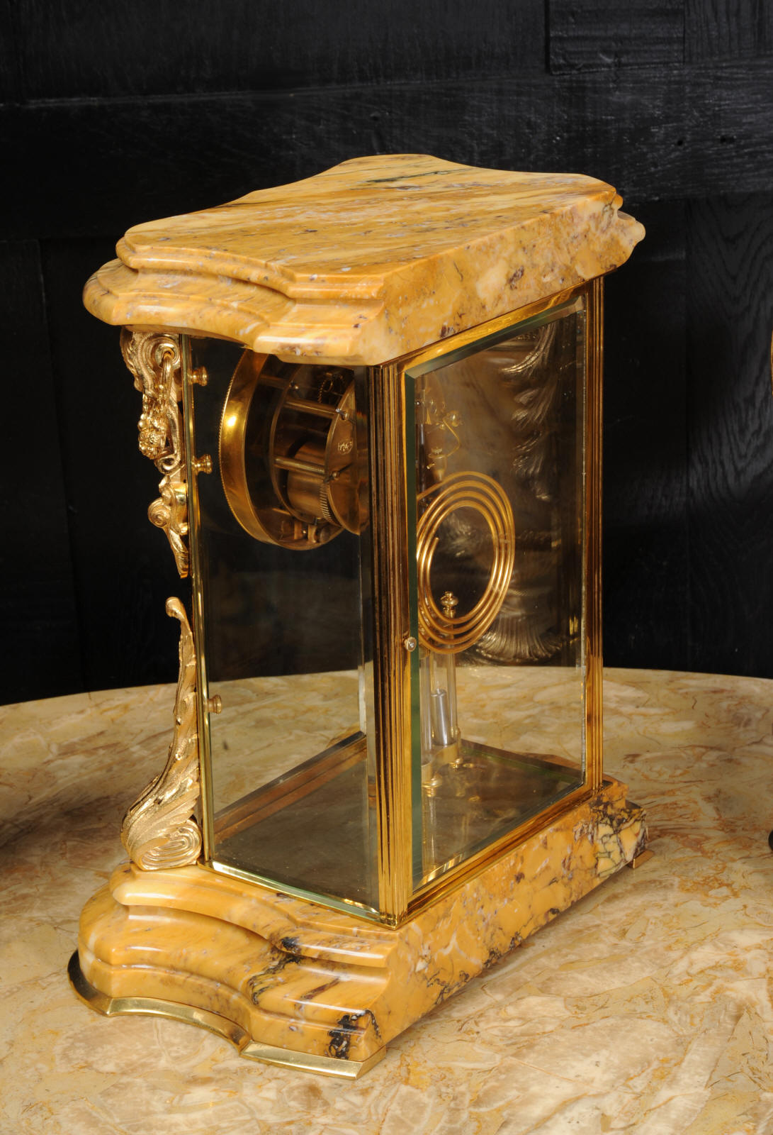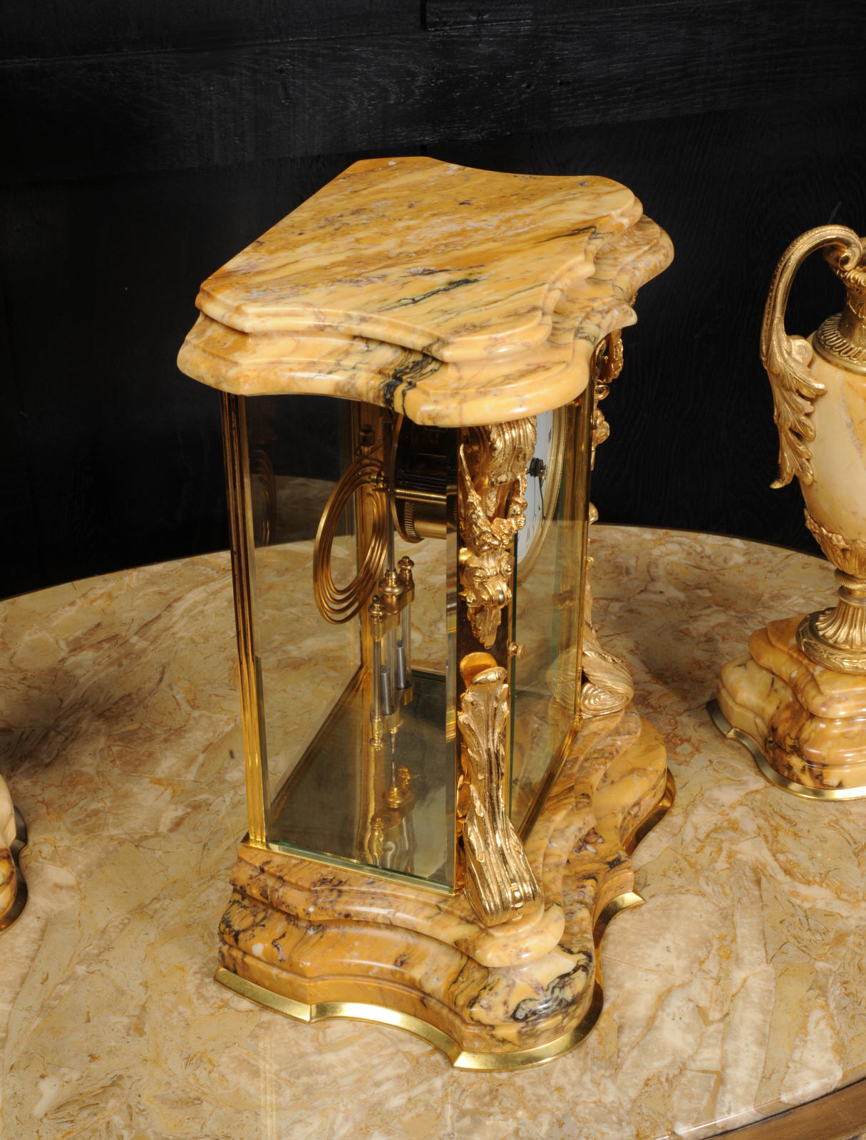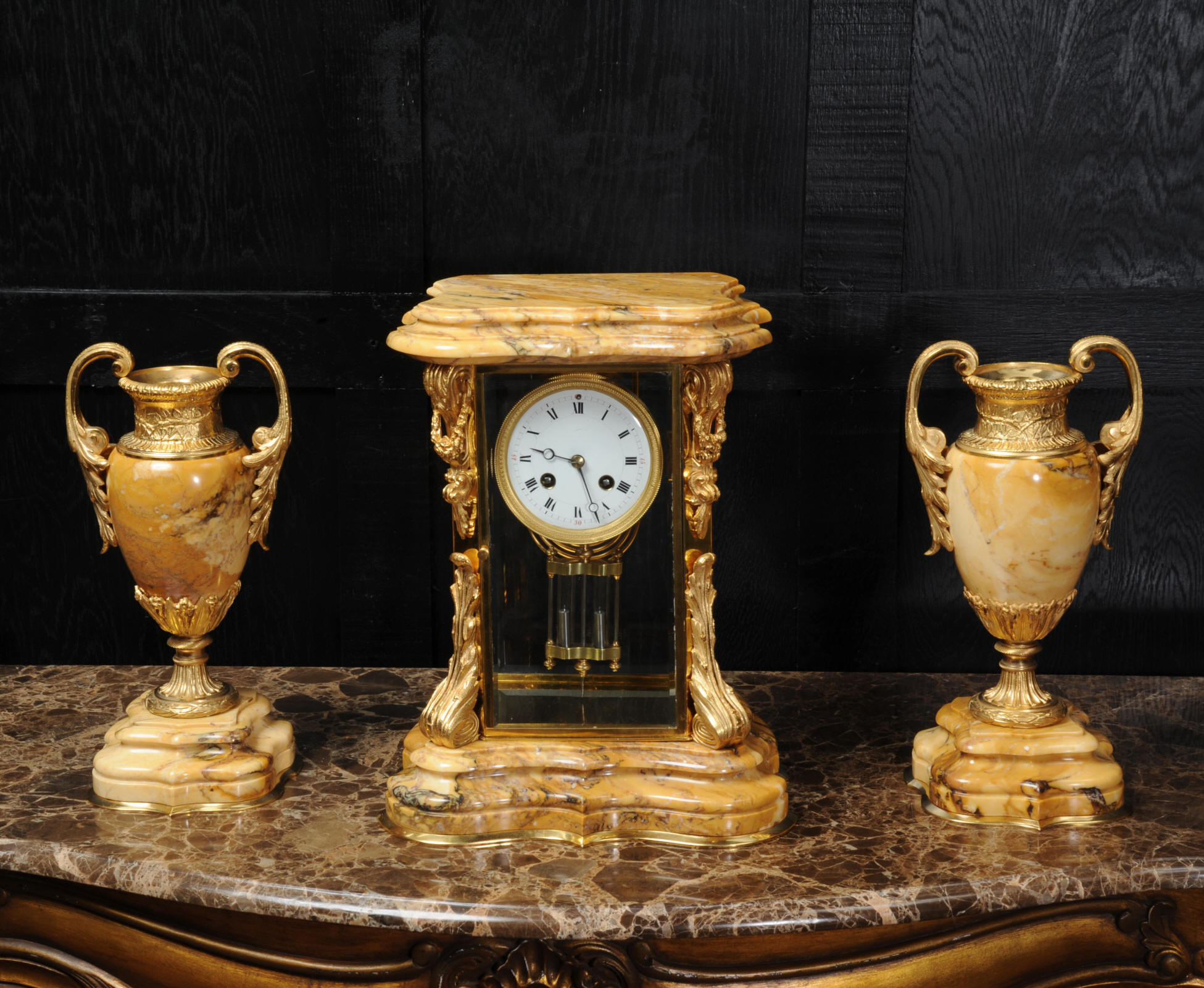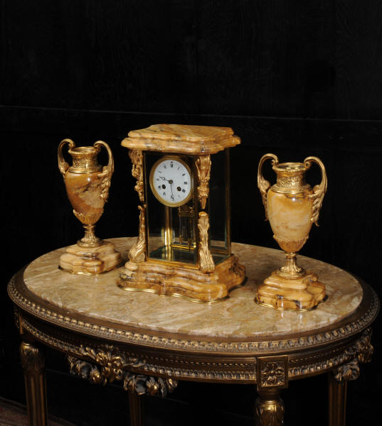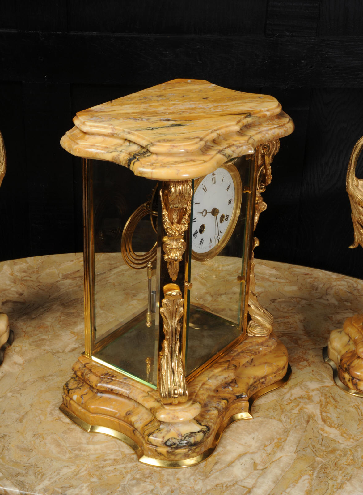 The dial is porcelain enamel on copper, finely lettered and with original finely cut and blued breguet hands. The French movement is by Japy Freres and is of the makers usual high quality. It is in excellent clean and running condition having been fully overhauled by our clockmaker. Pendulum is original, we have replaced the mercury with polished silver steel for safety. It runs for 8 days and strikes the hours and halves on a coiled gong. Click the video clip below to hear the gong and watch the clock running! Condition of the case is excellent, the original gilding is beautifully clean and bright with hardly any wear or discolouration. The marble is also excellent with no significant damage and a good polish. The dial is also in excellent condition just some small scratches. The urn inserts have some repair / cracking but do not detract.