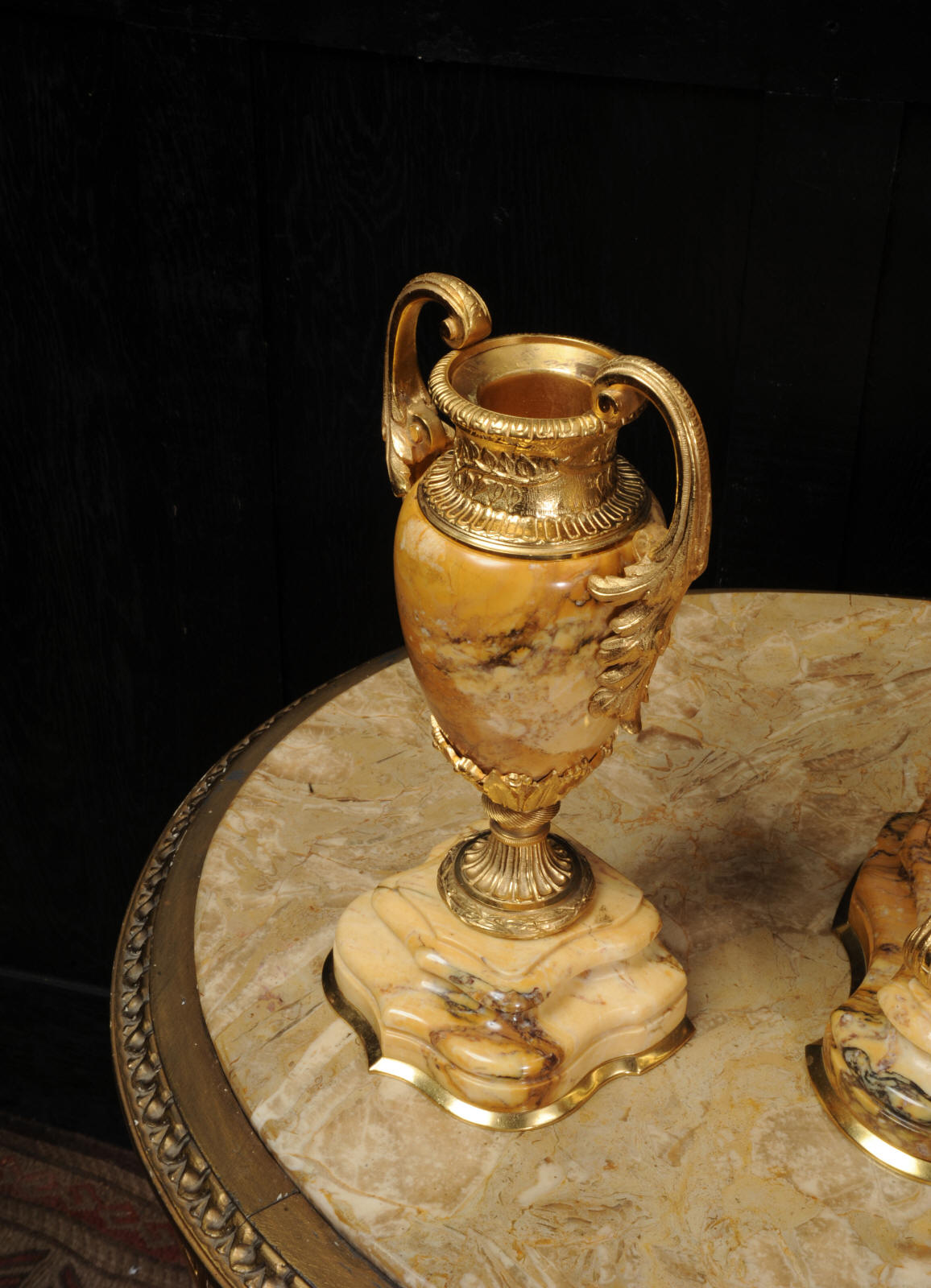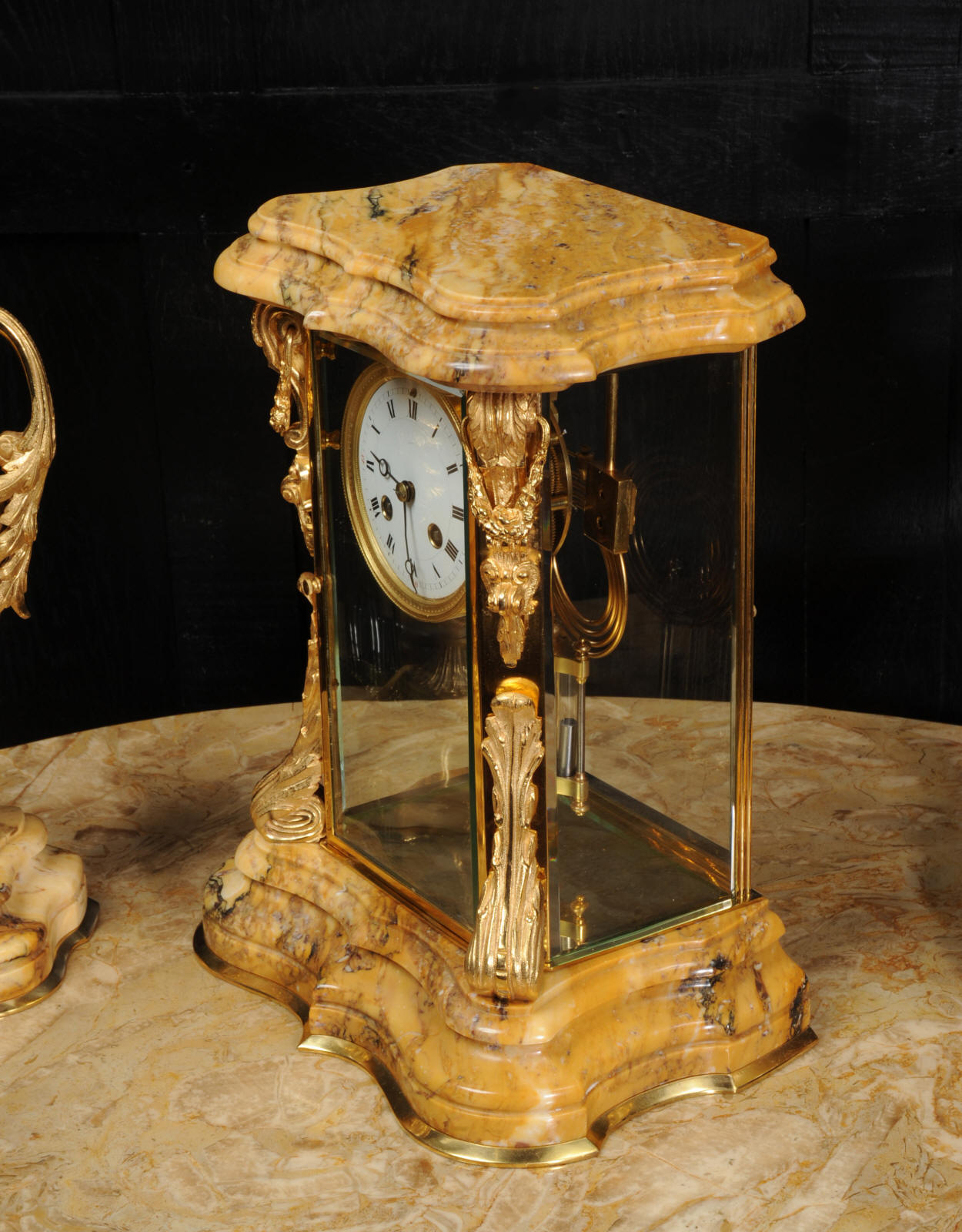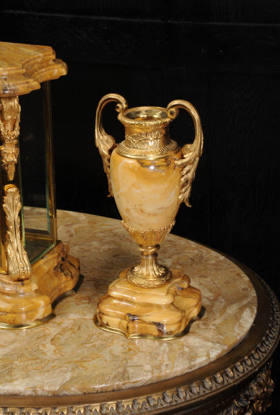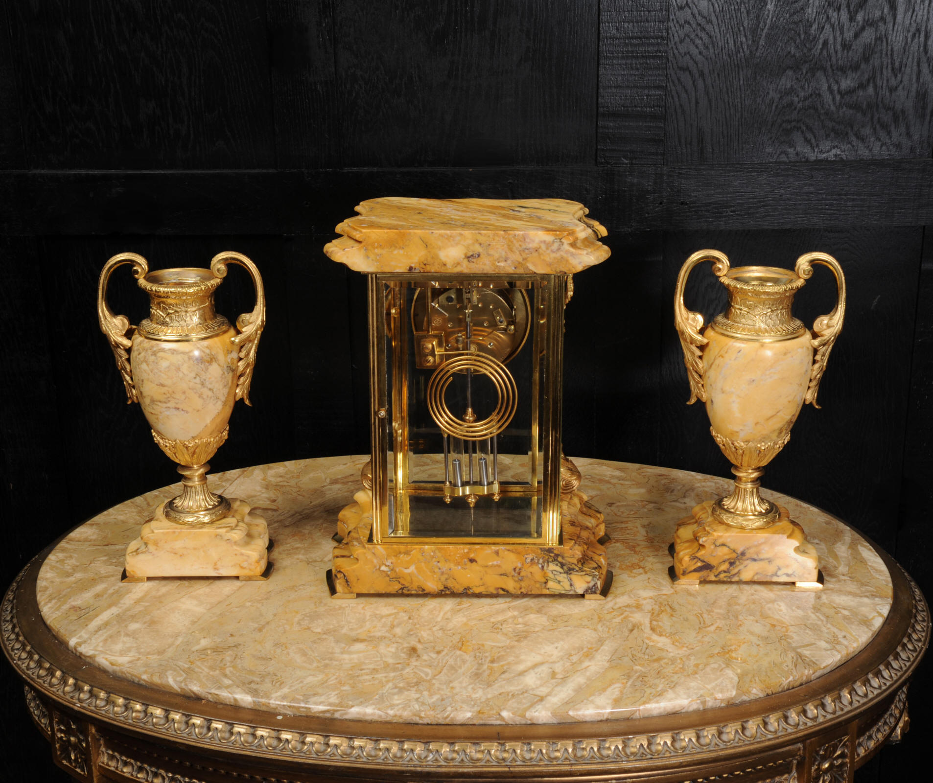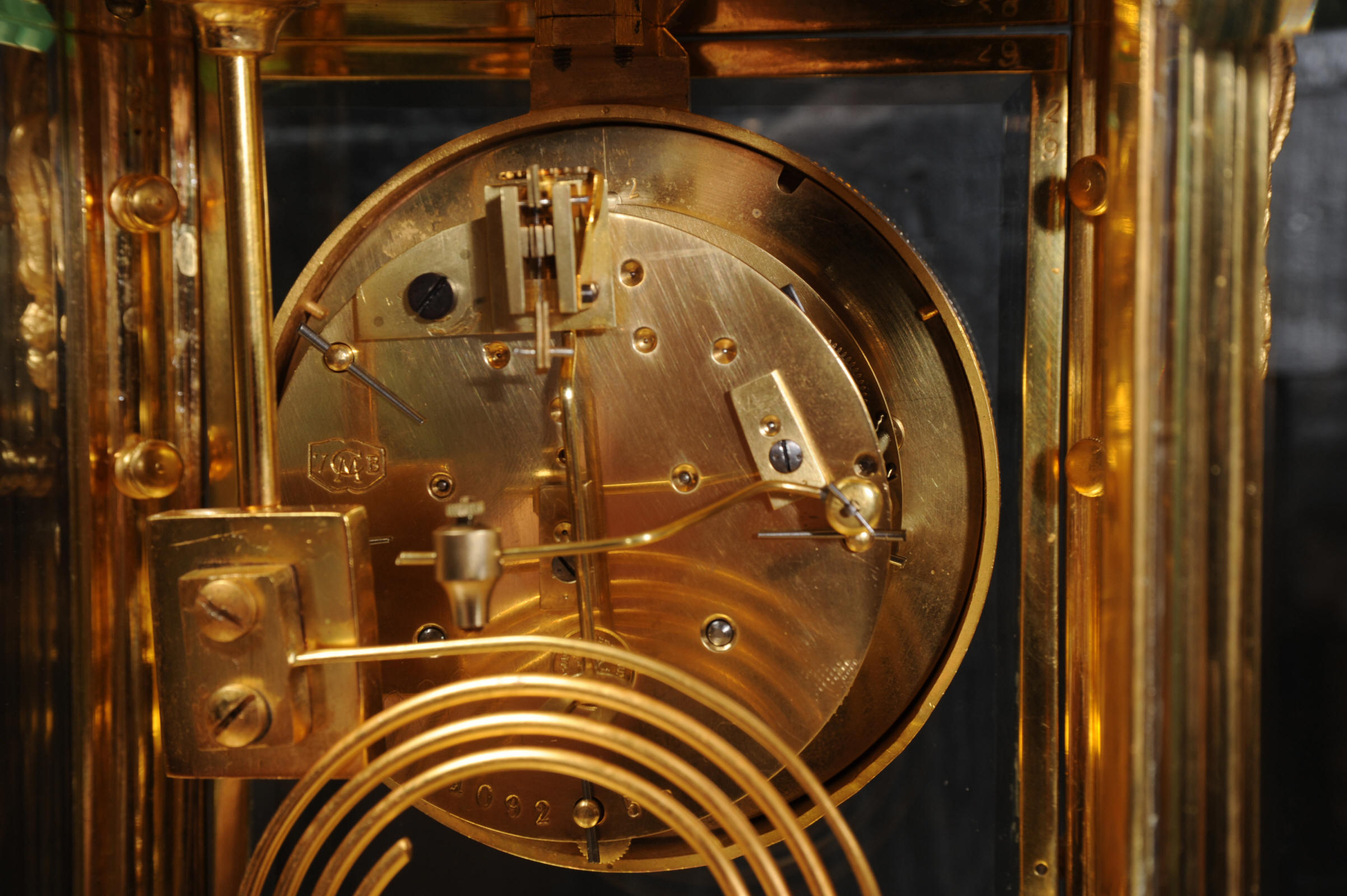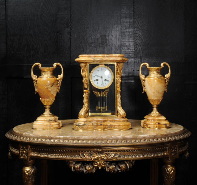 The dial is porcelain enamel on copper, finely lettered and with original finely cut and blued breguet hands. The French movement is by Japy Freres and is of the makers usual high quality. It is in excellent clean and running condition having been fully overhauled by our clockmaker. Pendulum is original, we have replaced the mercury with polished silver steel for safety. It runs for 8 days and strikes the hours and halves on a coiled gong. Click the video clip below to hear the gong and watch the clock running! Condition of the case is excellent, the original gilding is beautifully clean and bright with hardly any wear or discolouration. The marble is also excellent with no significant damage and a good polish. The dial is also in excellent condition just some small scratches. The urn inserts have some repair / cracking but do not detract.