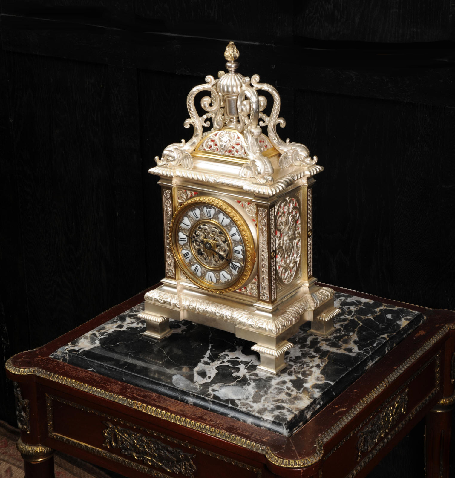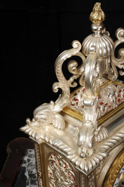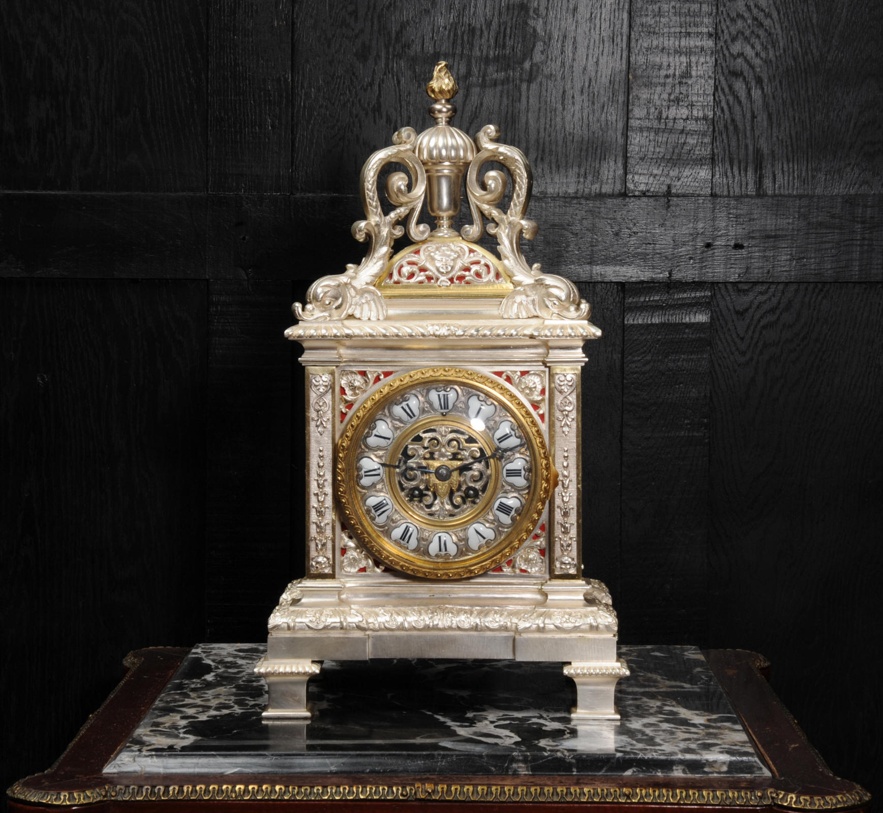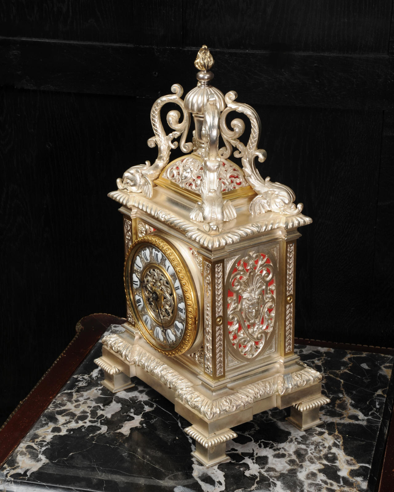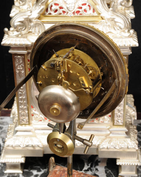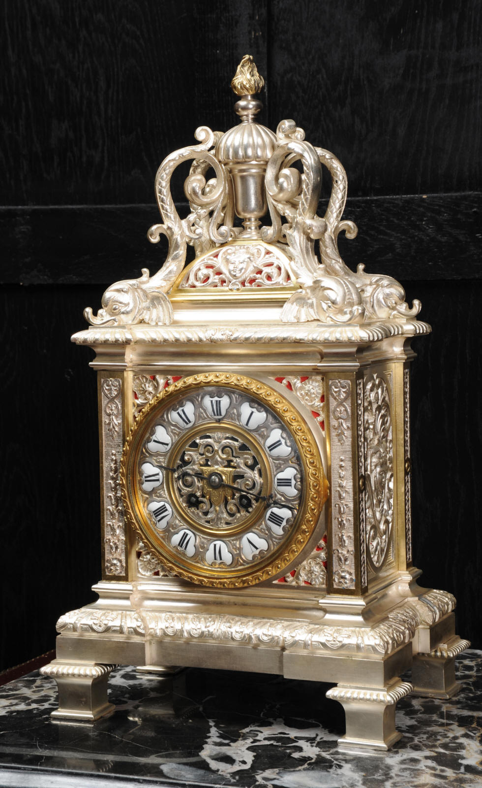 The dial is heavily cast in bronze with an armorial motif to the centre and 12 porcelain enamel cartouche letters. It is complete with original blued steel hands and convex glass. The French movement is by Japy Frères and is of high quality. It is in excellent clean and running condition with original pendulum. It runs for 8 days and strikes the hours and halves on a bell. Click the video clip below to hear the bell and watch the clock running! Condition of the case is excellent, the silvering and gild are clean and bright with only occasional discolouration and marks. The dial is also in excellent condition with no damage. The clock has previously been restored with fresh fabric fitted to the sound frets.