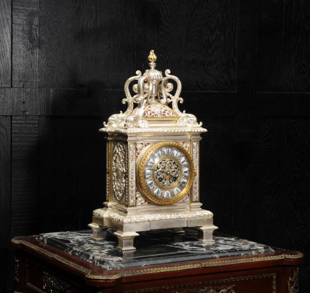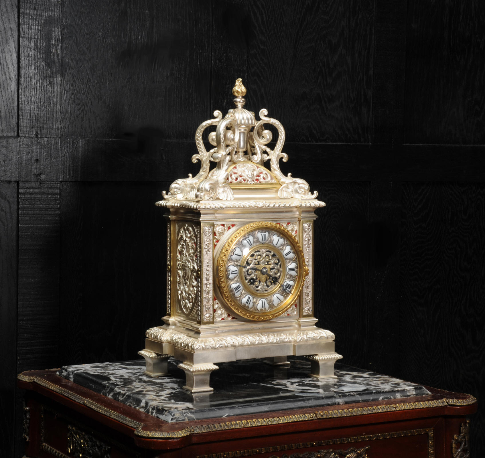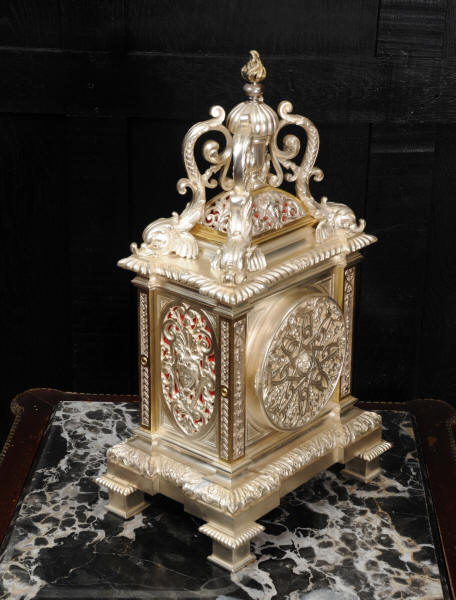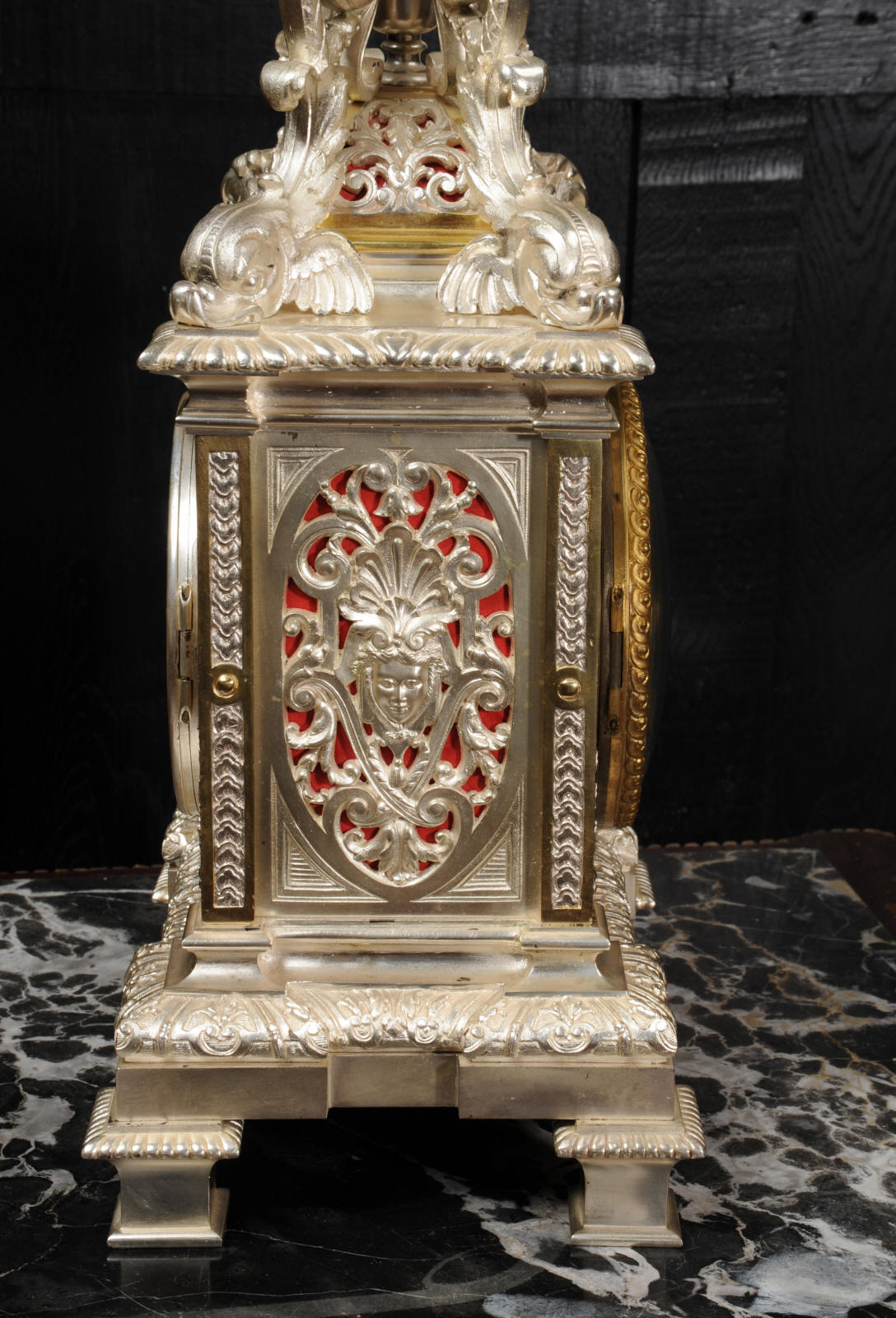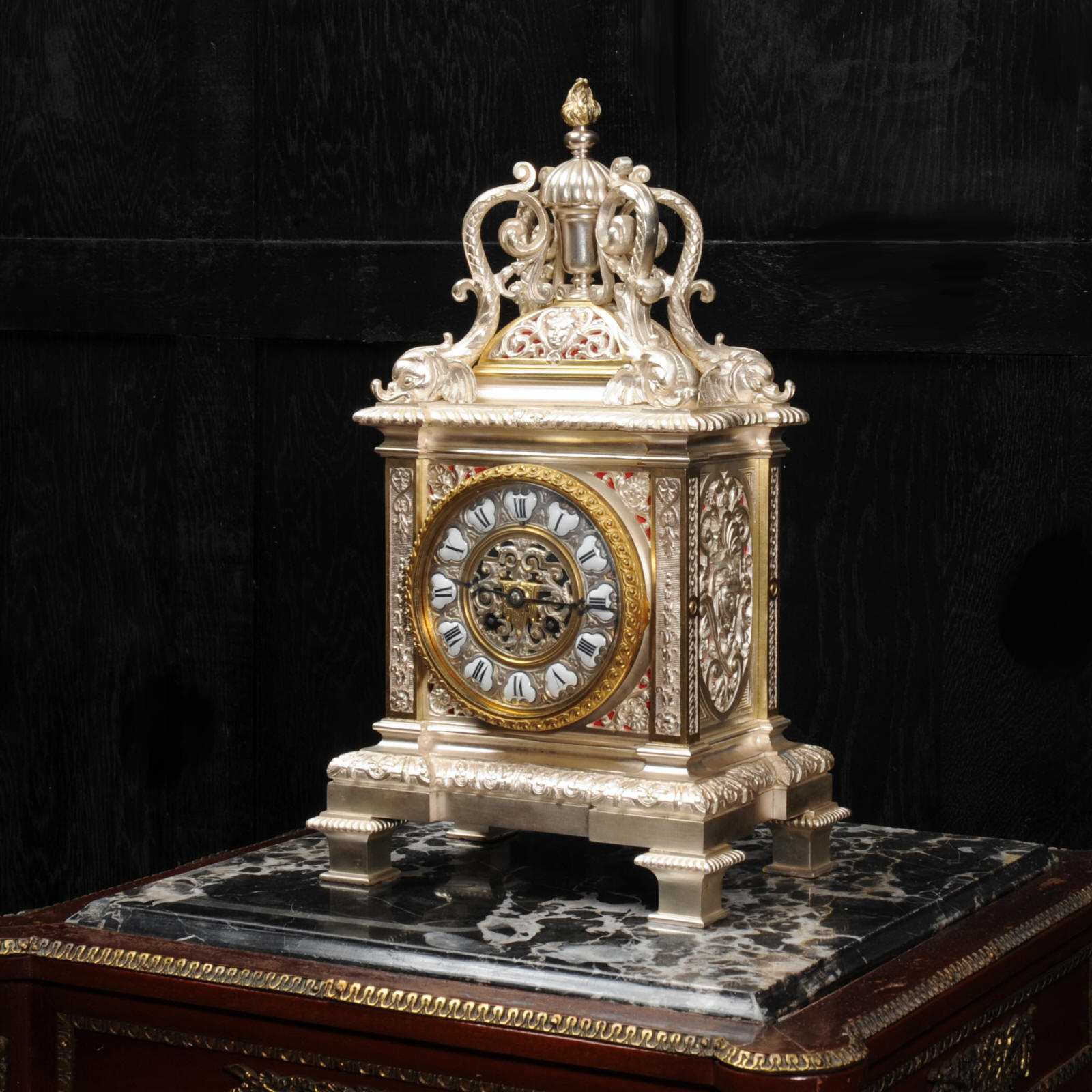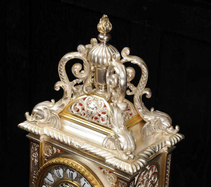 The dial is heavily cast in bronze with an armorial motif to the centre and 12 porcelain enamel cartouche letters. It is complete with original blued steel hands and convex glass. The French movement is by Japy Frères and is of high quality. It is in excellent clean and running condition with original pendulum. It runs for 8 days and strikes the hours and halves on a bell. Click the video clip below to hear the bell and watch the clock running! Condition of the case is excellent, the silvering and gild are clean and bright with only occasional discolouration and marks. The dial is also in excellent condition with no damage. The clock has previously been restored with fresh fabric fitted to the sound frets.