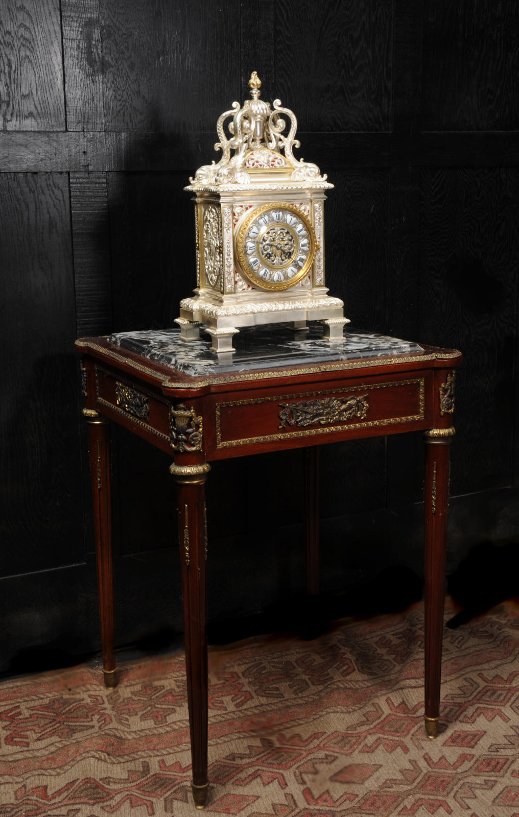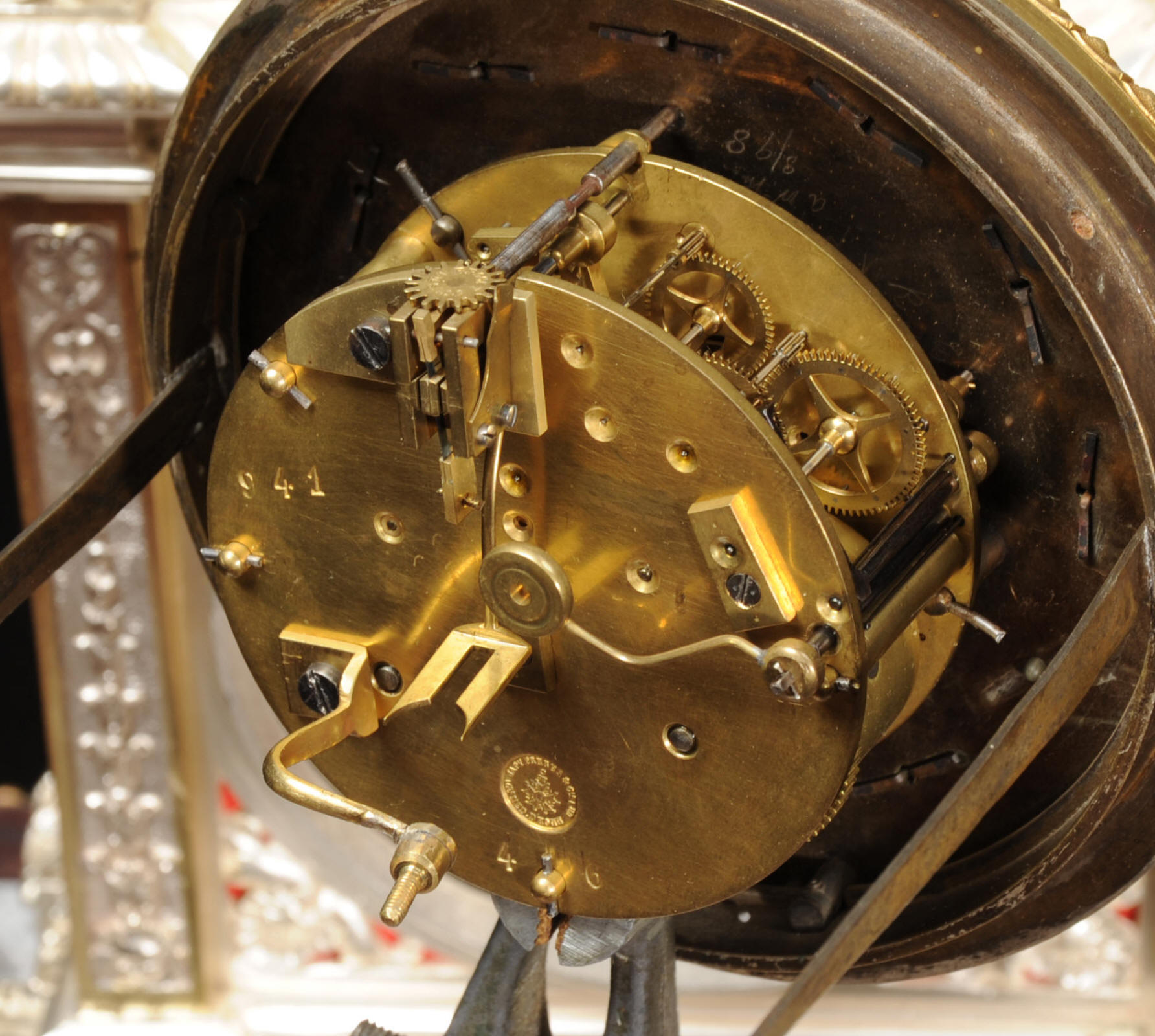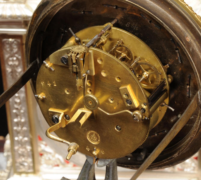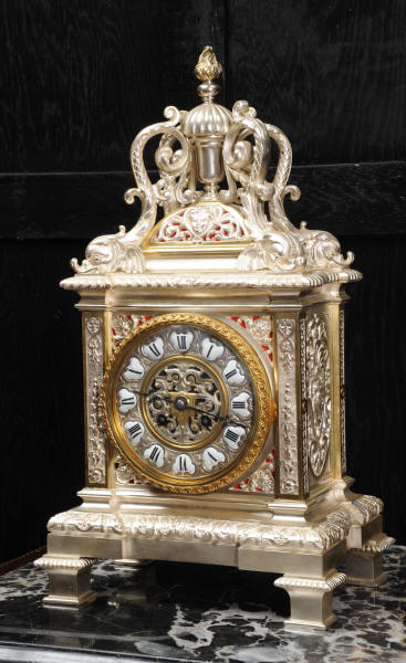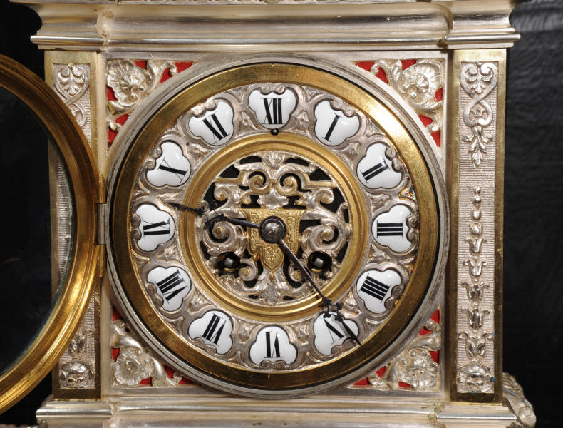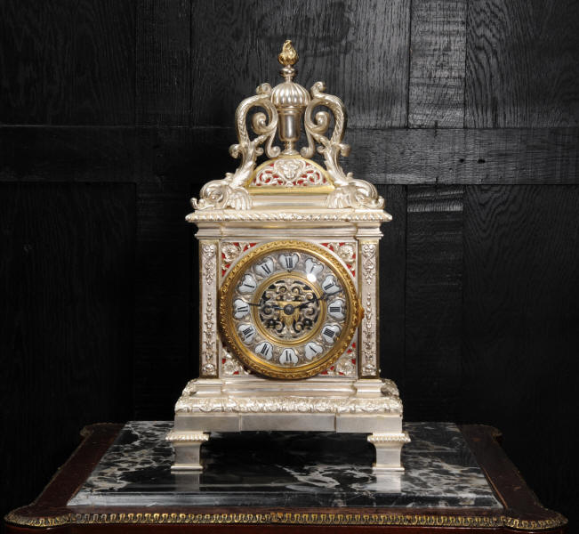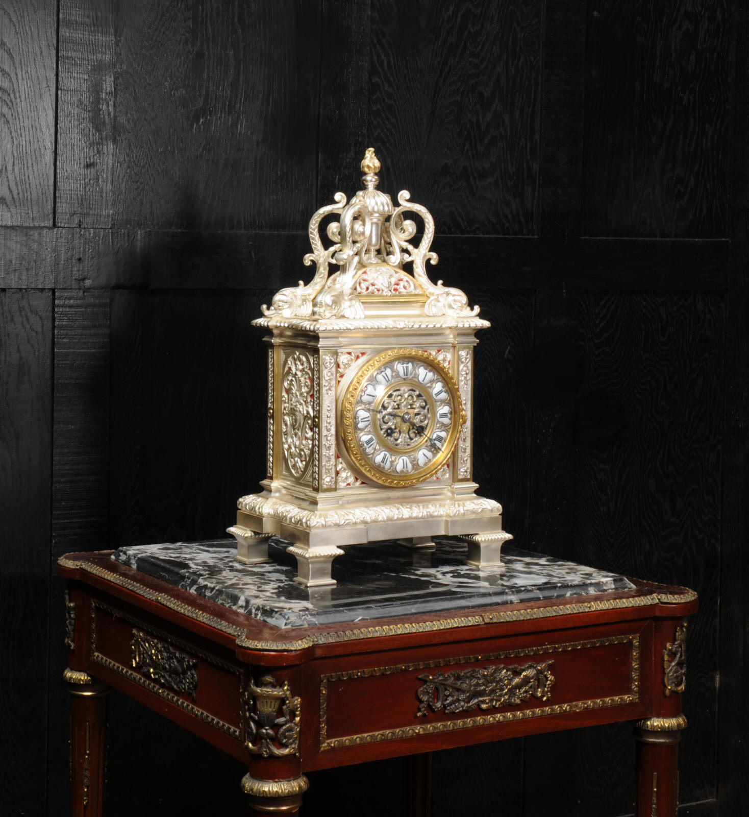 The dial is heavily cast in bronze with an armorial motif to the centre and 12 porcelain enamel cartouche letters. It is complete with original blued steel hands and convex glass. The French movement is by Japy Frères and is of high quality. It is in excellent clean and running condition with original pendulum. It runs for 8 days and strikes the hours and halves on a bell. Click the video clip below to hear the bell and watch the clock running! Condition of the case is excellent, the silvering and gild are clean and bright with only occasional discolouration and marks. The dial is also in excellent condition with no damage. The clock has previously been restored with fresh fabric fitted to the sound frets.