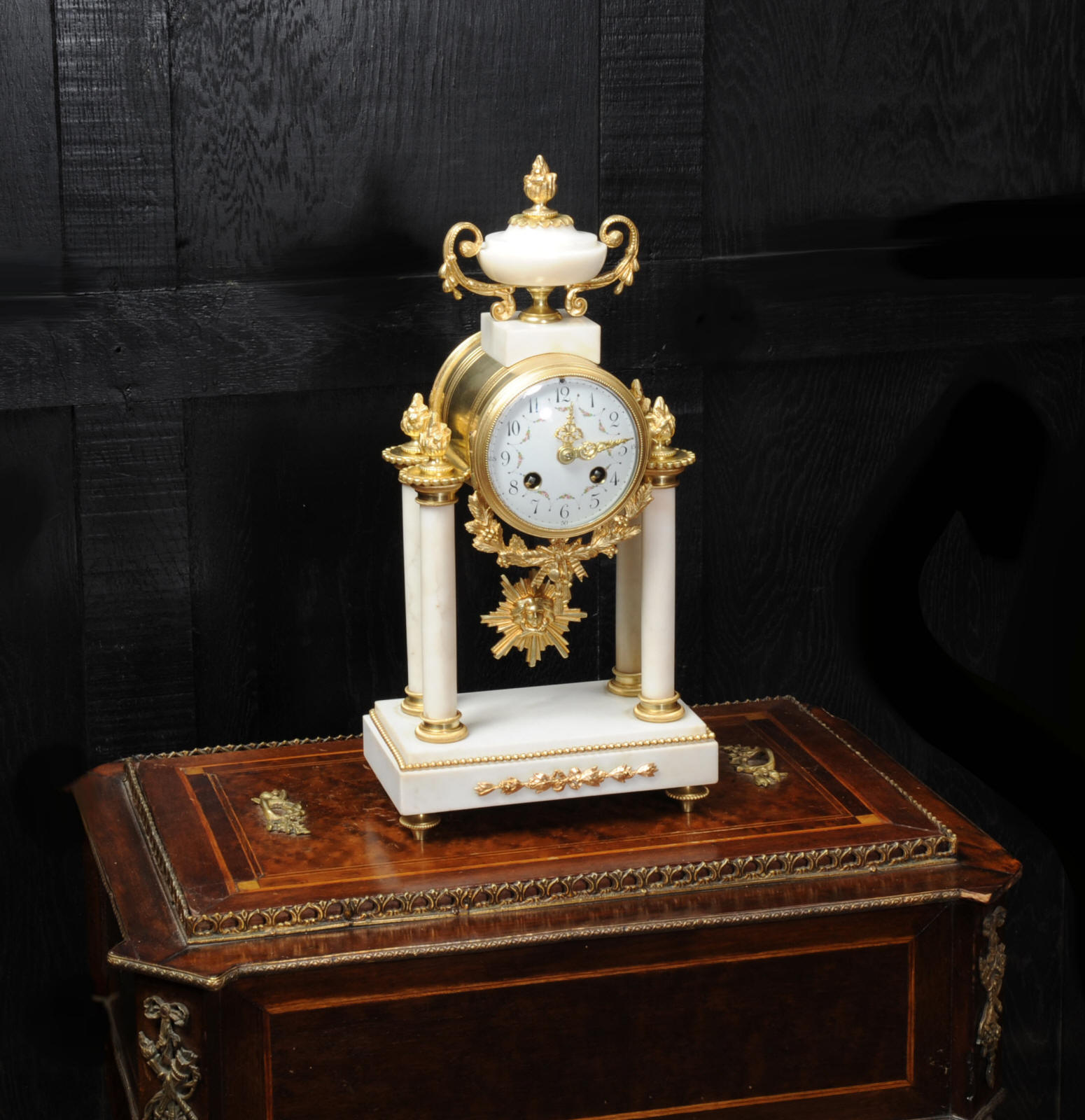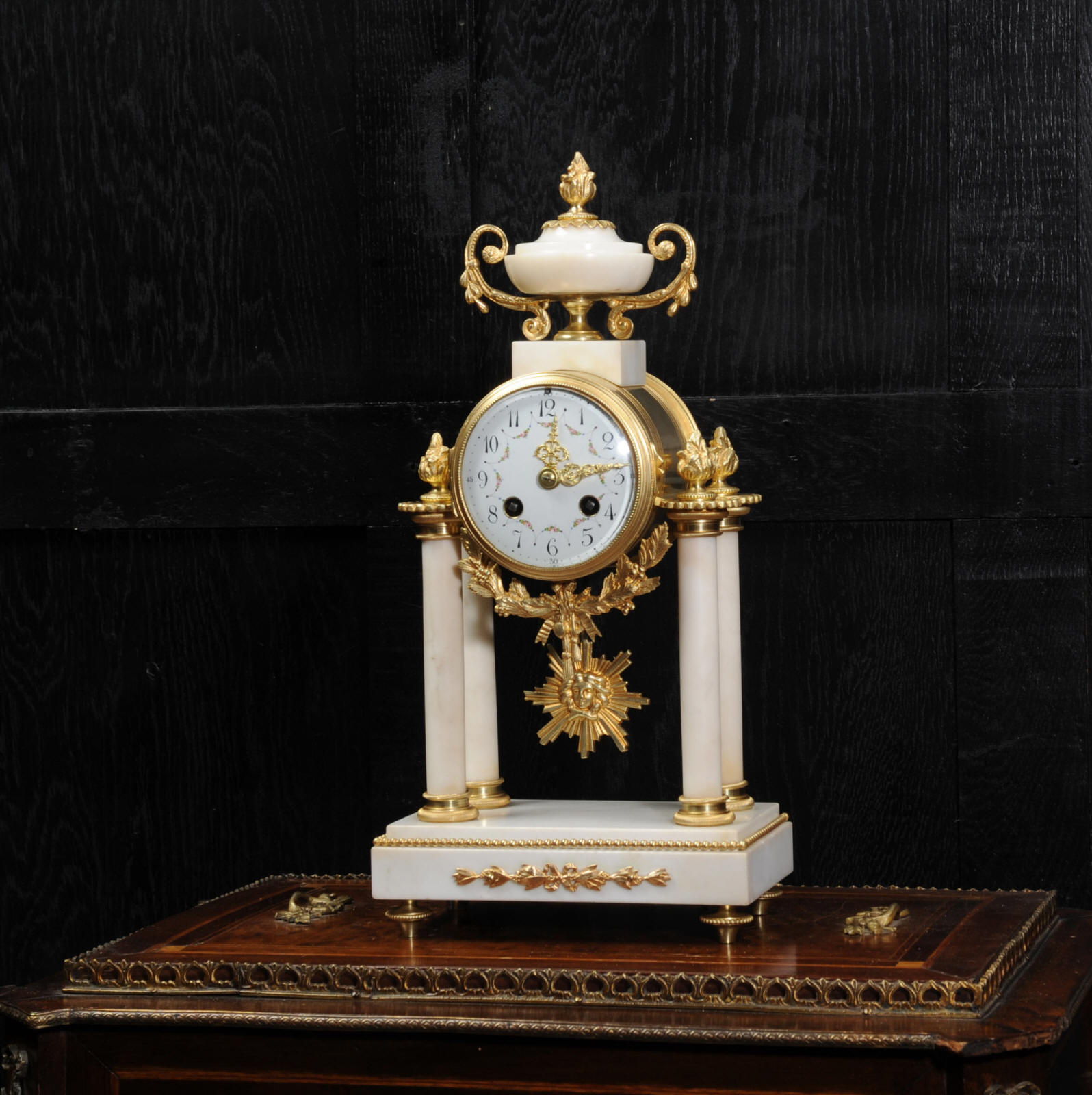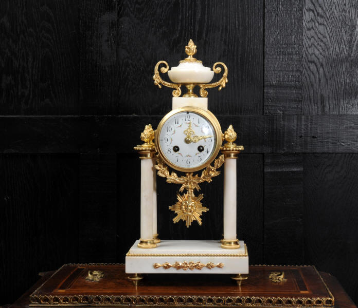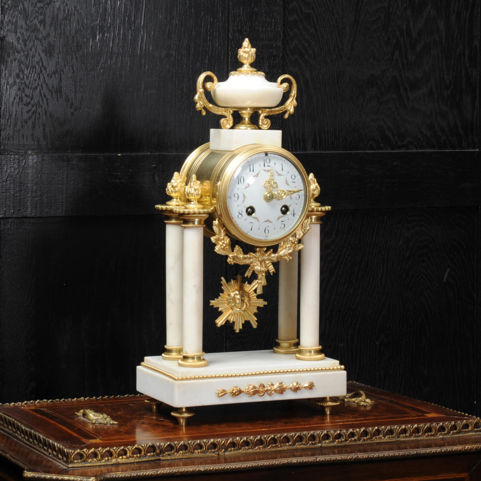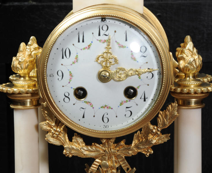 The dial is prettily painted with floral swags between the numbers on porcelain enamel. It is complete with it's original finely fretted gilt brass hands. The French movement is by Japy Freres and is of high quality. It is in excellent clean and running condition having been fully overhauled by our clockmaker. Pendulum is original with blued steel shaft and ormolu sunburst. It runs for 8 days and strikes the hours and halves on a bell. Click the video clip below to hear the bell and watch the clock running! Condition of the ormolu is excellent, beautifully clean and bright some slight discolouration and wear. The dial is also in excellent condition. Marble has some discolouration and nibbles to the edges.