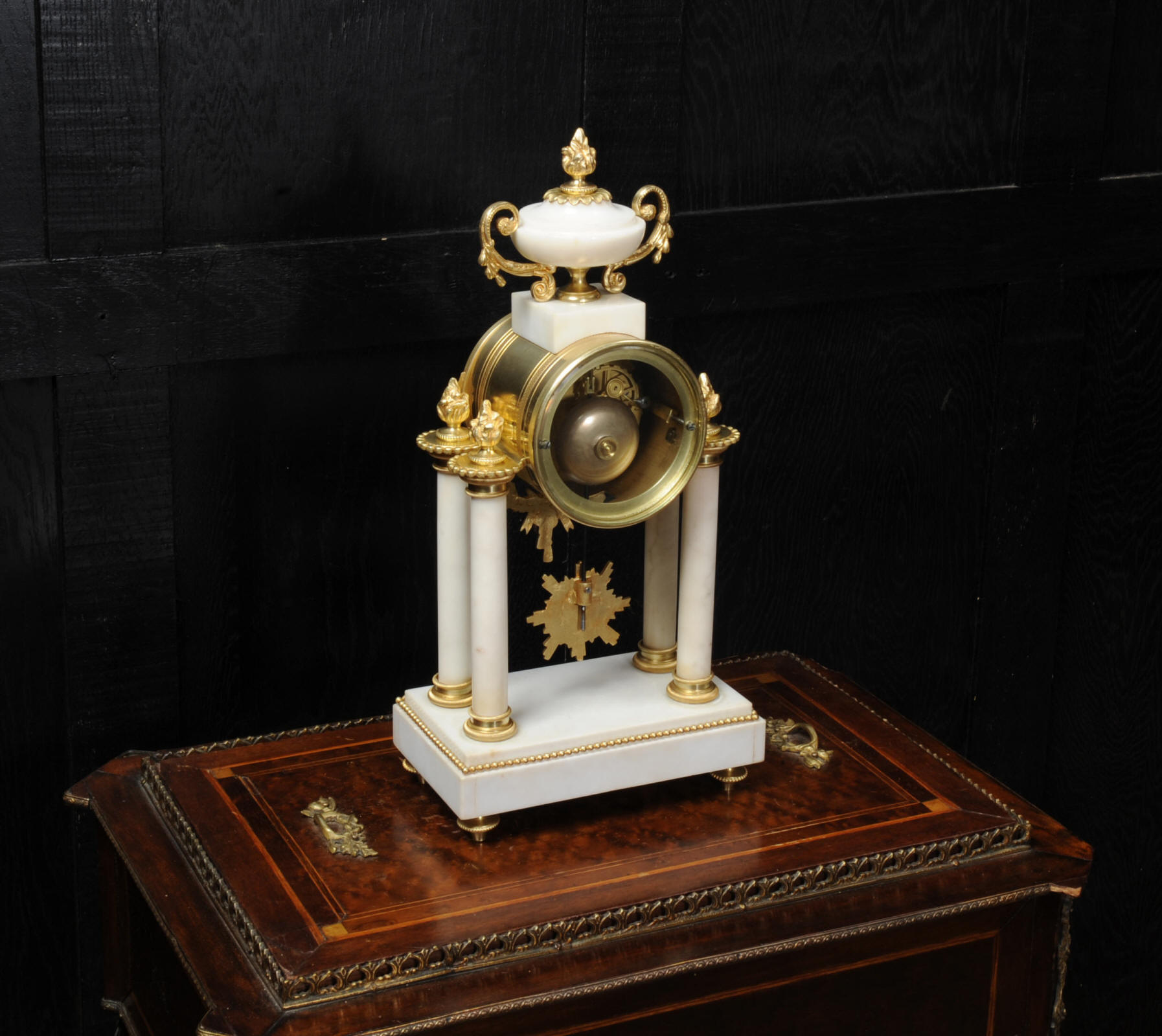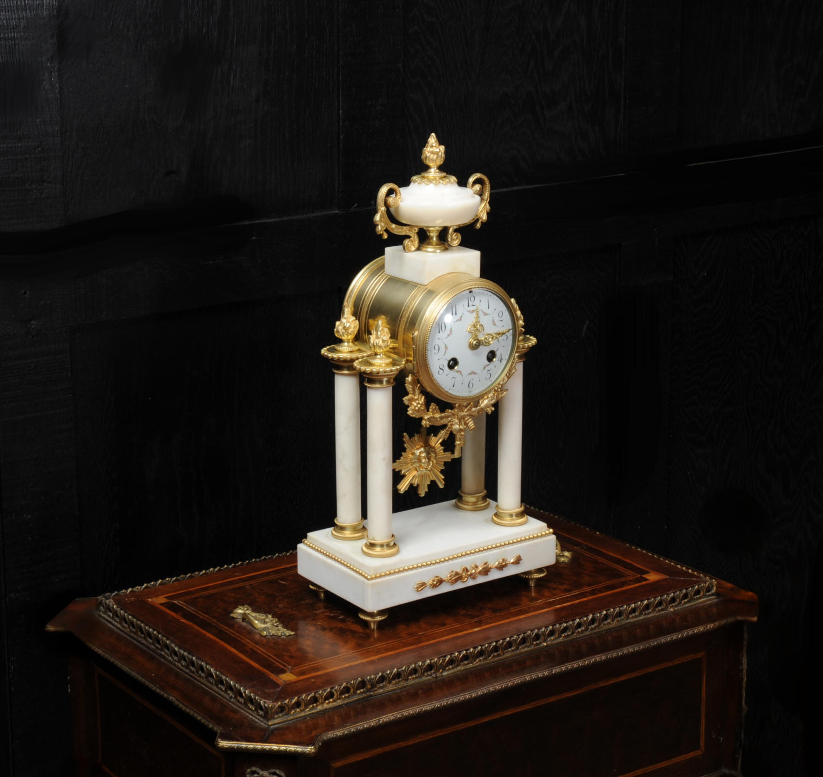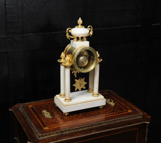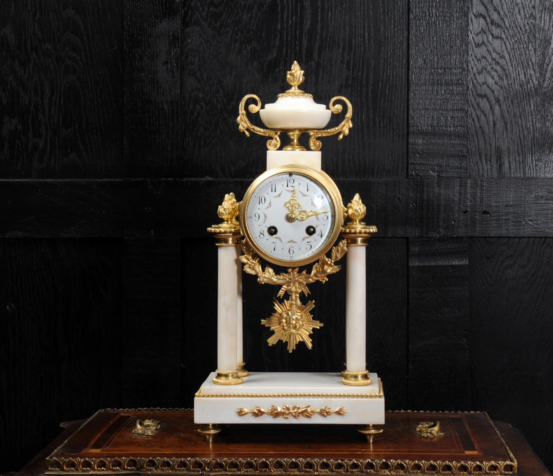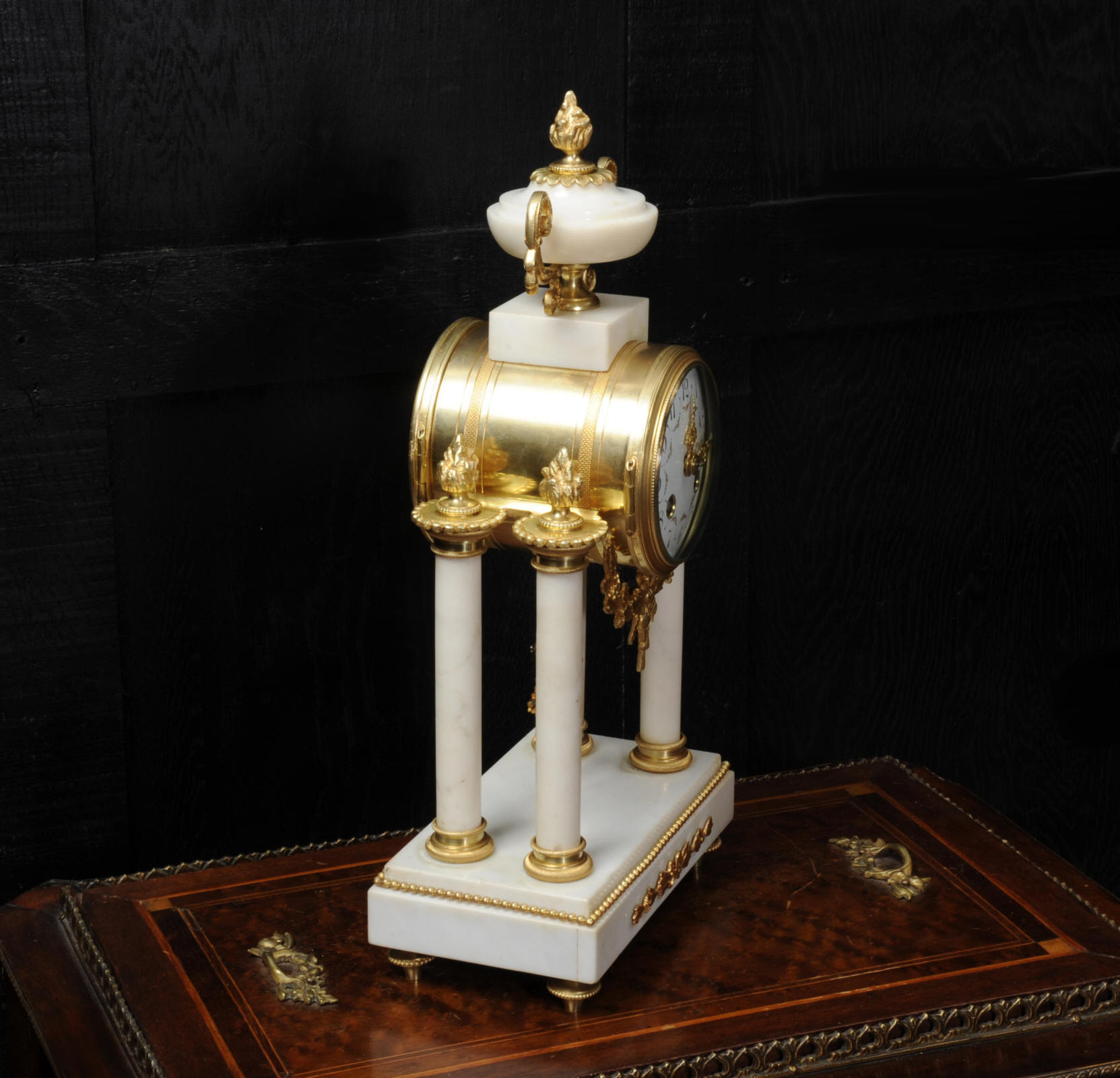 The dial is prettily painted with floral swags between the numbers on porcelain enamel. It is complete with it's original finely fretted gilt brass hands. The French movement is by Japy Freres and is of high quality. It is in excellent clean and running condition having been fully overhauled by our clockmaker. Pendulum is original with blued steel shaft and ormolu sunburst. It runs for 8 days and strikes the hours and halves on a bell. Click the video clip below to hear the bell and watch the clock running! Condition of the ormolu is excellent, beautifully clean and bright some slight discolouration and wear. The dial is also in excellent condition. Marble has some discolouration and nibbles to the edges.