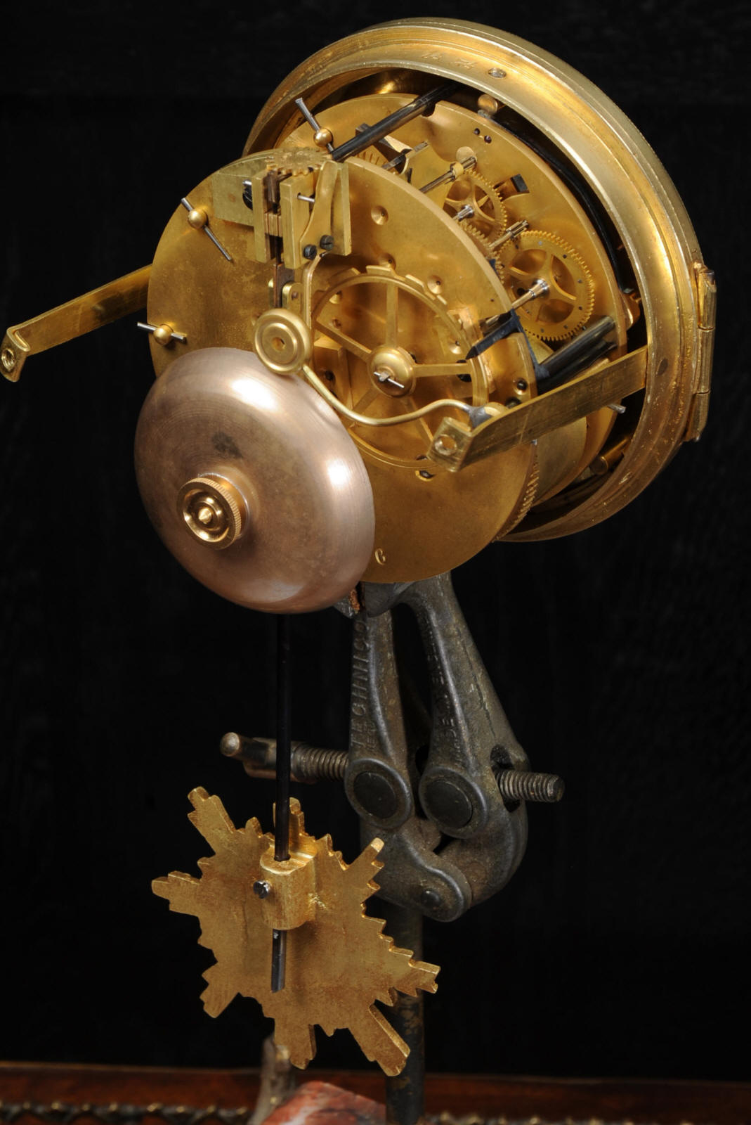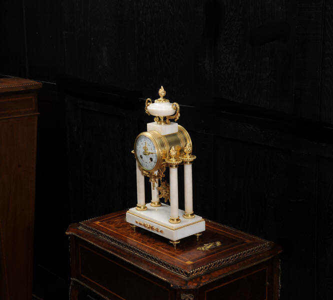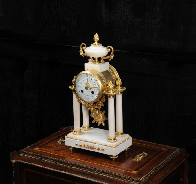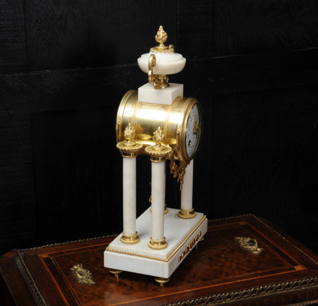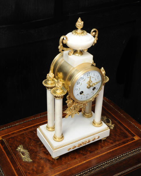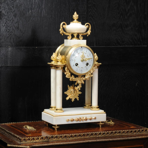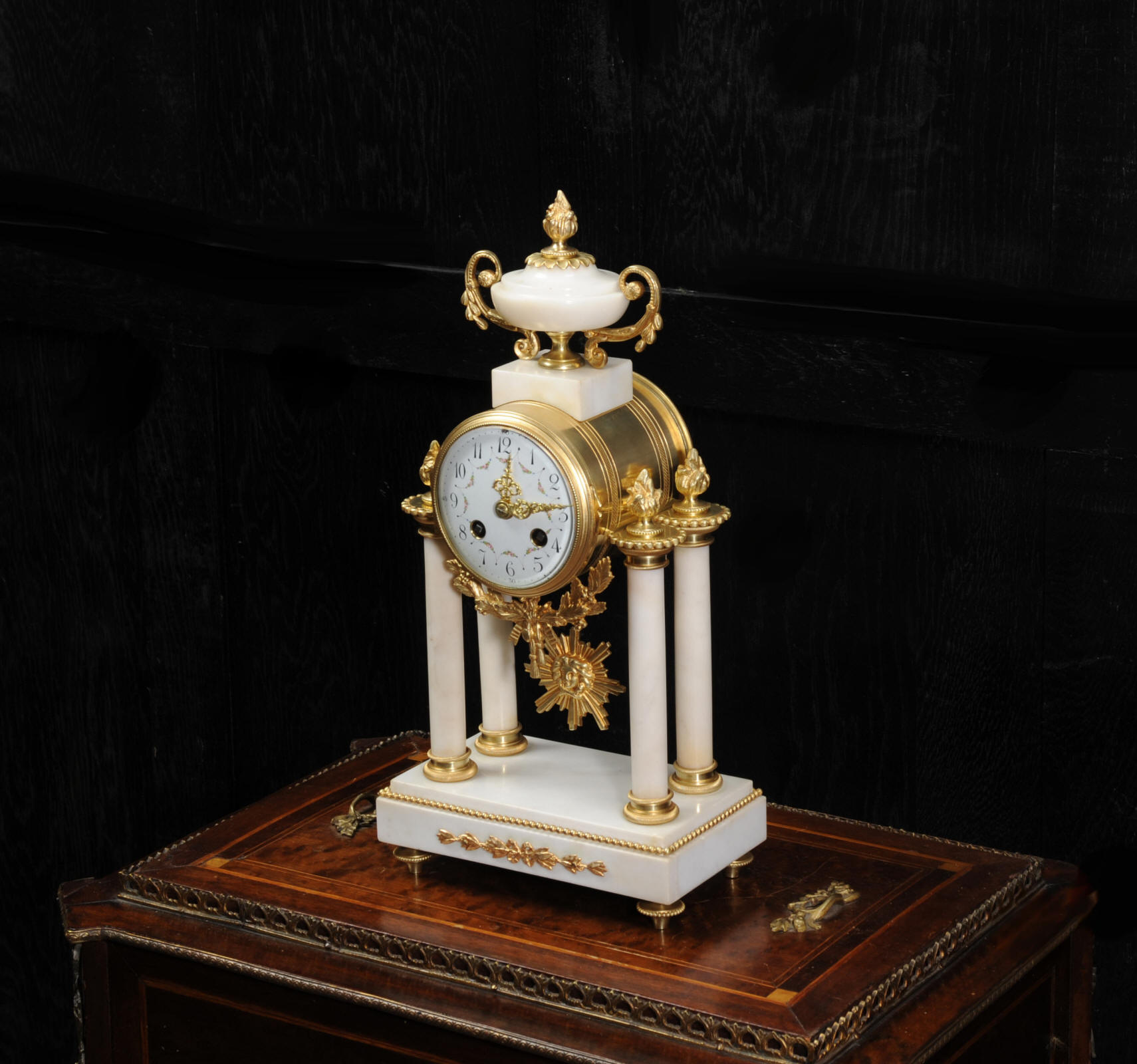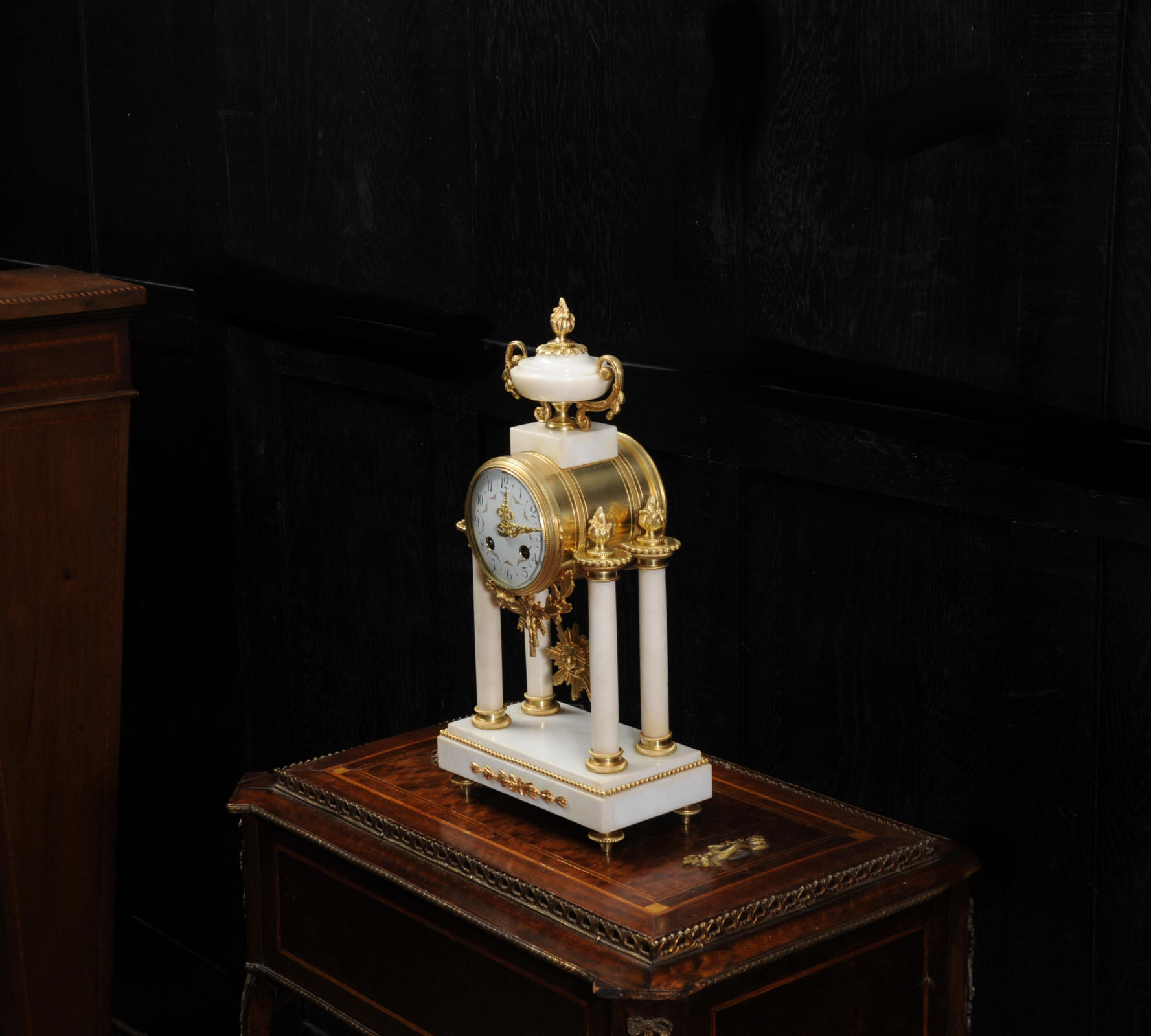The dial is prettily painted with floral swags between the numbers on porcelain enamel. It is complete with it's original finely fretted gilt brass hands. The French movement is by Japy Freres and is of high quality. It is in excellent clean and running condition having been fully overhauled by our clockmaker. Pendulum is original with blued steel shaft and ormolu sunburst. It runs for 8 days and strikes the hours and halves on a bell. Click the video clip below to hear the bell and watch the clock running! Condition of the ormolu is excellent, beautifully clean and bright some slight discolouration and wear. The dial is also in excellent condition. Marble has some discolouration and nibbles to the edges.
