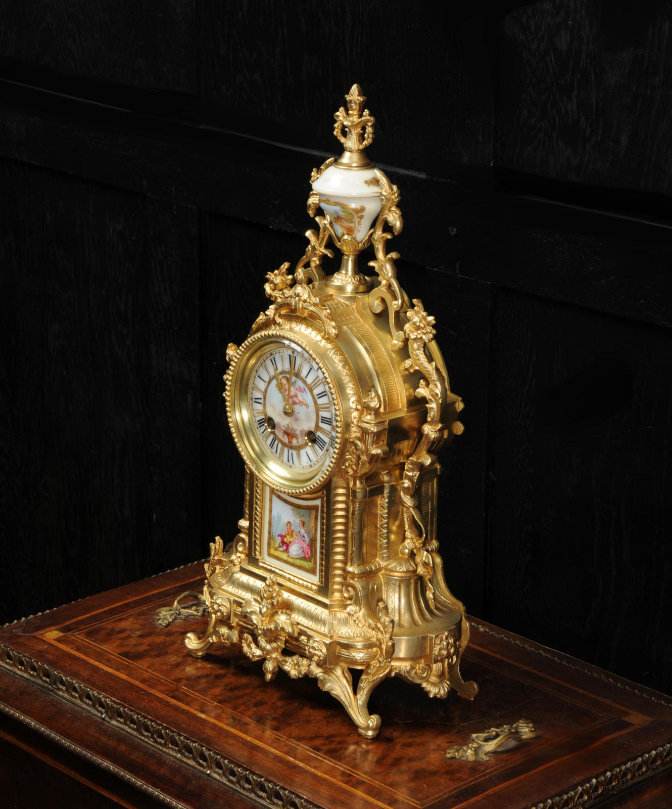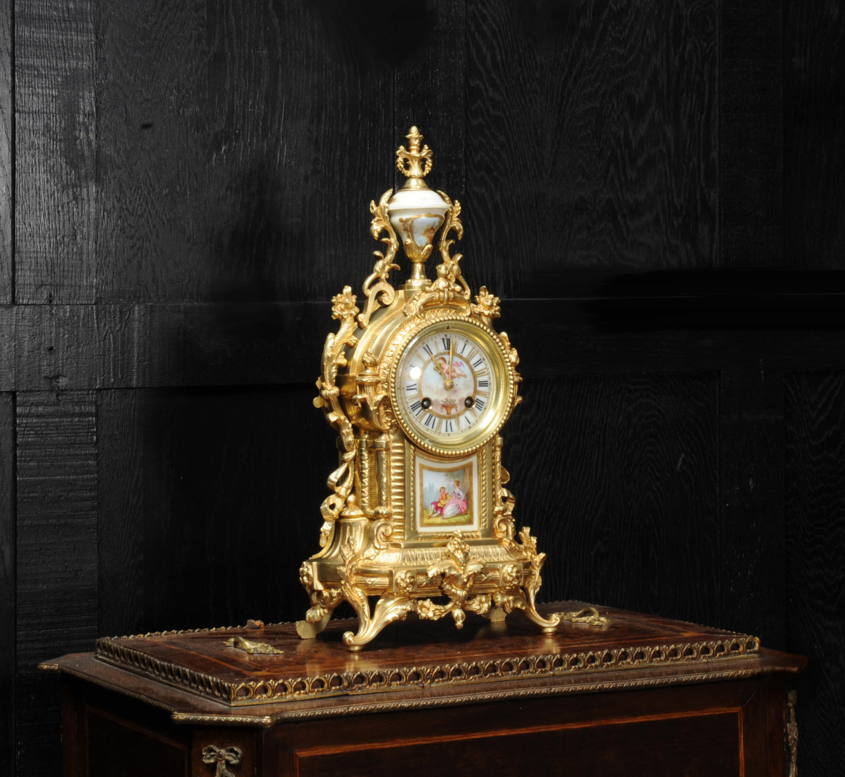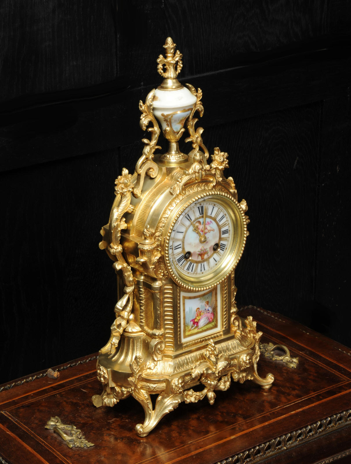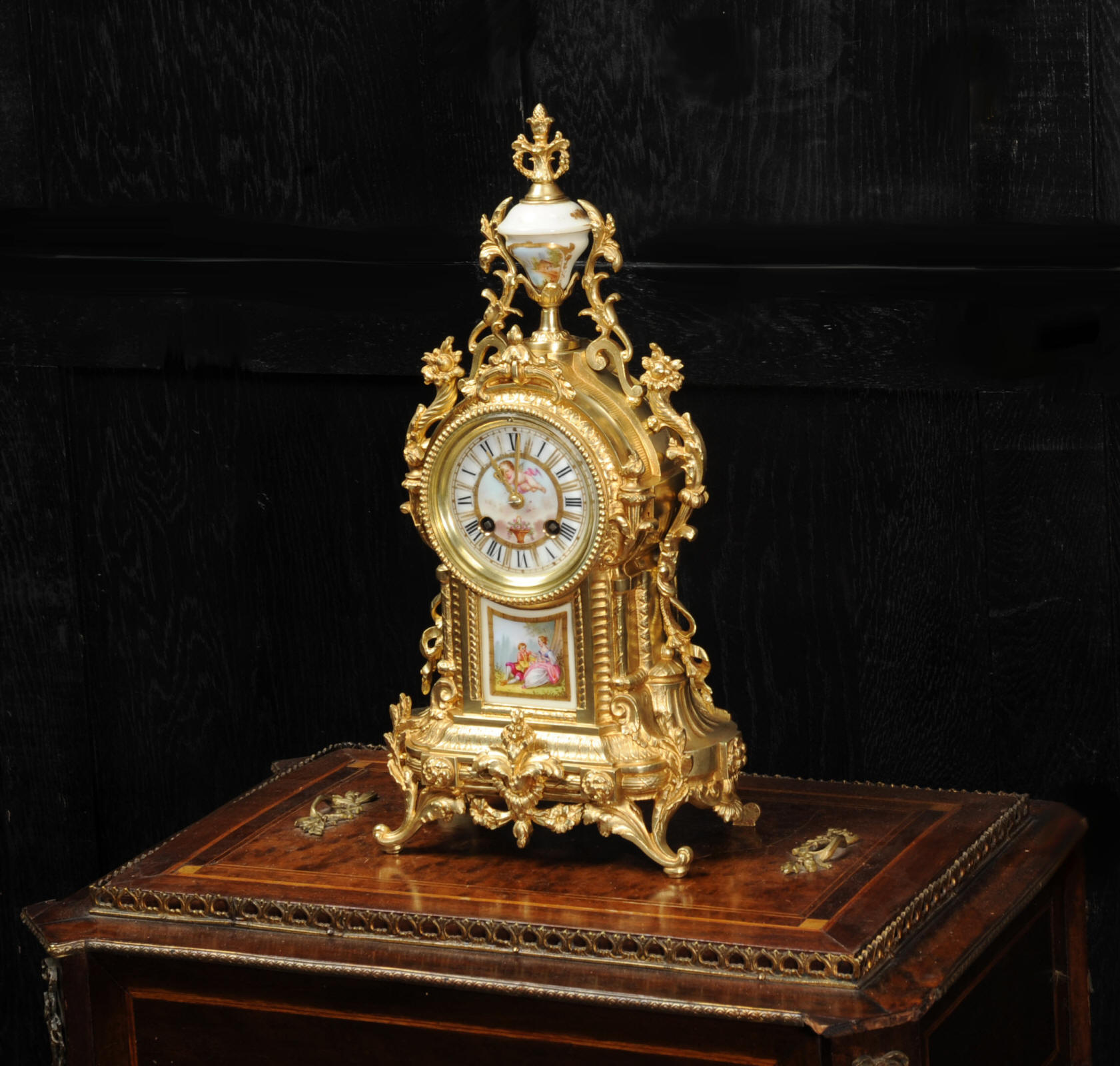 The clock has a porcelain dial featuring a cherub with a basket of flowers and beneath this is a delicately painted scene of a young couple. To the top of the clock is a porcelain urn delicately painted with a country scene. The rear door is glazed with frosted glass. The French movement is by Samuel Marti and has the makers mark on the backplate. It is of high quality as expected and is in excellent clean and running condition having been fully overhauled by our clockmaker. Pendulum is an old replacement. It runs for 8 days and strikes the hours and halves on a bell. Click the video clip below to hear the bell and watch the clock running! Condition of the case is excellent, the original gilding is beautifully clean and bright with hardly any wear or discolouration and there are no losses. Porcelain is in very good condition with just some rubbing to the over-glaze gilt decoration and the occasional mark.