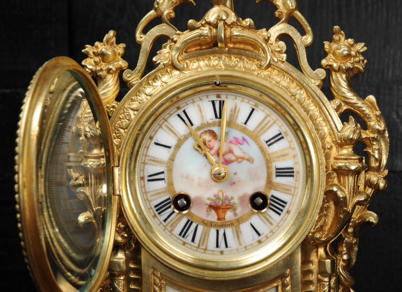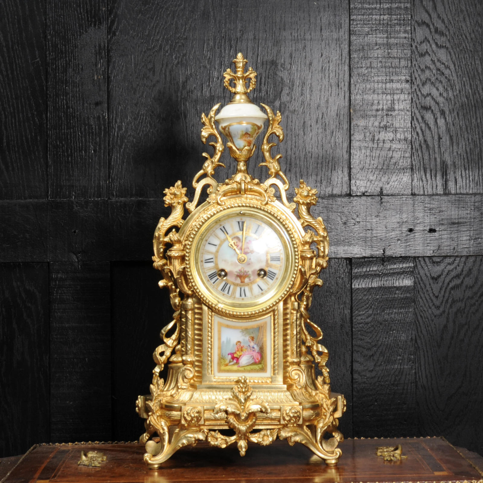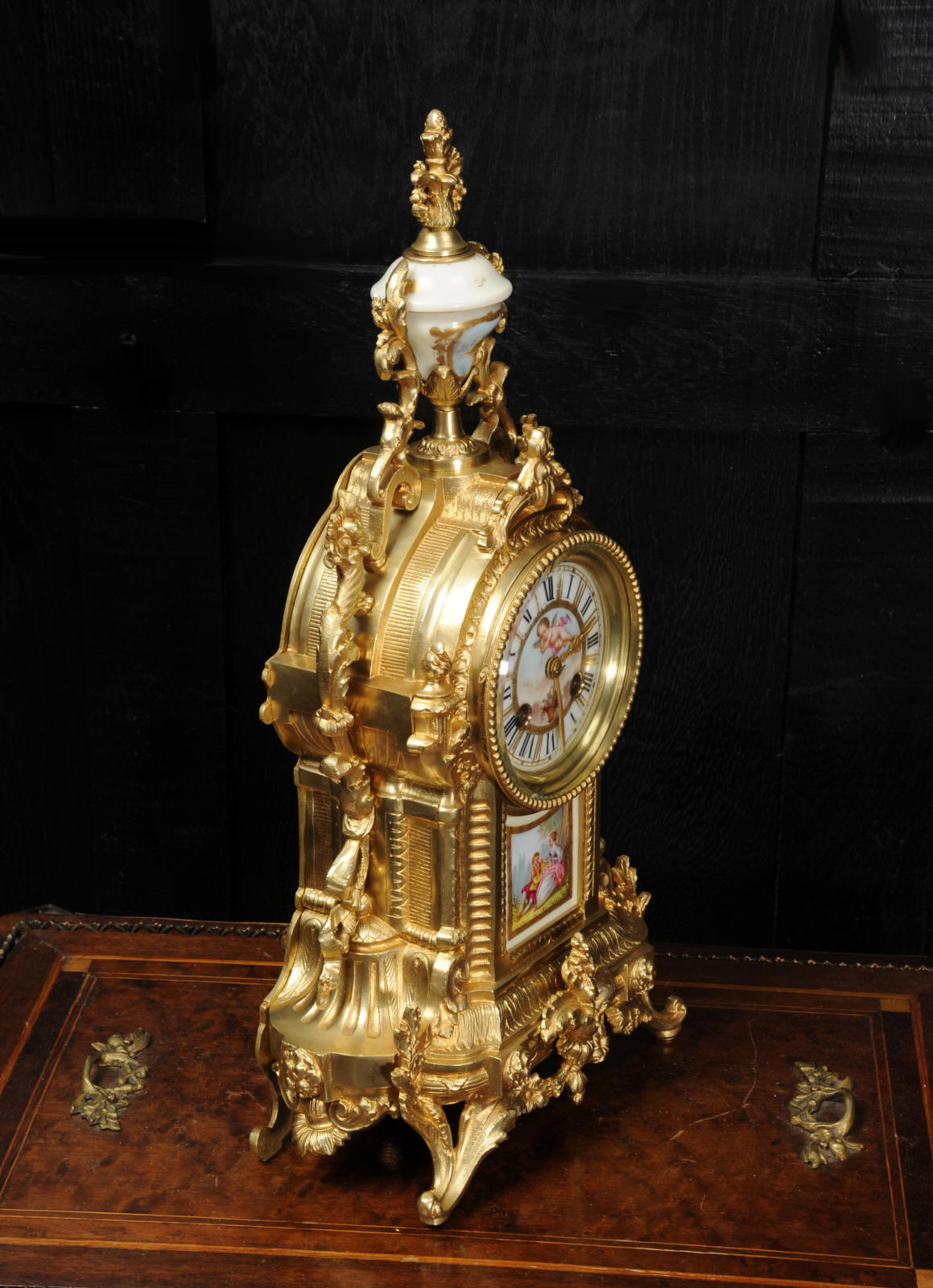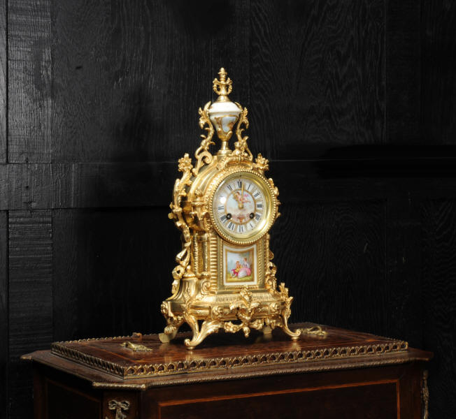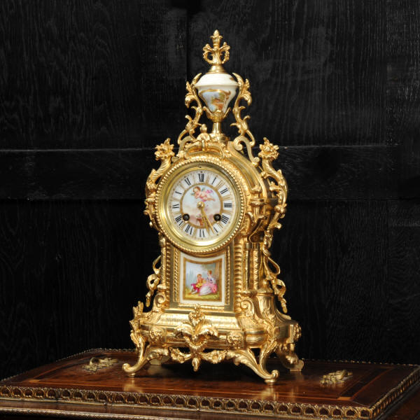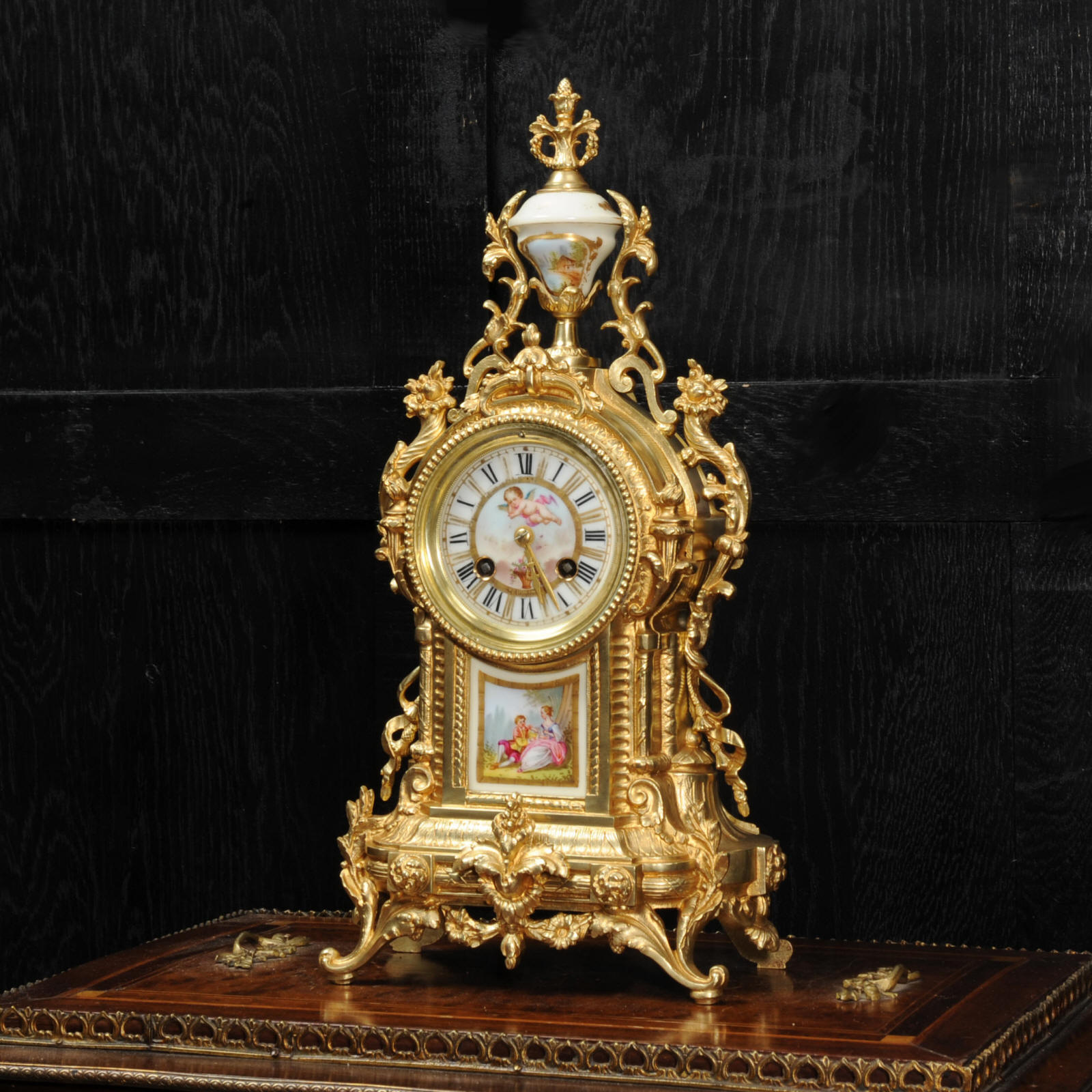 The clock has a porcelain dial featuring a cherub with a basket of flowers and beneath this is a delicately painted scene of a young couple. To the top of the clock is a porcelain urn delicately painted with a country scene. The rear door is glazed with frosted glass. The French movement is by Samuel Marti and has the makers mark on the backplate. It is of high quality as expected and is in excellent clean and running condition having been fully overhauled by our clockmaker. Pendulum is an old replacement. It runs for 8 days and strikes the hours and halves on a bell. Click the video clip below to hear the bell and watch the clock running! Condition of the case is excellent, the original gilding is beautifully clean and bright with hardly any wear or discolouration and there are no losses. Porcelain is in very good condition with just some rubbing to the over-glaze gilt decoration and the occasional mark.