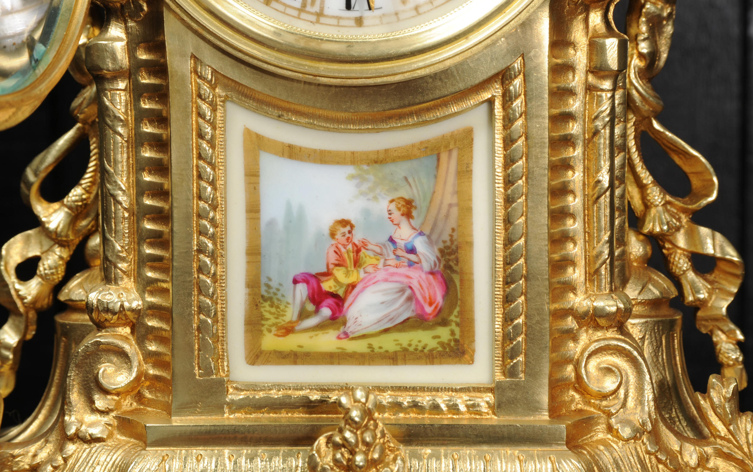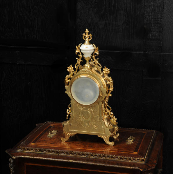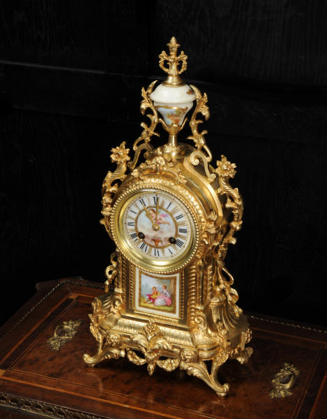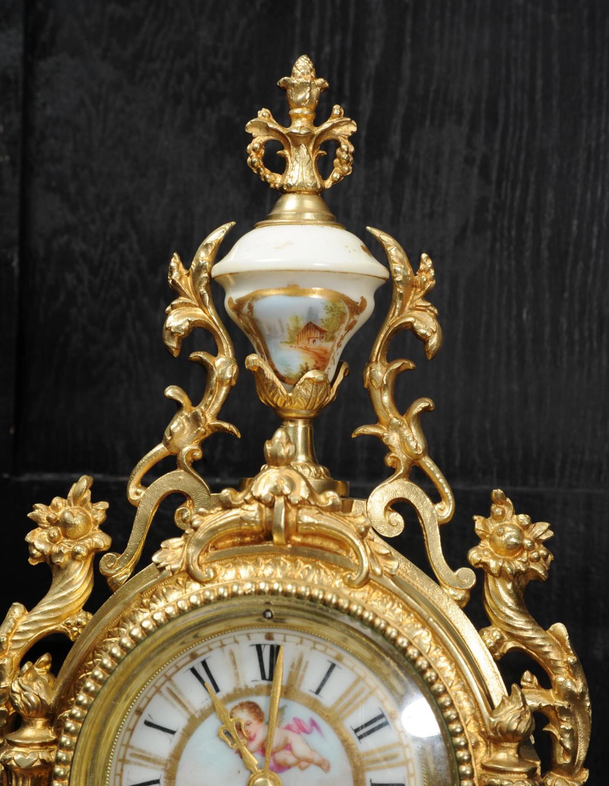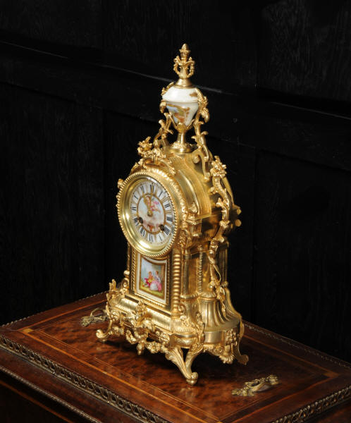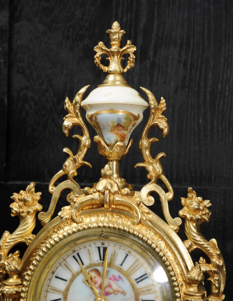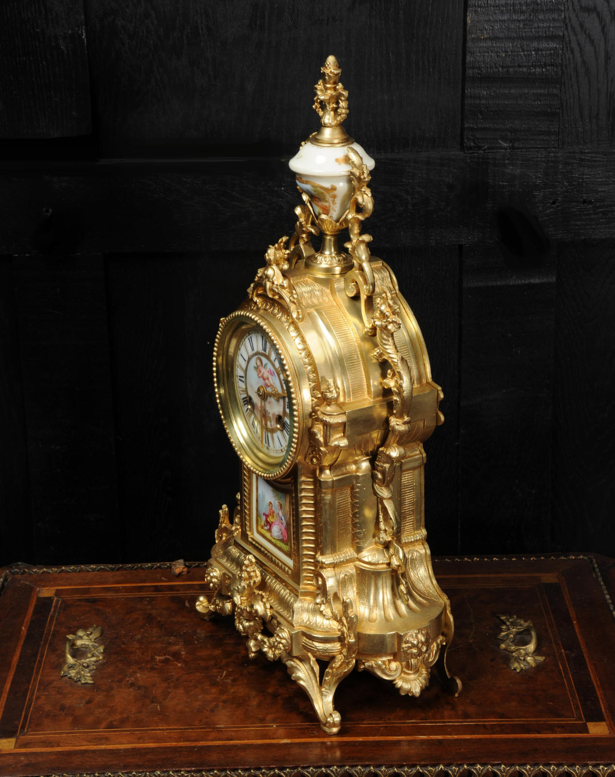 The clock has a porcelain dial featuring a cherub with a basket of flowers and beneath this is a delicately painted scene of a young couple. To the top of the clock is a porcelain urn delicately painted with a country scene. The rear door is glazed with frosted glass. The French movement is by Samuel Marti and has the makers mark on the backplate. It is of high quality as expected and is in excellent clean and running condition having been fully overhauled by our clockmaker. Pendulum is an old replacement. It runs for 8 days and strikes the hours and halves on a bell. Click the video clip below to hear the bell and watch the clock running! Condition of the case is excellent, the original gilding is beautifully clean and bright with hardly any wear or discolouration and there are no losses. Porcelain is in very good condition with just some rubbing to the over-glaze gilt decoration and the occasional mark.