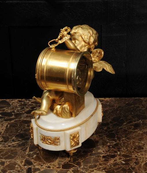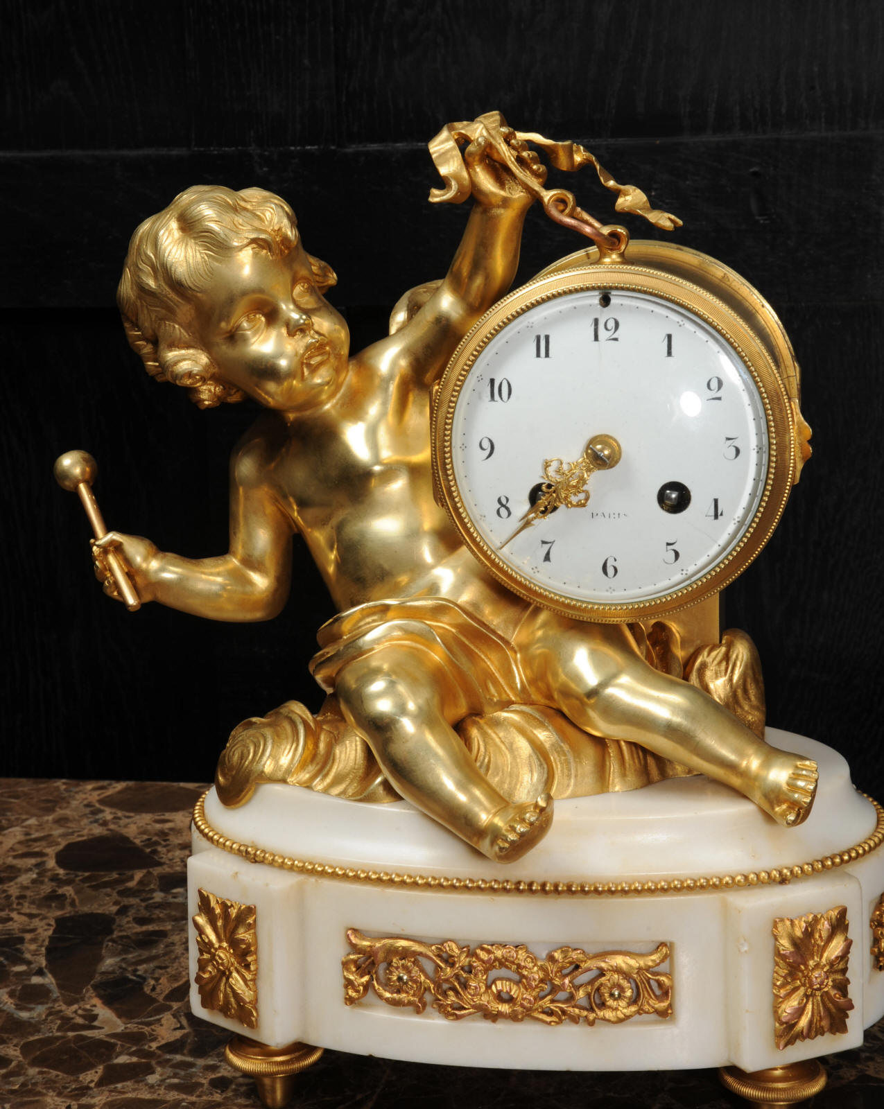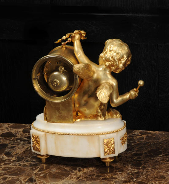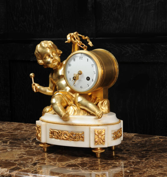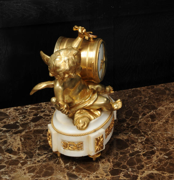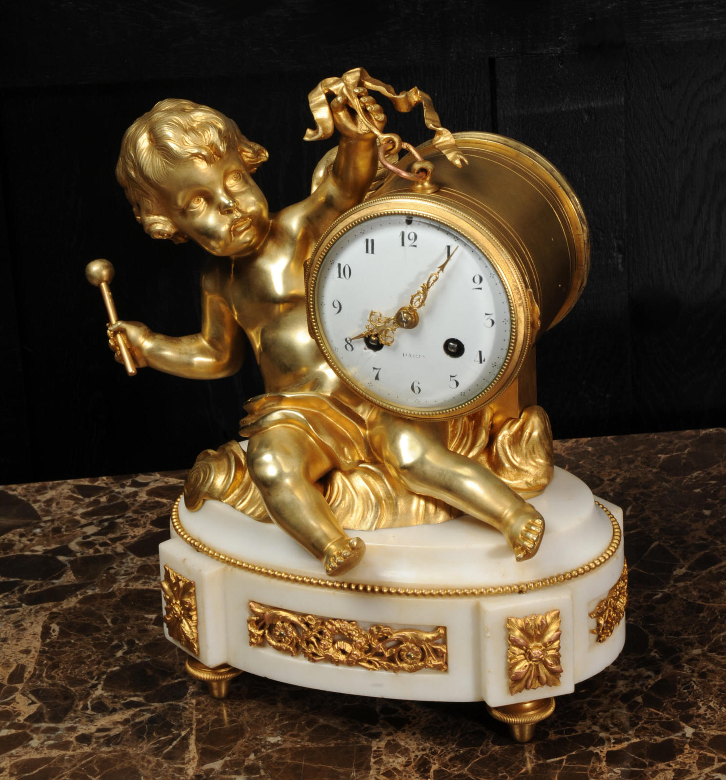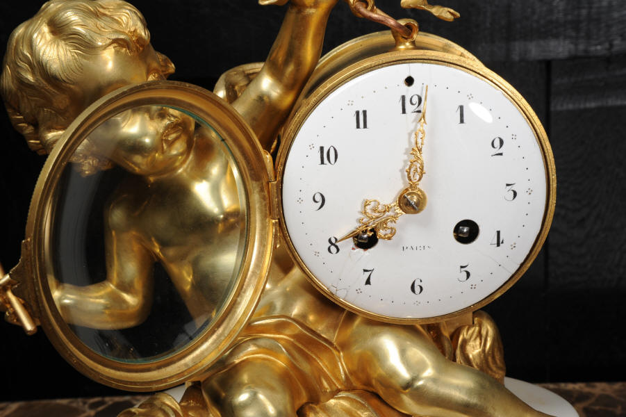 The subject of the clock is probably based on a few influences of the mid 18th century, the painting 'Children floating on the clouds' by Johann Heinrich Tishbein the Elder and also the putti paintings of François Boucher. The dial is porcelain enamel on copper with finely fretted gilt hands. The rear door is glazed to allow the movement to be seen. The French movement is of high quality, it has a platform escapement and therefore doesn't require any setting up. It and is in excellent clean and running condition having been fully overhauled by our clockmaker including fitment of a new platform for reliable running. It runs for 8 days and strikes the hours and halves on a bell. Click the video clip below to hear the bell and watch the clock running! Condition of the case is excellent, beautifully clean and bright with hardly any wear or discolouration. There is some wear/distortion to the ring on the putto's ribbon. The marble is in good condition with a few nibbles to the edges and some staining. The dial is also in good condition with some chipping / cracks next to the left hand winding hole.