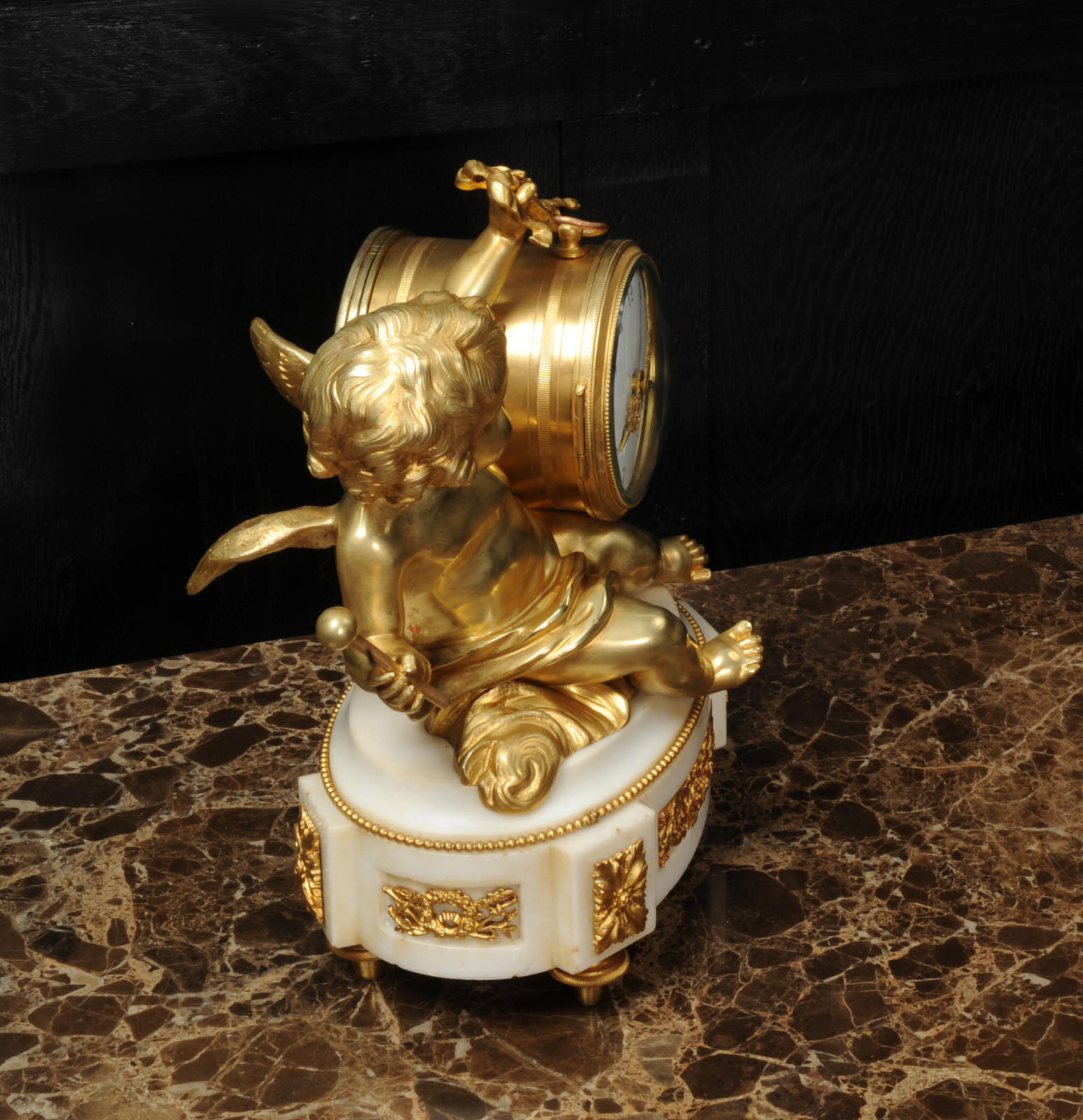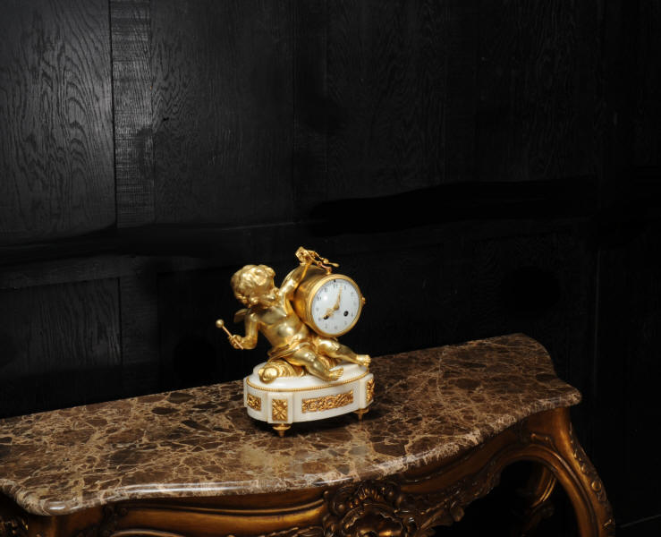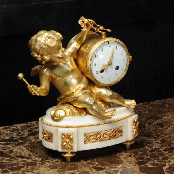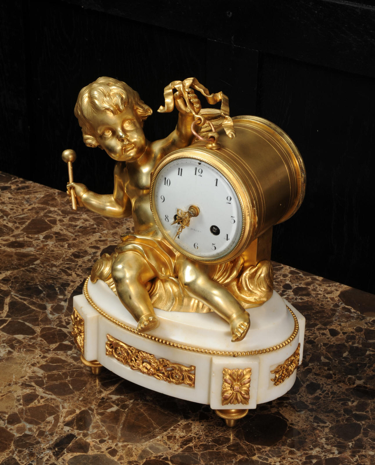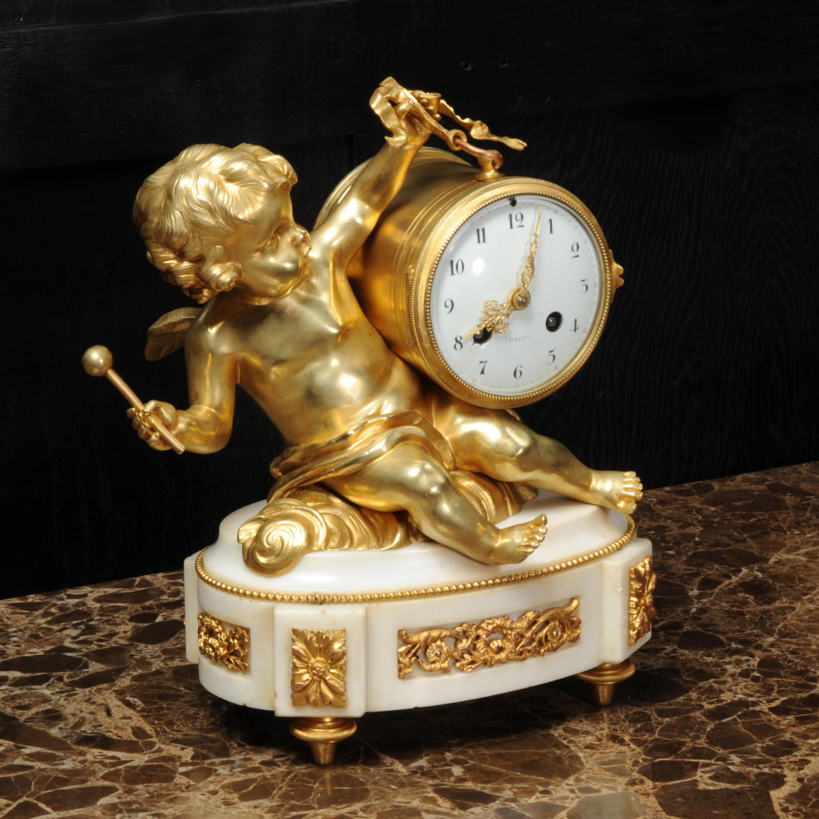 The subject of the clock is probably based on a few influences of the mid 18th century, the painting 'Children floating on the clouds' by Johann Heinrich Tishbein the Elder and also the putti paintings of François Boucher. The dial is porcelain enamel on copper with finely fretted gilt hands. The rear door is glazed to allow the movement to be seen. The French movement is of high quality, it has a platform escapement and therefore doesn't require any setting up. It and is in excellent clean and running condition having been fully overhauled by our clockmaker including fitment of a new platform for reliable running. It runs for 8 days and strikes the hours and halves on a bell. Click the video clip below to hear the bell and watch the clock running! Condition of the case is excellent, beautifully clean and bright with hardly any wear or discolouration. There is some wear/distortion to the ring on the putto's ribbon. The marble is in good condition with a few nibbles to the edges and some staining. The dial is also in good condition with some chipping / cracks next to the left hand winding hole.