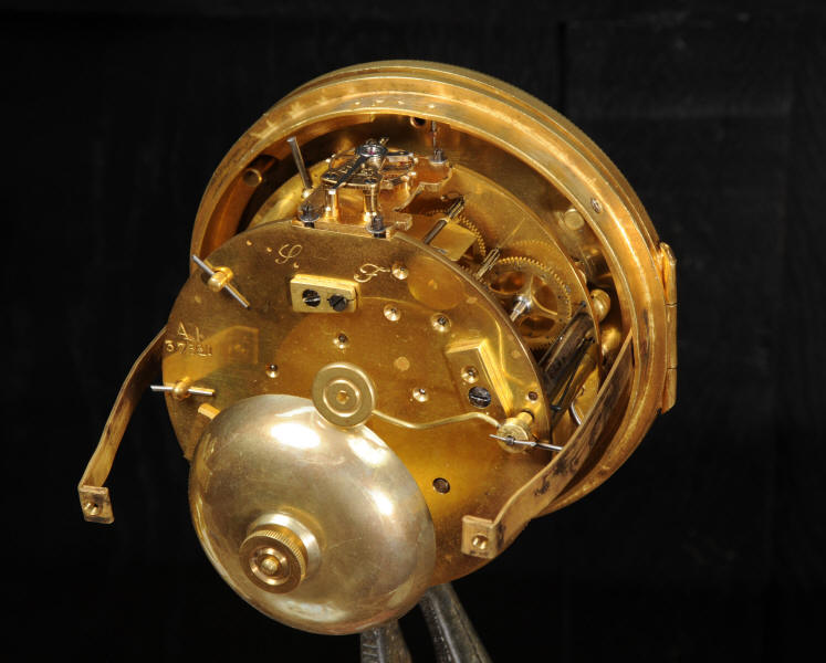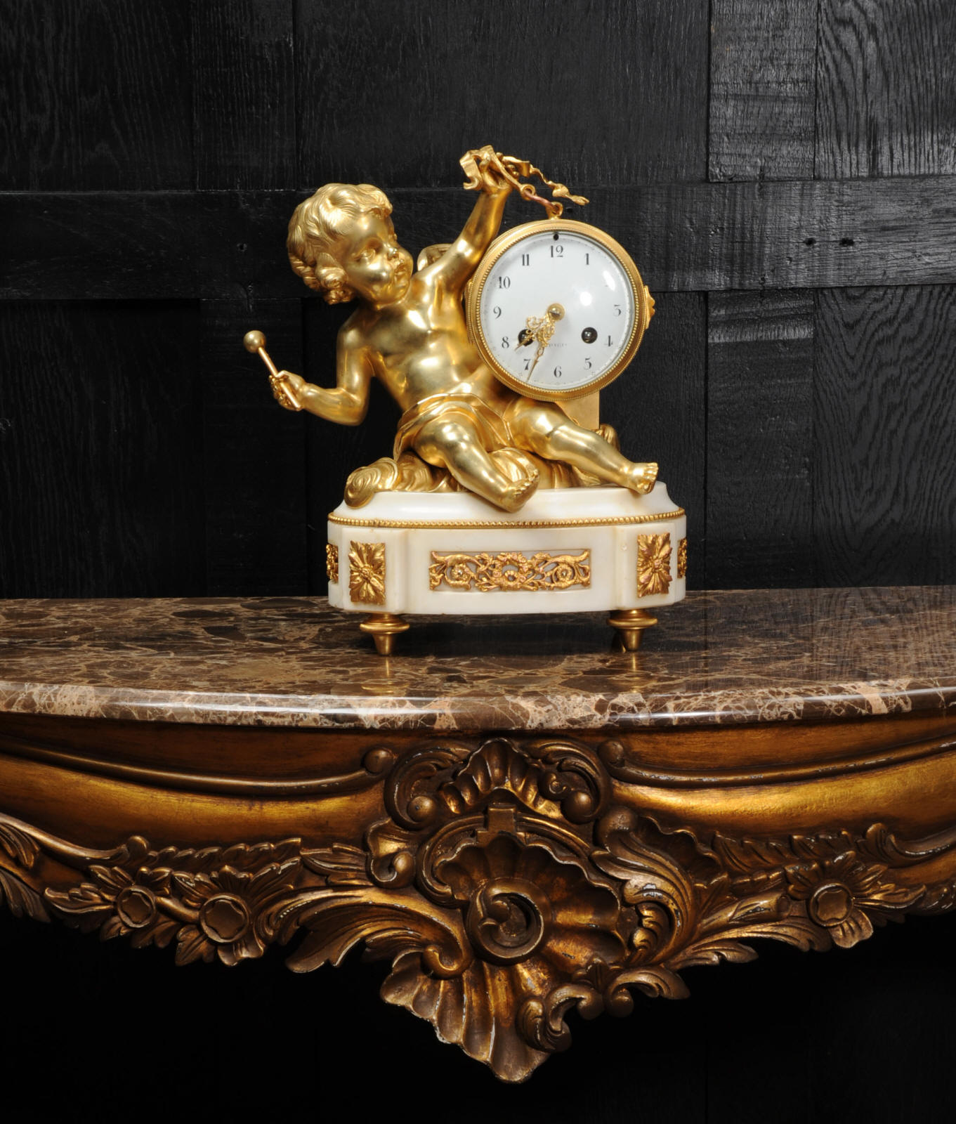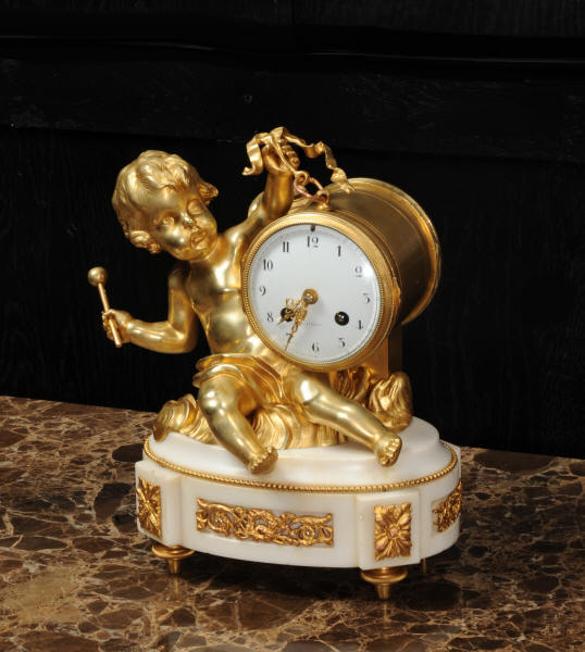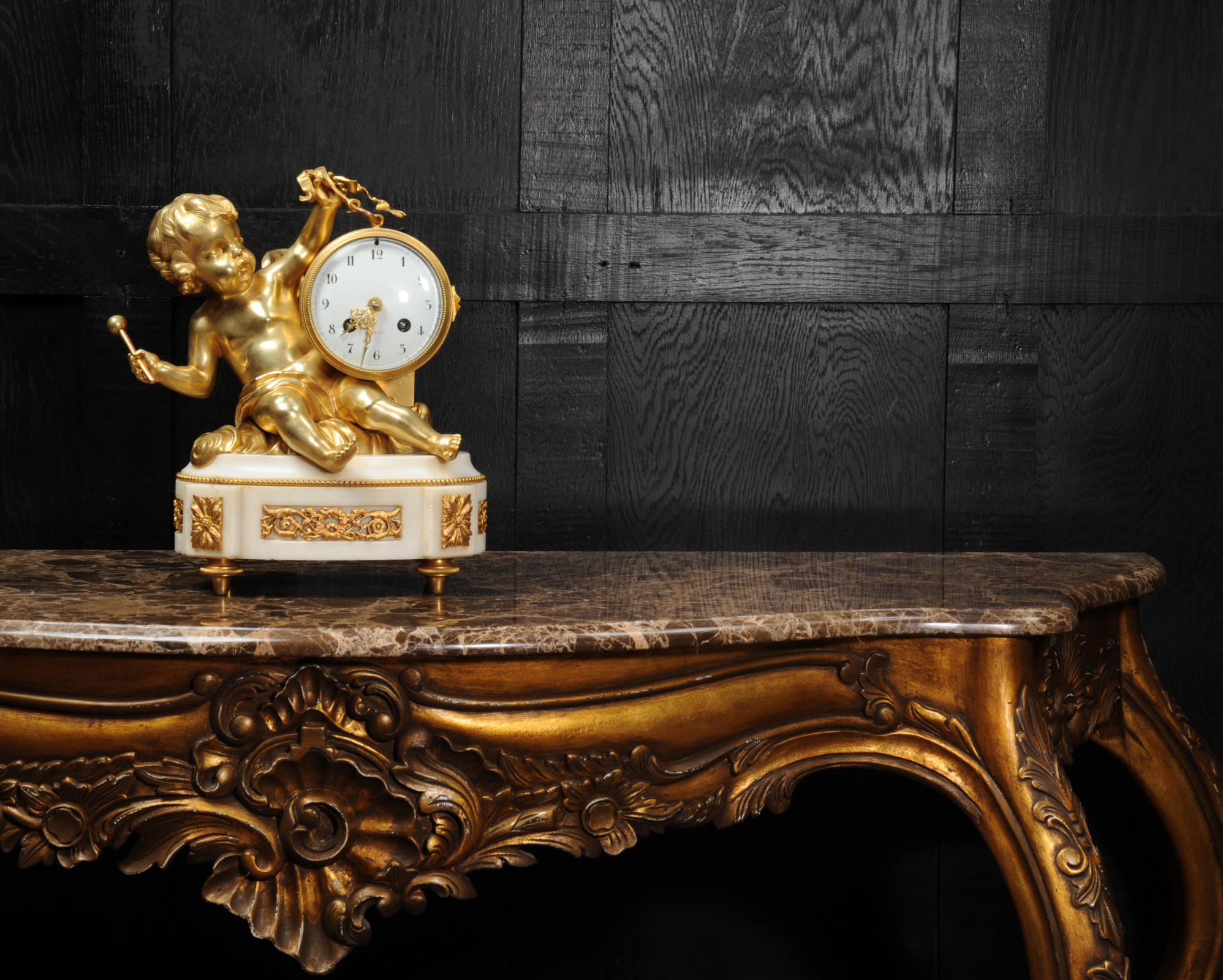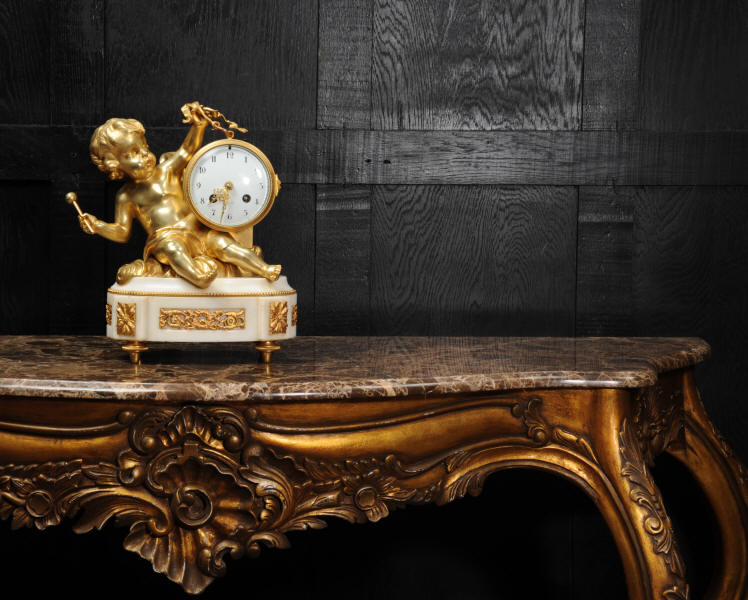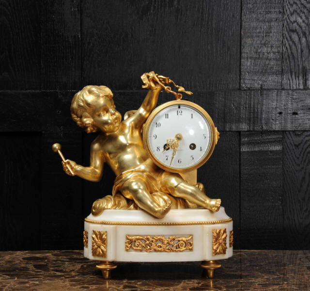 The subject of the clock is probably based on a few influences of the mid 18th century, the painting 'Children floating on the clouds' by Johann Heinrich Tishbein the Elder and also the putti paintings of François Boucher. The dial is porcelain enamel on copper with finely fretted gilt hands. The rear door is glazed to allow the movement to be seen. The French movement is of high quality, it has a platform escapement and therefore doesn't require any setting up. It and is in excellent clean and running condition having been fully overhauled by our clockmaker including fitment of a new platform for reliable running. It runs for 8 days and strikes the hours and halves on a bell. Click the video clip below to hear the bell and watch the clock running! Condition of the case is excellent, beautifully clean and bright with hardly any wear or discolouration. There is some wear/distortion to the ring on the putto's ribbon. The marble is in good condition with a few nibbles to the edges and some staining. The dial is also in good condition with some chipping / cracks next to the left hand winding hole.