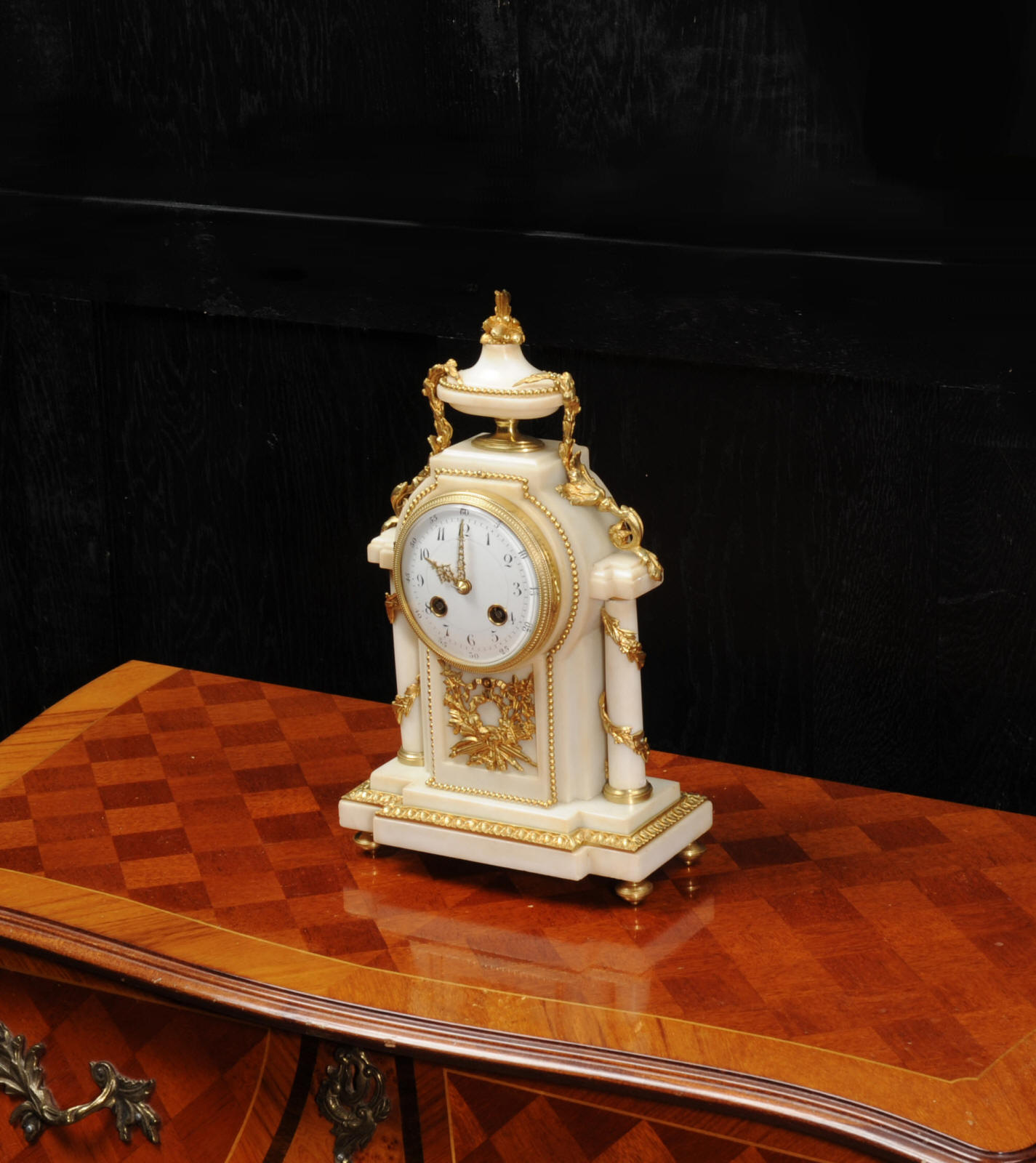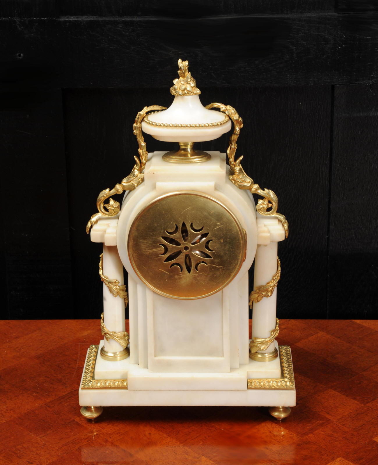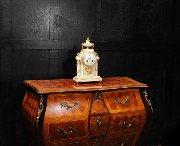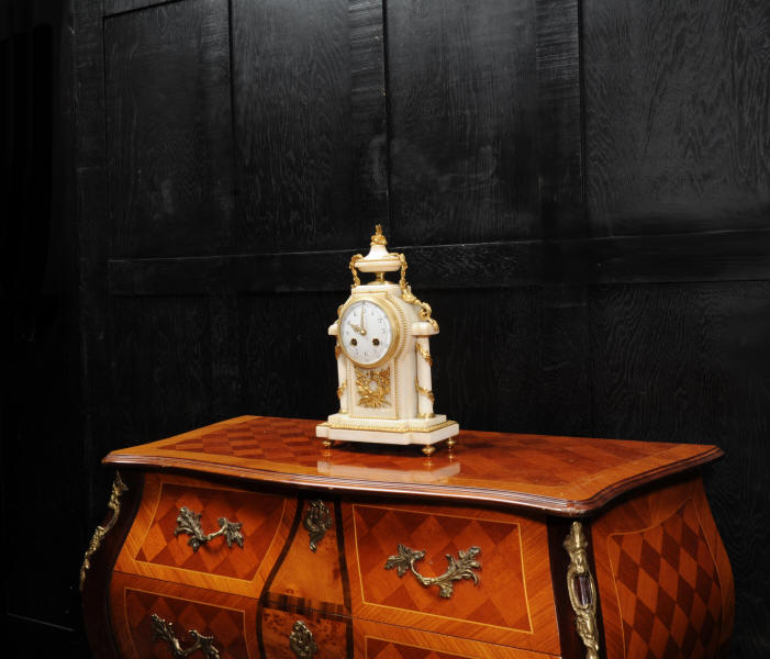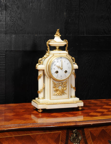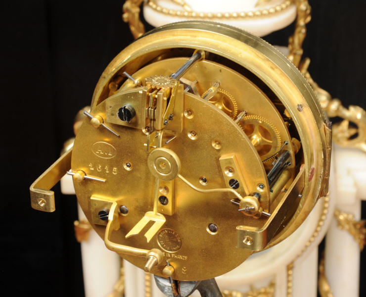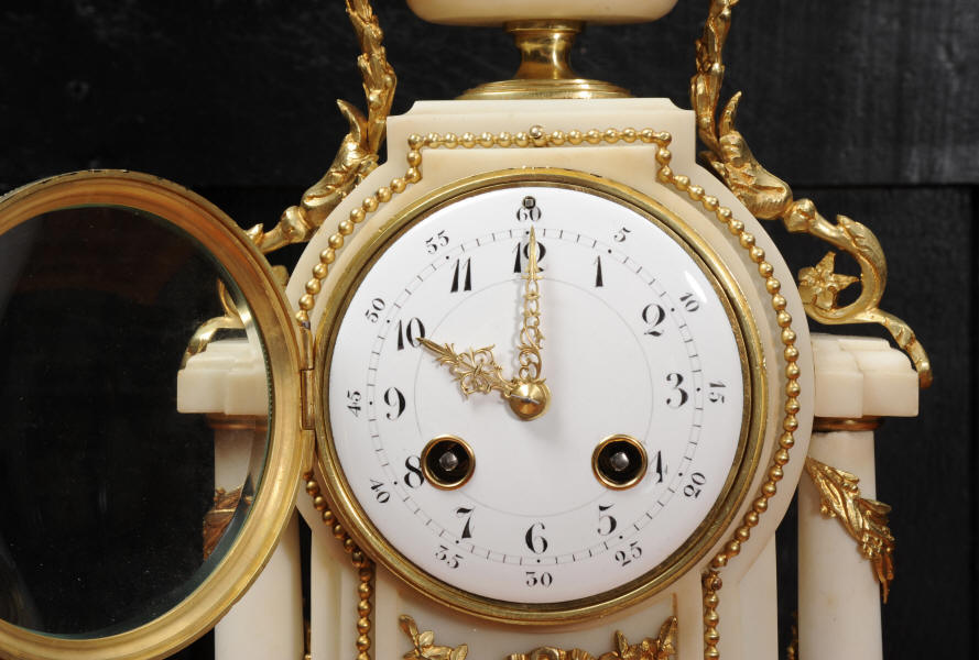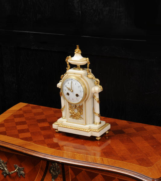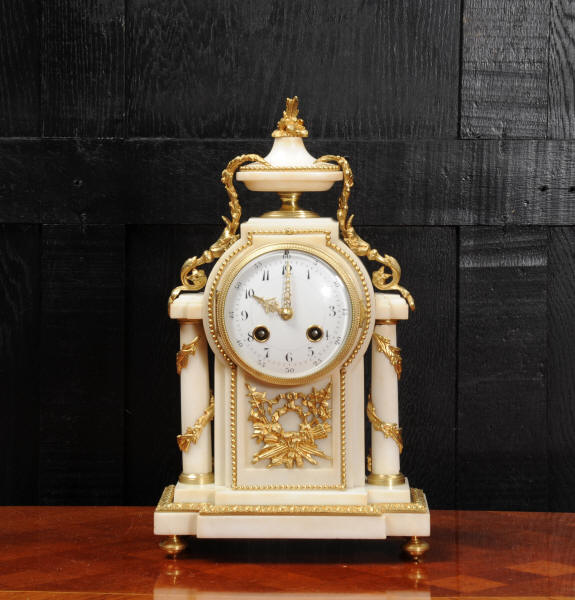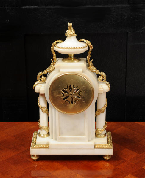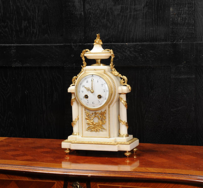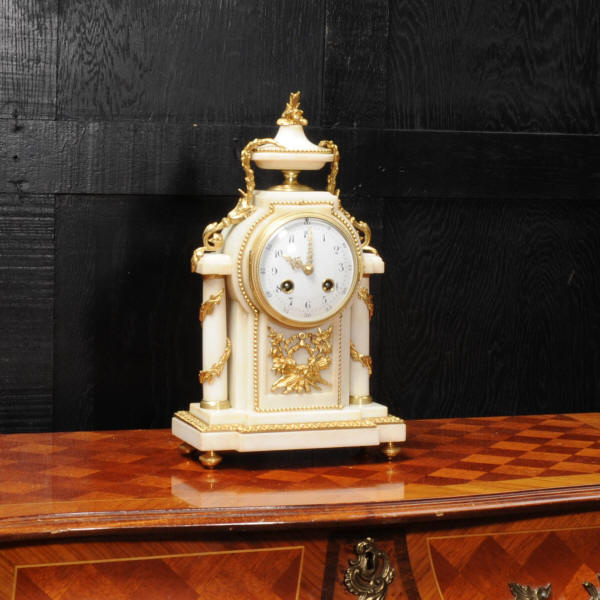 The dial porcelain enamel on copper with very finely fretted hands and convex glass. The French movement is by Samuel Marti and is of the makers usual of high quality. It is in excellent clean and running condition having been fully overhauled by our clockmaker. Pendulum is a replacement. It runs for 8 days and strikes the hours and halves on a bell. Click the video clip below to hear the bell and watch the clock running! Condition of the case is excellent, the ormolu is beautifully clean and bright with hardly any wear or discolouration. The marble is also very good with some slight nibbles to the edges. The marble has mellowed to a lovely cream-white colour with some discolouration. There is some slight chipping to the top of the columns. The dial is also in excellent condition just slight chipping around the winding hole.