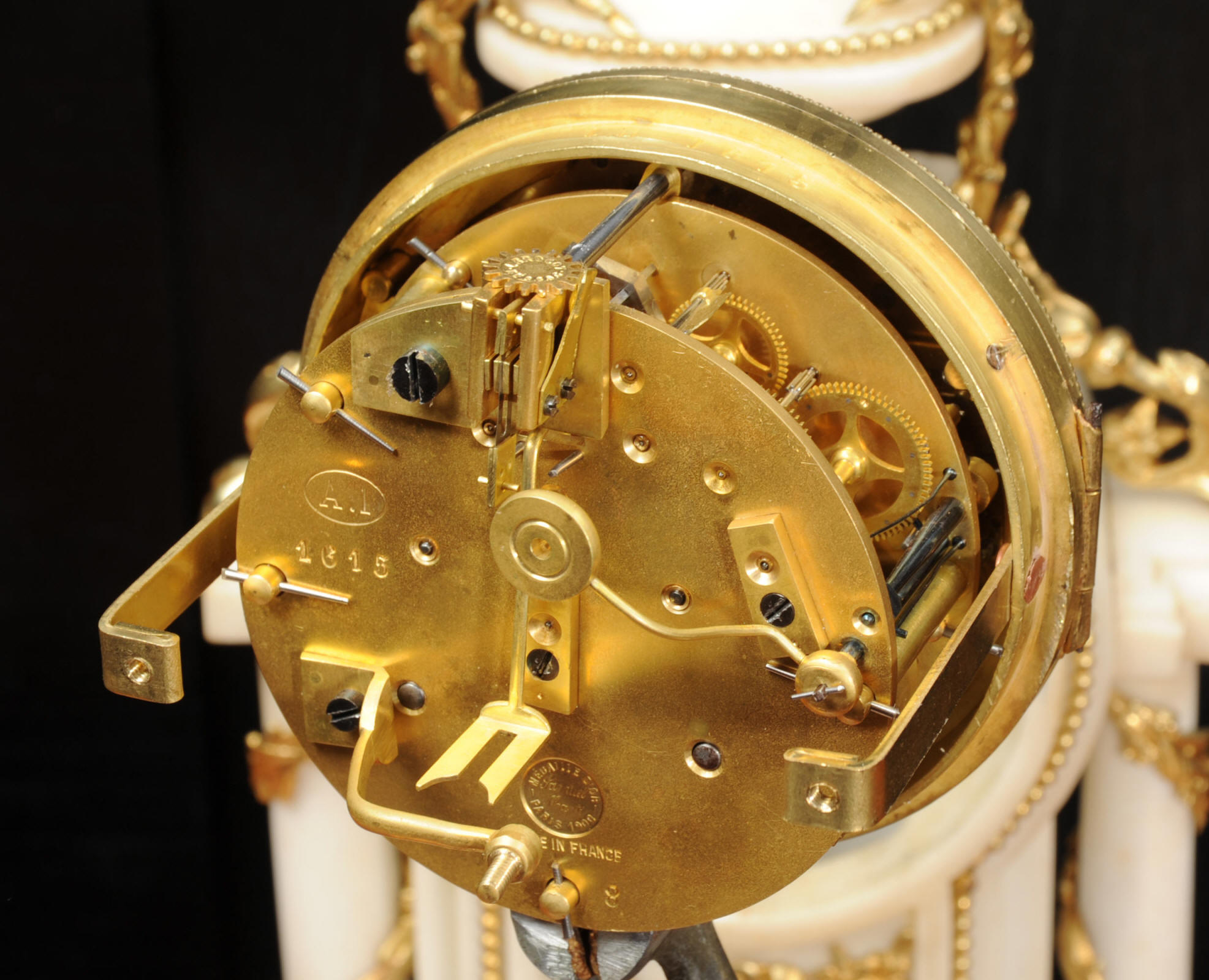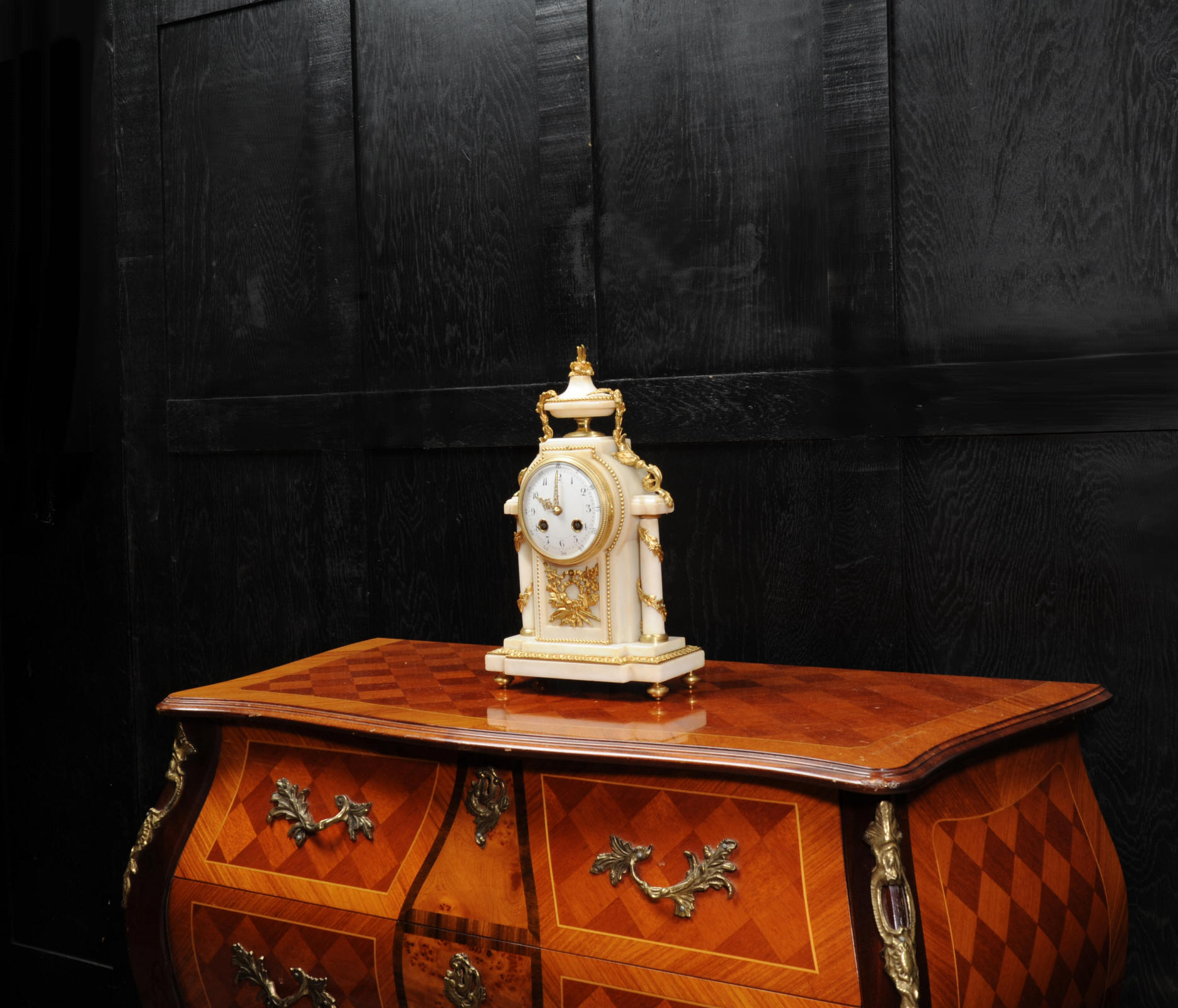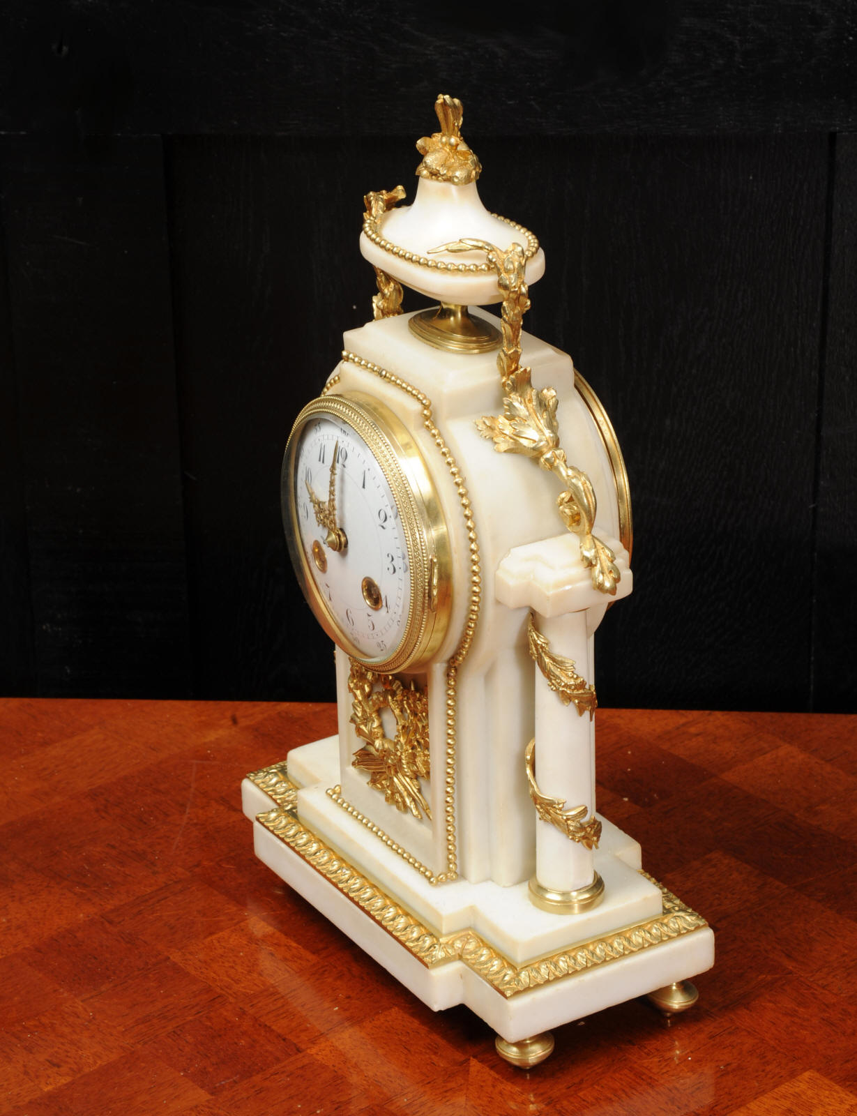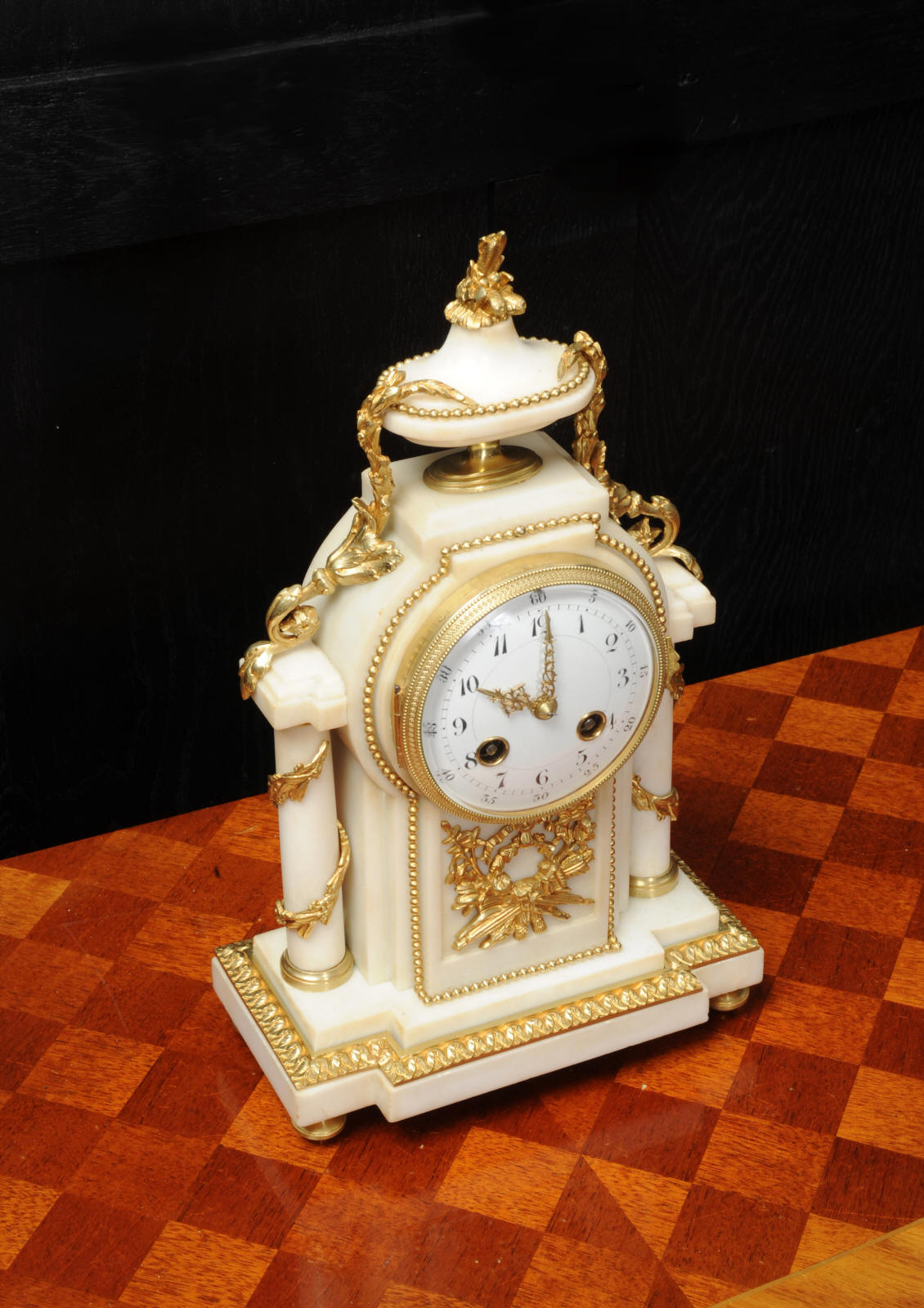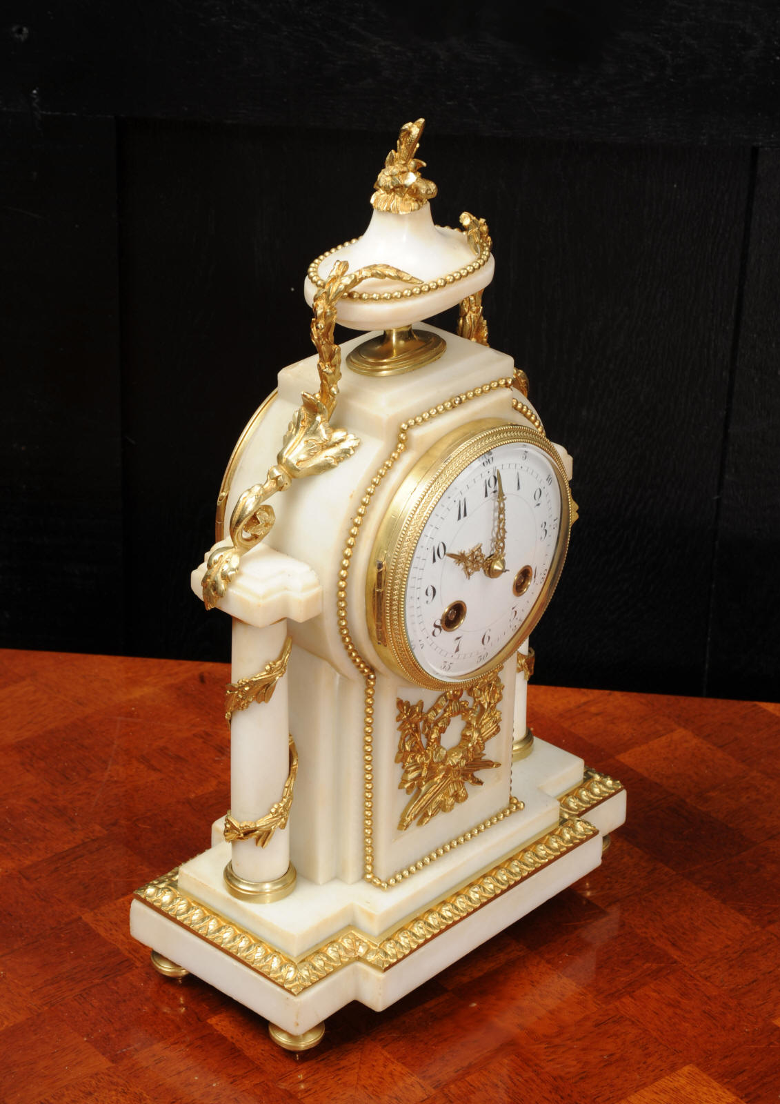 The dial porcelain enamel on copper with very finely fretted hands and convex glass. The French movement is by Samuel Marti and is of the makers usual of high quality. It is in excellent clean and running condition having been fully overhauled by our clockmaker. Pendulum is a replacement. It runs for 8 days and strikes the hours and halves on a bell. Click the video clip below to hear the bell and watch the clock running! Condition of the case is excellent, the ormolu is beautifully clean and bright with hardly any wear or discolouration. The marble is also very good with some slight nibbles to the edges. The marble has mellowed to a lovely cream-white colour with some discolouration. There is some slight chipping to the top of the columns. The dial is also in excellent condition just slight chipping around the winding hole.