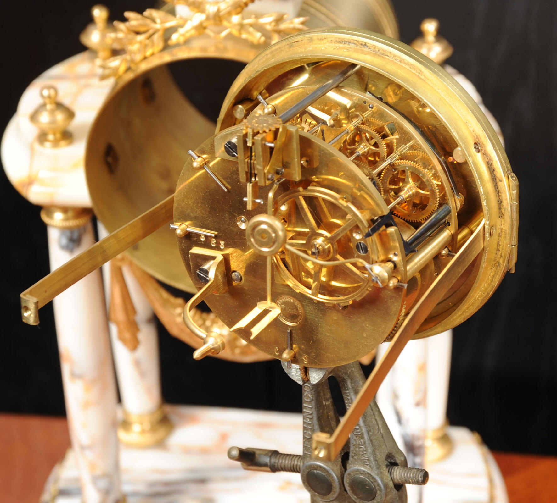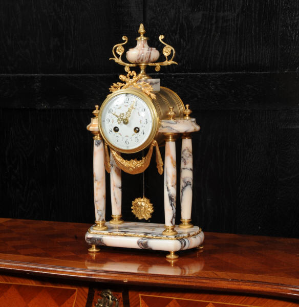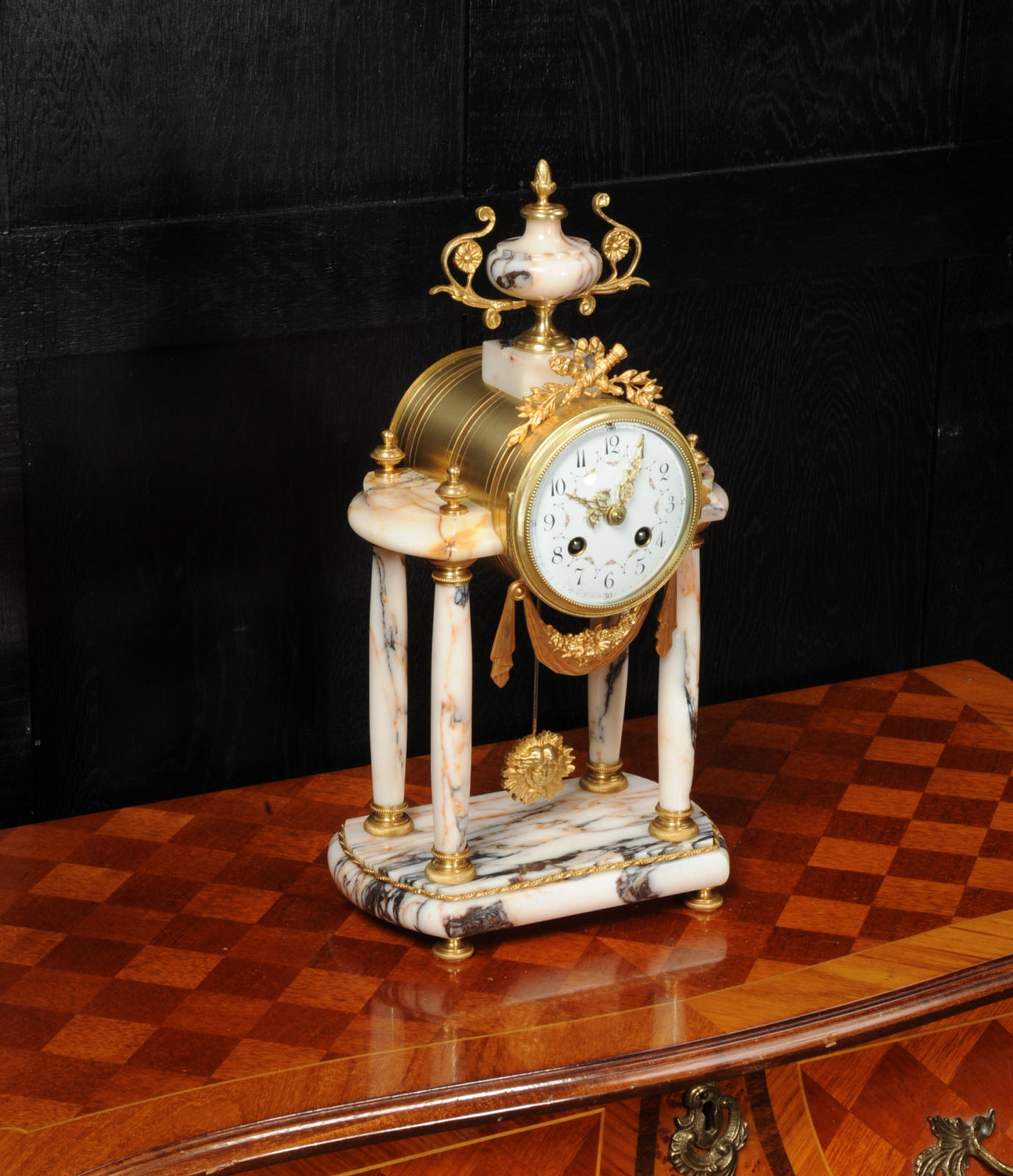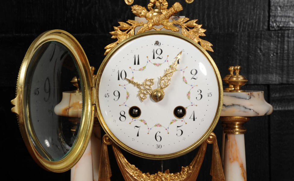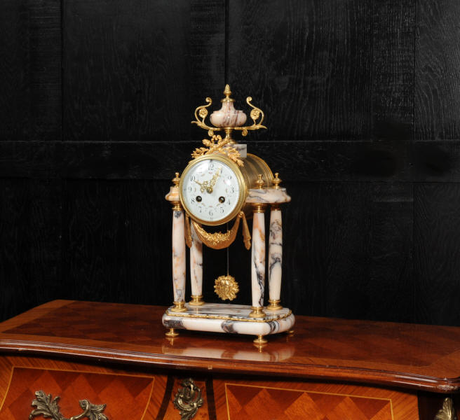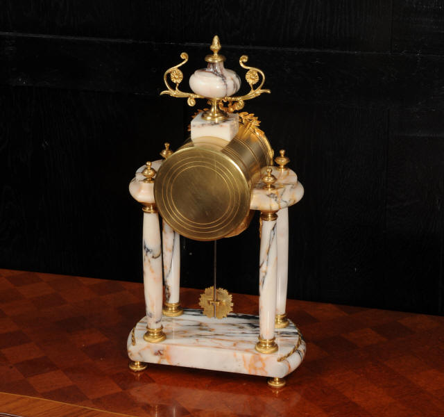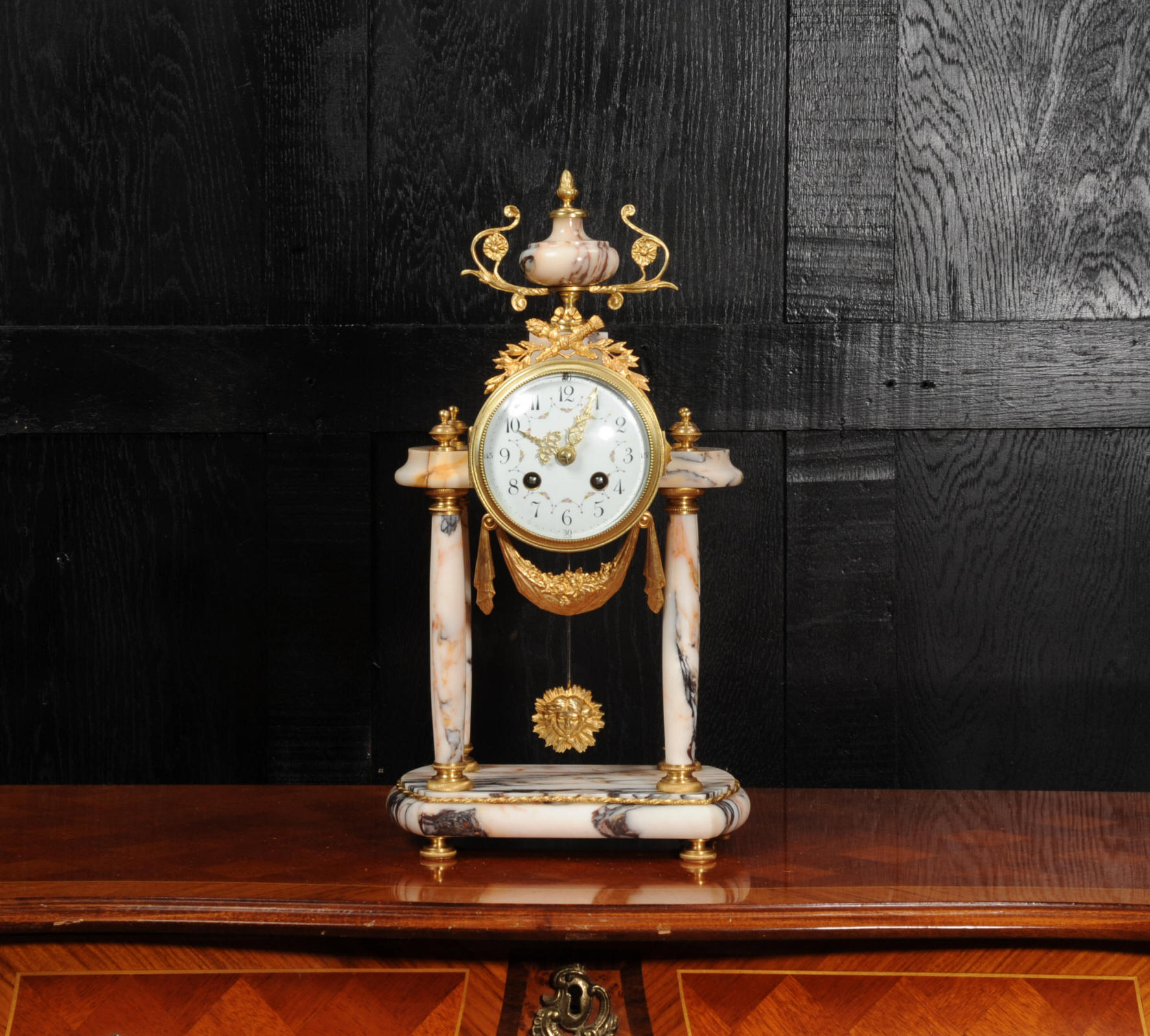 The dial is porcelain enamel on copper with delicate floral swags between the numbers. It is complete with it's original finely fretted gilt hands and convex glass. The French movement is of high quality and is by Fritz Marti. It is in excellent clean and running condition having been overhauled and tested by our clockmaker. Ormolu pendulum is a original and depicts a sun goddess surrounded by rays. It runs for 8 days and strikes the hours and halves on a bell. Click the video below to hear the bell and watch the clock running. Condition of the case is excellent, the original gilding is beautifully clean and bright with hardly any wear or discolouration. The marble is very good with a good polish, slight nibbles to the edges. The dial is excellent with no damage.