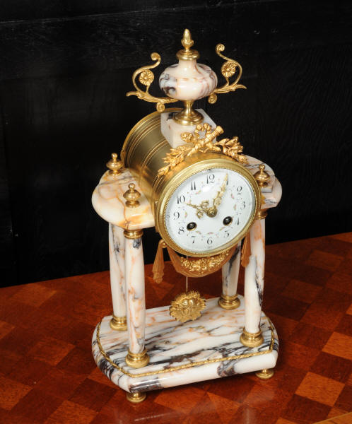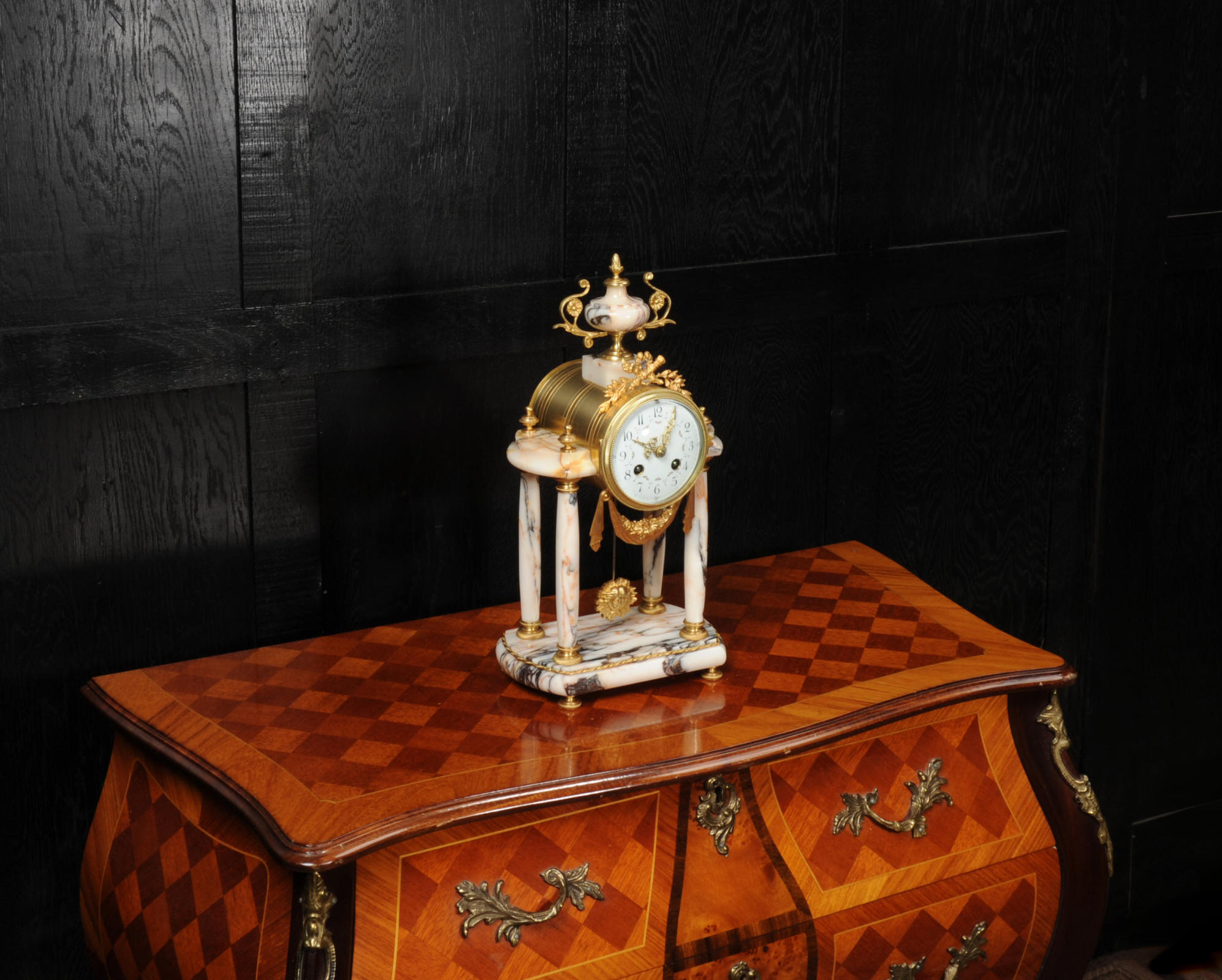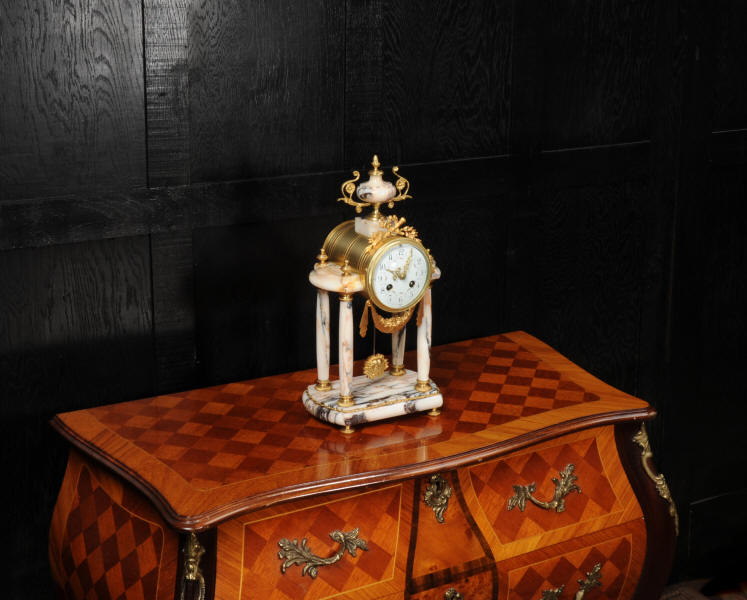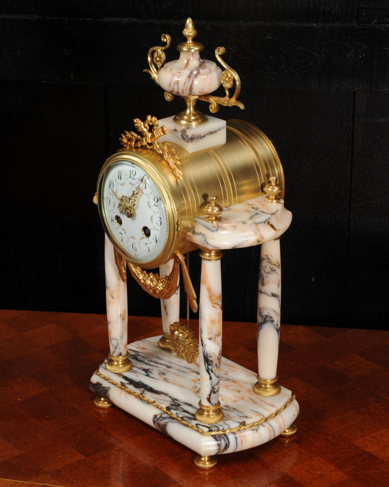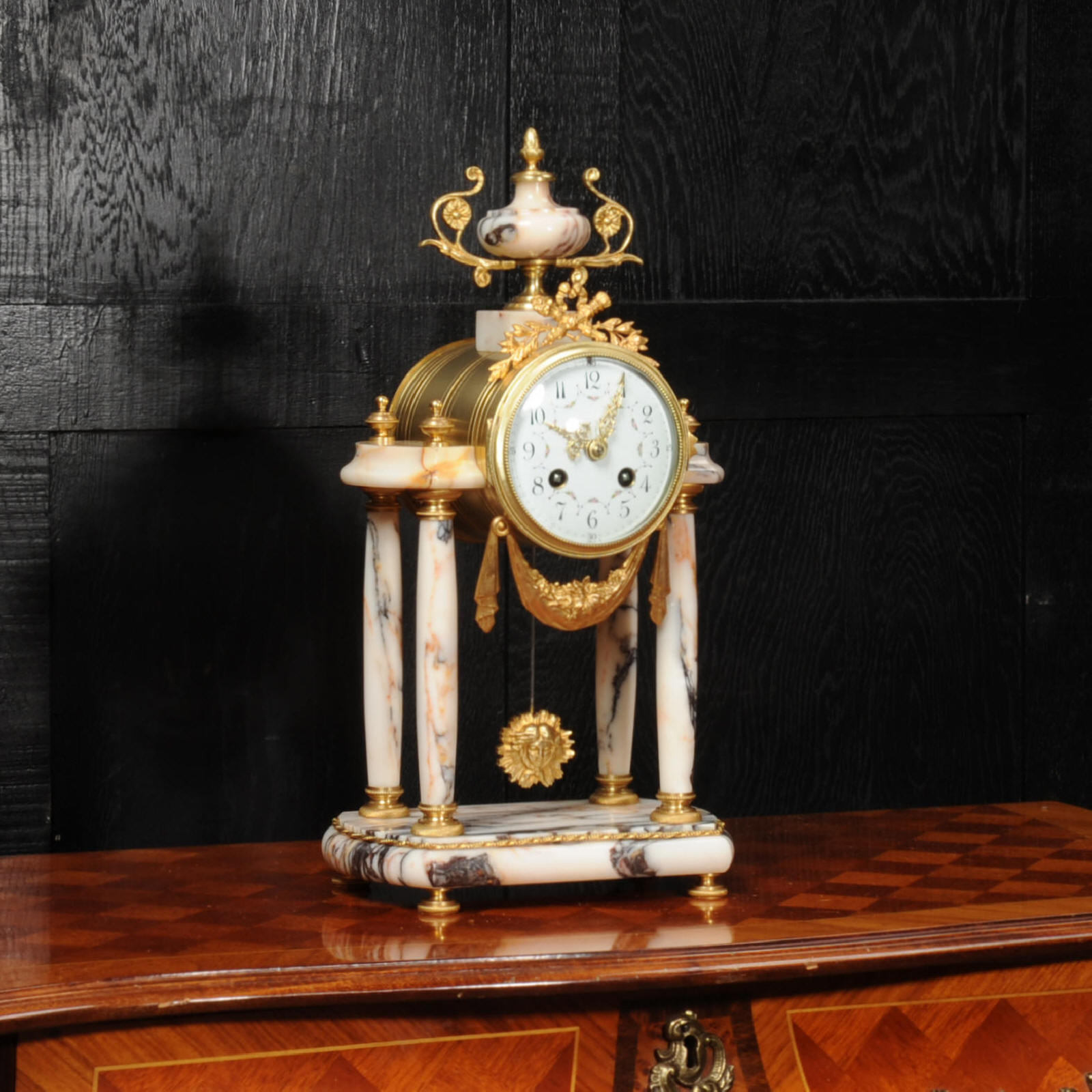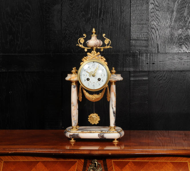 The dial is porcelain enamel on copper with delicate floral swags between the numbers. It is complete with it's original finely fretted gilt hands and convex glass. The French movement is of high quality and is by Fritz Marti. It is in excellent clean and running condition having been overhauled and tested by our clockmaker. Ormolu pendulum is a original and depicts a sun goddess surrounded by rays. It runs for 8 days and strikes the hours and halves on a bell. Click the video below to hear the bell and watch the clock running. Condition of the case is excellent, the original gilding is beautifully clean and bright with hardly any wear or discolouration. The marble is very good with a good polish, slight nibbles to the edges. The dial is excellent with no damage.