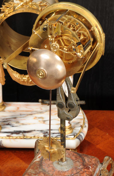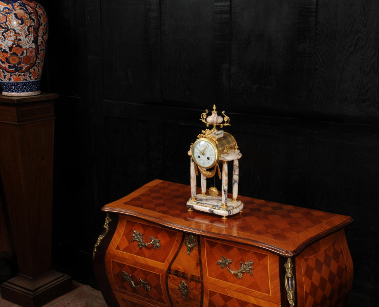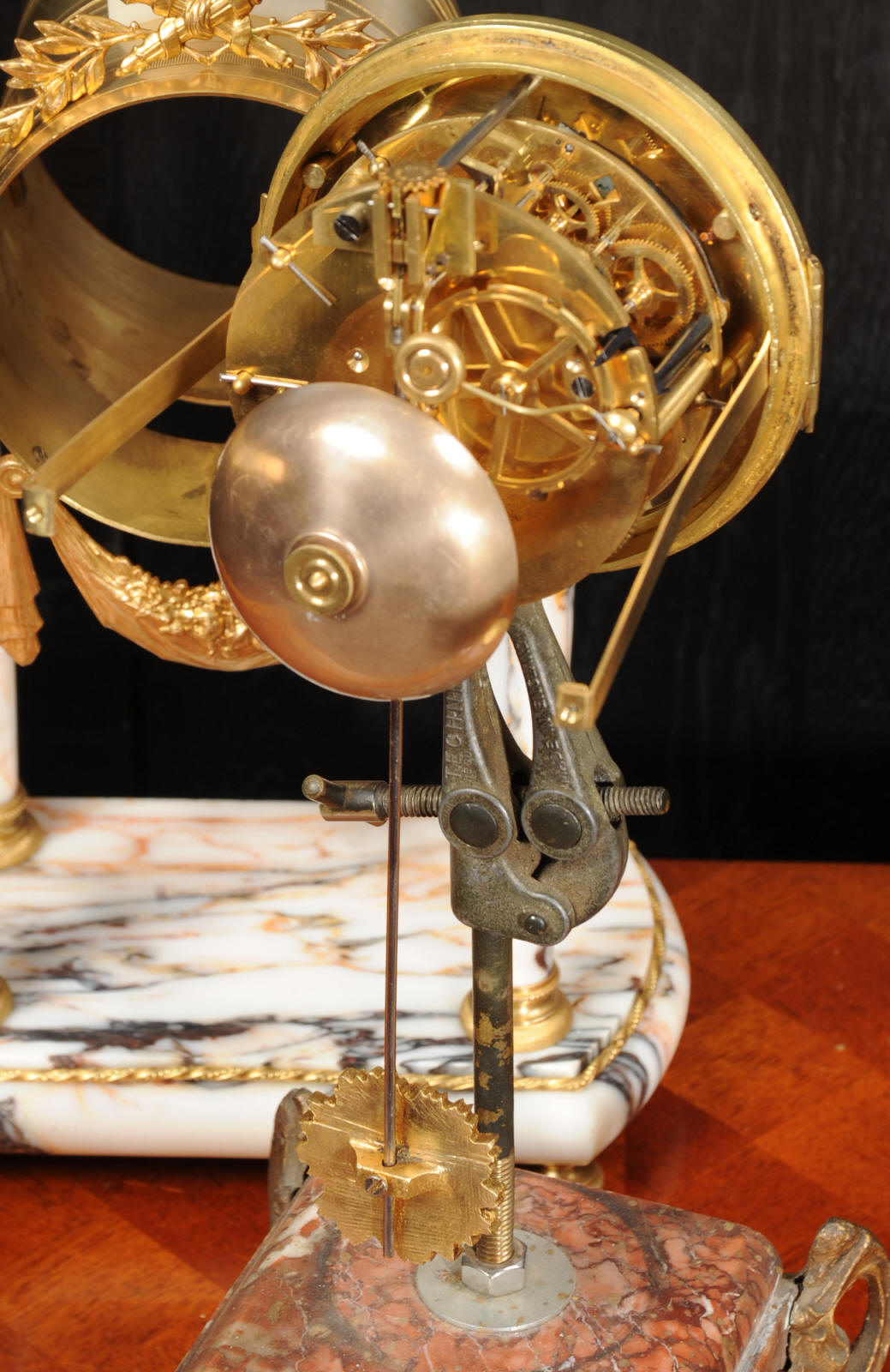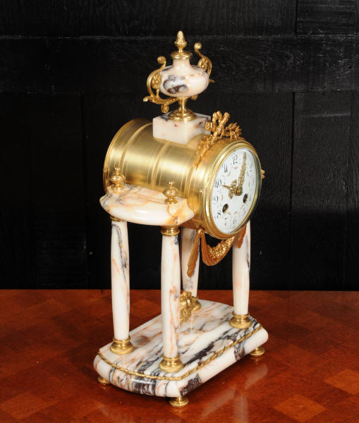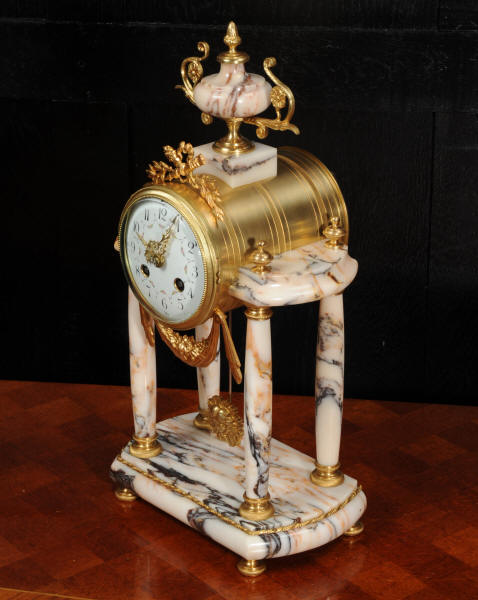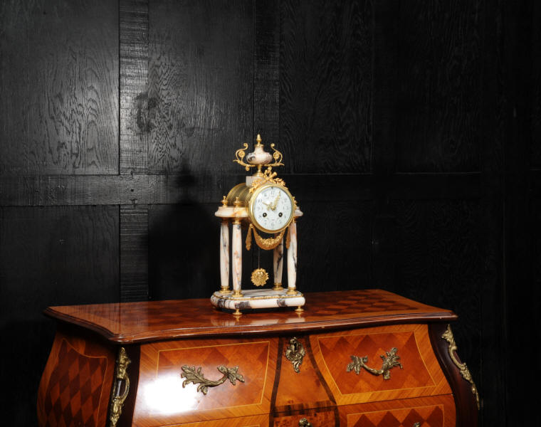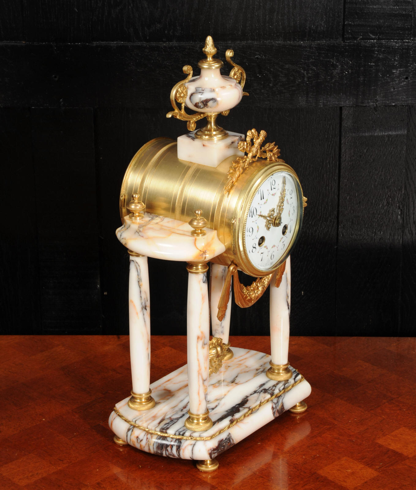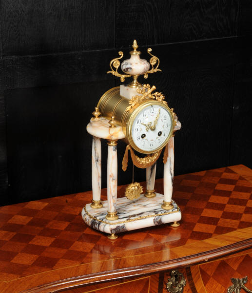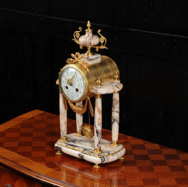 The dial is porcelain enamel on copper with delicate floral swags between the numbers. It is complete with it's original finely fretted gilt hands and convex glass. The French movement is of high quality and is by Fritz Marti. It is in excellent clean and running condition having been overhauled and tested by our clockmaker. Ormolu pendulum is a original and depicts a sun goddess surrounded by rays. It runs for 8 days and strikes the hours and halves on a bell. Click the video below to hear the bell and watch the clock running. Condition of the case is excellent, the original gilding is beautifully clean and bright with hardly any wear or discolouration. The marble is very good with a good polish, slight nibbles to the edges. The dial is excellent with no damage.