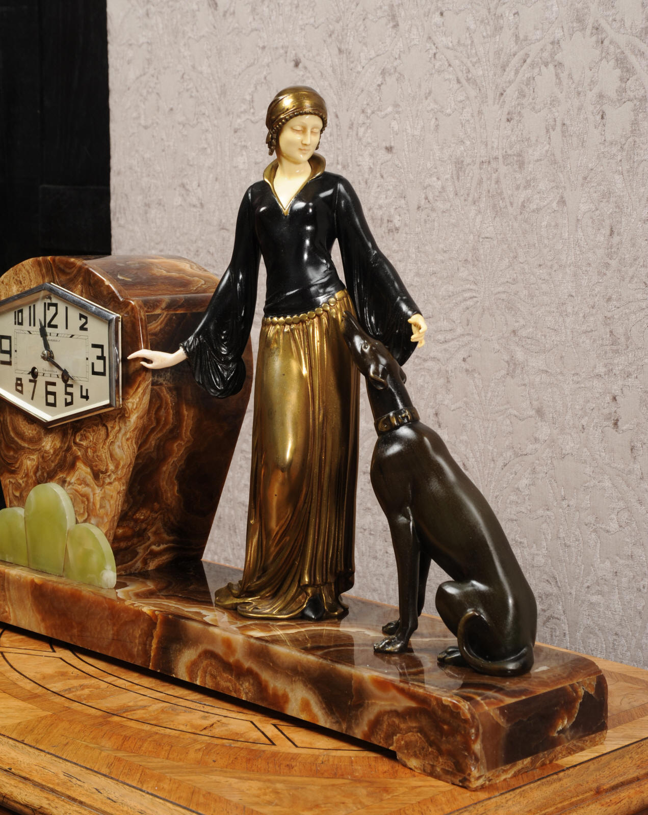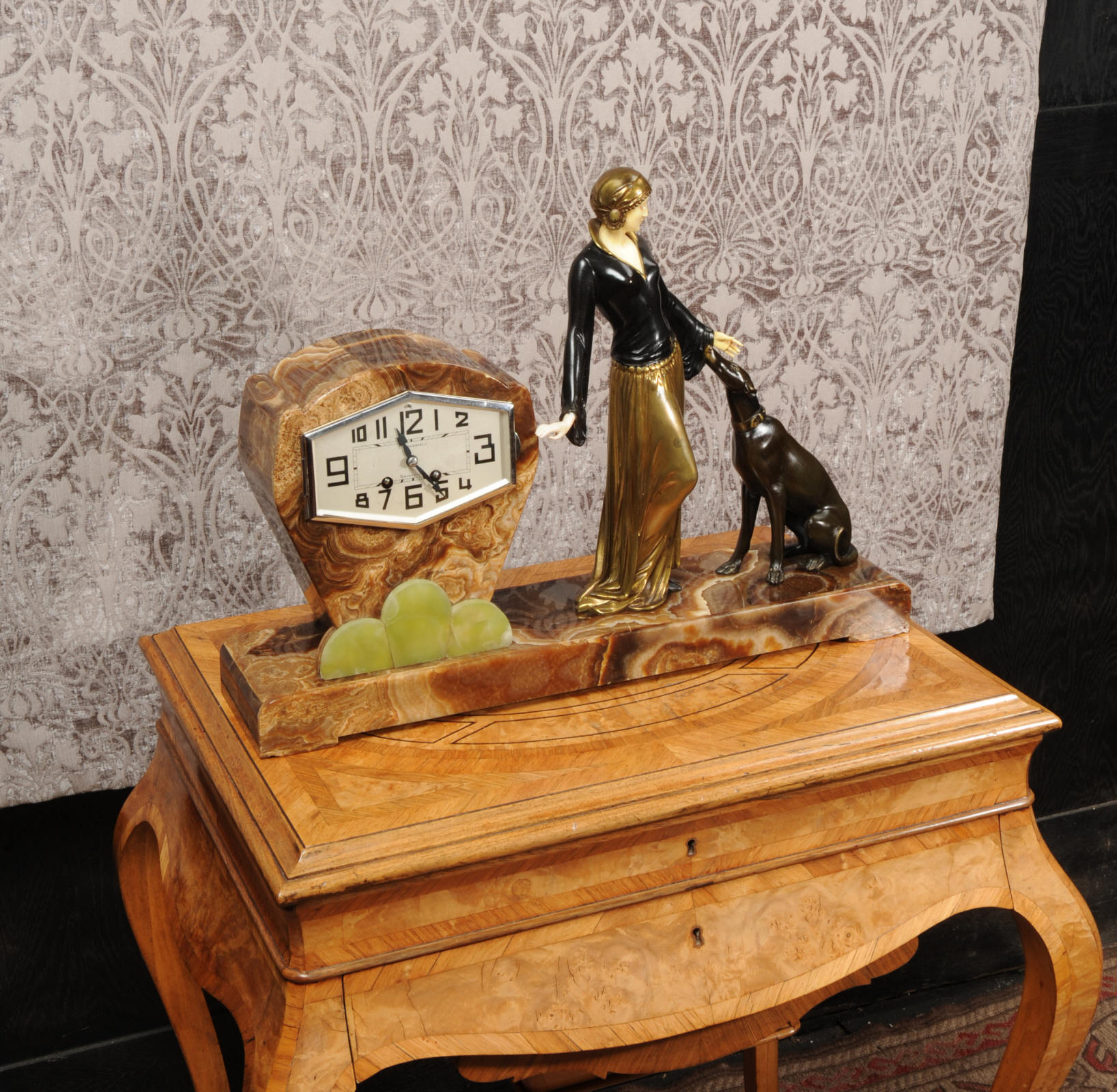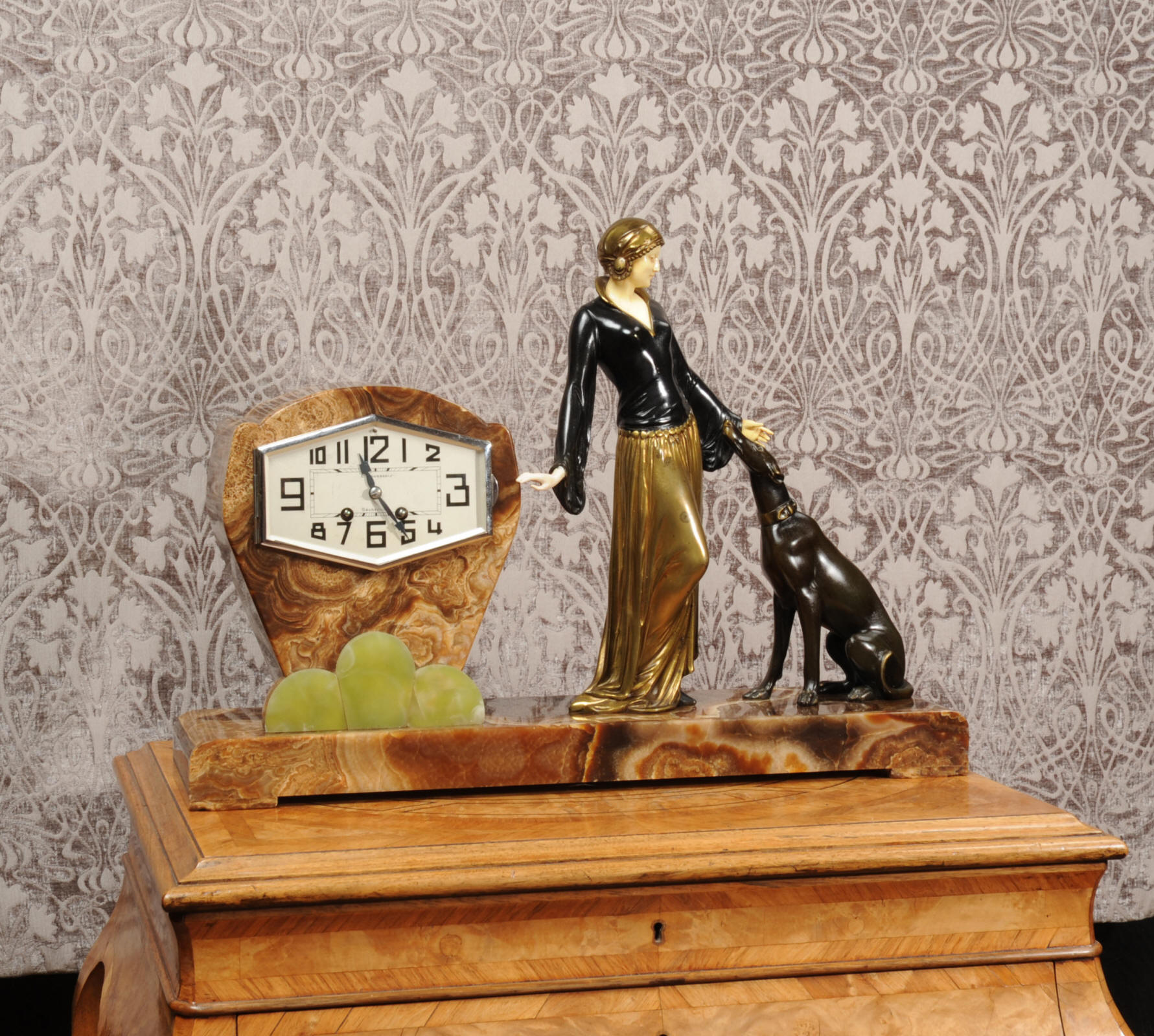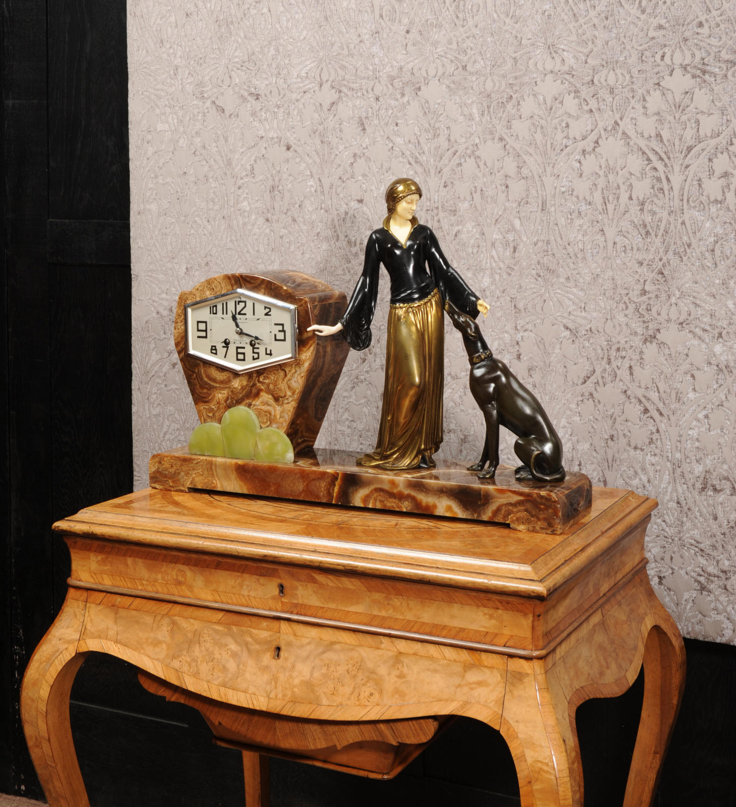 The lozenge shaped dial is matted silvered brass, screen printed with numerals and with square formed blued steel hands. It is signed for the retailer E. Bourgedi, Doudeville. The bezel is chrome plated and has it's original convex glass. The French movement is of excellent quality. It is a traditional 'Pendule de Paris' movement with a pendulum. It is in excellent clean and running condition having been fully overhauled and tested by our clockmaker. Pendulum is a replacement. It runs for 8 days and strikes the hours and halves on a bell. Click the video below to see the clock running and striking. Condition of the case is excellent, The figures have a good original patination with only minor wear. Her early plastic hands and head are in excellent condition and have mellowed in colour, one hand more than the other. The Onyx is in excellent condition with a superb polish. There are some minor nibbles to the edges and a slight chip to the front left hand foot. The dial is also in excellent condition with some slight wear and marks. Menneville was the pseudonym for the sculptor Ugo Cipriani (1897 – 1960). He was a Prolific Italian sculptor born in Florencia, Italy on 13th August 1897, died in Paris in June 1960. He studied at the famous Accademia di Belle Arti di Firenze. He followed in his Father's footsteps as he too was a sculptor. One of Ugo Cipriani’s most famous works is a statue of the patriot Oberdan in the Oberdan’s square in Florencia dated 1919. He left Italy for France around 1935-1937 to escape from Mussolini’s fascist government and became a political refugee in Paris where he kept on working until his death. He Produced many fine art deco statuary items in various mediums including spelter and ivorine, bronze and terracotta.