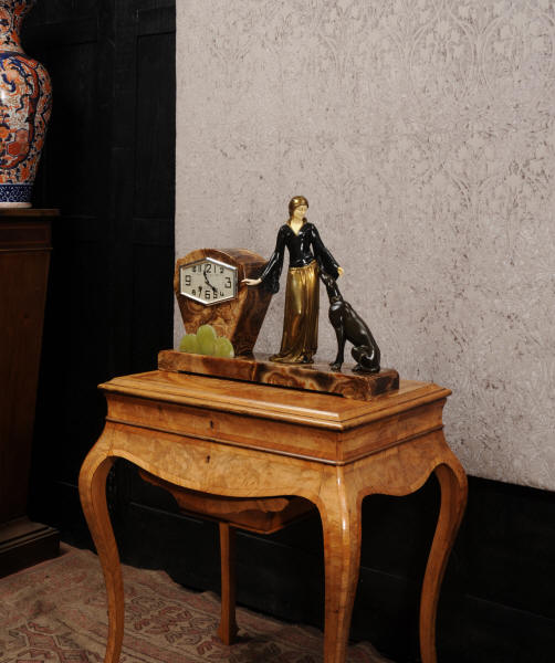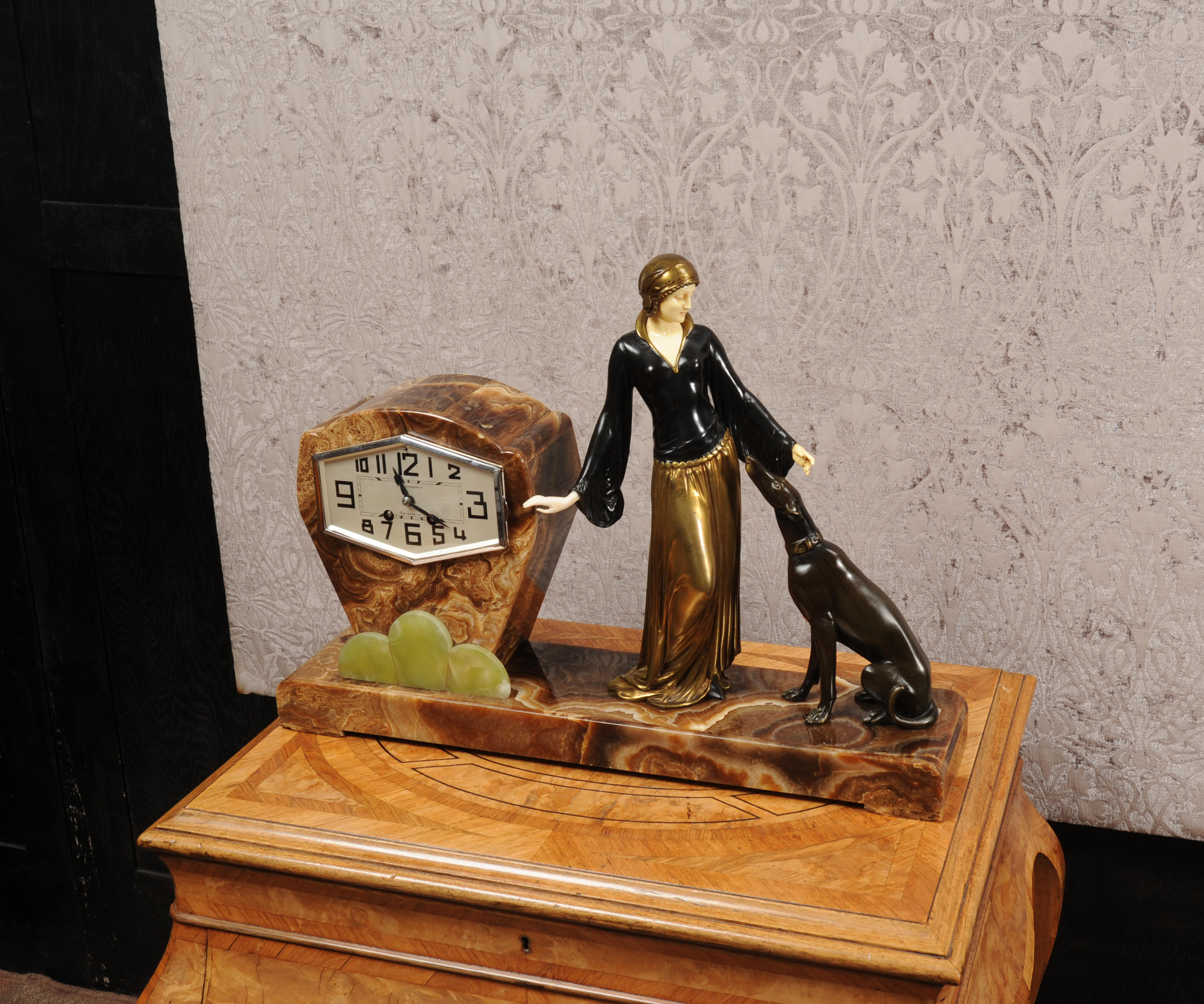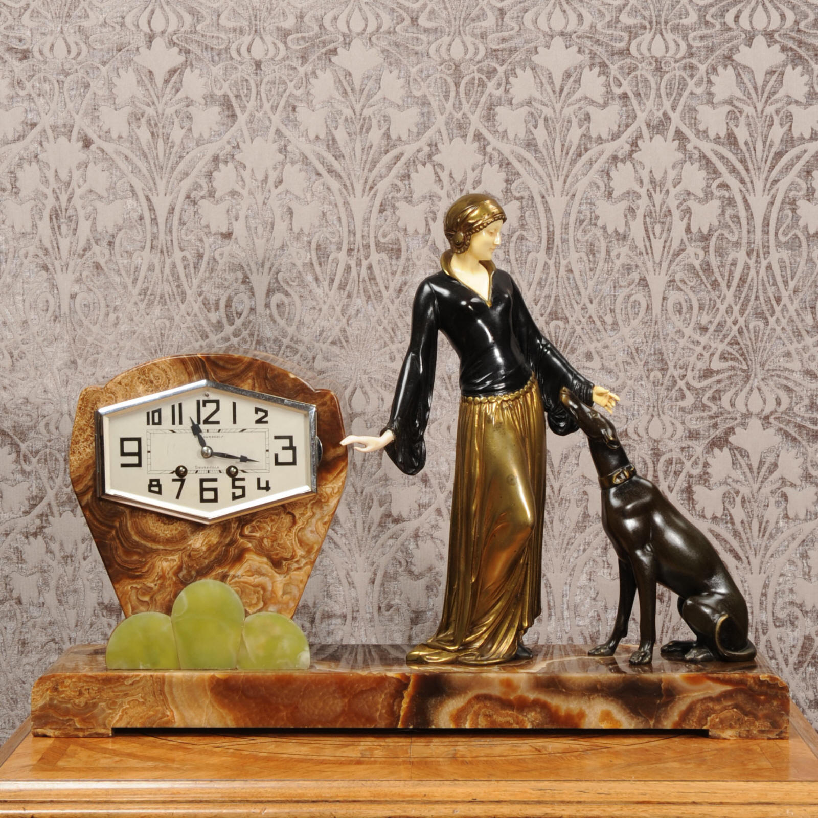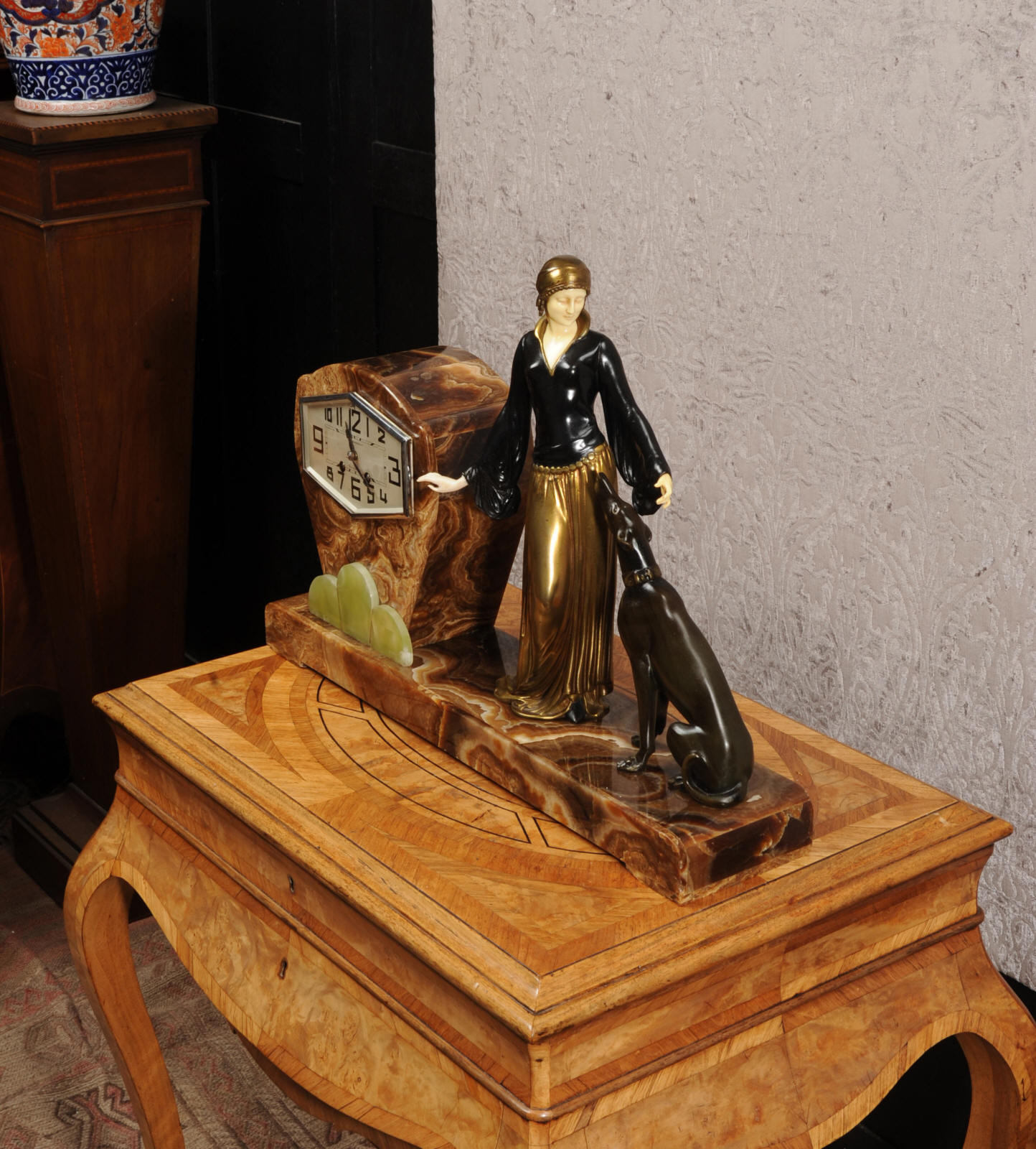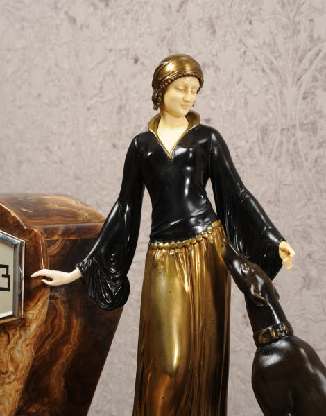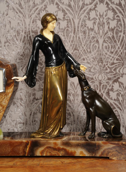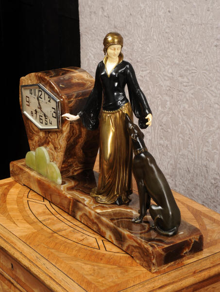 The lozenge shaped dial is matted silvered brass, screen printed with numerals and with square formed blued steel hands. It is signed for the retailer E. Bourgedi, Doudeville. The bezel is chrome plated and has it's original convex glass. The French movement is of excellent quality. It is a traditional 'Pendule de Paris' movement with a pendulum. It is in excellent clean and running condition having been fully overhauled and tested by our clockmaker. Pendulum is a replacement. It runs for 8 days and strikes the hours and halves on a bell. Click the video below to see the clock running and striking. Condition of the case is excellent, The figures have a good original patination with only minor wear. Her early plastic hands and head are in excellent condition and have mellowed in colour, one hand more than the other. The Onyx is in excellent condition with a superb polish. There are some minor nibbles to the edges and a slight chip to the front left hand foot. The dial is also in excellent condition with some slight wear and marks. Menneville was the pseudonym for the sculptor Ugo Cipriani (1897 – 1960). He was a Prolific Italian sculptor born in Florencia, Italy on 13th August 1897, died in Paris in June 1960. He studied at the famous Accademia di Belle Arti di Firenze. He followed in his Father's footsteps as he too was a sculptor. One of Ugo Cipriani’s most famous works is a statue of the patriot Oberdan in the Oberdan’s square in Florencia dated 1919. He left Italy for France around 1935-1937 to escape from Mussolini’s fascist government and became a political refugee in Paris where he kept on working until his death. He Produced many fine art deco statuary items in various mediums including spelter and ivorine, bronze and terracotta.