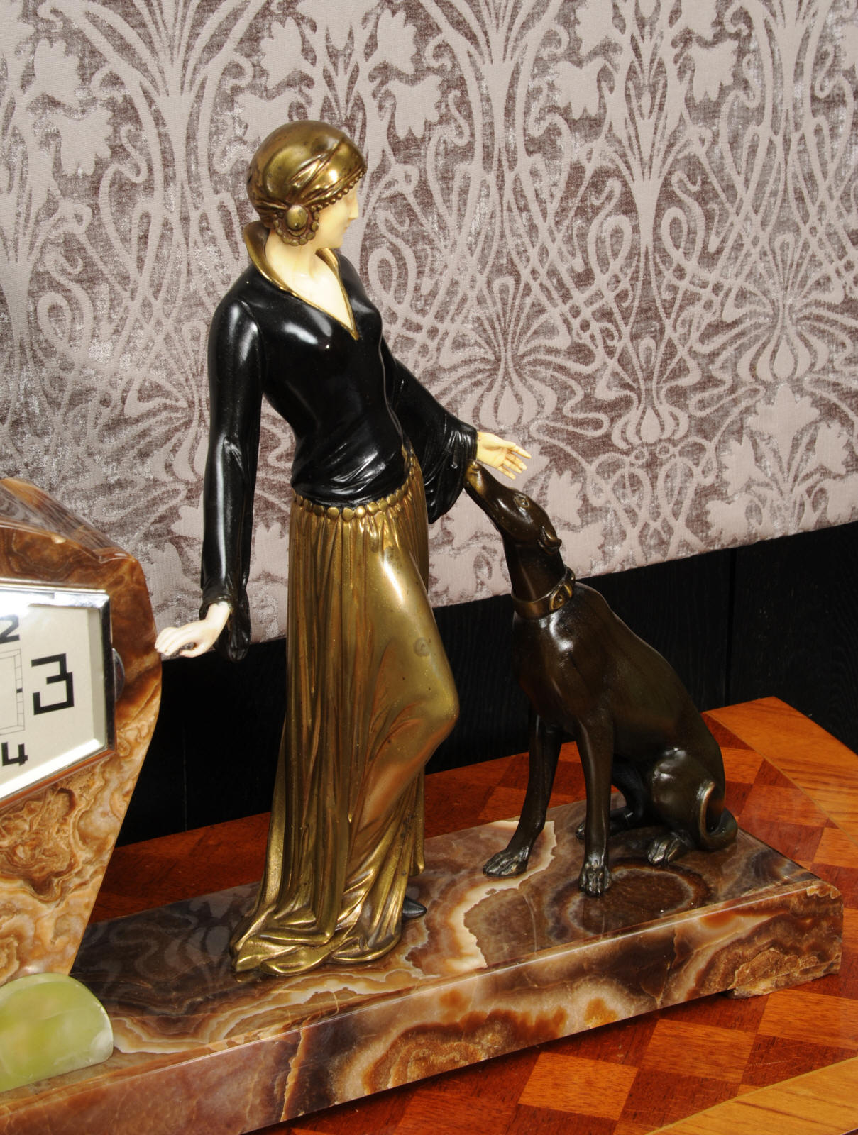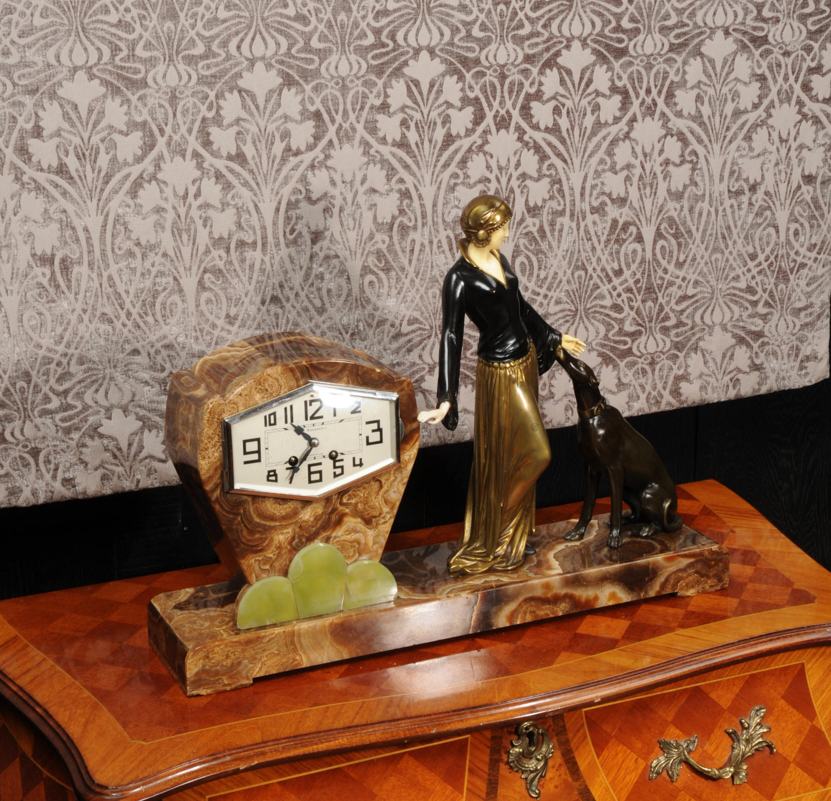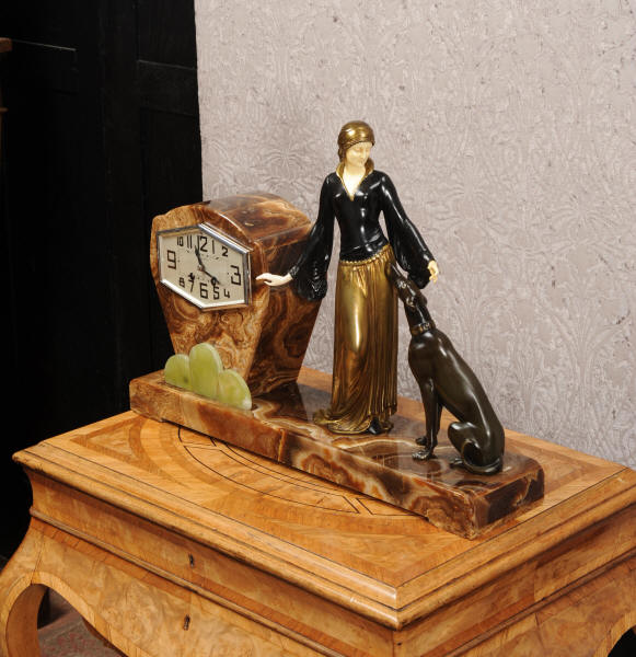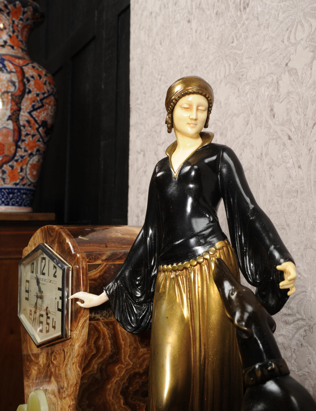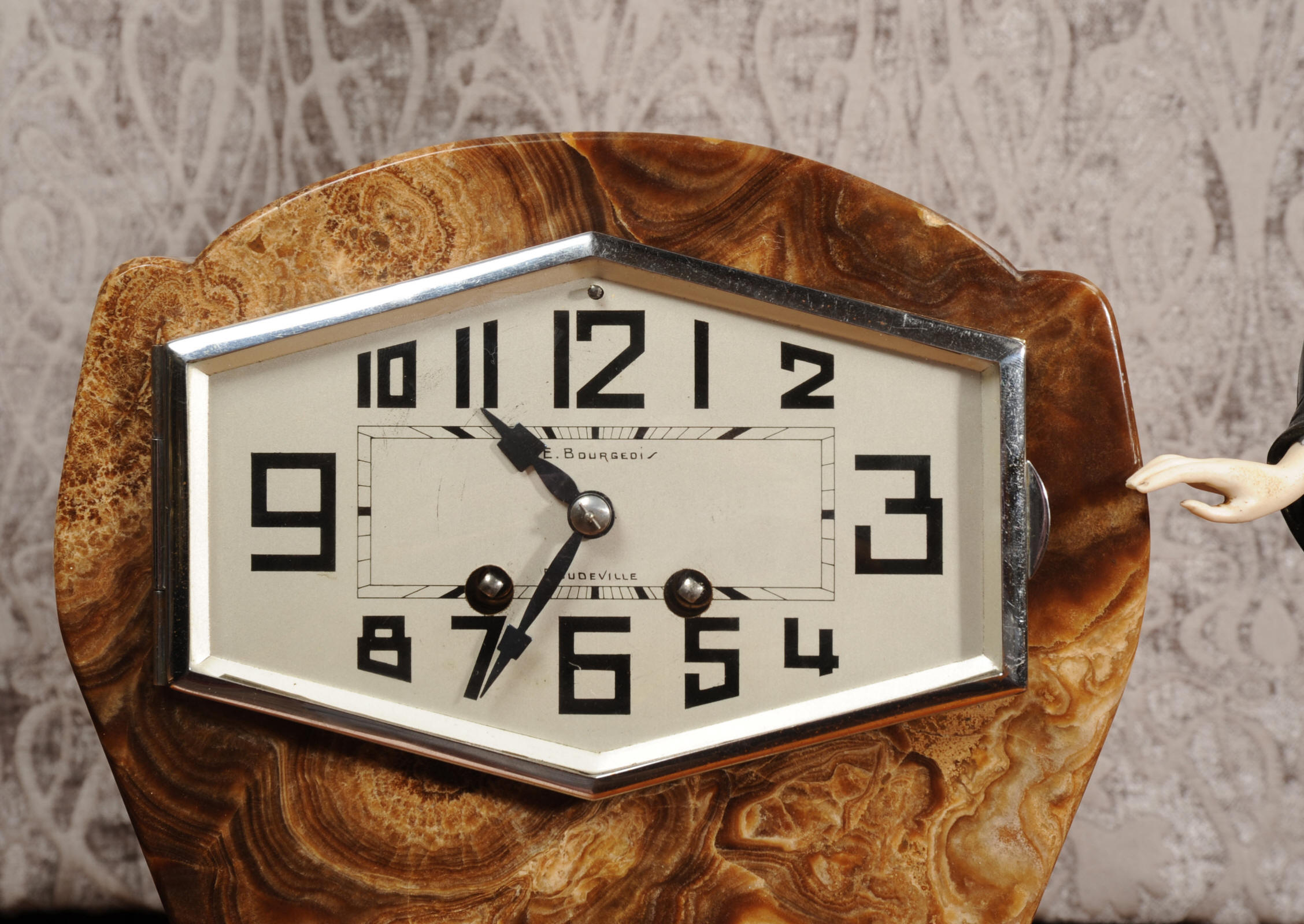 The lozenge shaped dial is matted silvered brass, screen printed with numerals and with square formed blued steel hands. It is signed for the retailer E. Bourgedi, Doudeville. The bezel is chrome plated and has it's original convex glass. The French movement is of excellent quality. It is a traditional 'Pendule de Paris' movement with a pendulum. It is in excellent clean and running condition having been fully overhauled and tested by our clockmaker. Pendulum is a replacement. It runs for 8 days and strikes the hours and halves on a bell. Click the video below to see the clock running and striking. Condition of the case is excellent, The figures have a good original patination with only minor wear. Her early plastic hands and head are in excellent condition and have mellowed in colour, one hand more than the other. The Onyx is in excellent condition with a superb polish. There are some minor nibbles to the edges and a slight chip to the front left hand foot. The dial is also in excellent condition with some slight wear and marks. Menneville was the pseudonym for the sculptor Ugo Cipriani (1897 – 1960). He was a Prolific Italian sculptor born in Florencia, Italy on 13th August 1897, died in Paris in June 1960. He studied at the famous Accademia di Belle Arti di Firenze. He followed in his Father's footsteps as he too was a sculptor. One of Ugo Cipriani’s most famous works is a statue of the patriot Oberdan in the Oberdan’s square in Florencia dated 1919. He left Italy for France around 1935-1937 to escape from Mussolini’s fascist government and became a political refugee in Paris where he kept on working until his death. He Produced many fine art deco statuary items in various mediums including spelter and ivorine, bronze and terracotta.